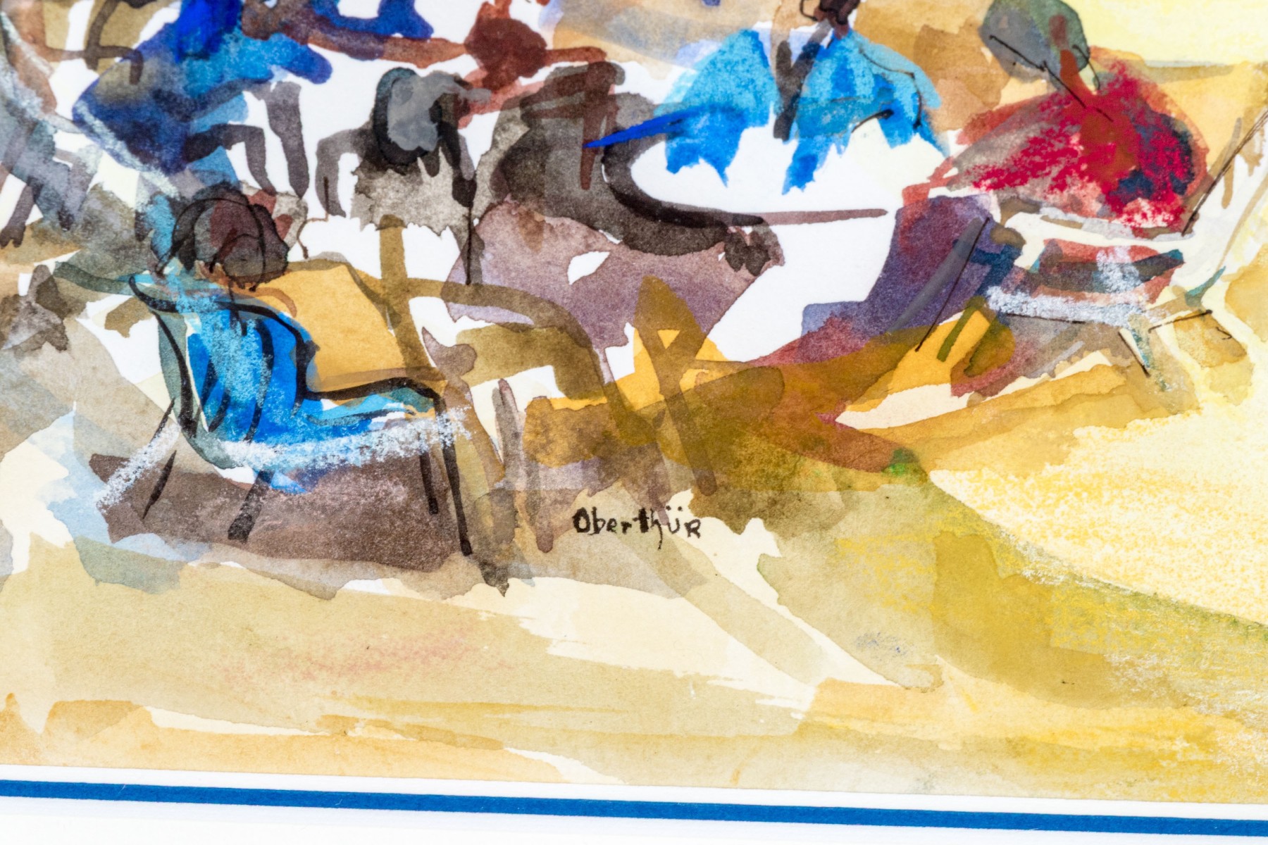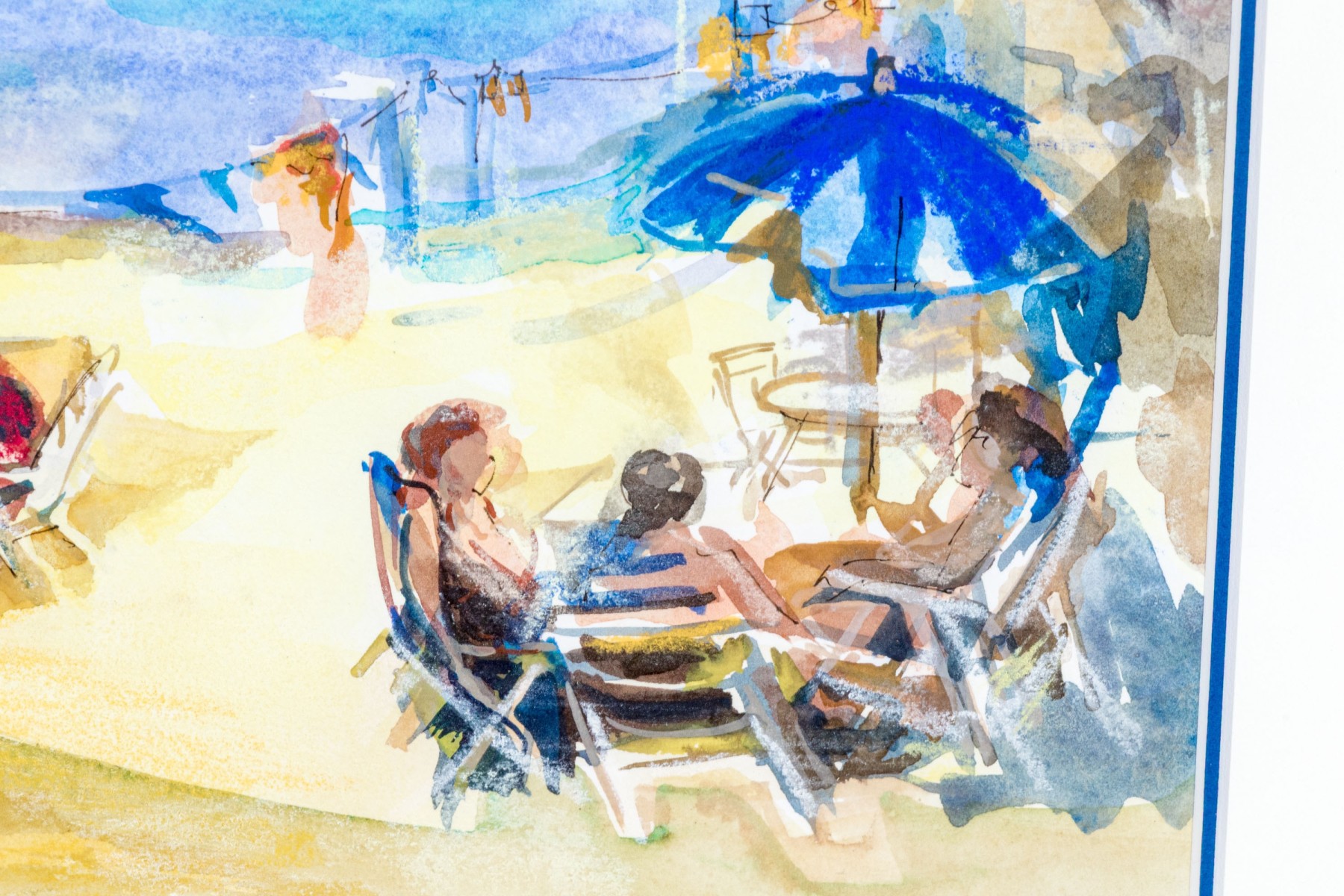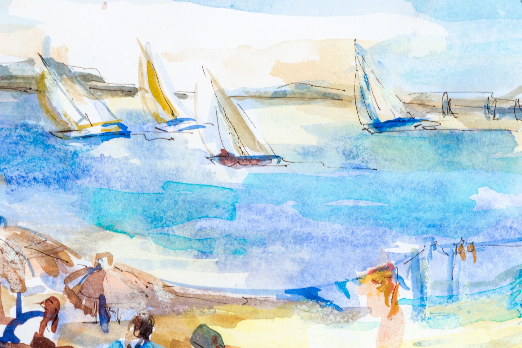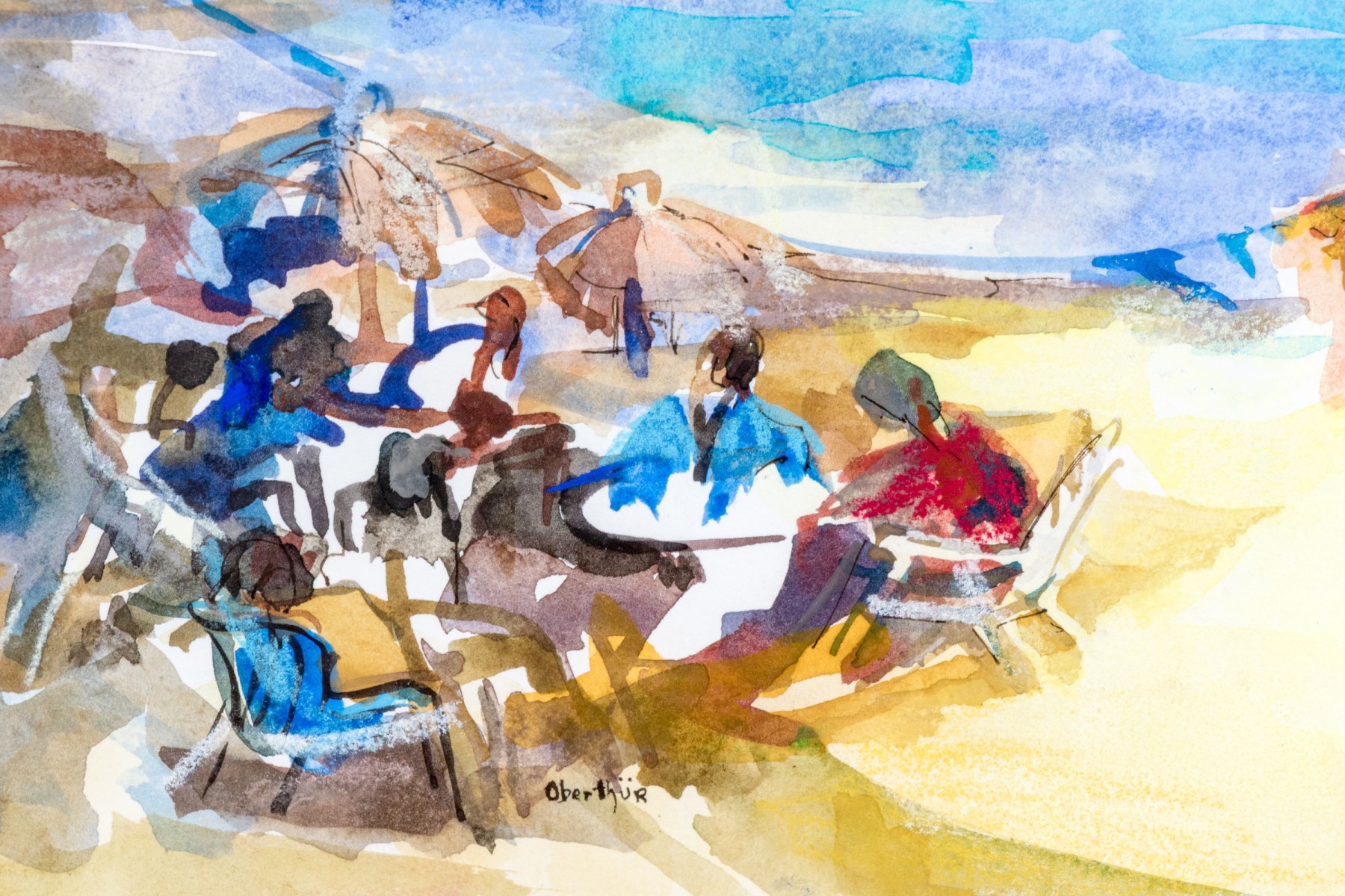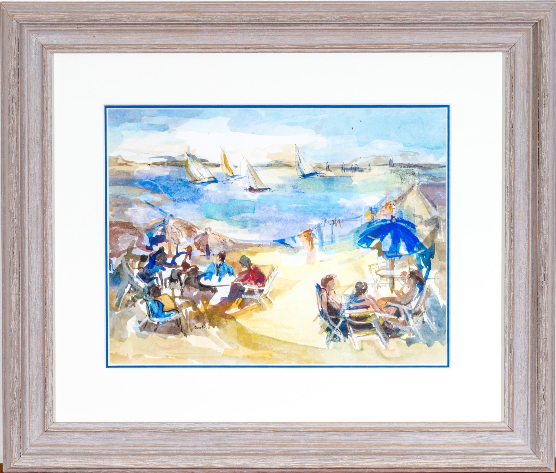 Christine Oberthür (French, b. 1939) watercolor painting on paper depicting a lively scene of people seated in white chairs with blue umbrellas at the beach with sailboats dotting blue and purple ocean water. Signed lower left quadrant.