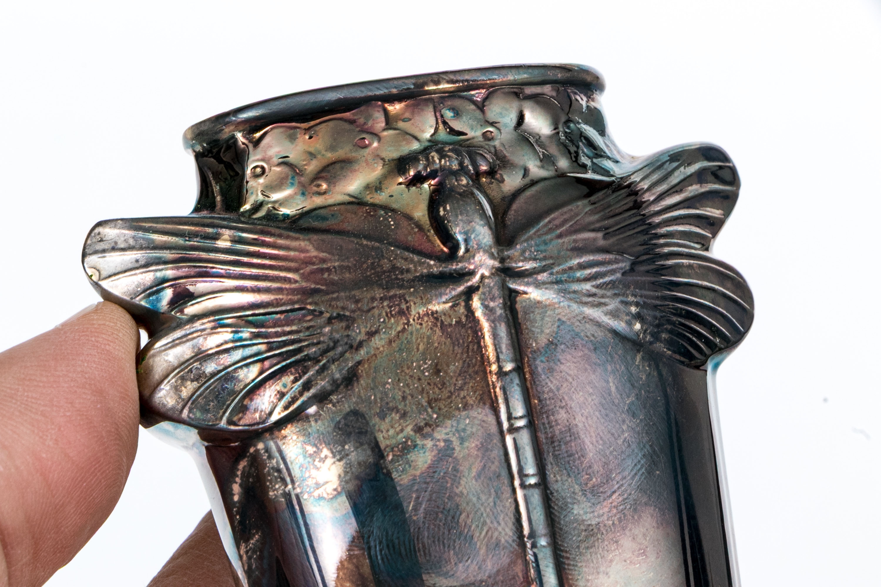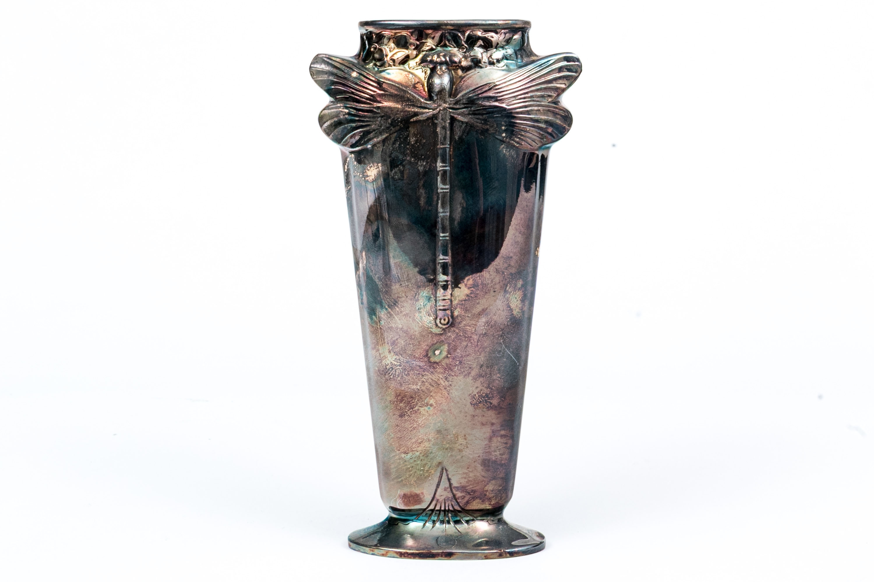 An elegant Christofle silver plated bud vase. Standing on its oval foot, the slender oval form vase rises with tapered form. Fabulously depicted dragonfly motif to the shoulder on both sides, each depicted in relief. Above is the oval mouth of the vase.