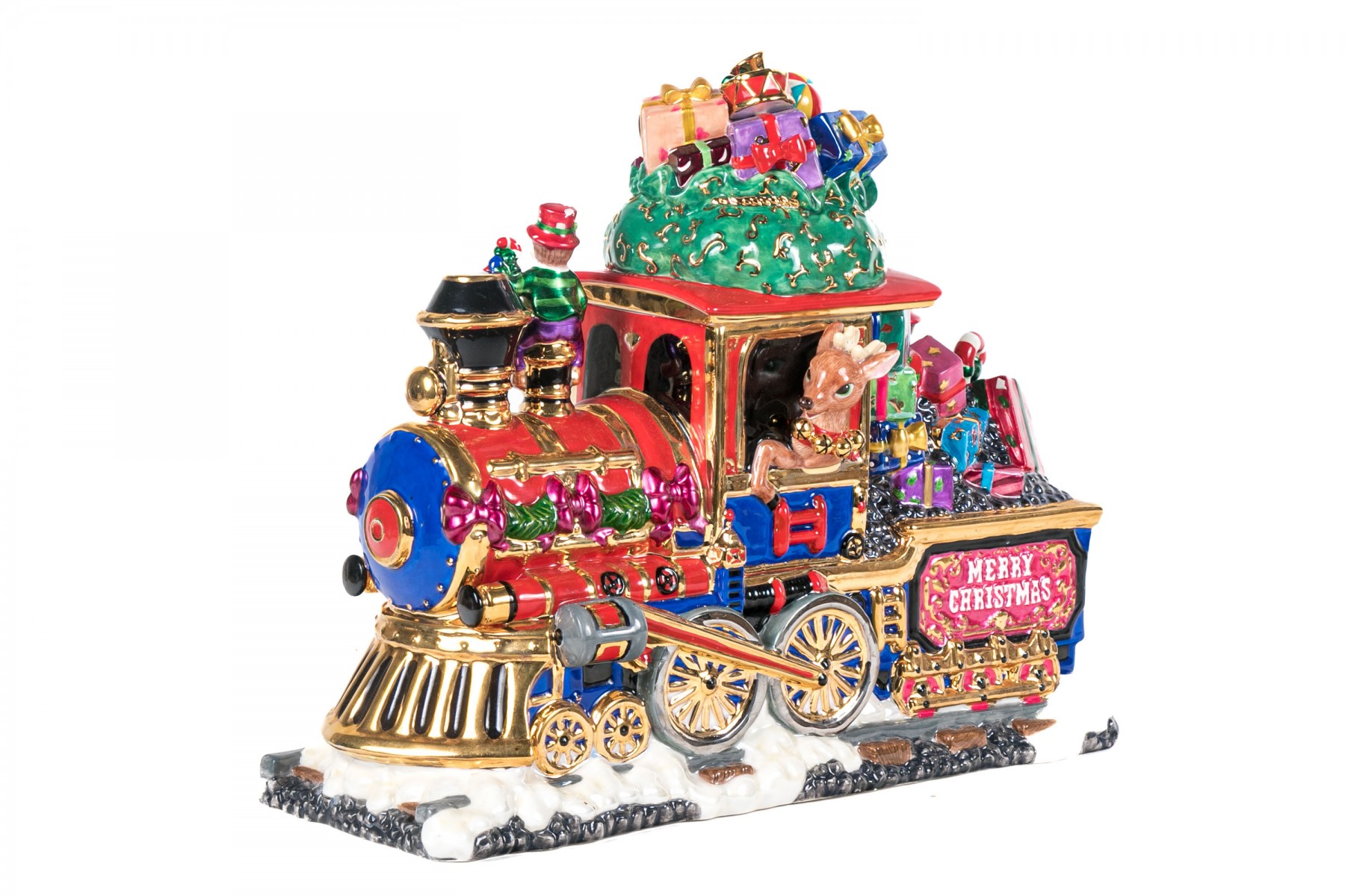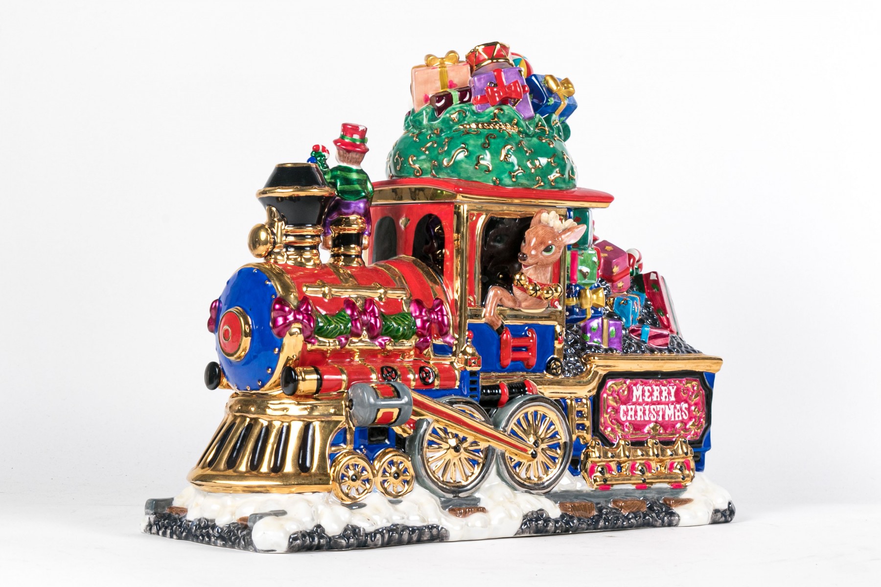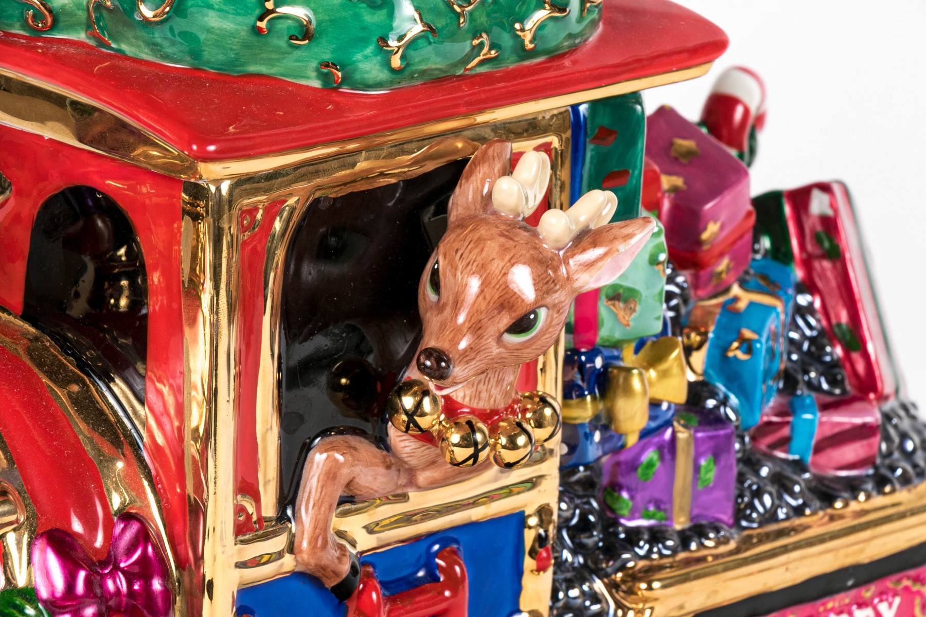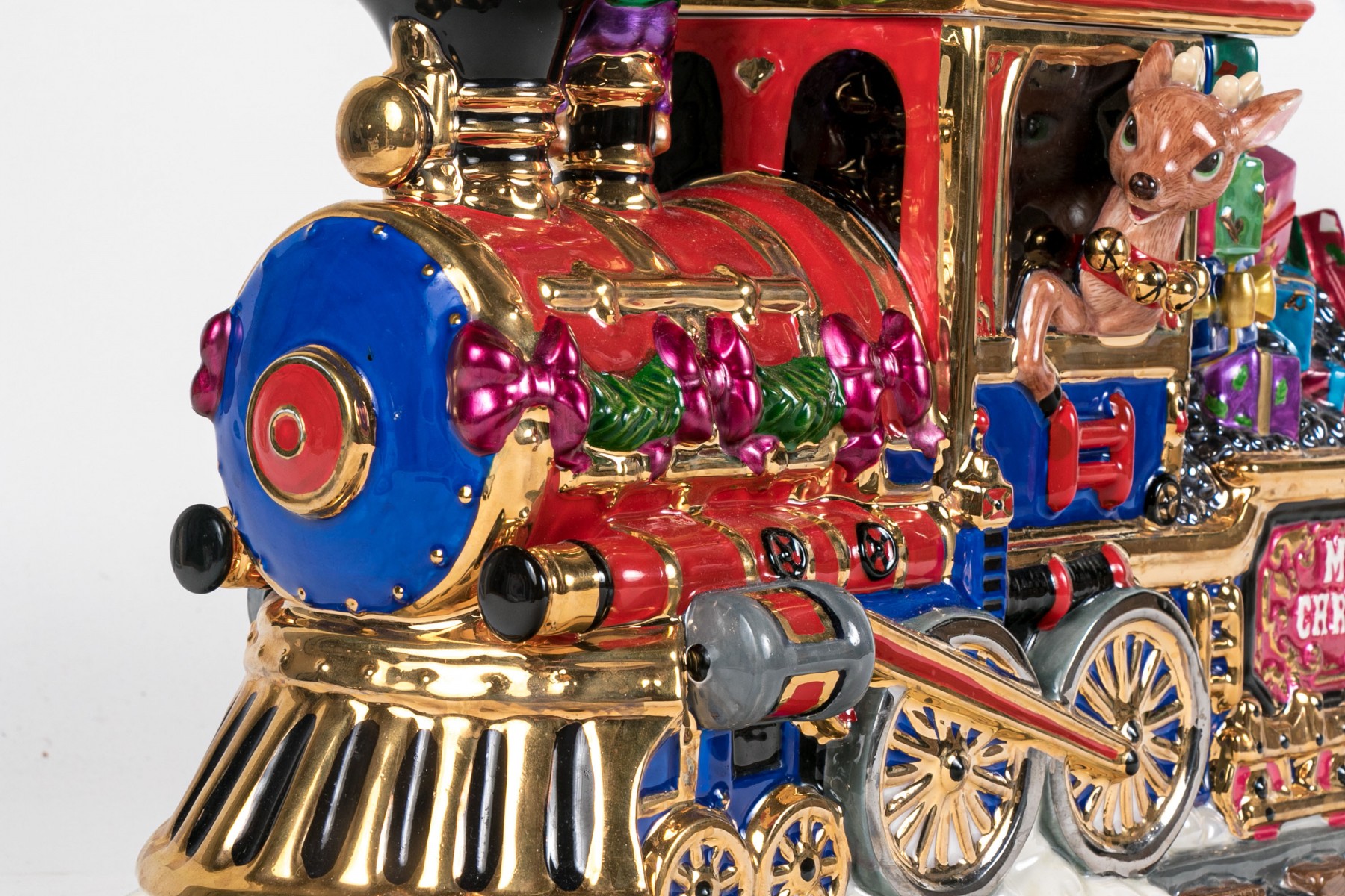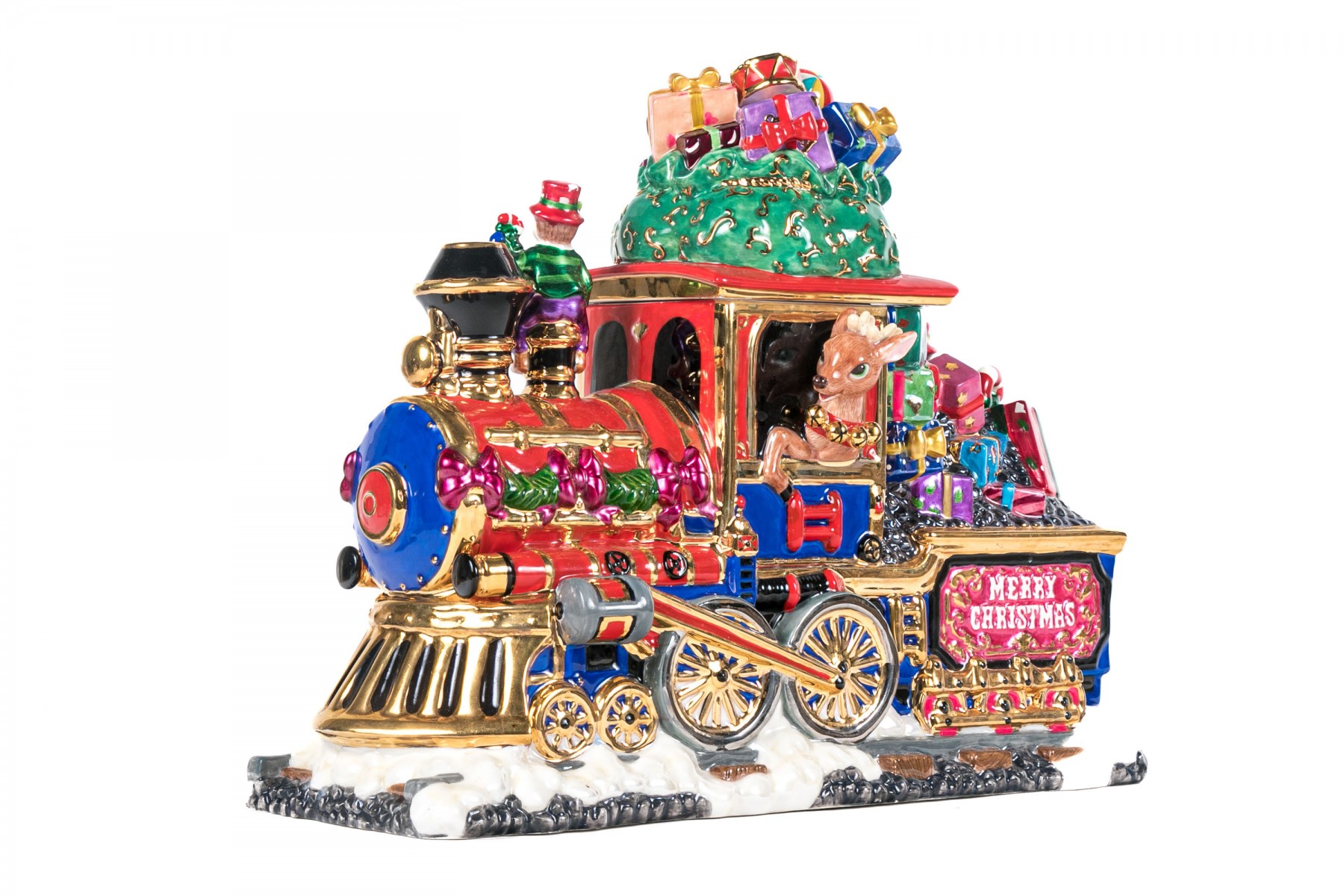 A large colorful Christmas ornament of a steam engine decorated and filled with toys and figures including Santa and a reindeer.