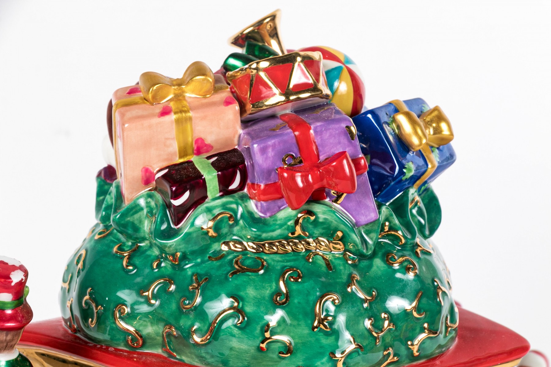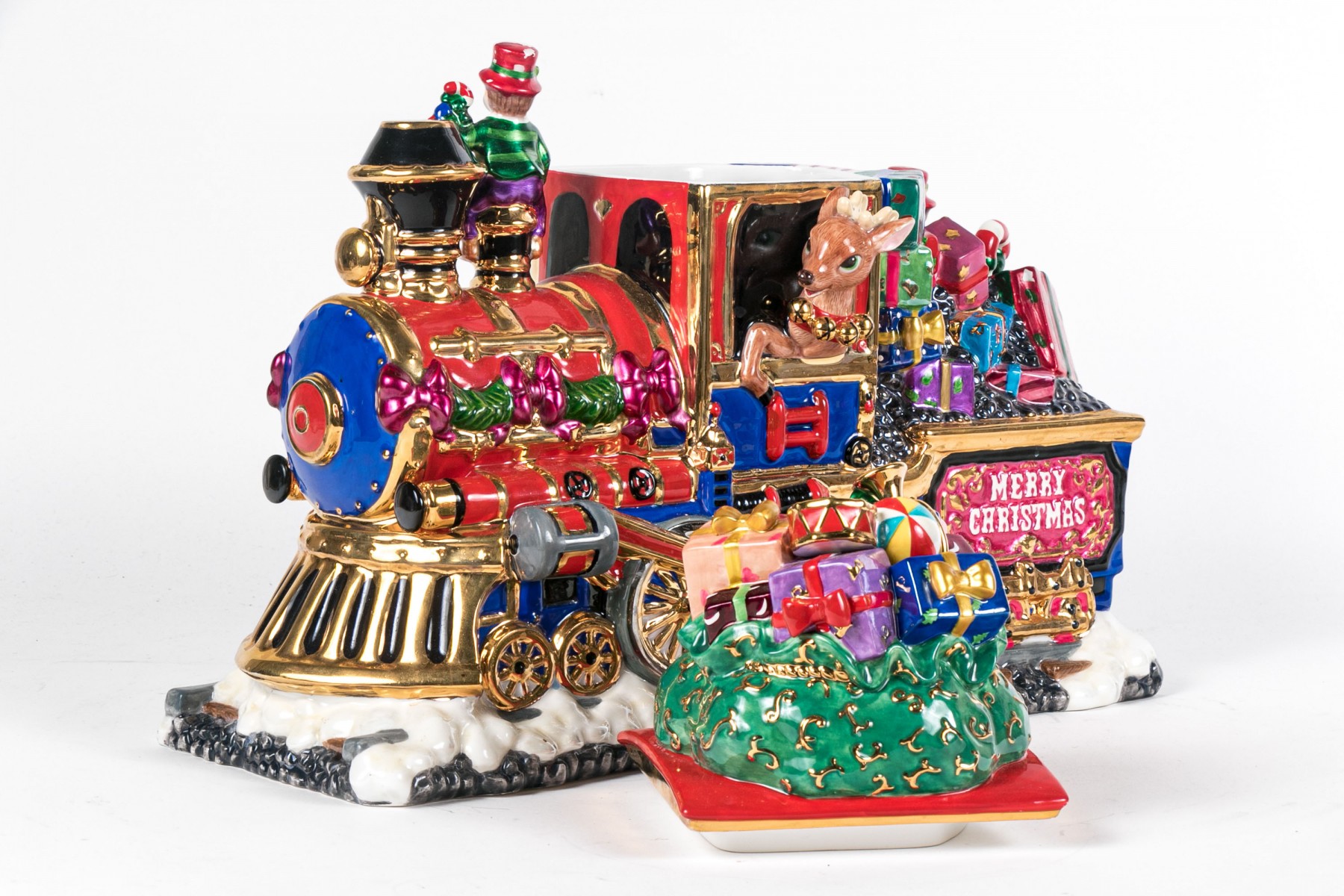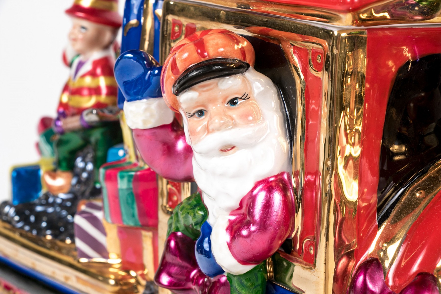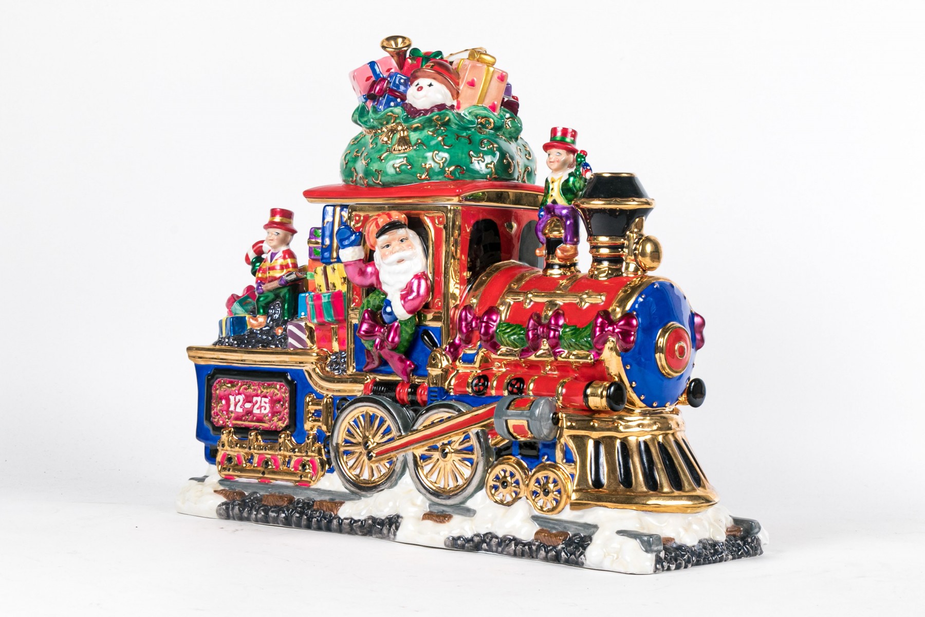 A large colorful Christmas ornament of a steam engine decorated and filled with toys and figures including Santa and a reindeer.