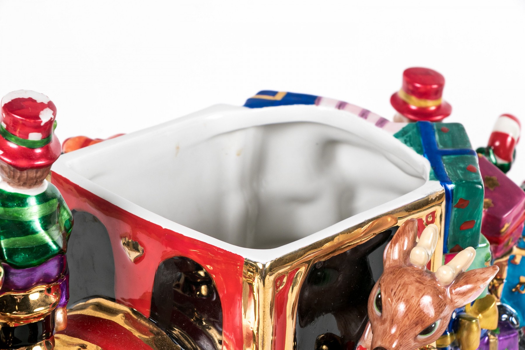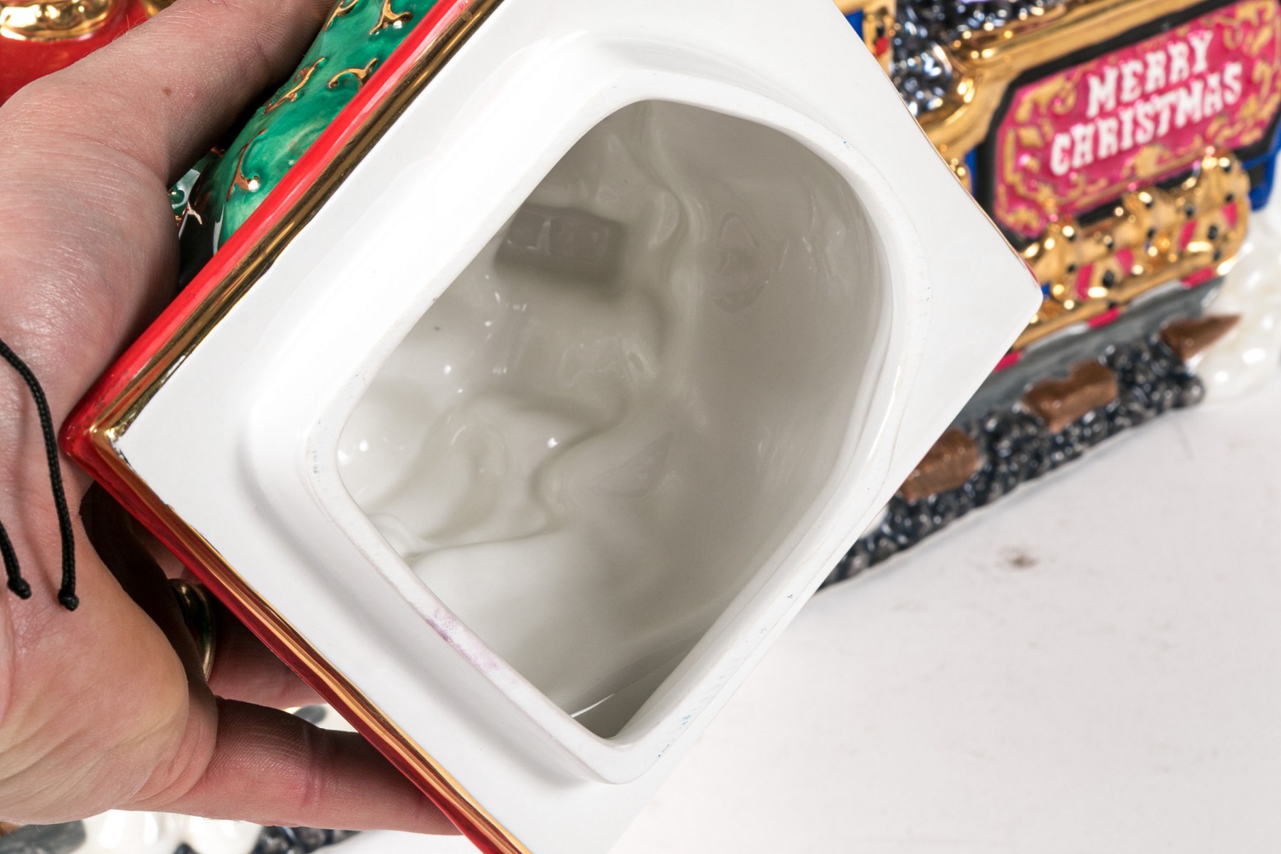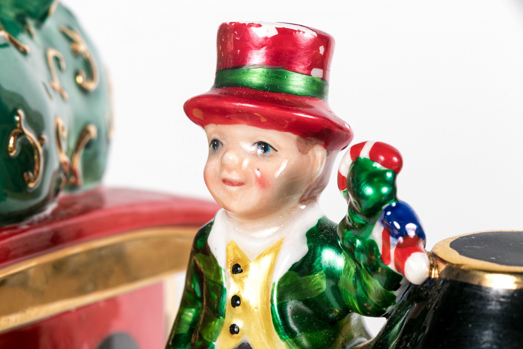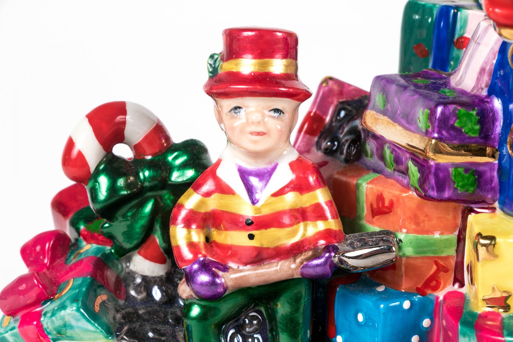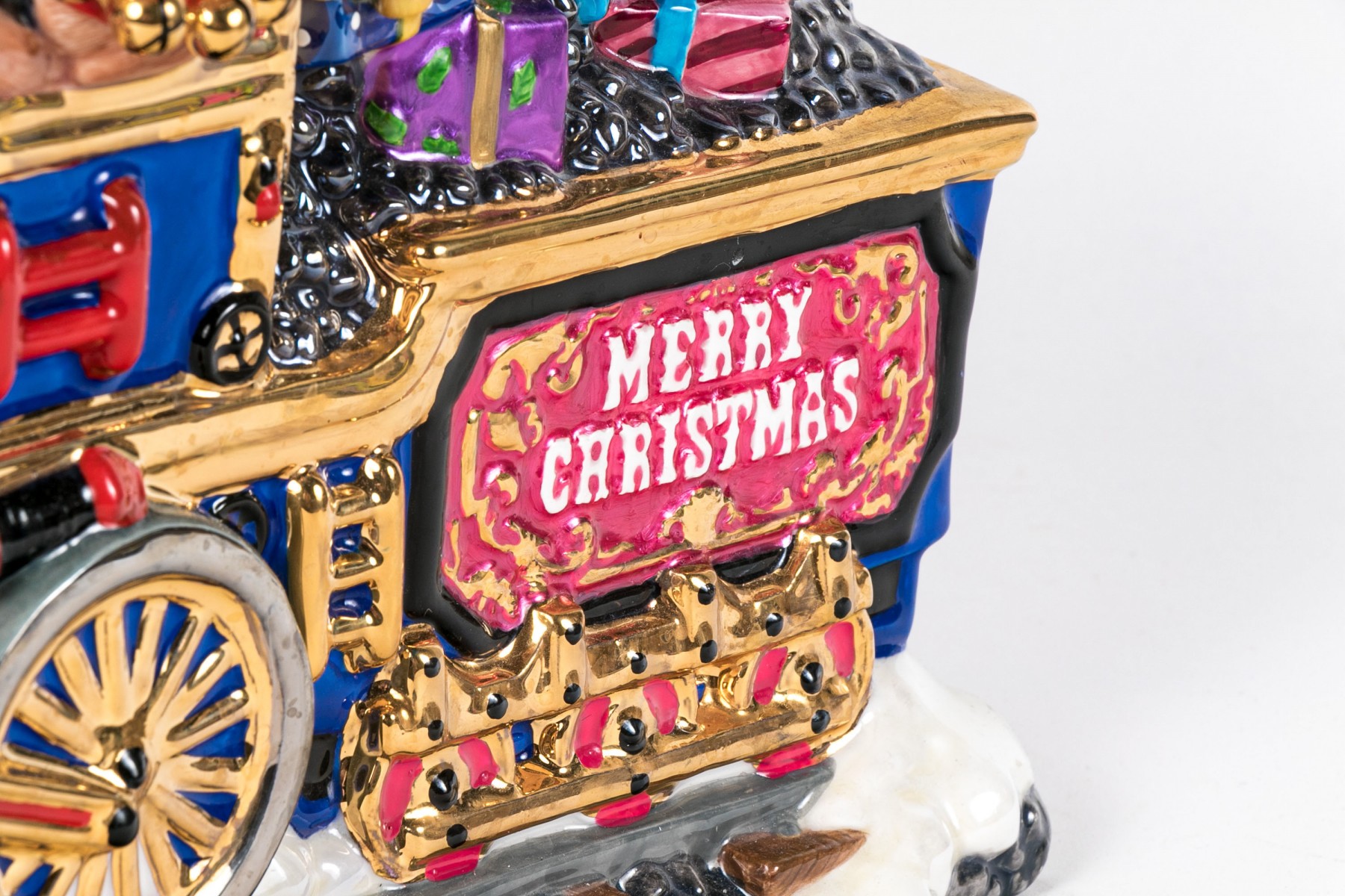 A large colorful Christmas ornament of a steam engine decorated and filled with toys and figures including Santa and a reindeer.