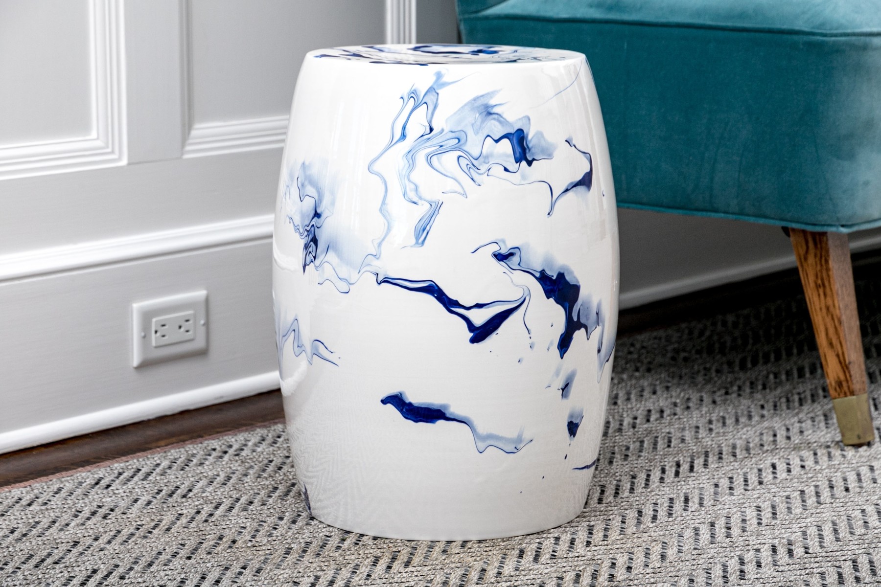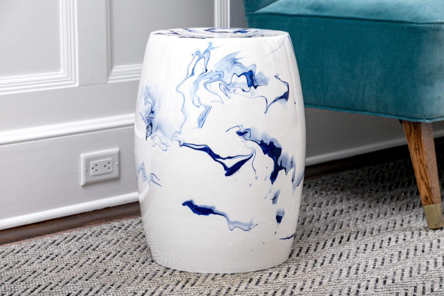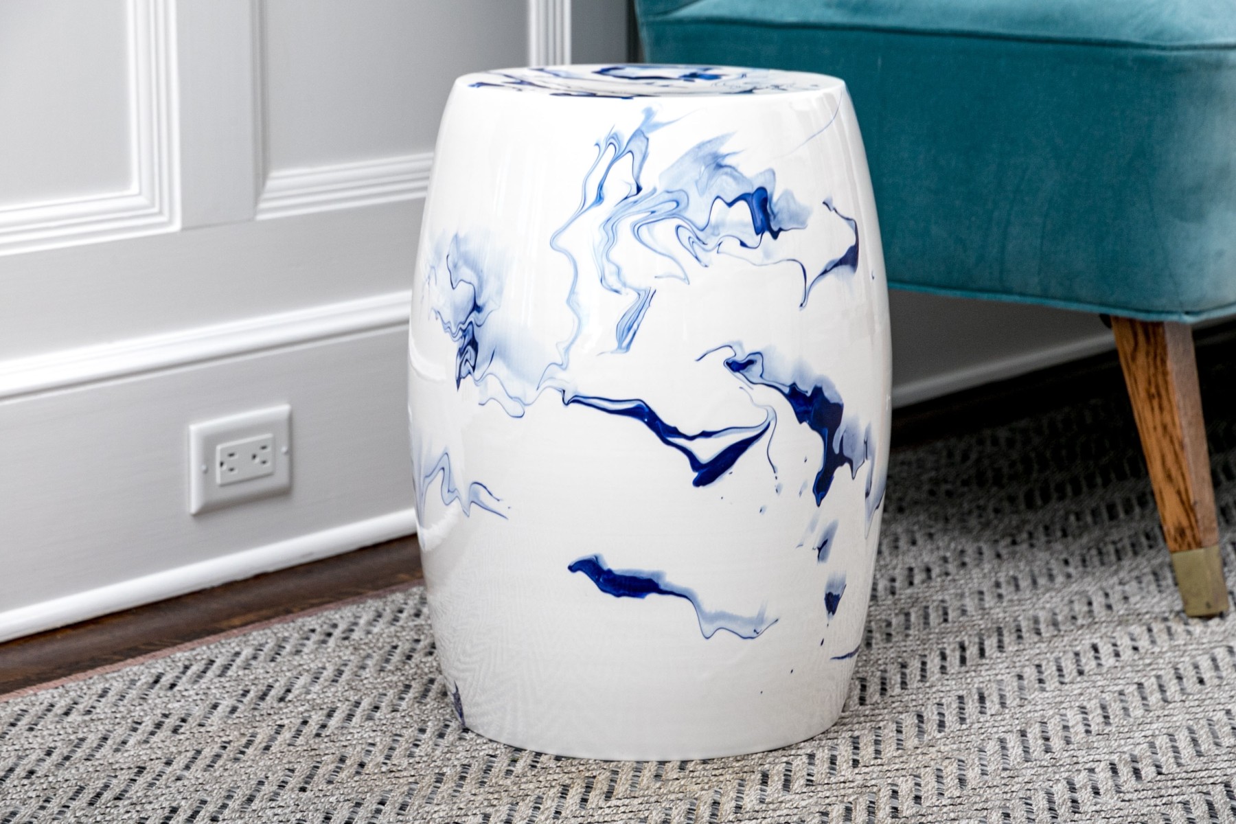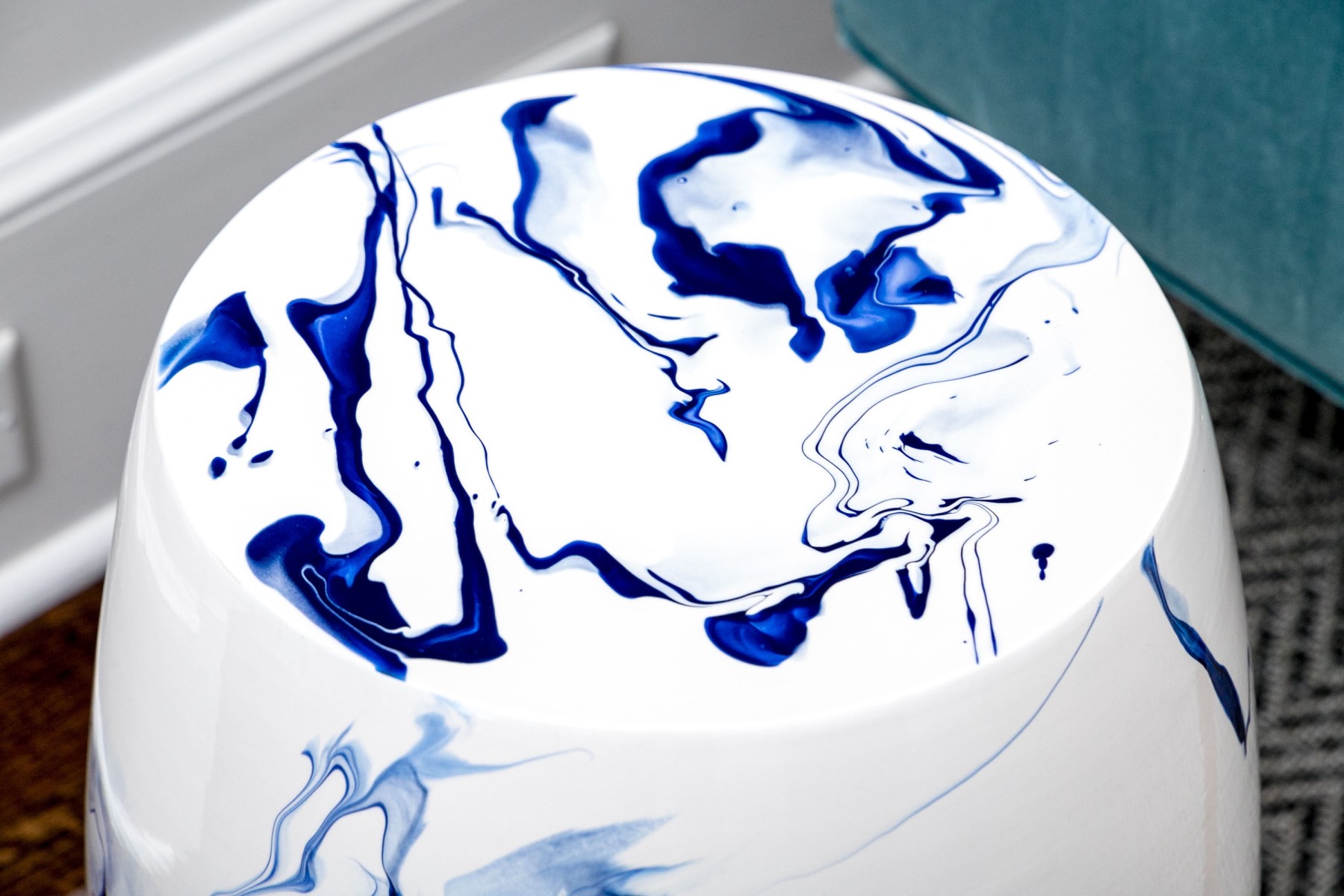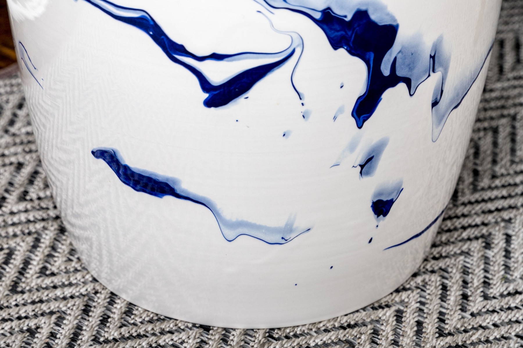 A sleek and stylish Christopher Spitzmiller Inc. "Delft Blue Marble" garden stool showcasing a modernized take on the traditional drum form. Detailed with artistic and abstract vein-like accents in rich cobalt blue over a bright white, tall ovoid body. Marked underfoot.