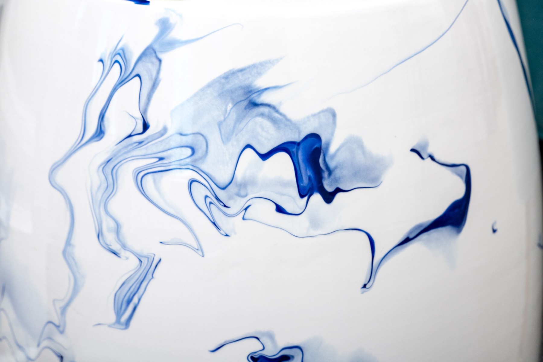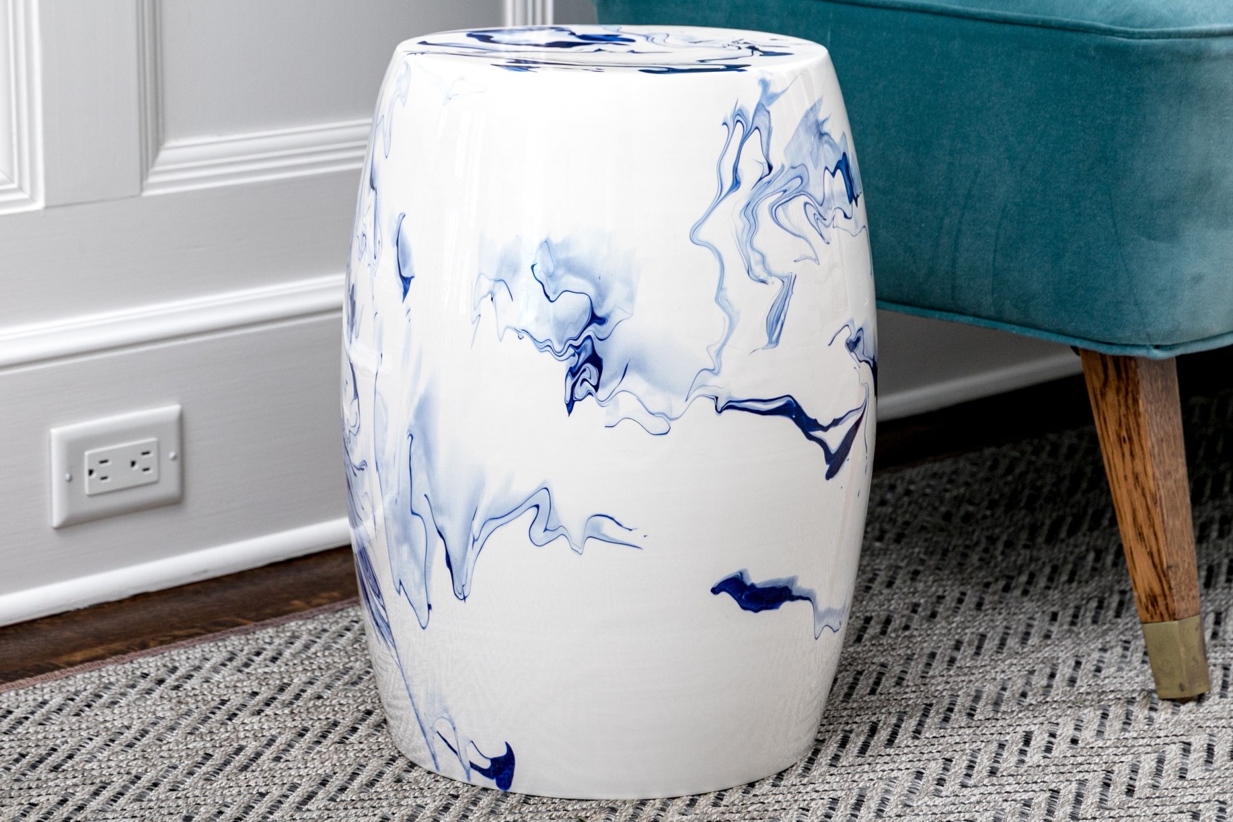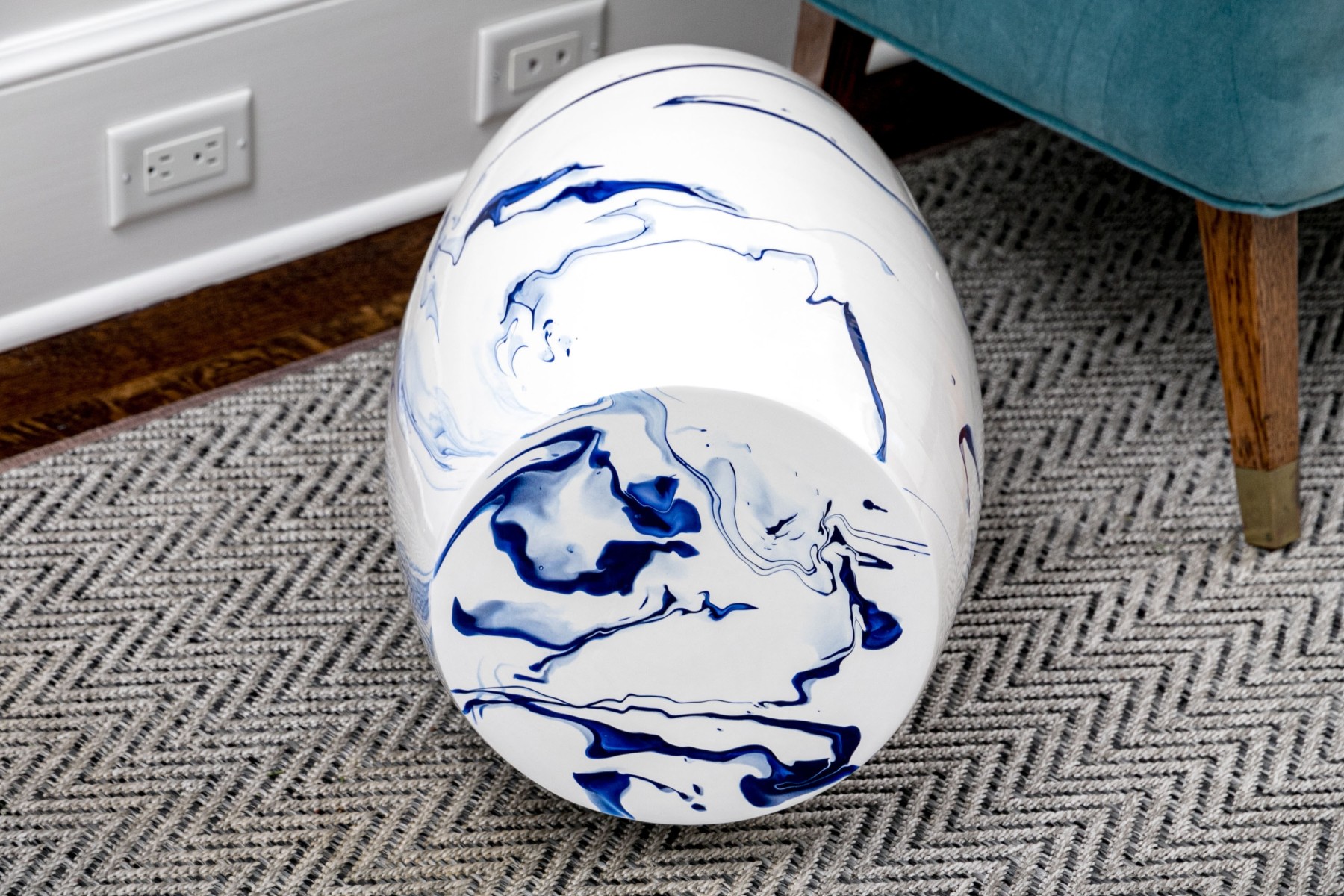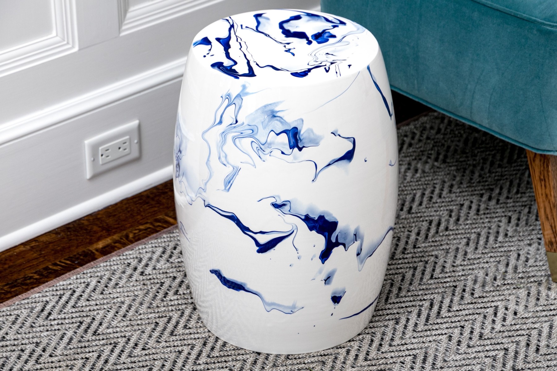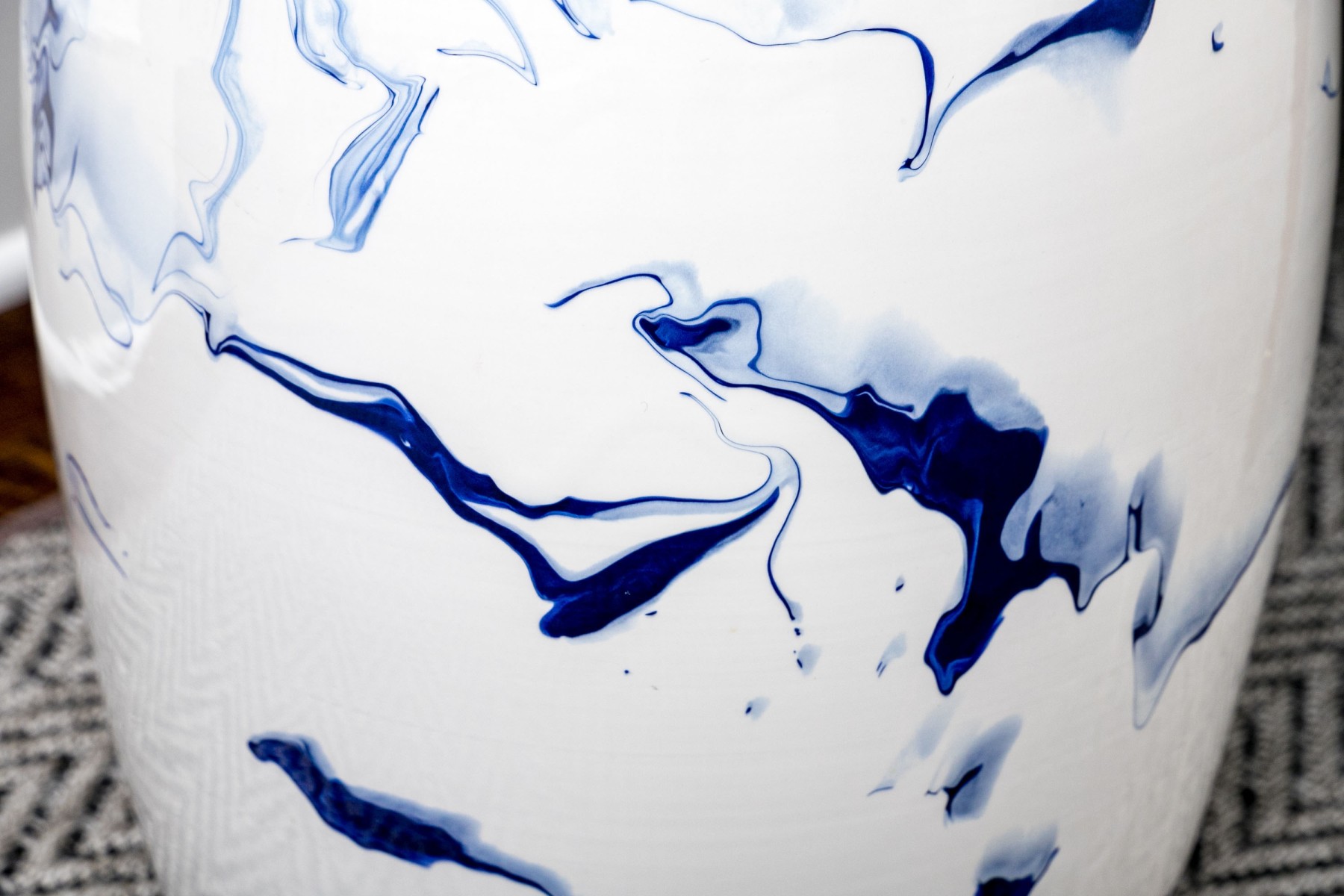 A sleek and stylish Christopher Spitzmiller Inc. "Delft Blue Marble" garden stool showcasing a modernized take on the traditional drum form. Detailed with artistic and abstract vein-like accents in rich cobalt blue over a bright white, tall ovoid body. Marked underfoot.