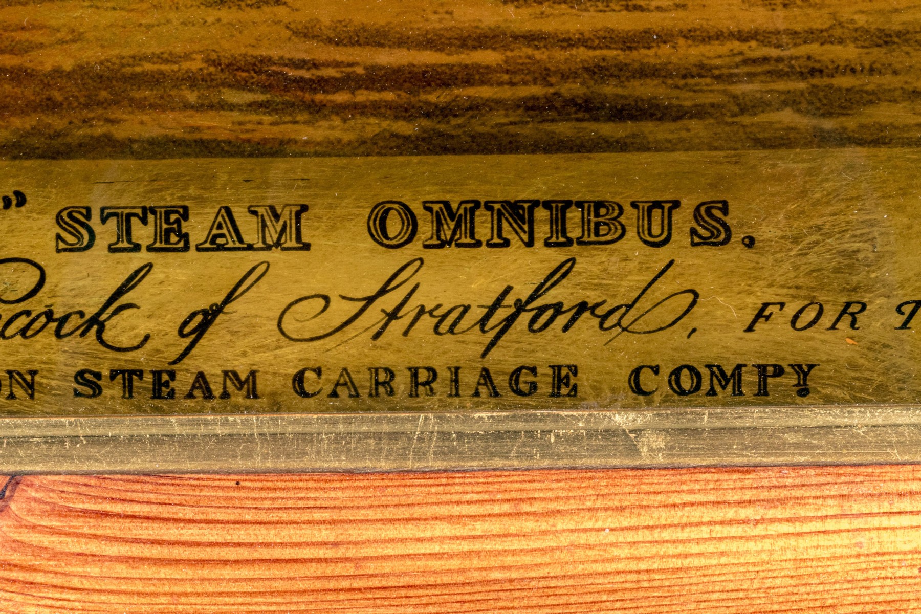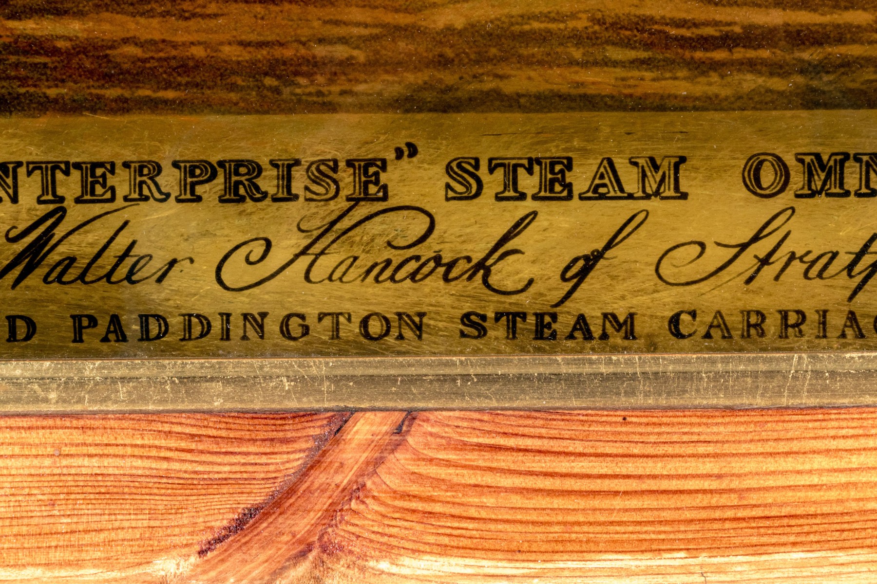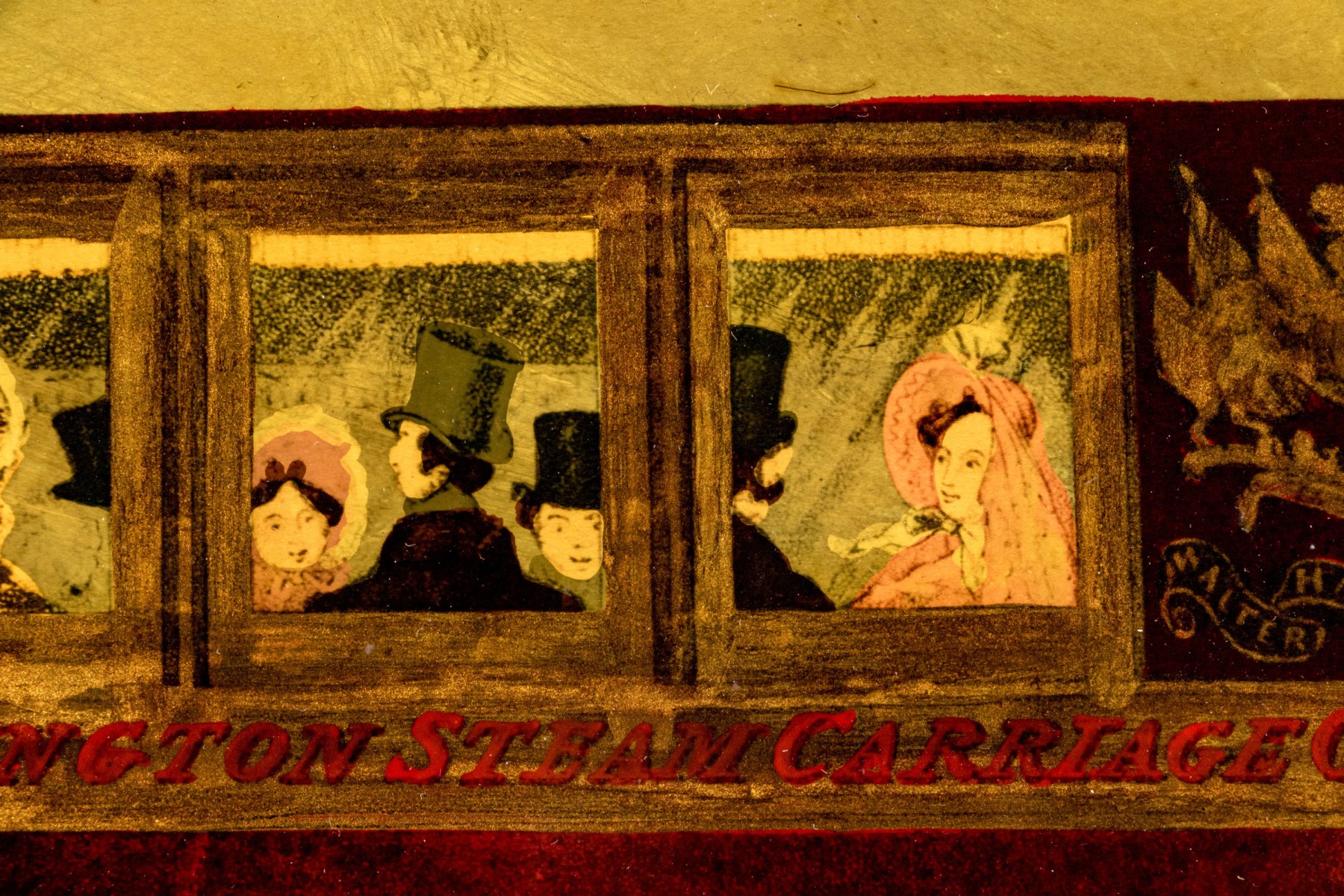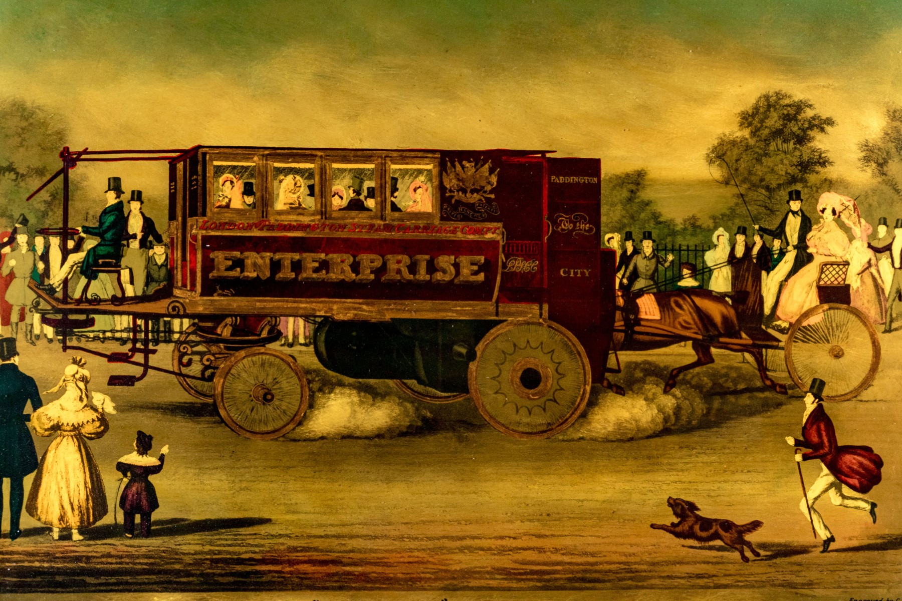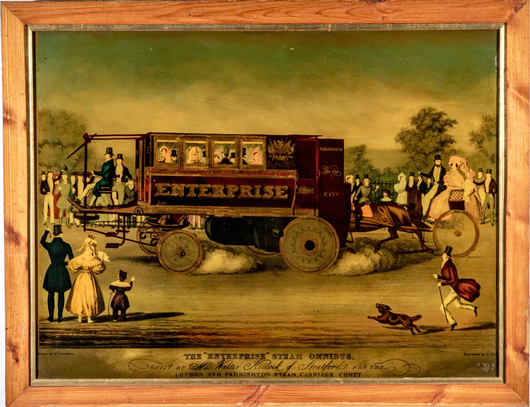 A dark and sharply colored print after the original color engraving by C. Hunt published in London 1833 after artwork by W. Summers. It features the first steam carriage with passengers to run on a regular schedule in London. For the London & Paddington Steam-Carriage Co. Presented in a stained, painted and gilt wood frame with glass.
