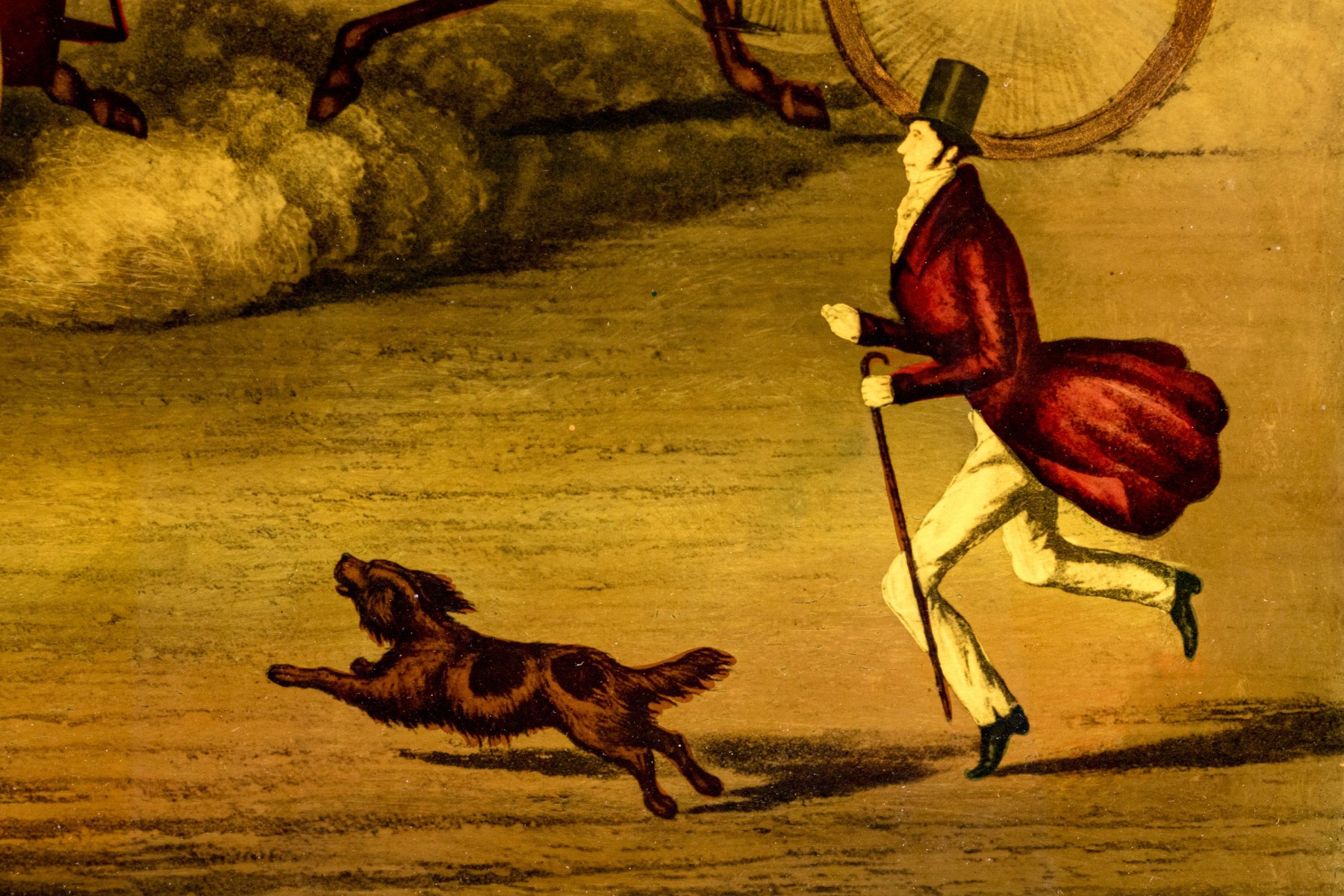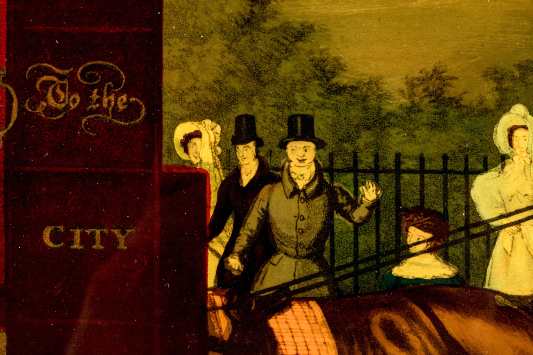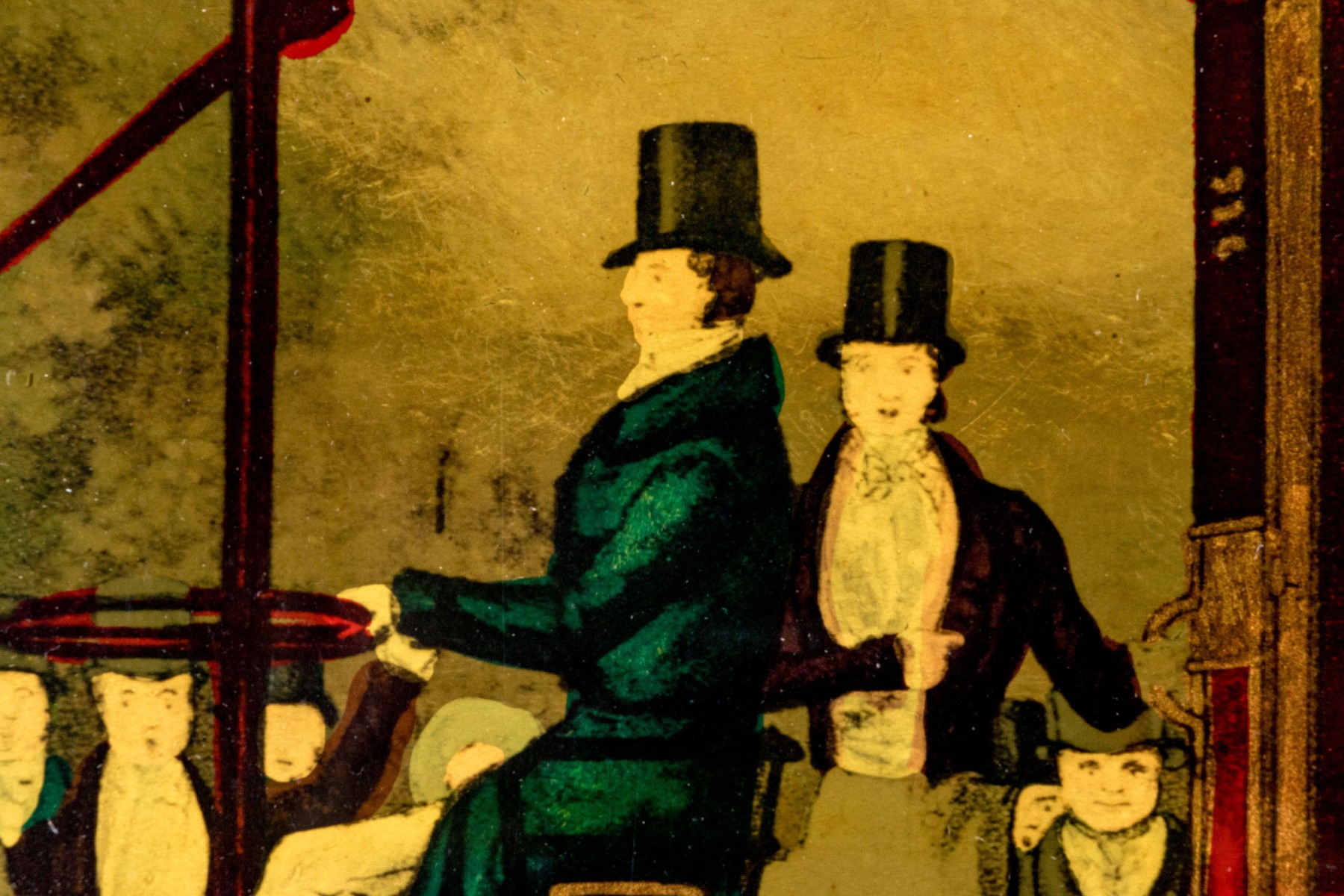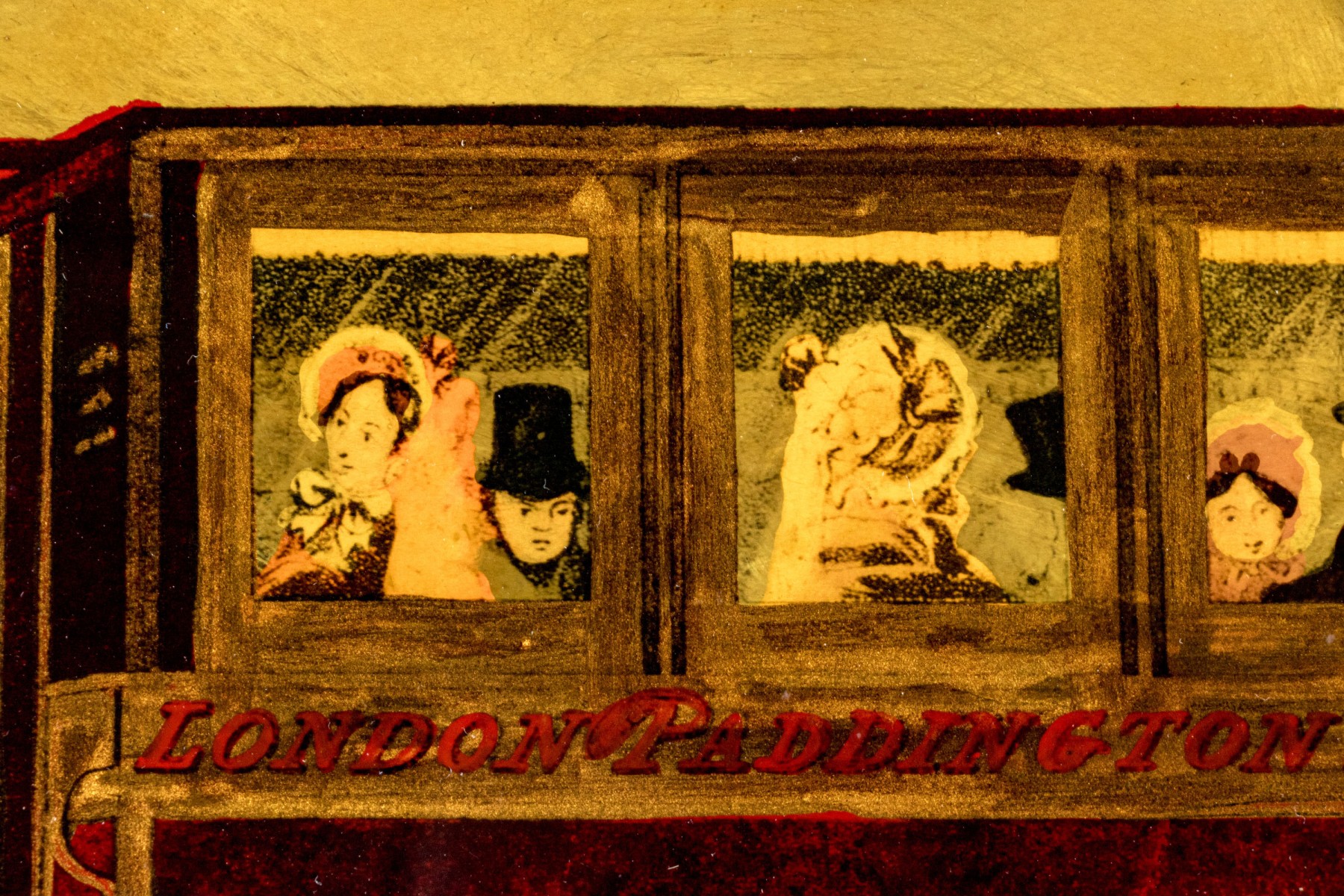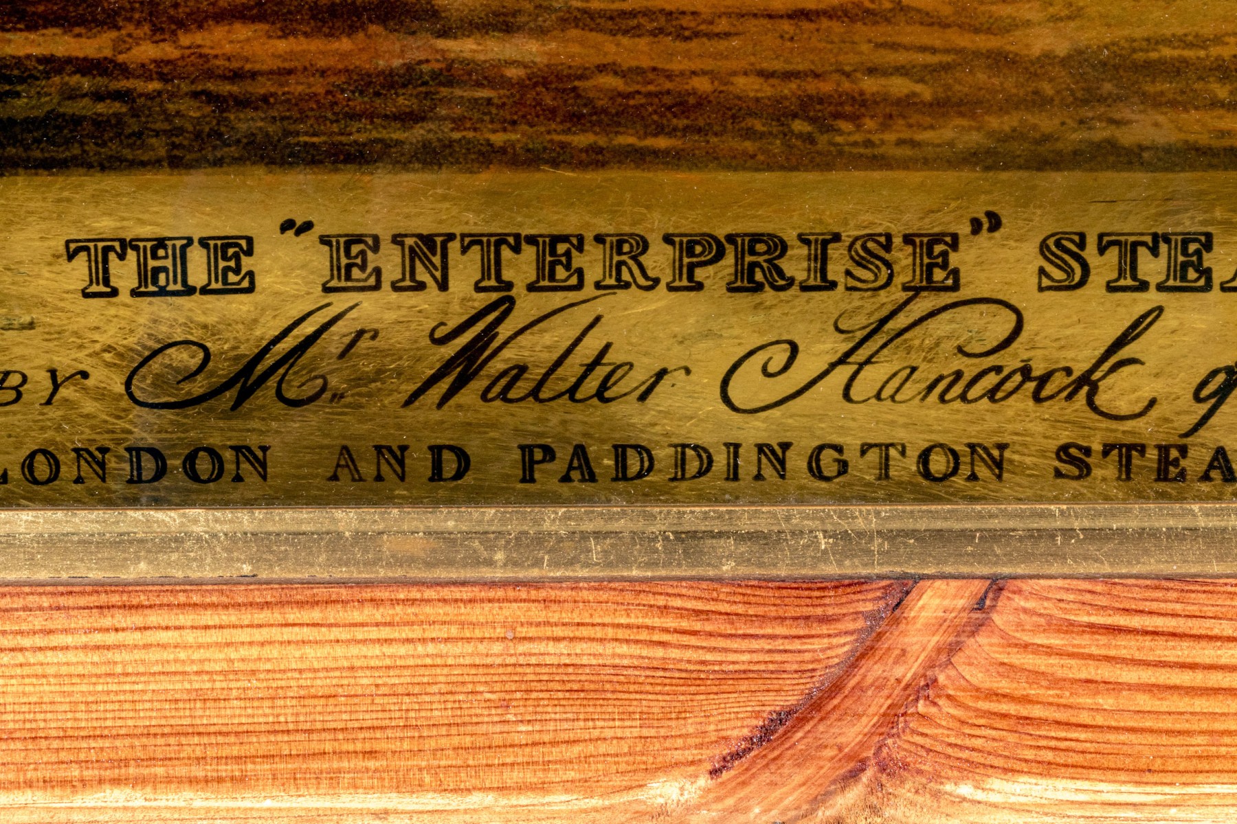 A dark and sharply colored print after the original color engraving by C. Hunt published in London 1833 after artwork by W. Summers. It features the first steam carriage with passengers to run on a regular schedule in London. For the London & Paddington Steam-Carriage Co. Presented in a stained, painted and gilt wood frame with glass.