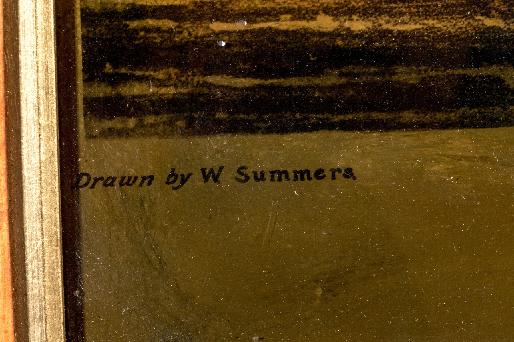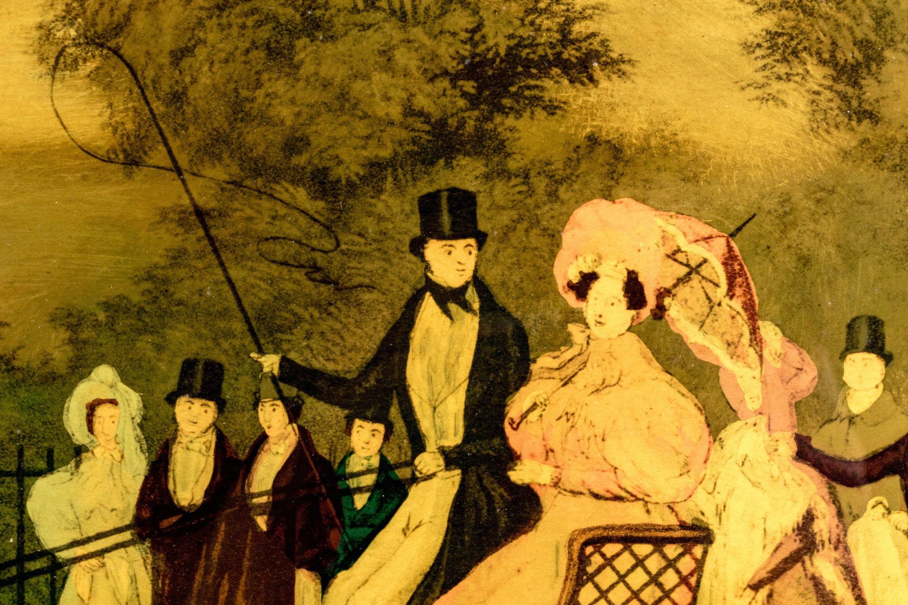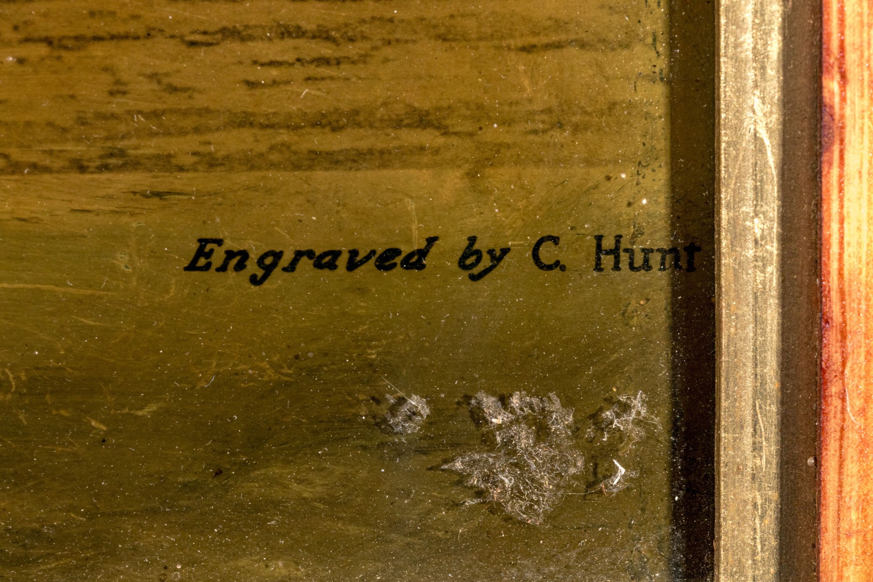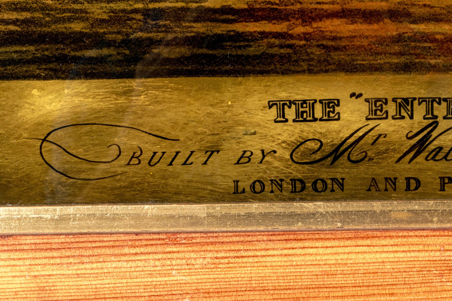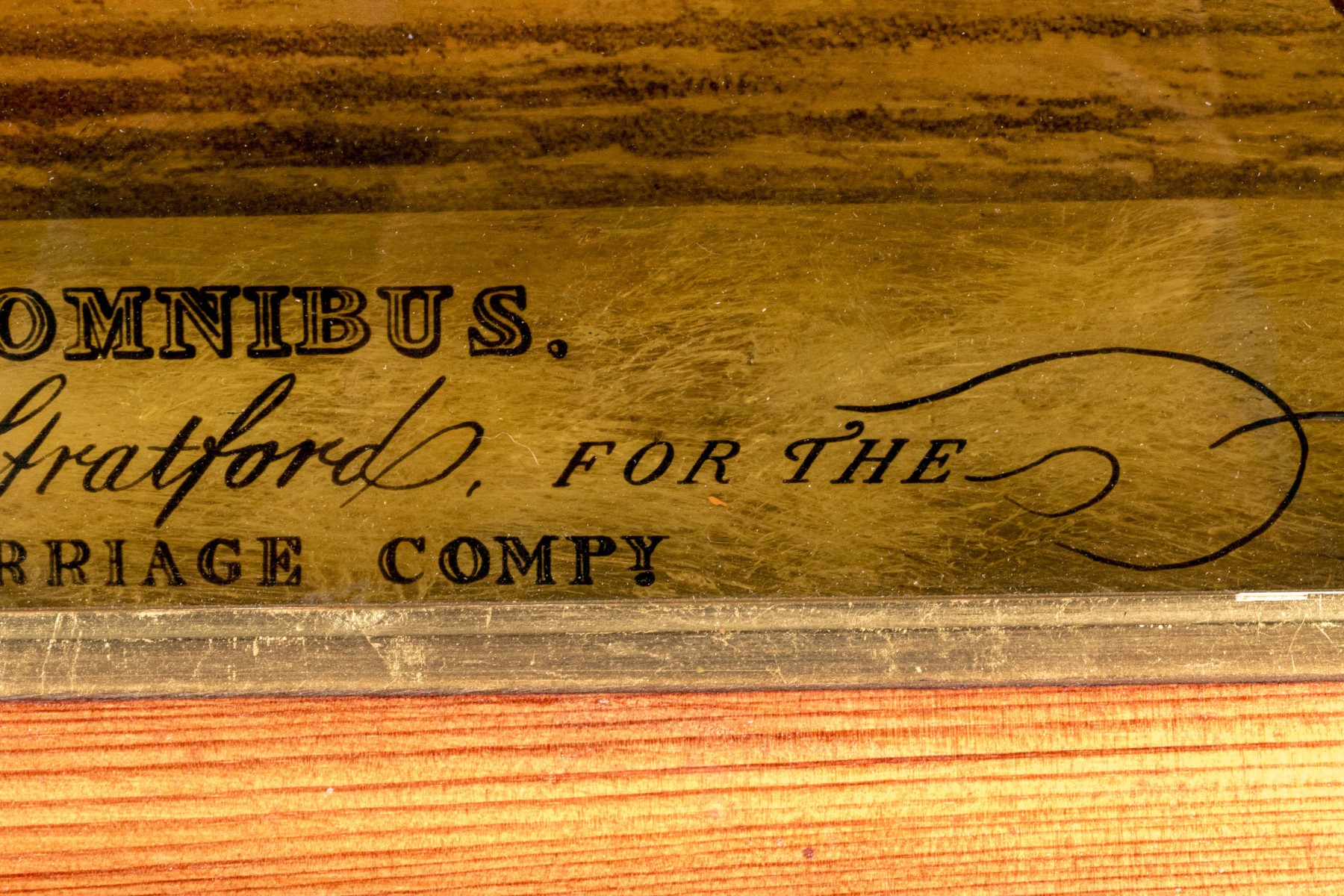A dark and sharply colored print after the original color engraving by C. Hunt published in London 1833 after artwork by W. Summers. It features the first steam carriage with passengers to run on a regular schedule in London. For the London & Paddington Steam-Carriage Co. Presented in a stained, painted and gilt wood frame with glass.