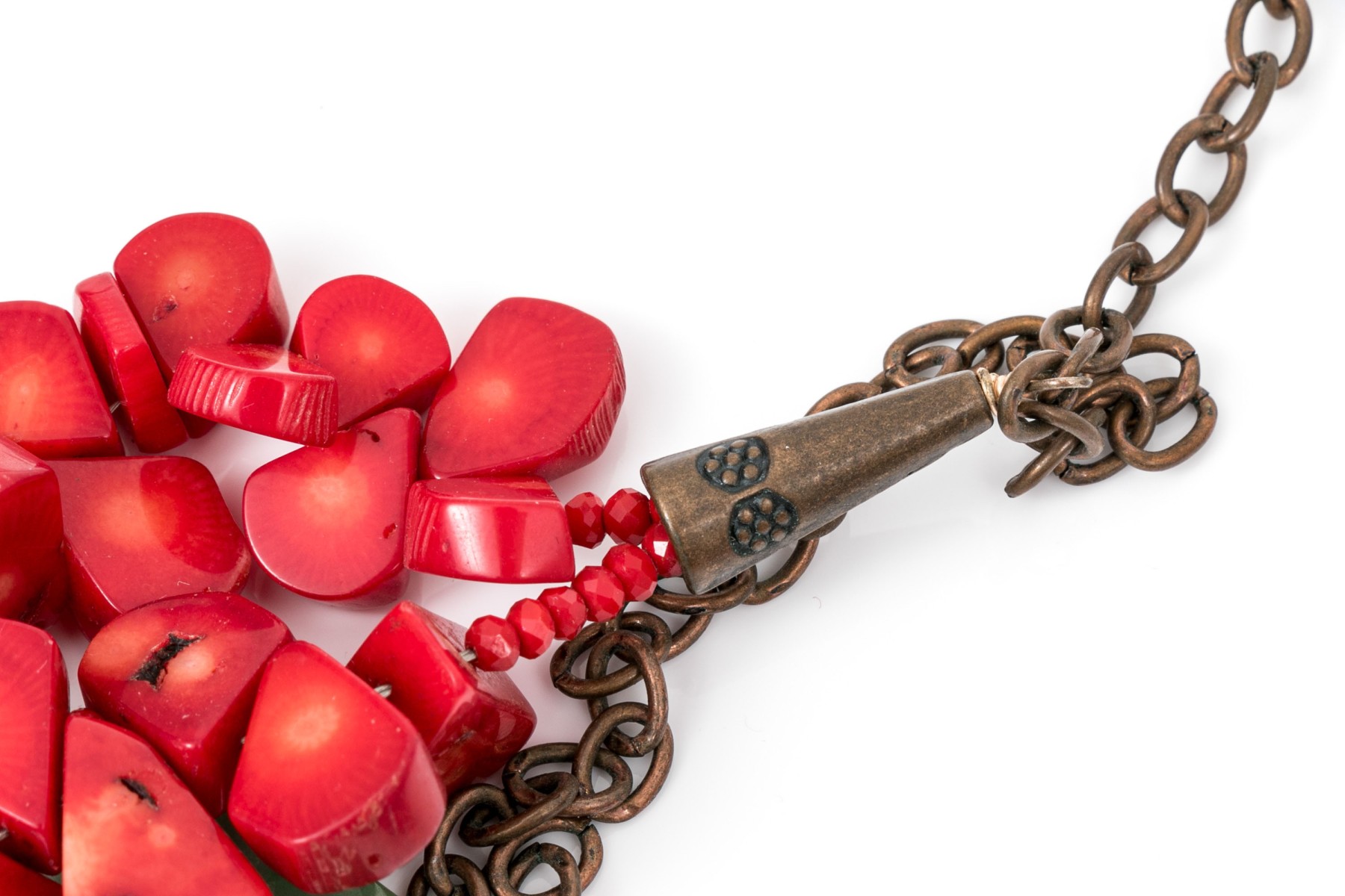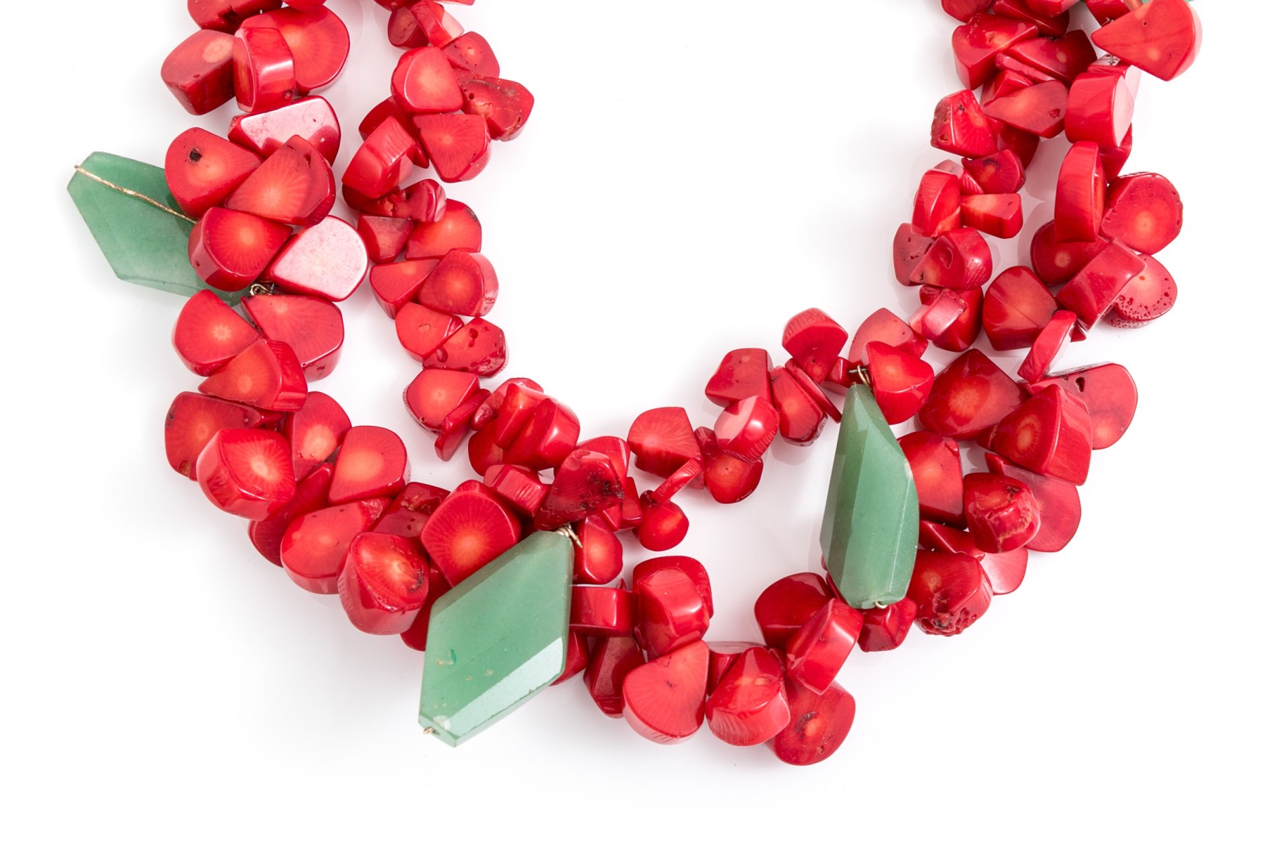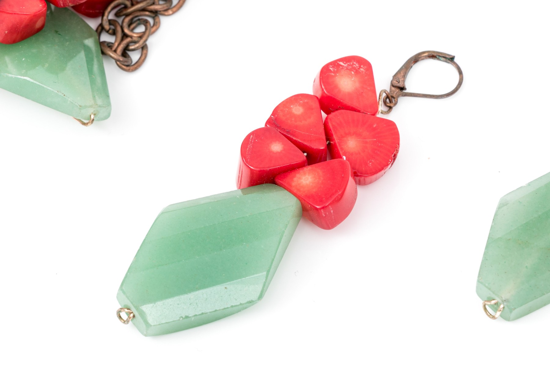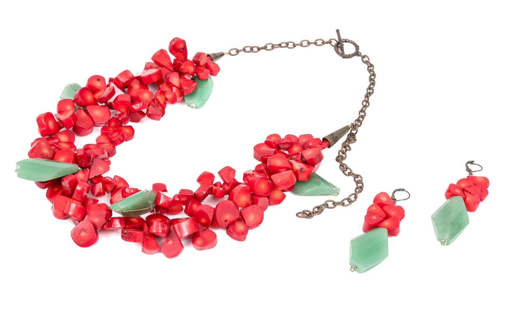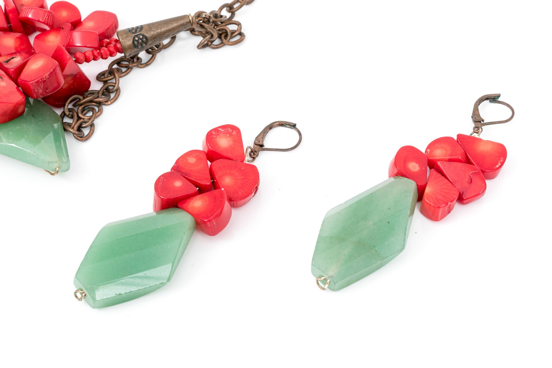 Chunky coral and green aventurine double strand fashion necklace, with earrings