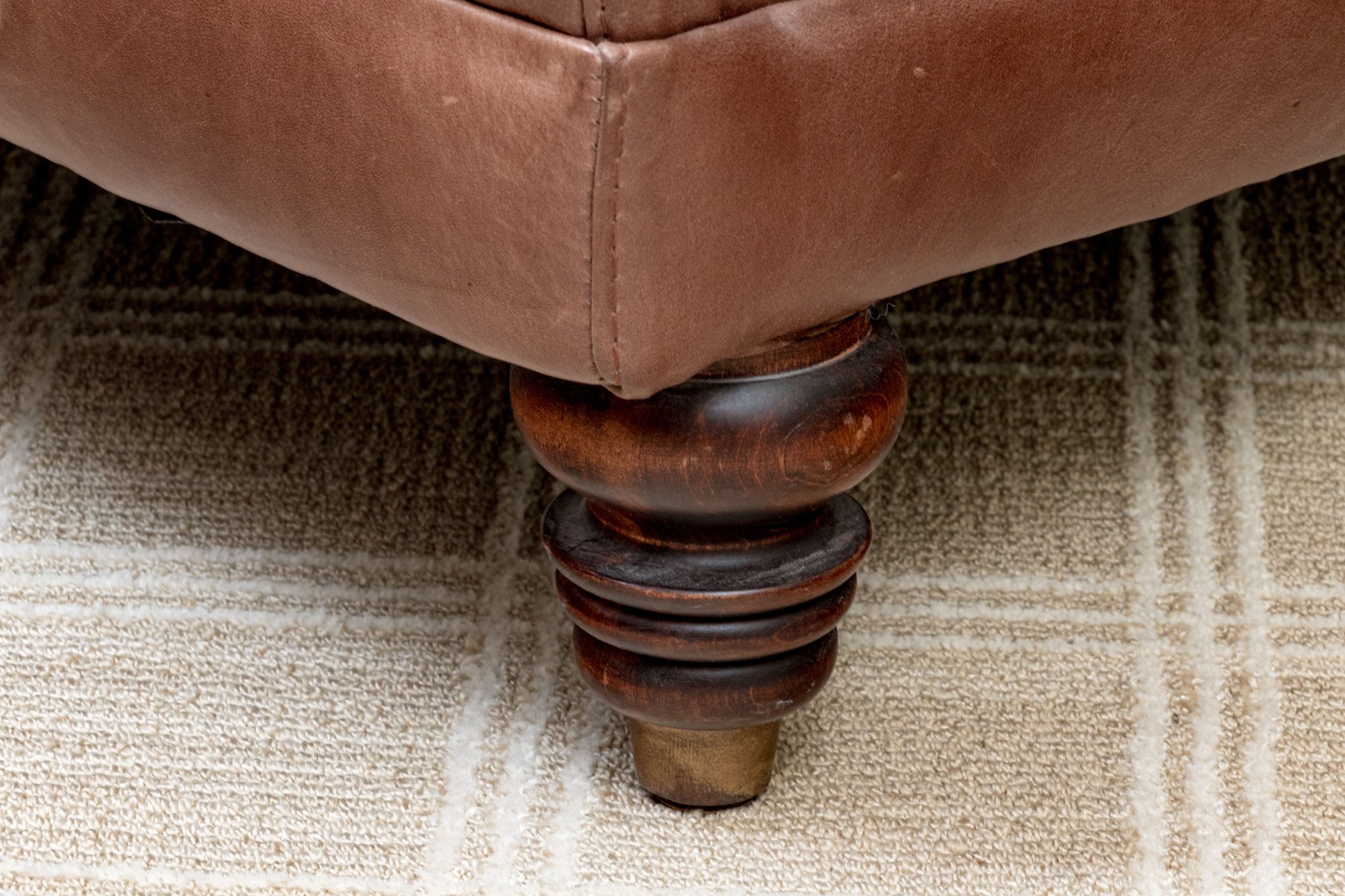 Cibola chaise lounge upholstered in chocolate brown leather, displaying tall, gently rolled arms and a long, stately seat over a straight apron. Raised on stout, turned feet.
