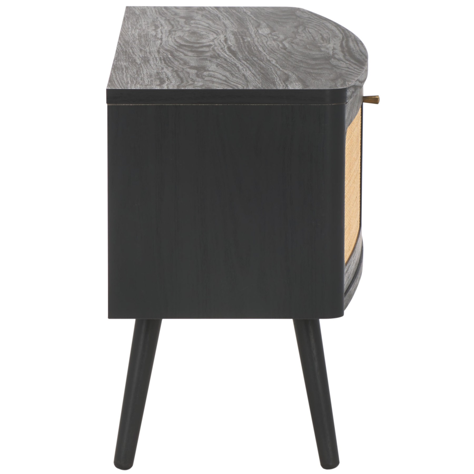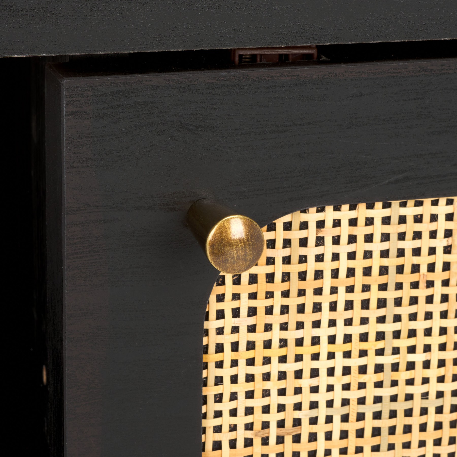 Add a chic and breezy focal point to your space with our Cielle media stand. With a curved profile, our richly textured media console packs plenty of character and charm. The cabinets are covered with a rattan mesh to attain a breezy appeal. Perched upon tapered legs, our media unit stands out with its modern and airy presence. A black finish lends versatile appeal to our media stand. It features an open shelf to display your favorite decor items and collectibles, along with two roomy cabinets to neatly tuck away all your media essentials.