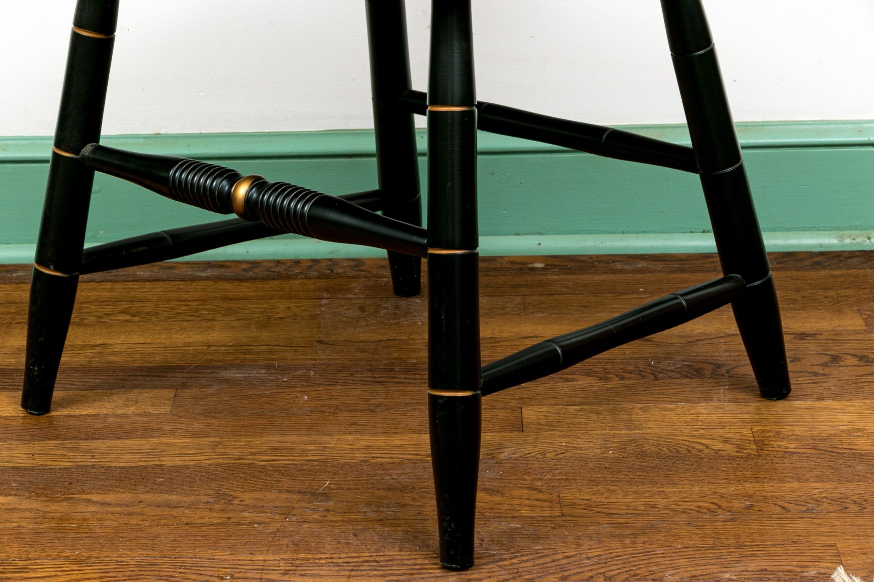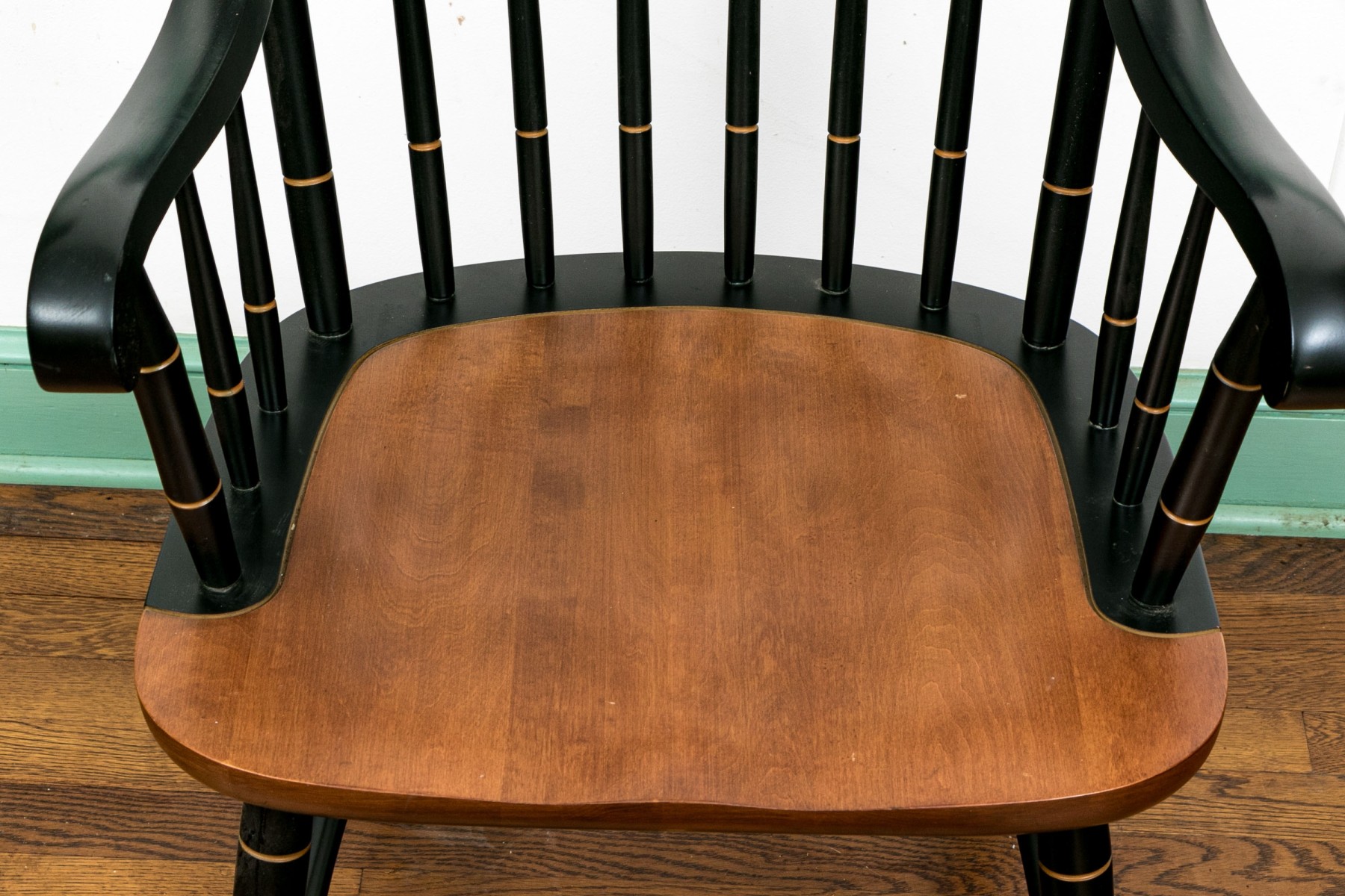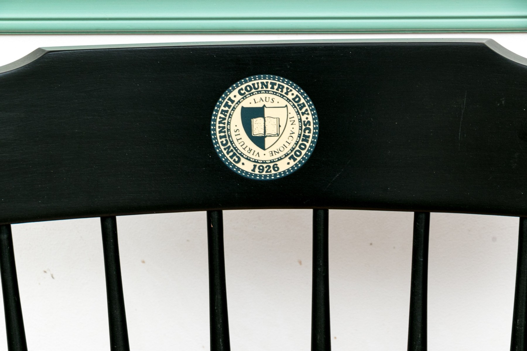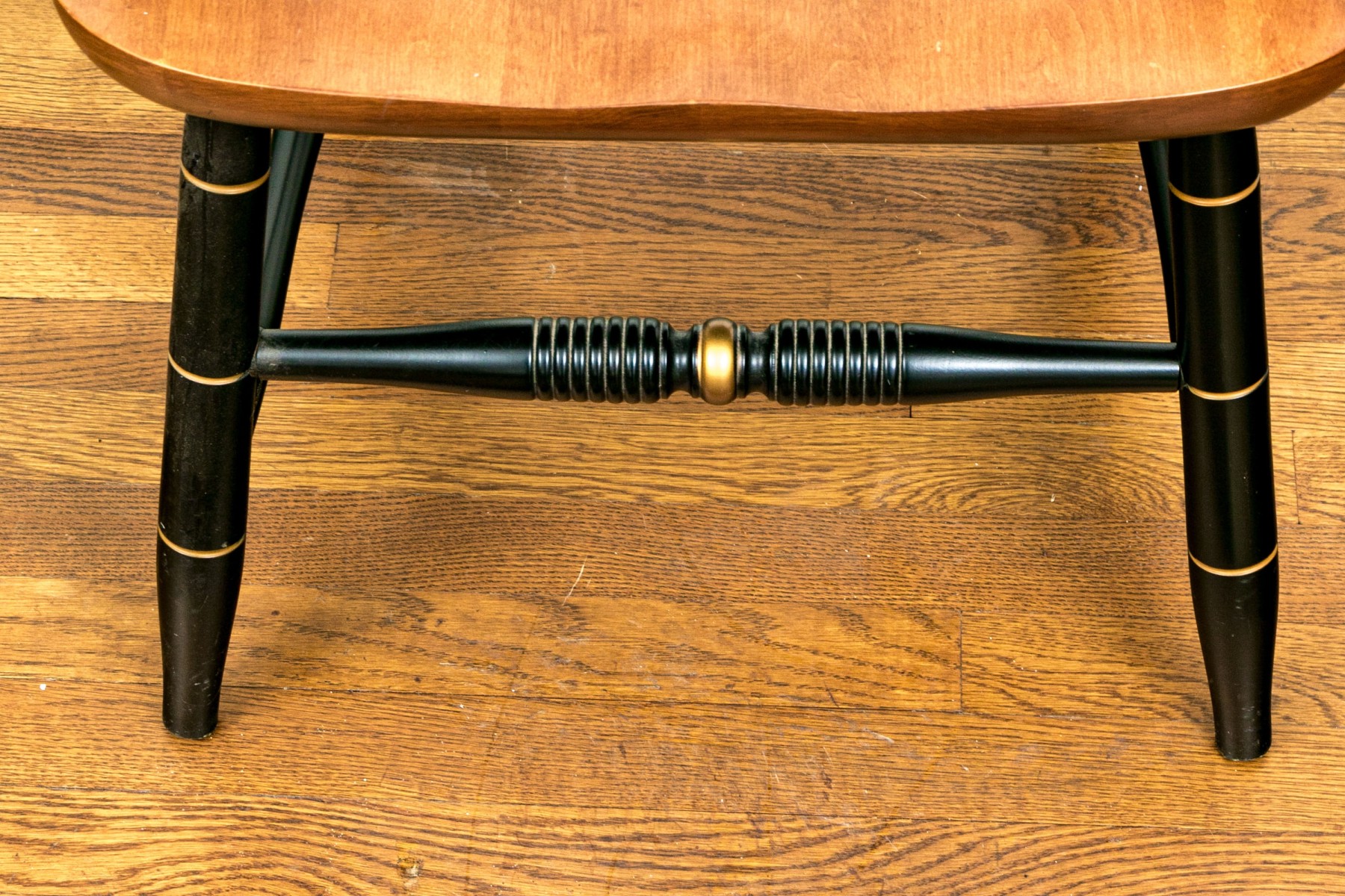 A lovely Hitchcock style captains chair with traditional windsor charm, sporting an ebonized spindle back with parcel gilt bands, gently curved arms, and a subtly contoured seat in rich, warm medium brown wood. Raised on four angled legs with an H-stretcher. The top rail is detailed with a crest for Cincinnati Country Day School, while the reverse is monogrammed for the class of 1965.