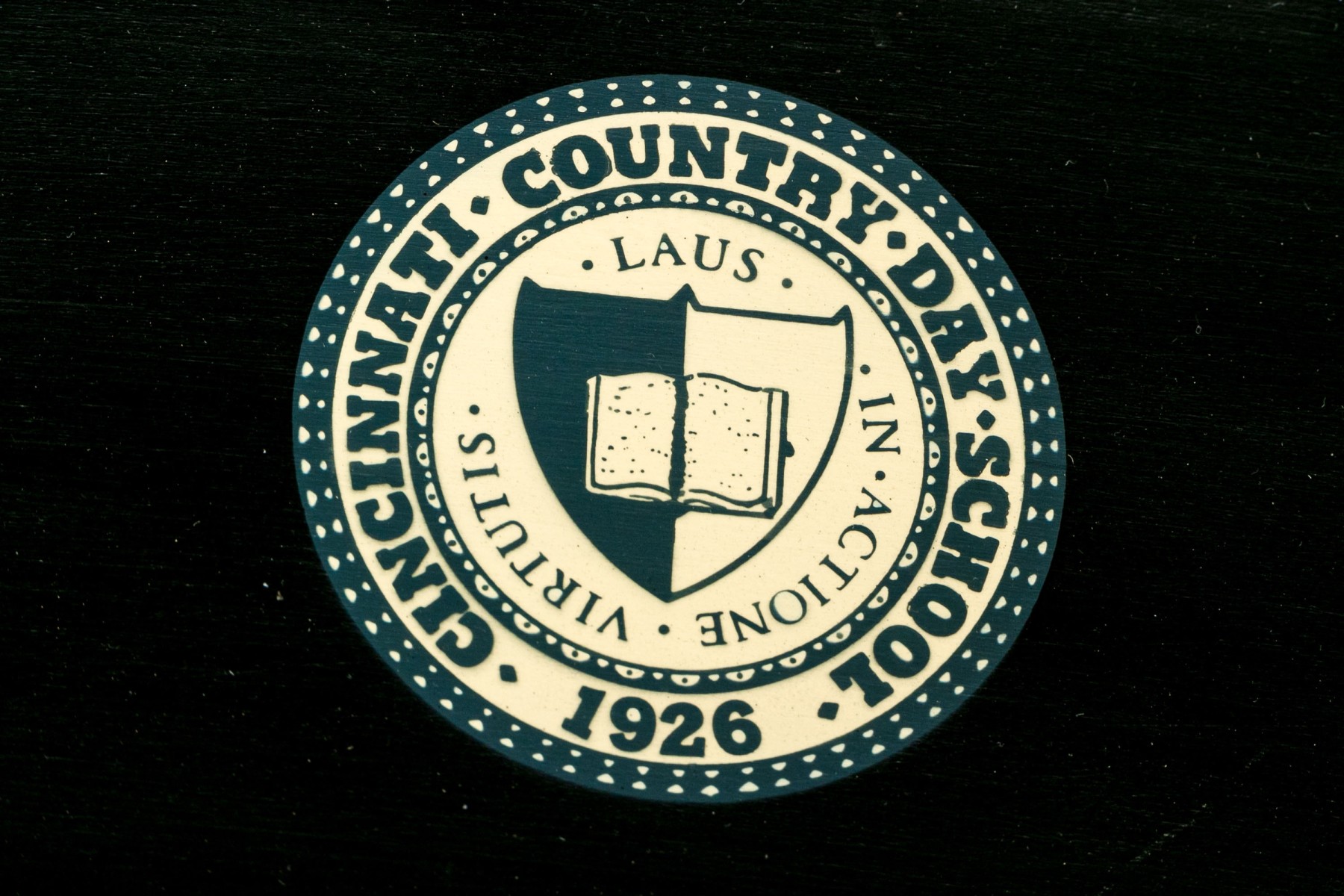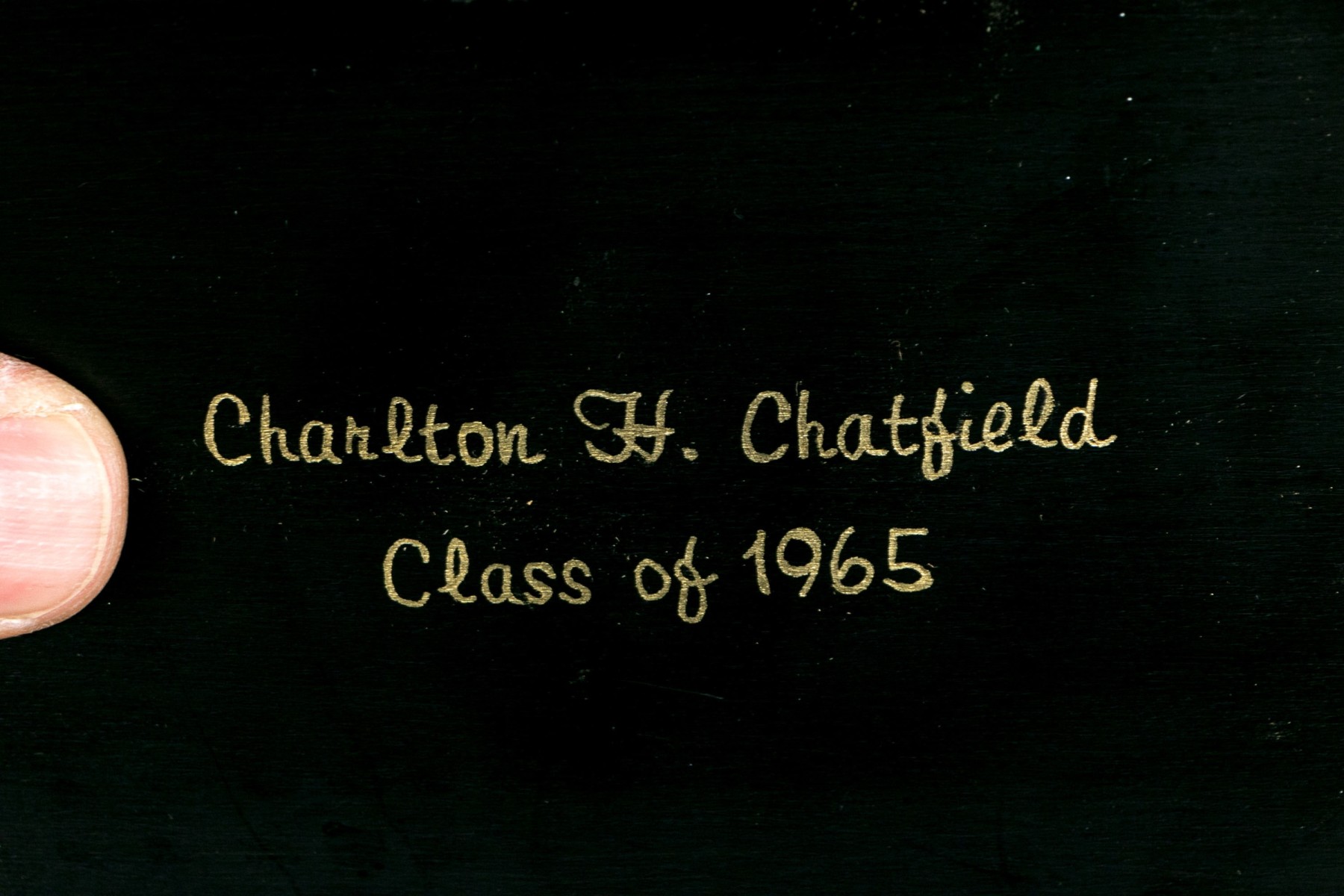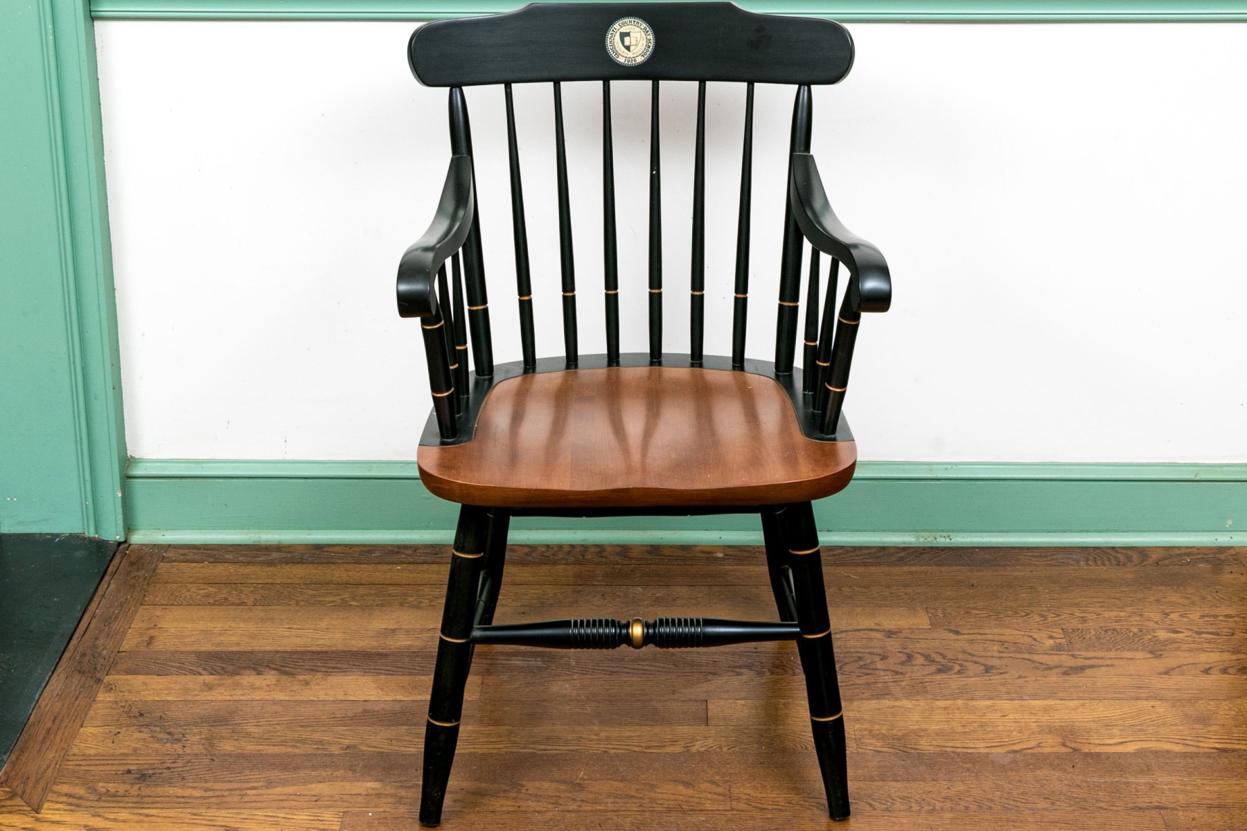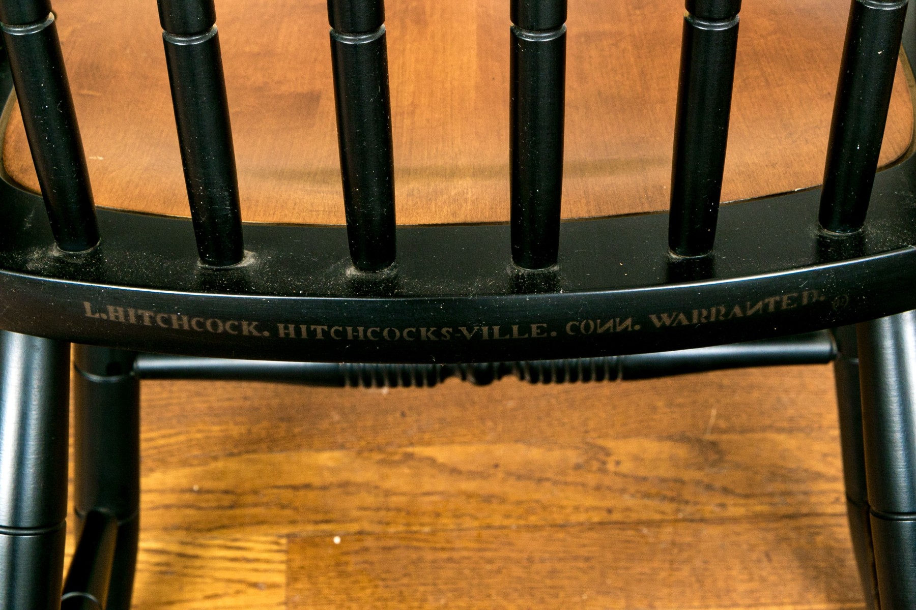 A lovely Hitchcock style captains chair with traditional windsor charm, sporting an ebonized spindle back with parcel gilt bands, gently curved arms, and a subtly contoured seat in rich, warm medium brown wood. Raised on four angled legs with an H-stretcher. The top rail is detailed with a crest for Cincinnati Country Day School, while the reverse is monogrammed for the class of 1965.