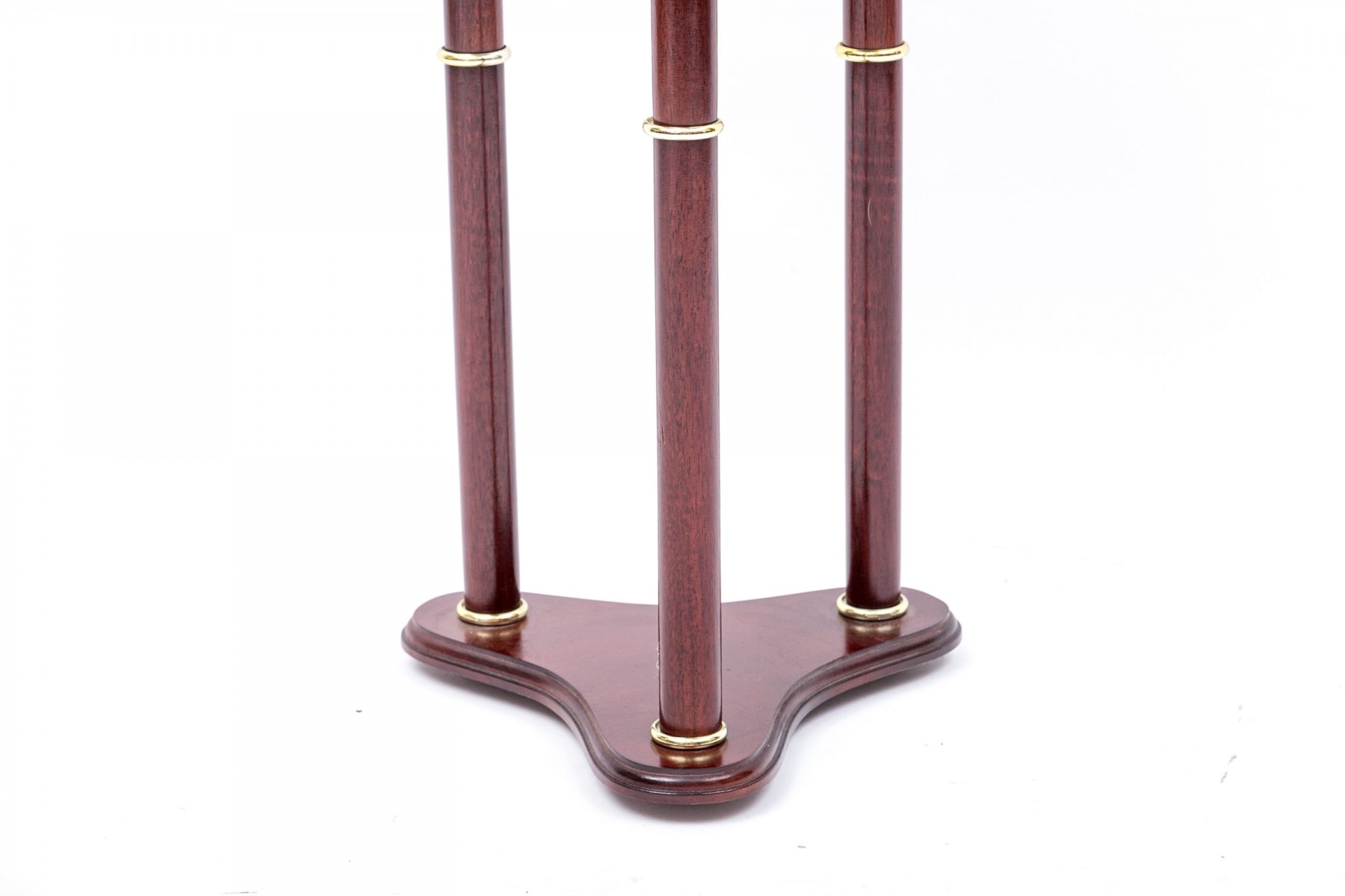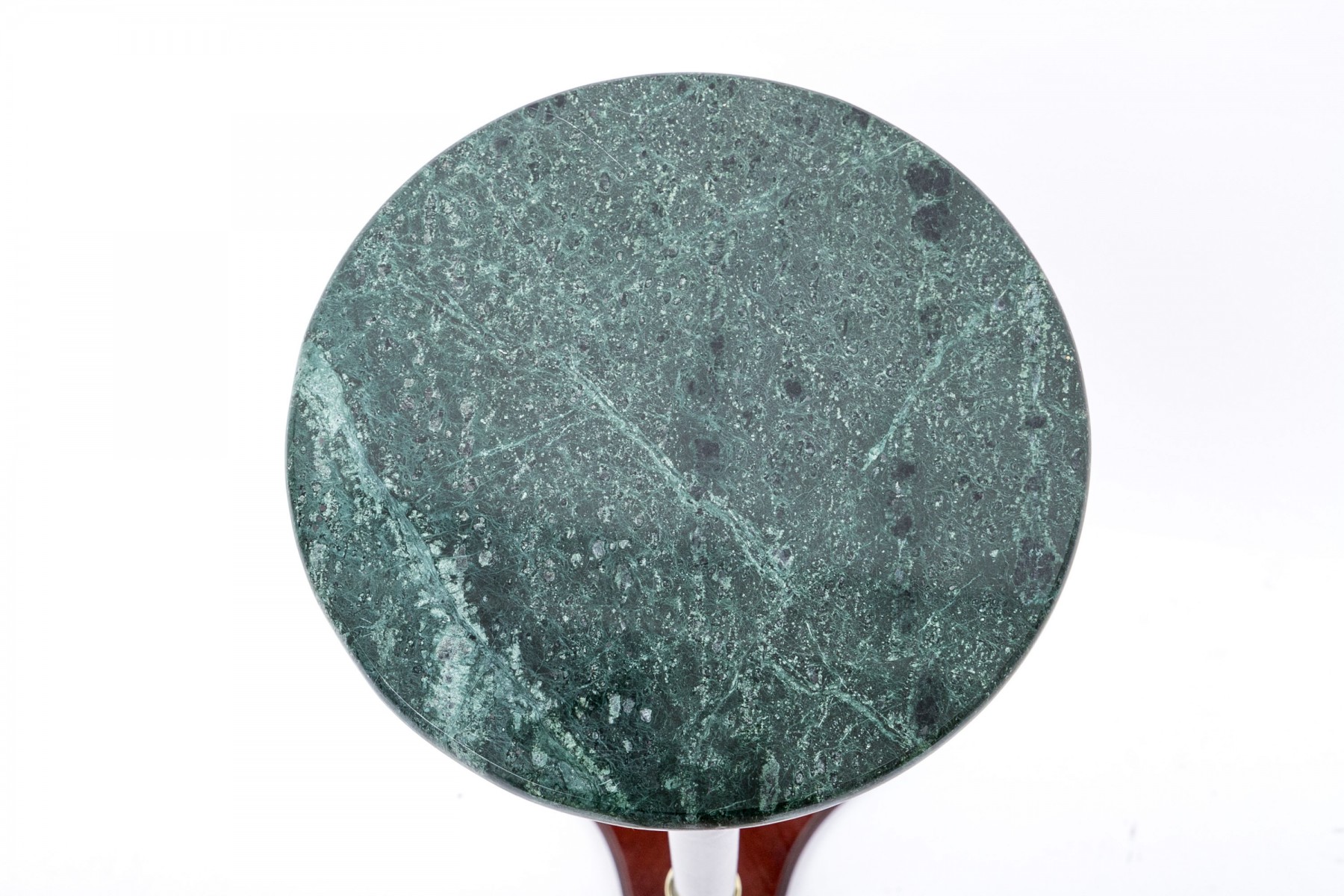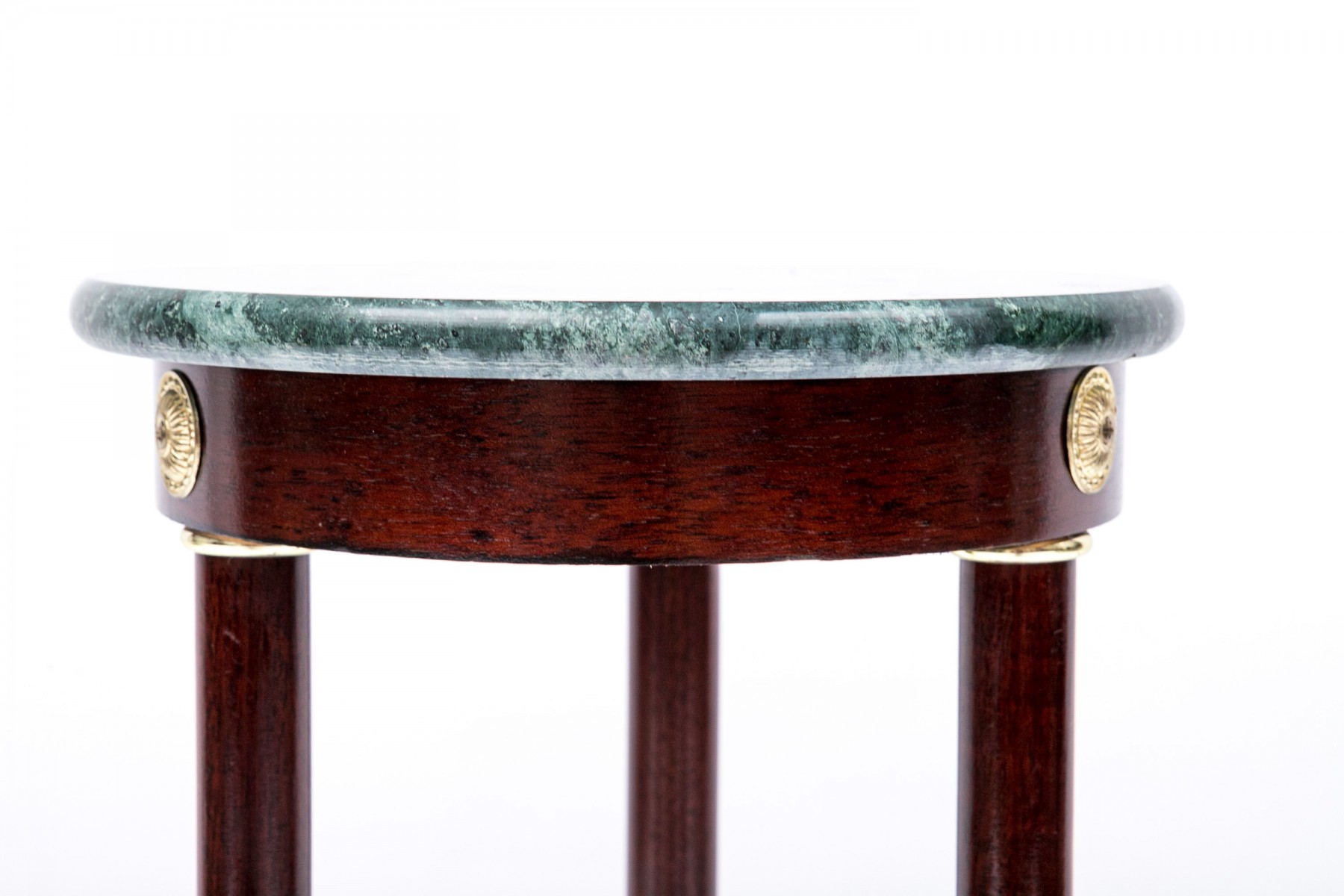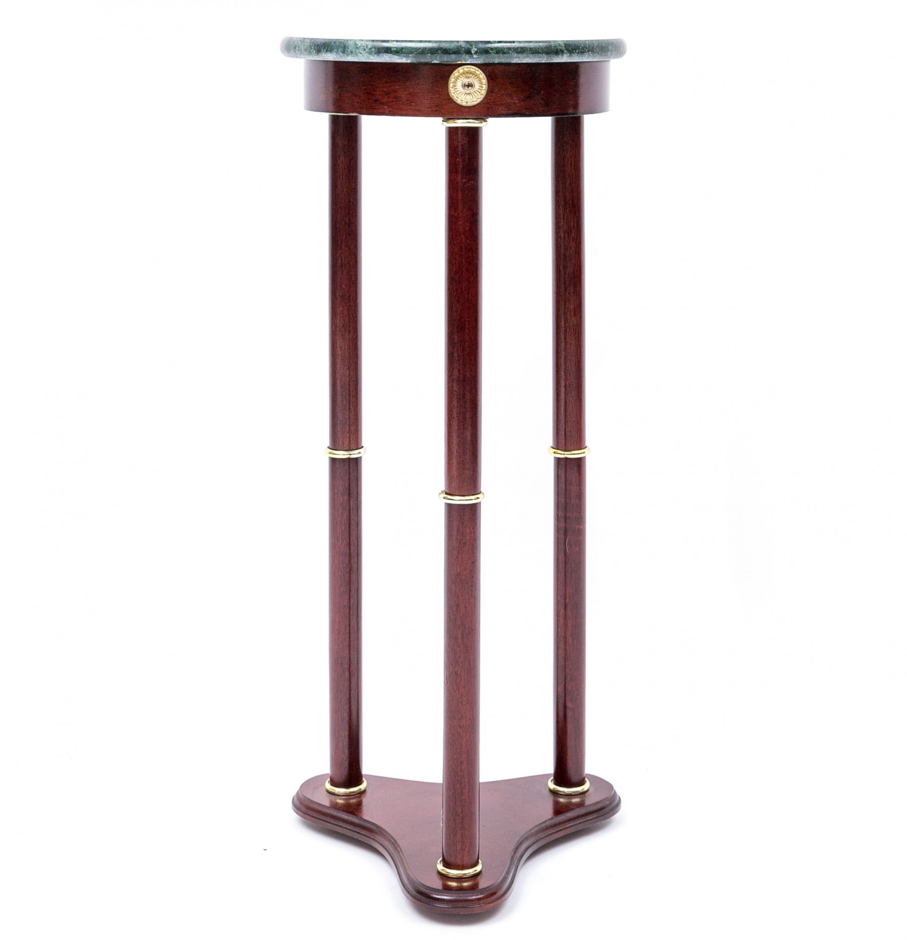 An elegant plant stand displaying a circular green marble top over a tripod of warm-toned dark brown legs with gilt banded accents, finishing with a trefoil base.