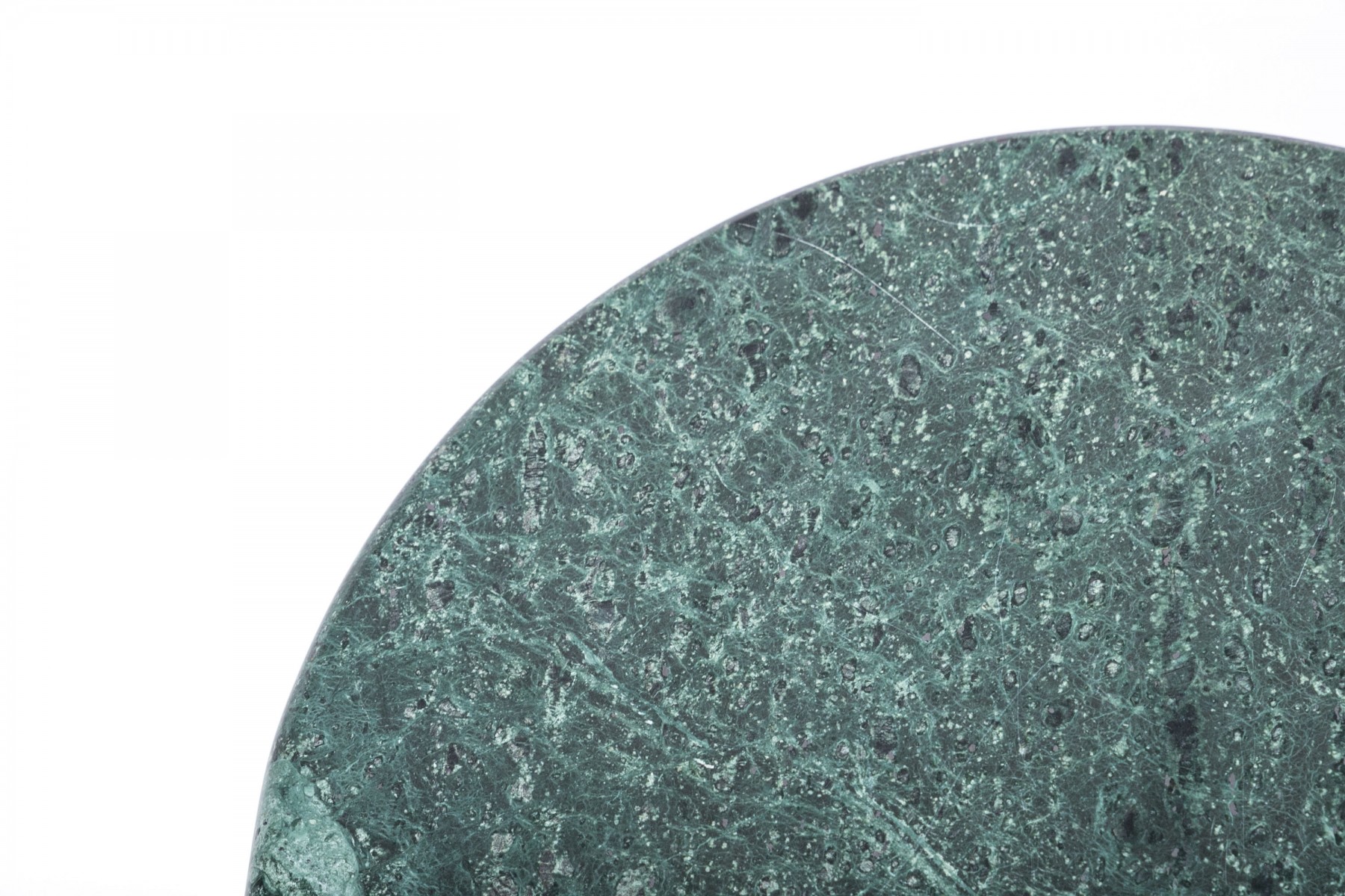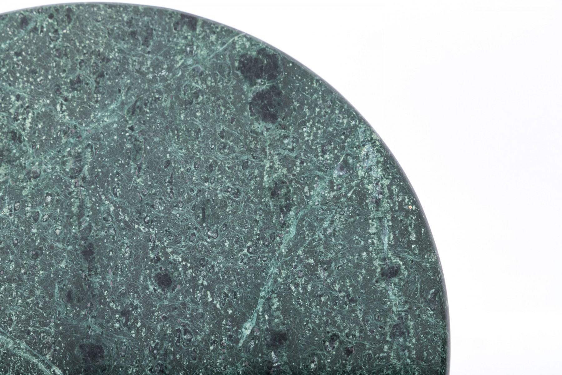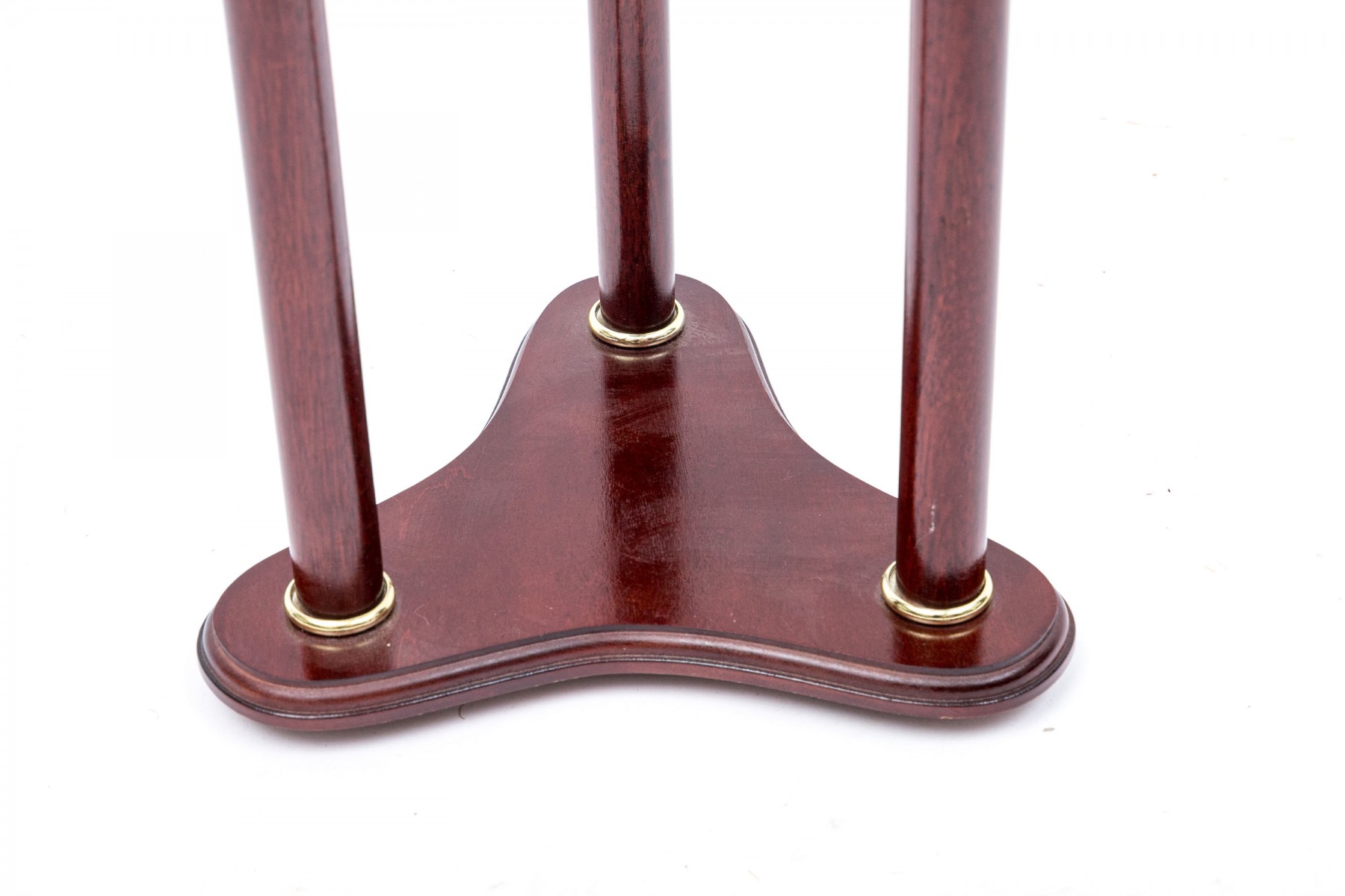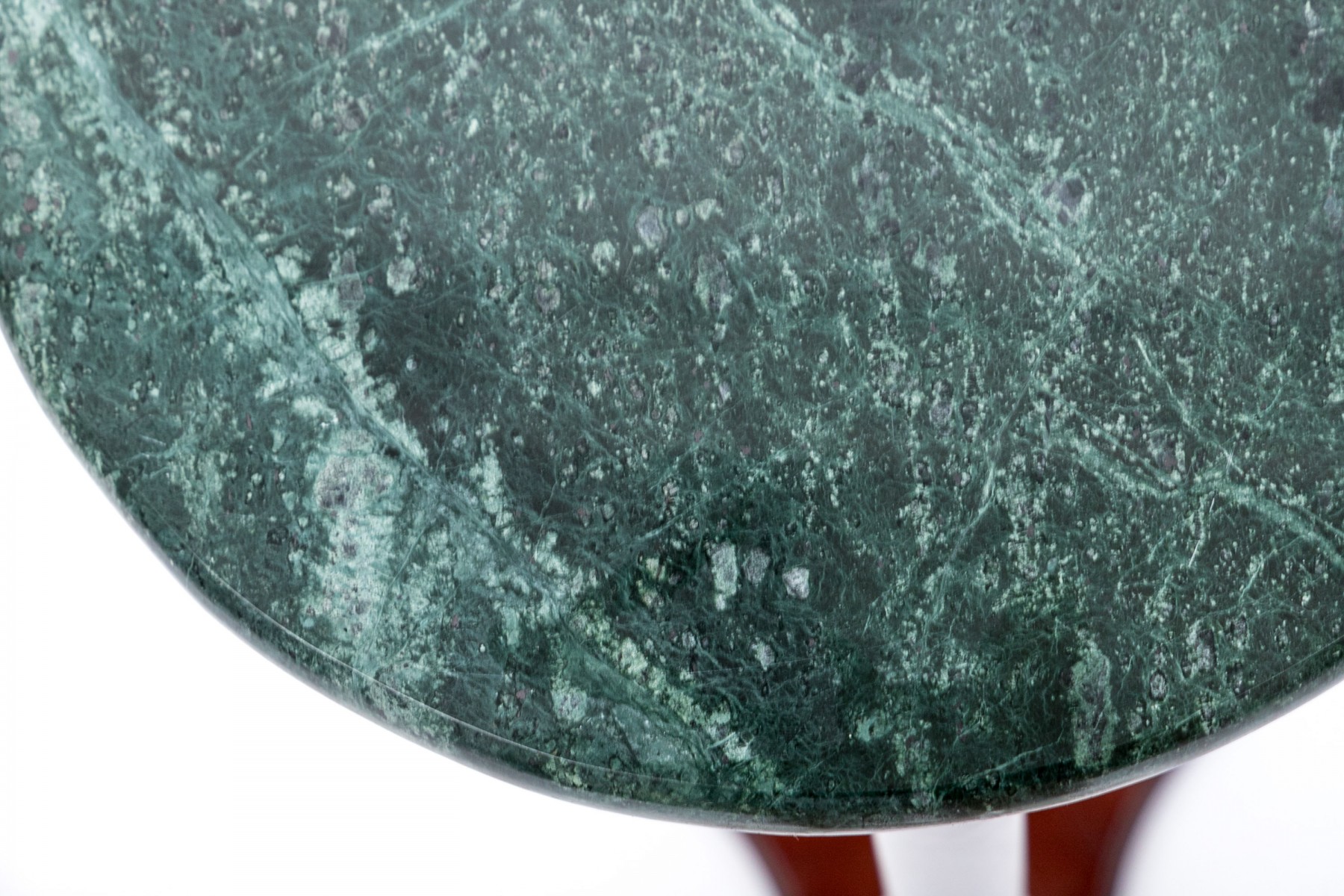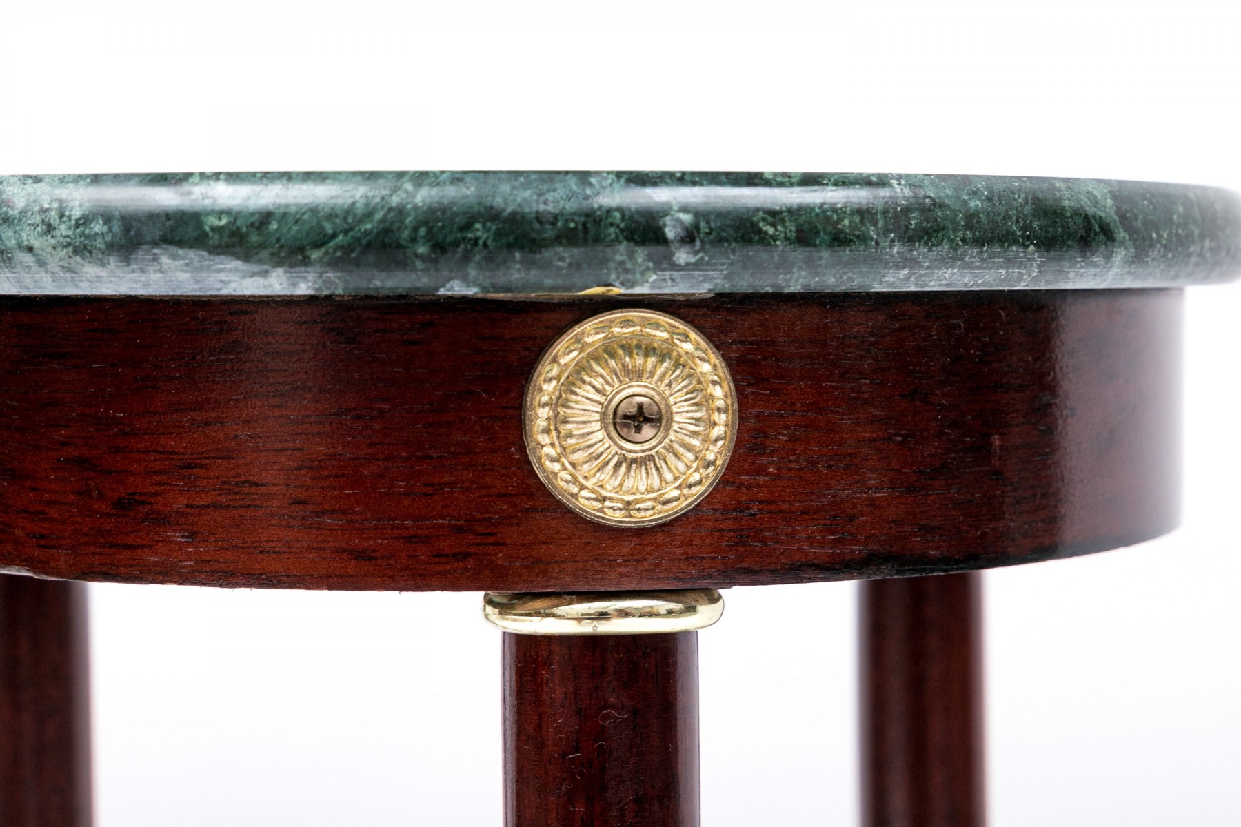 An elegant plant stand displaying a circular green marble top over a tripod of warm-toned dark brown legs with gilt banded accents, finishing with a trefoil base.