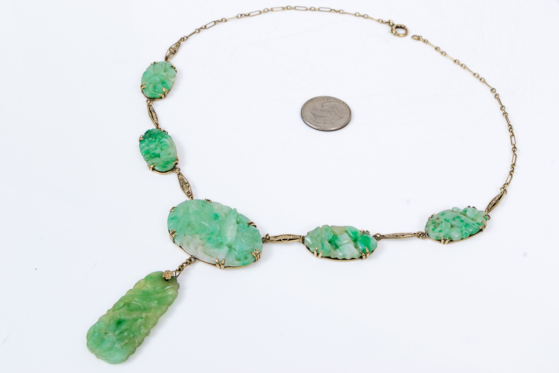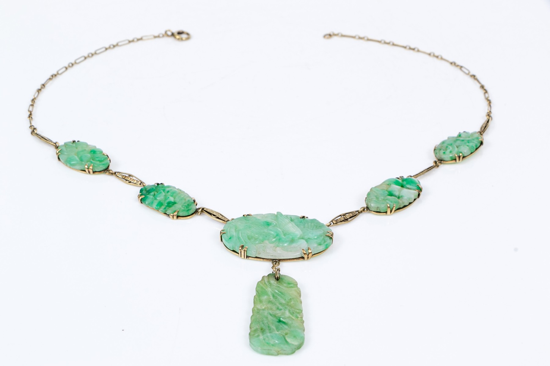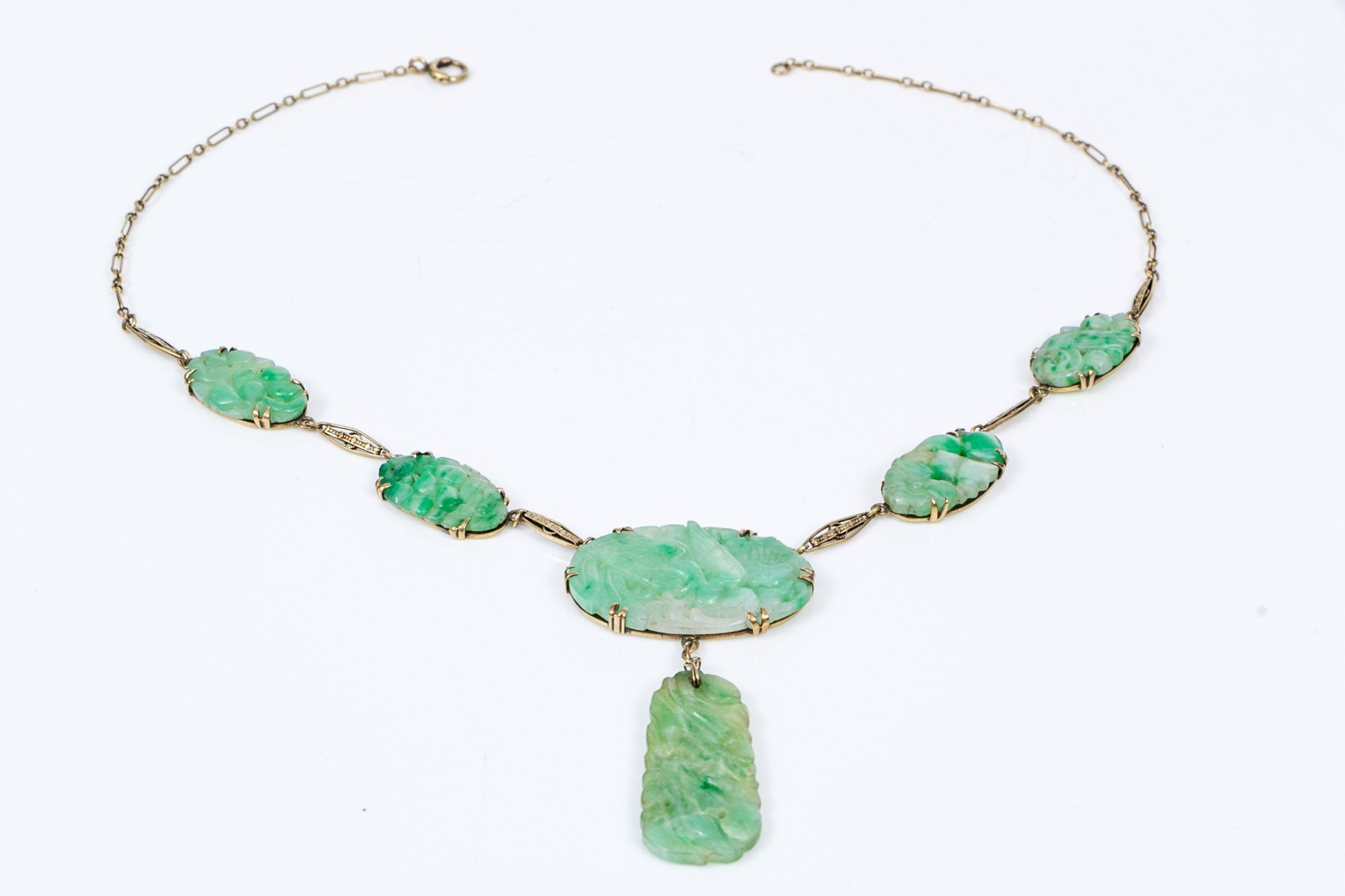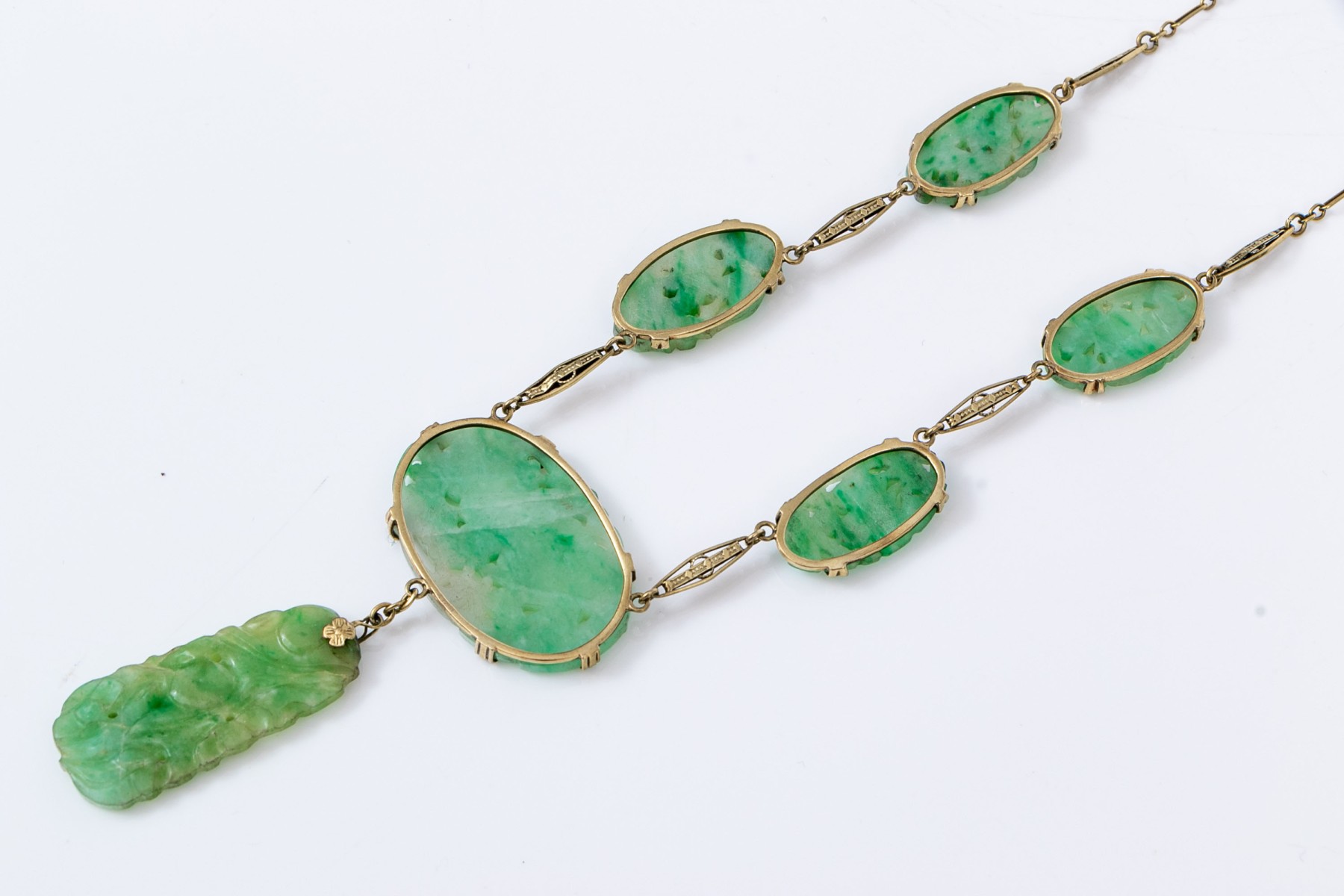 Vintage 14K yellow gold necklace. At the front of the chain are carved jade stones with the largest at the center. Suspended from the center stone is a carved drop jade stone. Spring ring clasp.