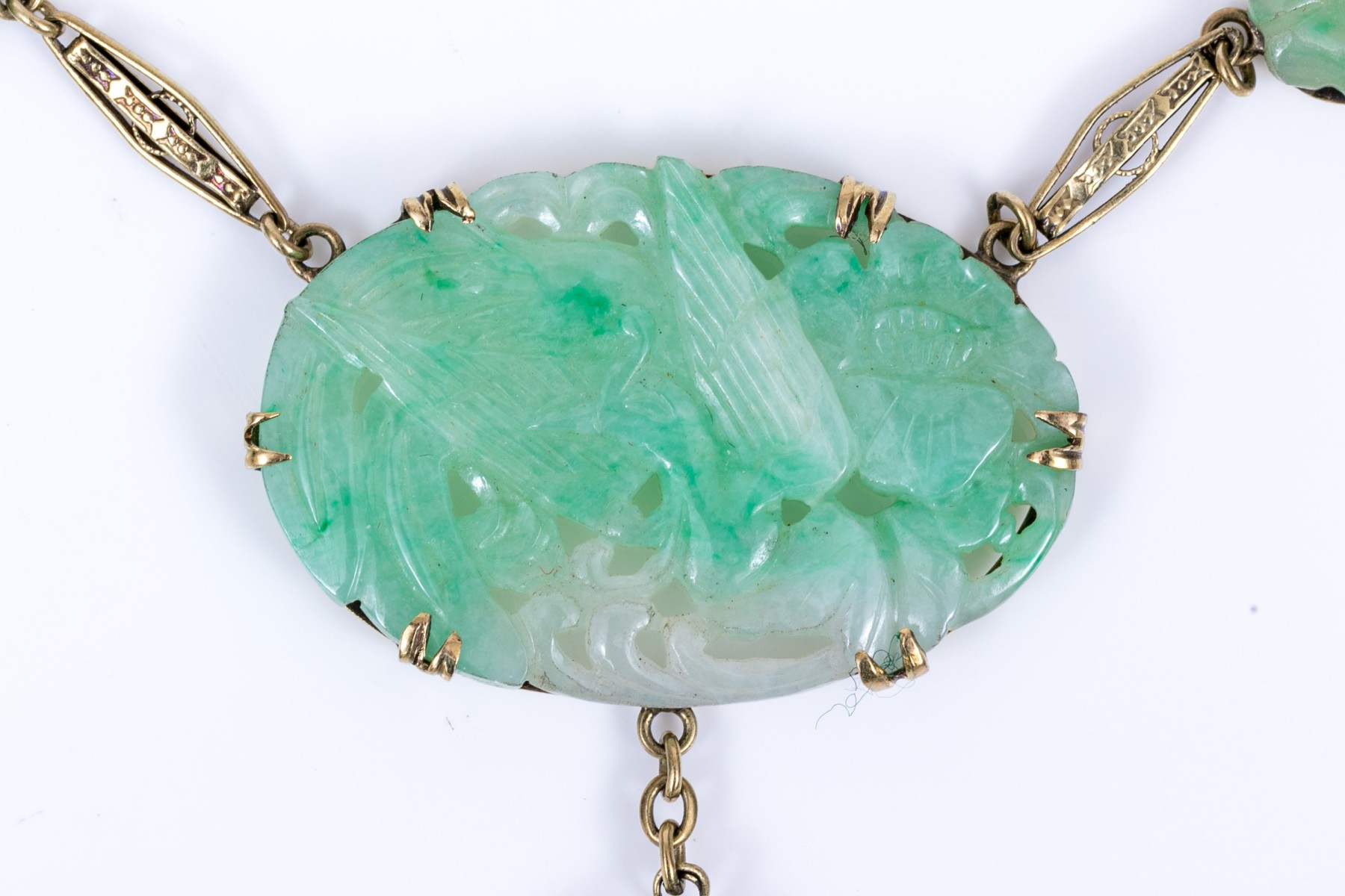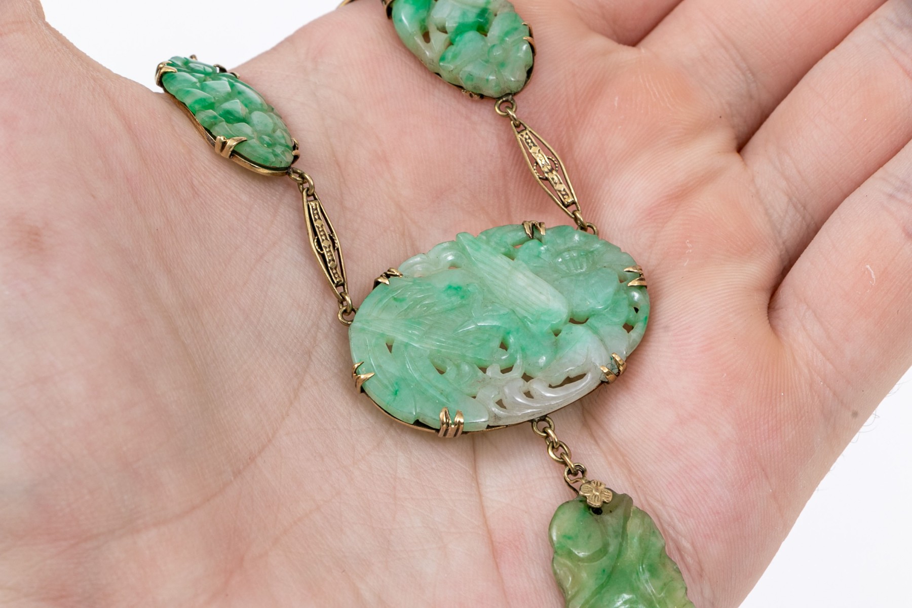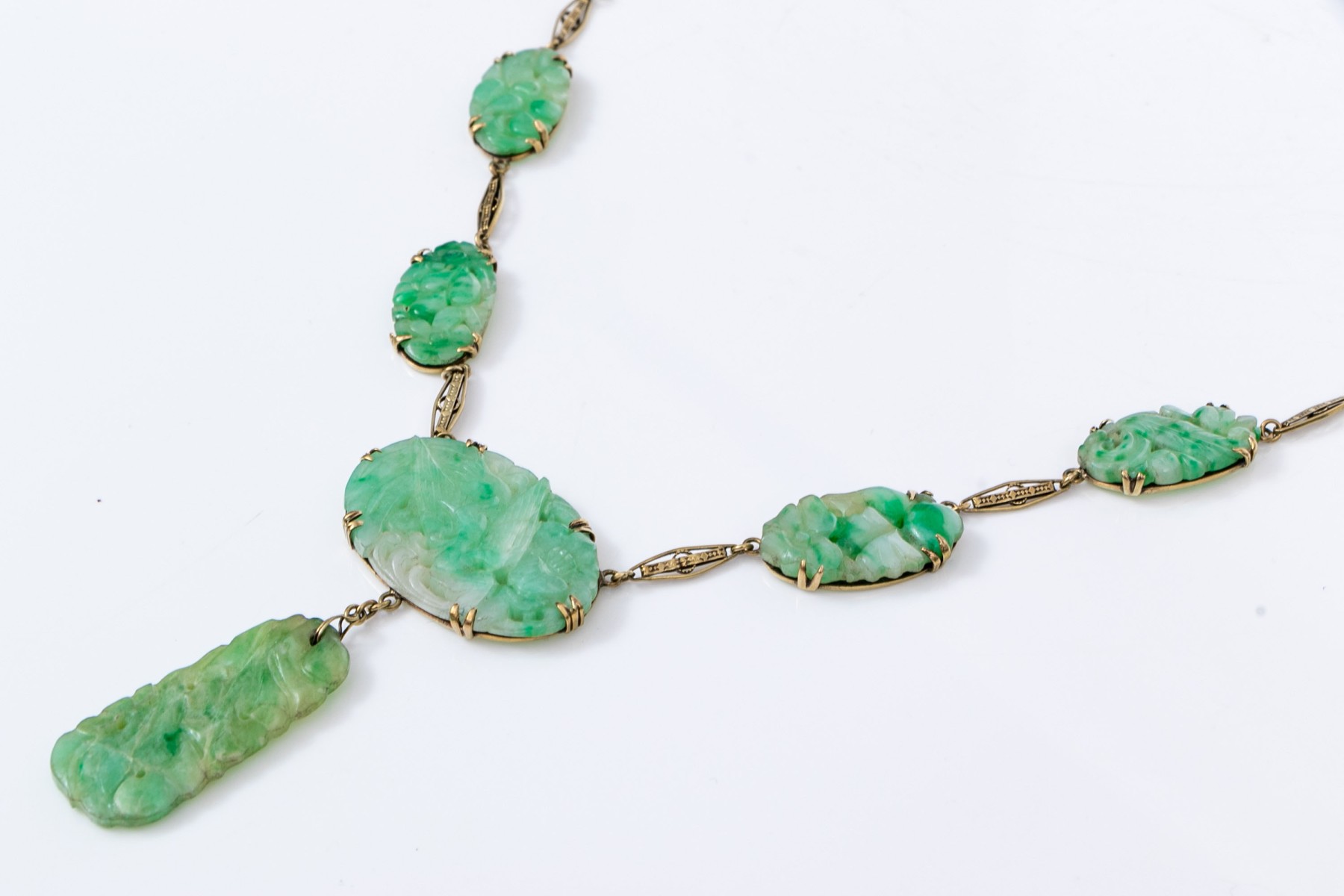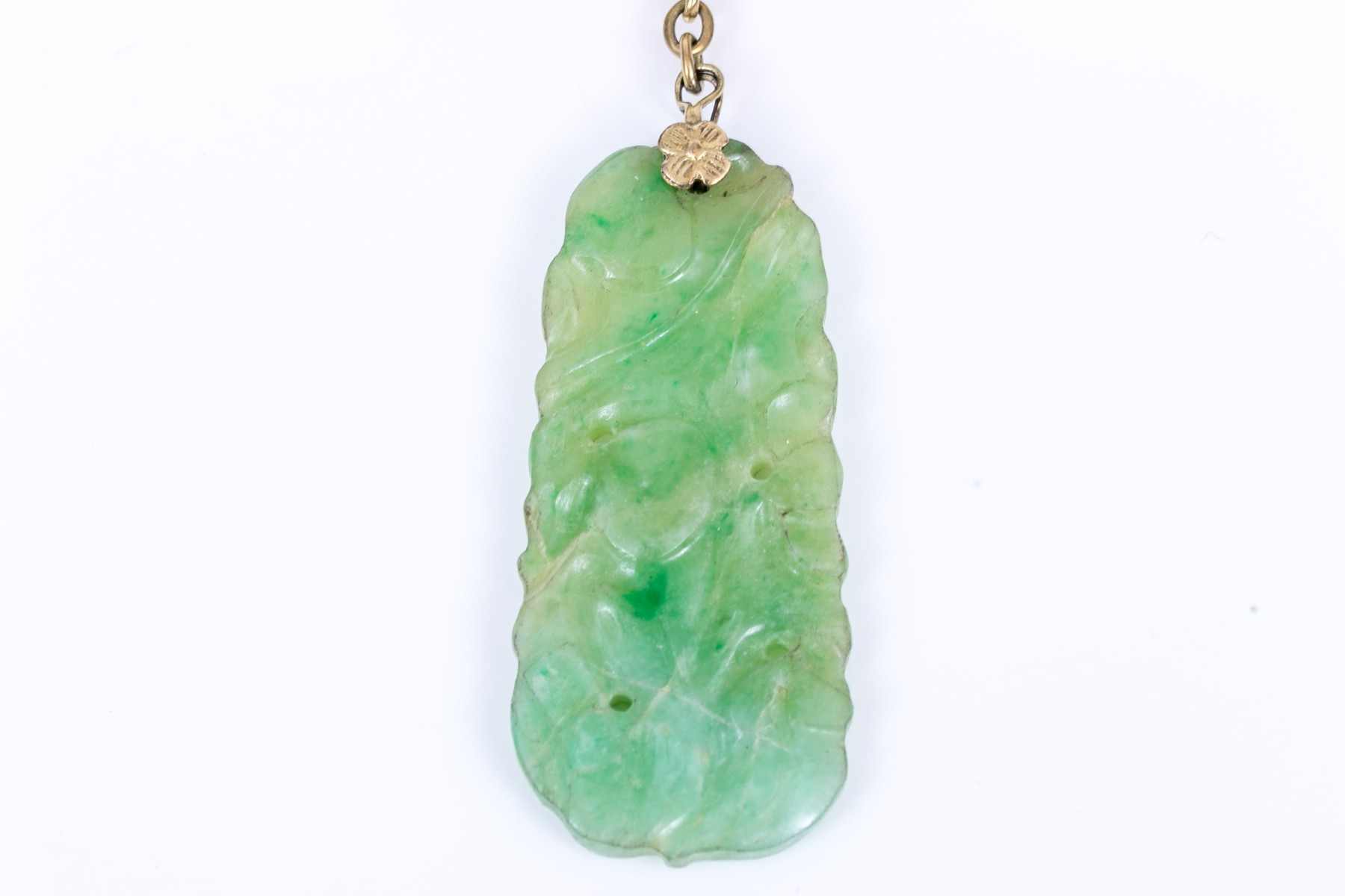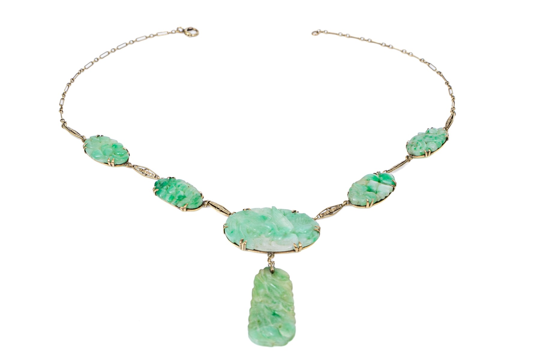 Vintage 14K yellow gold necklace. At the front of the chain are carved jade stones with the largest at the center. Suspended from the center stone is a carved drop jade stone. Spring ring clasp.