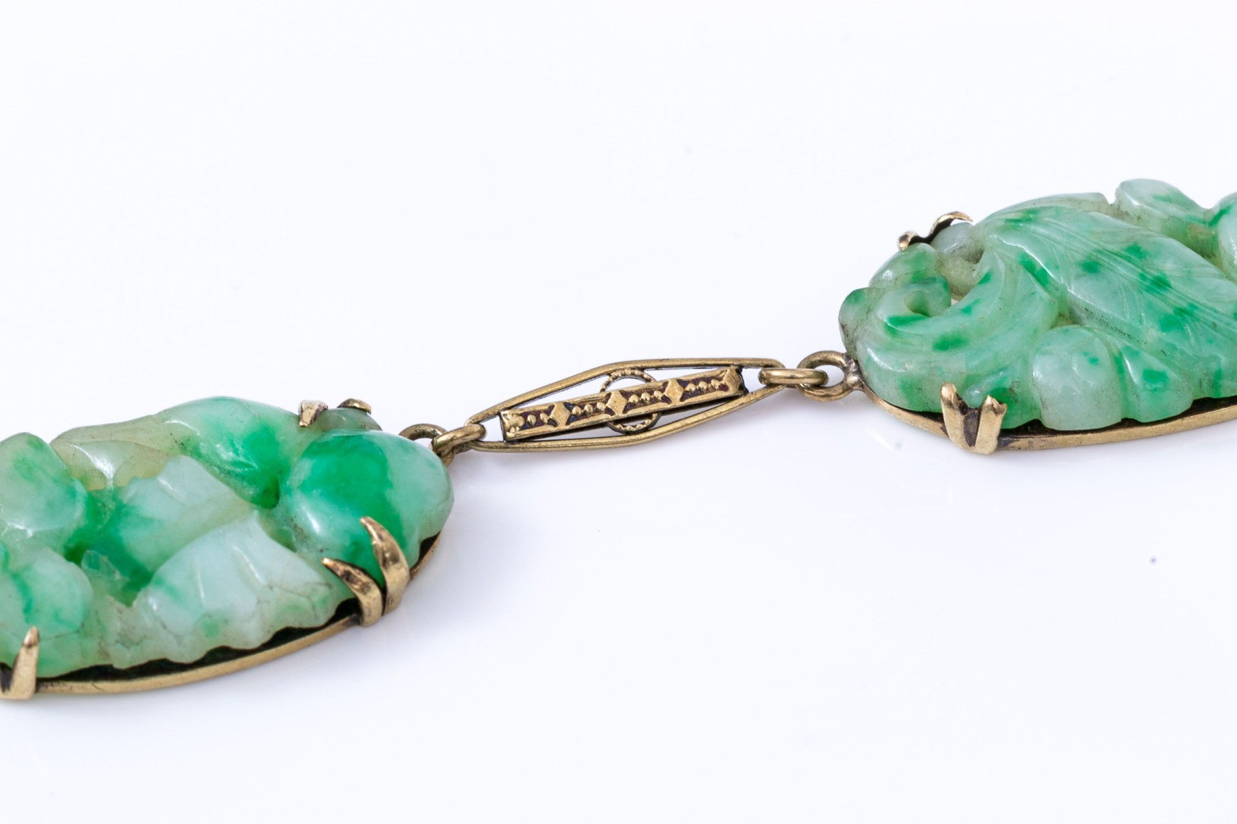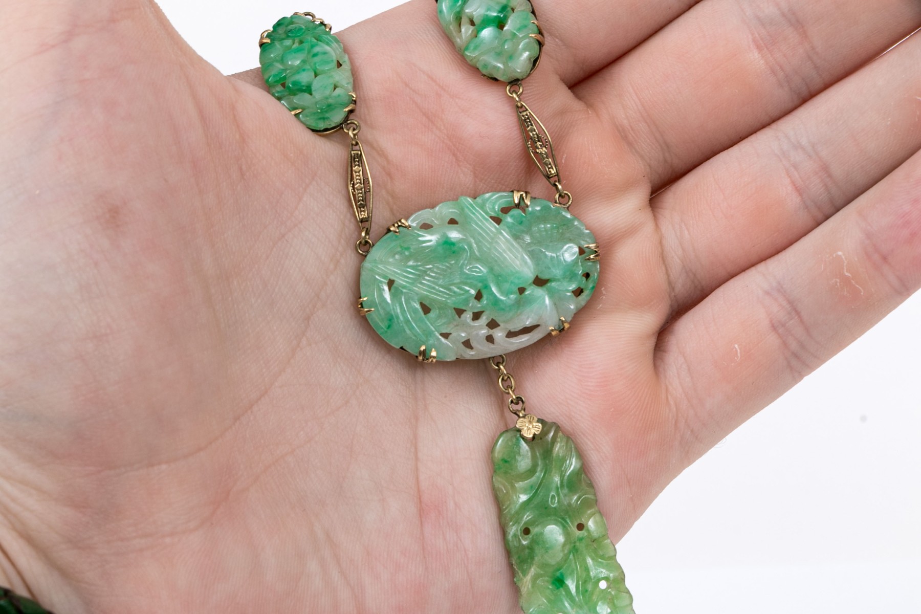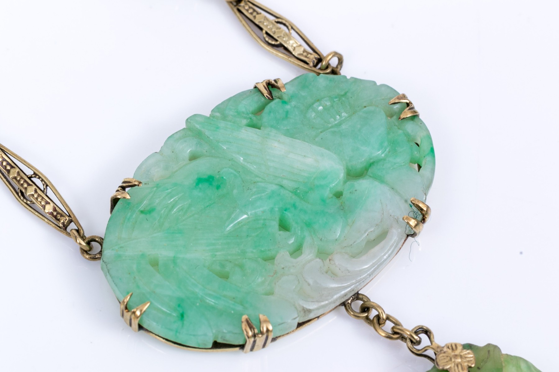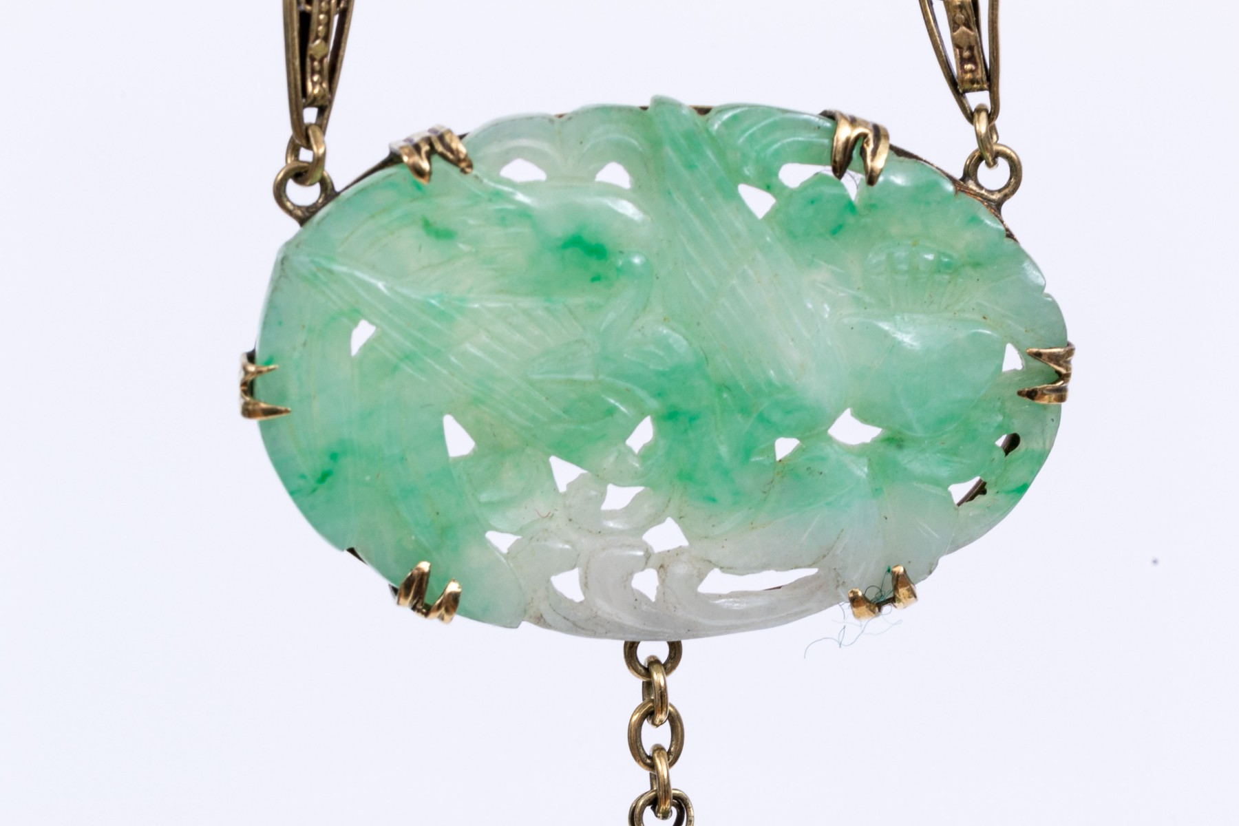 Vintage 14K yellow gold necklace. At the front of the chain are carved jade stones with the largest at the center. Suspended from the center stone is a carved drop jade stone. Spring ring clasp.