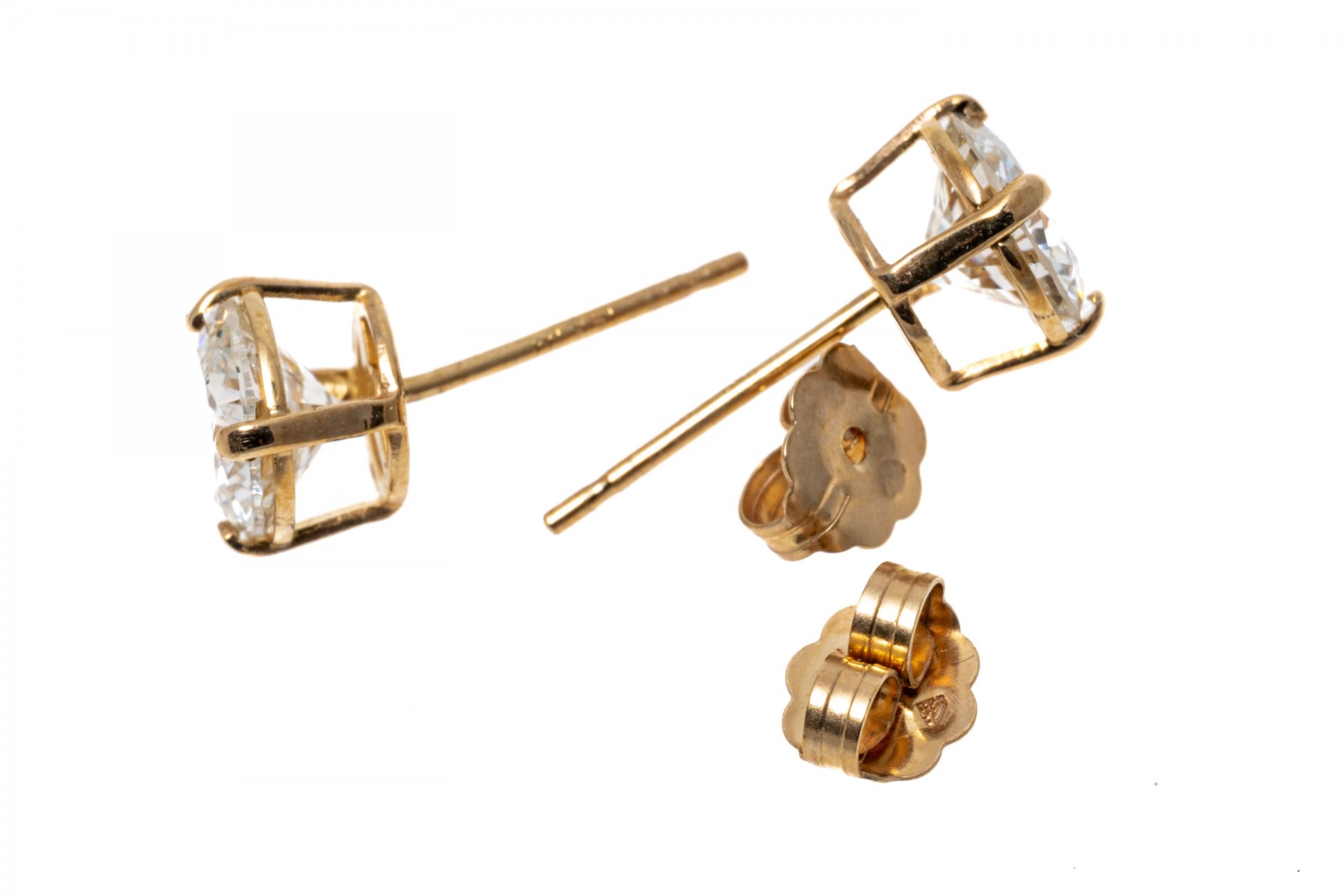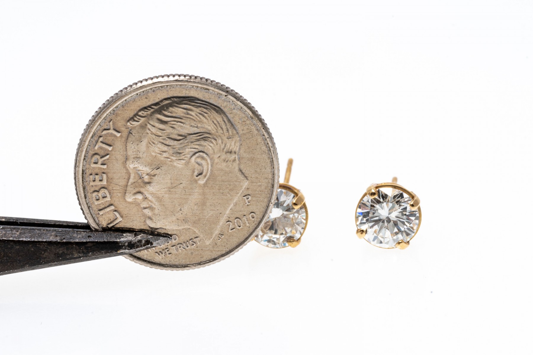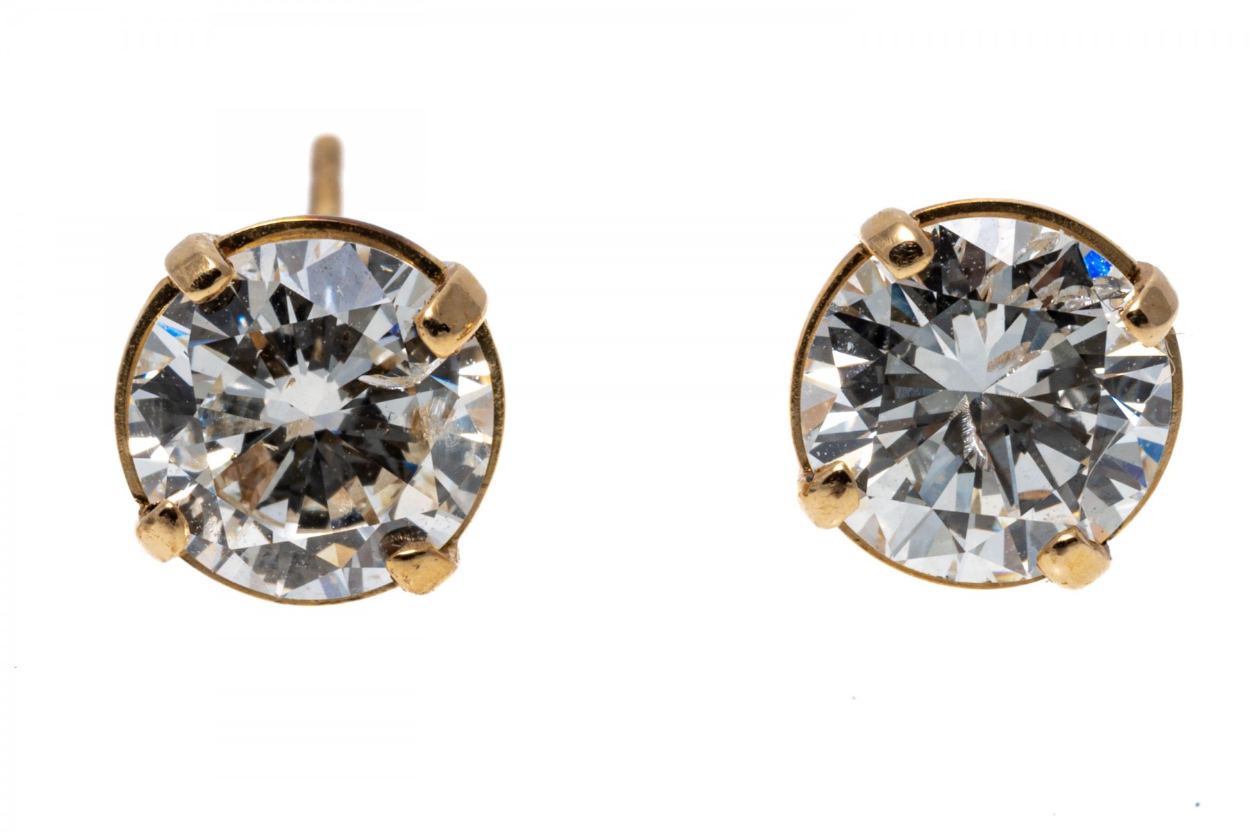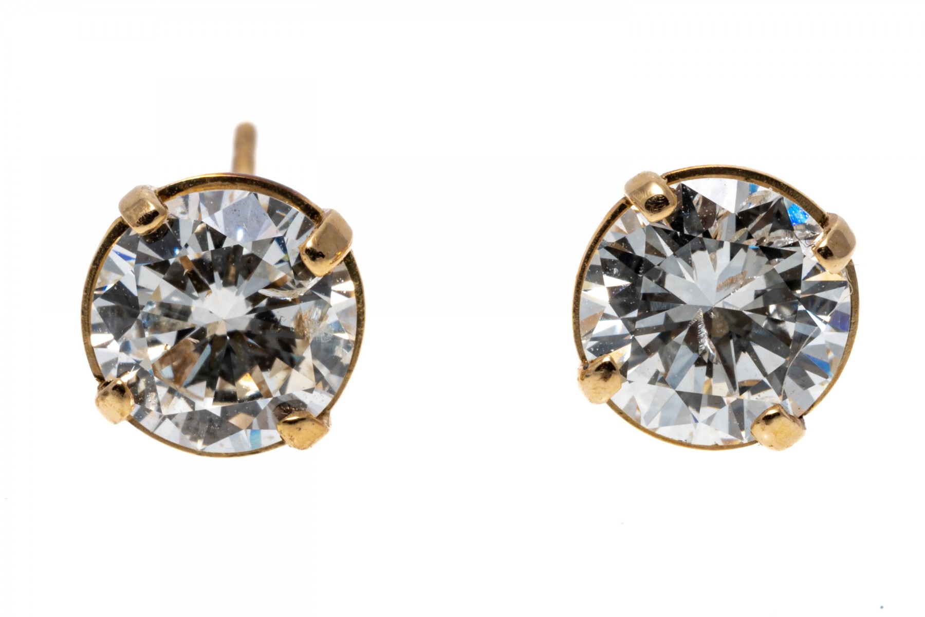 Classic pair of 14K yellow gold stud style earrings. Set into the earrings are round brilliant cut diamonds, approximately 0.9 TCW. Post and clutch backings.