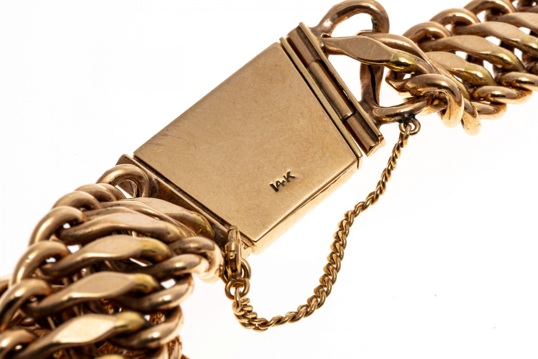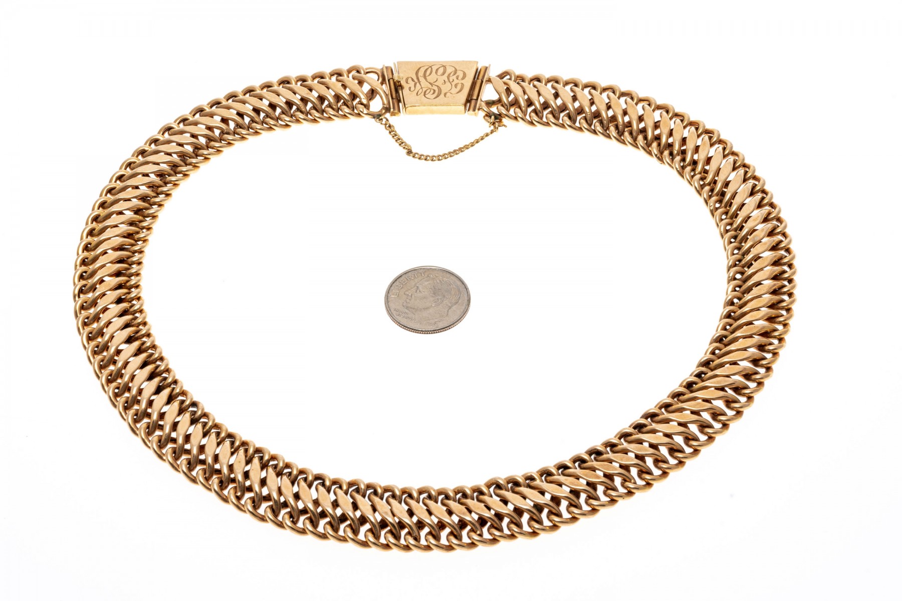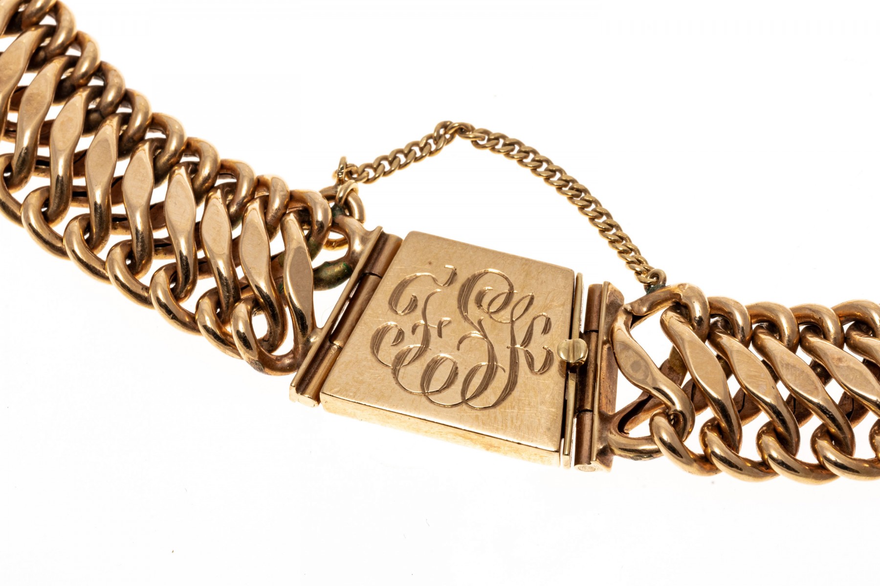 14K necklace. Crafted from 14K gold this curb chain style necklace has a classic appearance. This necklace has an engraved box style clasp with safety chain.