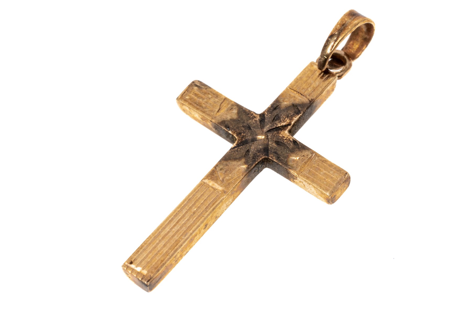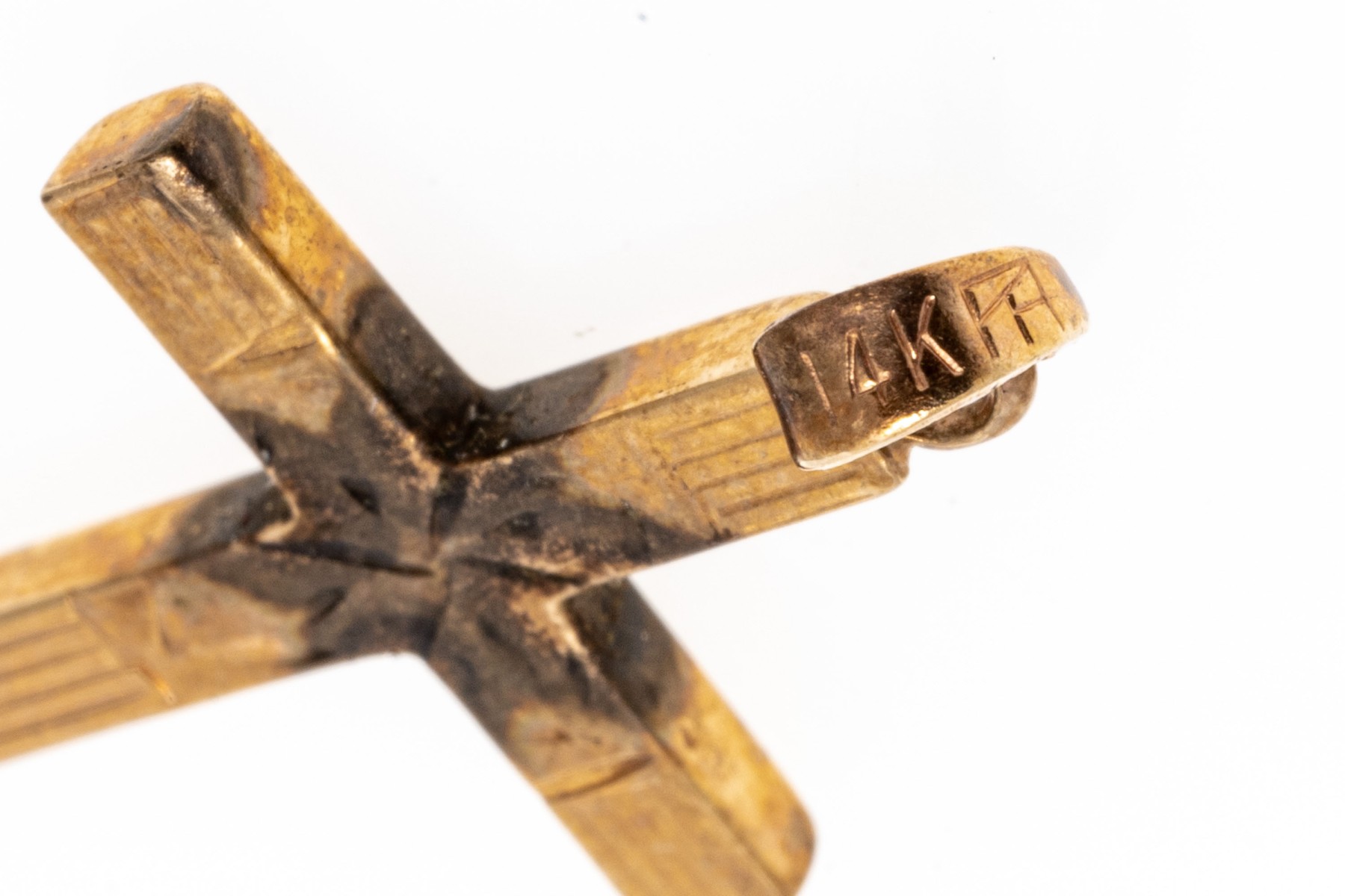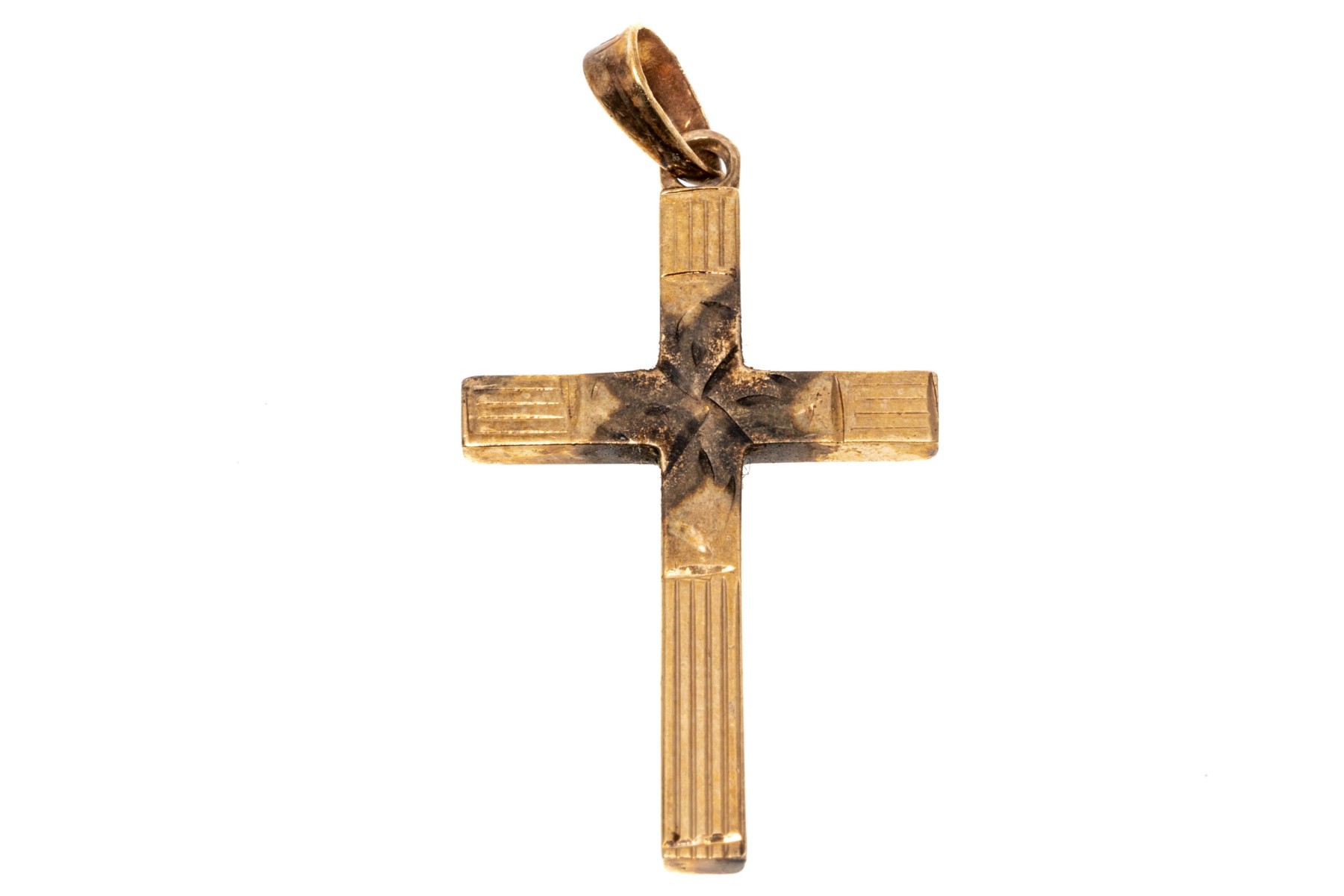 classic 14K yellow gold cross pendant. The face of the cross has been etched with a delicate engraving.