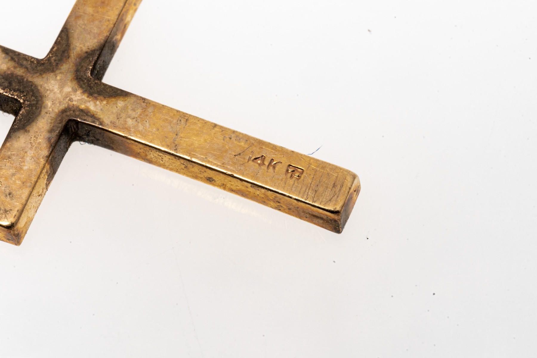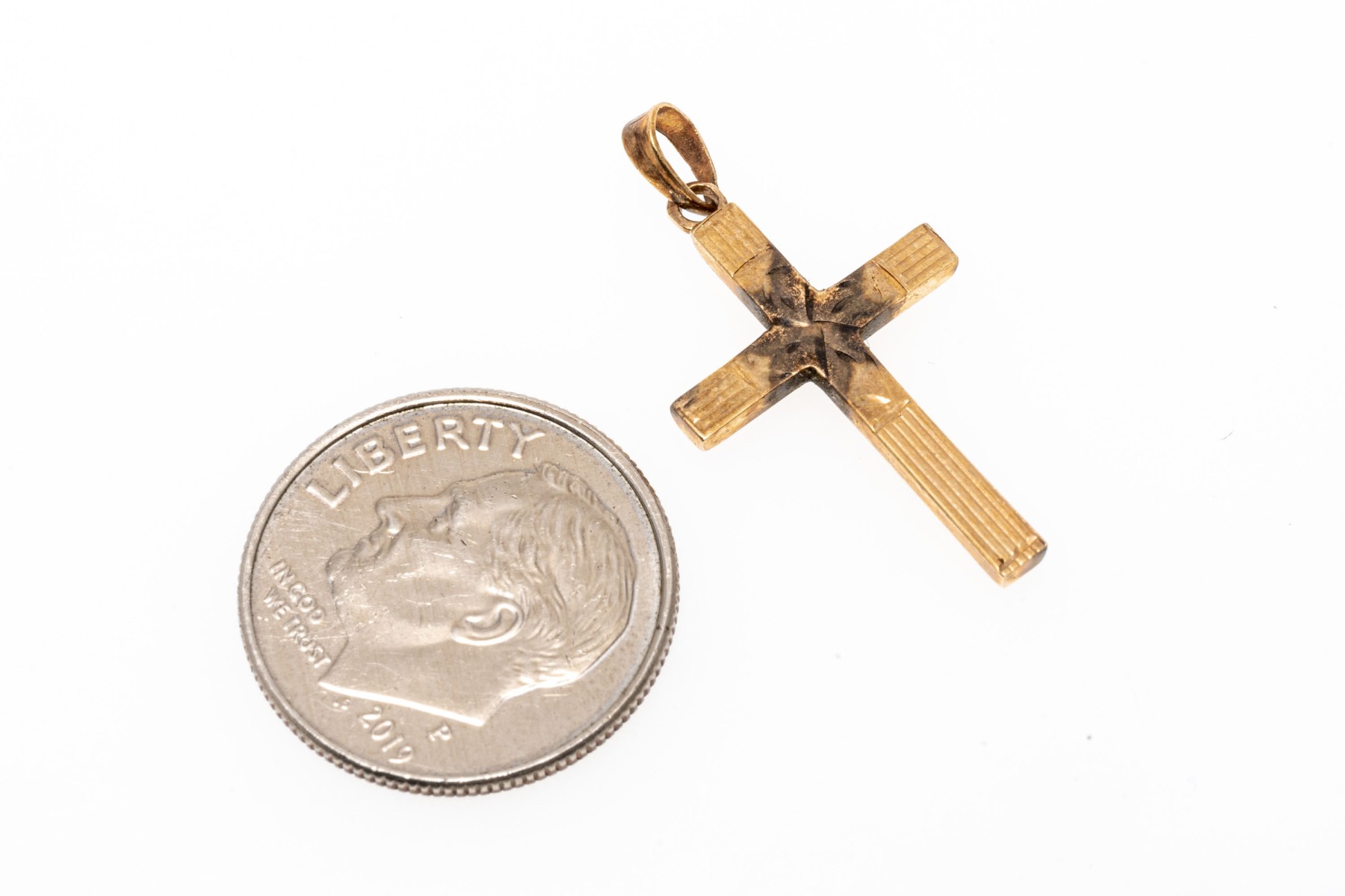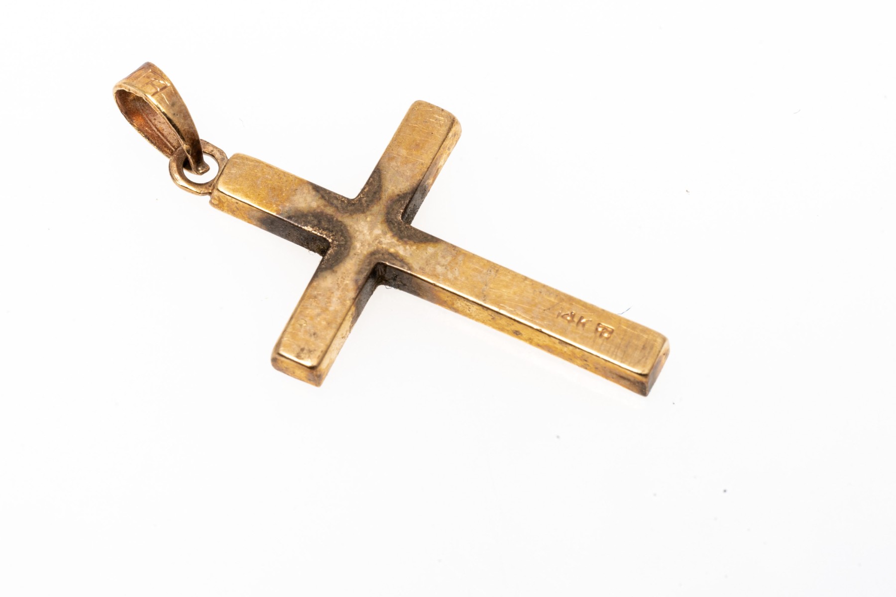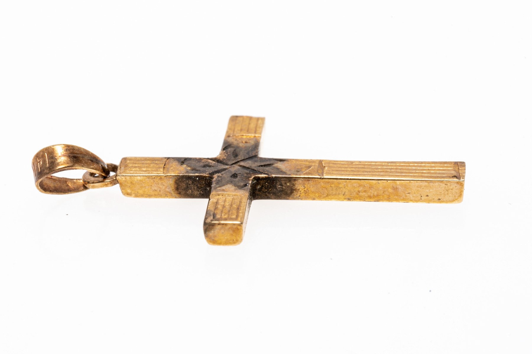 classic 14K yellow gold cross pendant. The face of the cross has been etched with a delicate engraving.