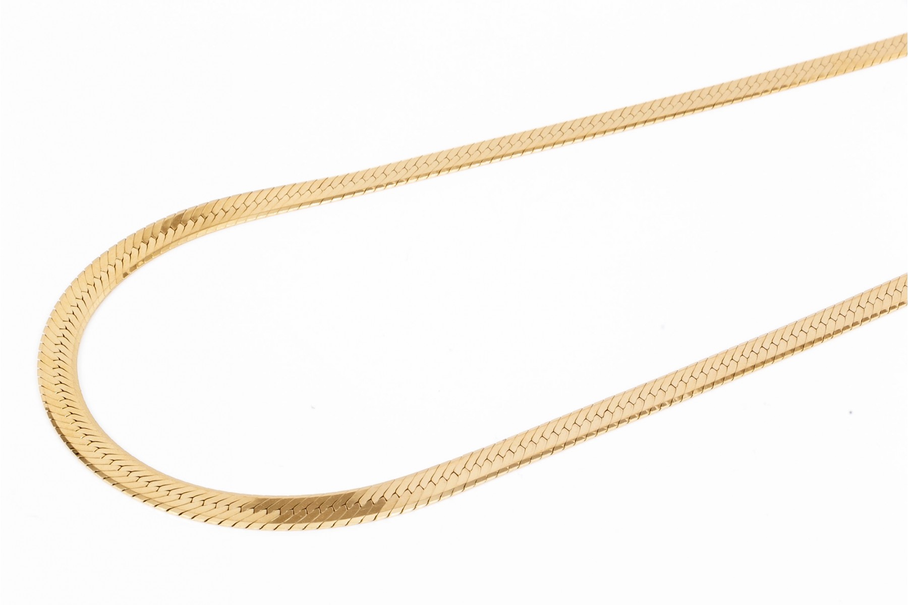 Herringbone chain necklace created in 14K yellow gold. This bright polished necklace has a simple classic appearance and secures with a lobster claw clasp.