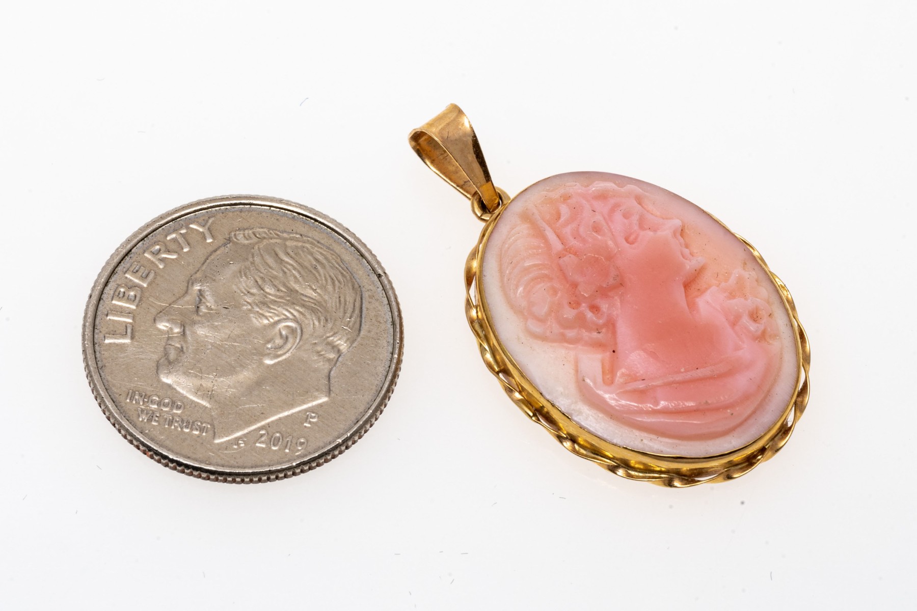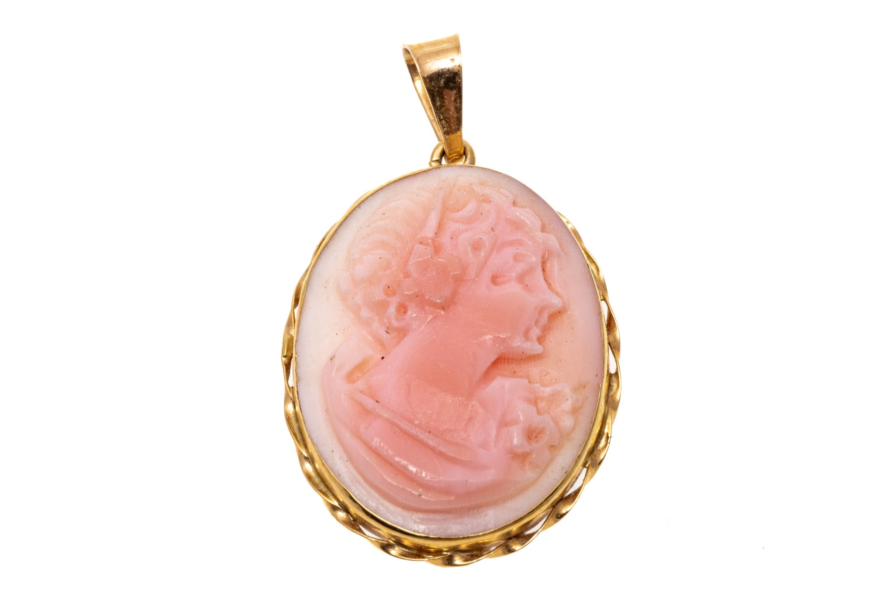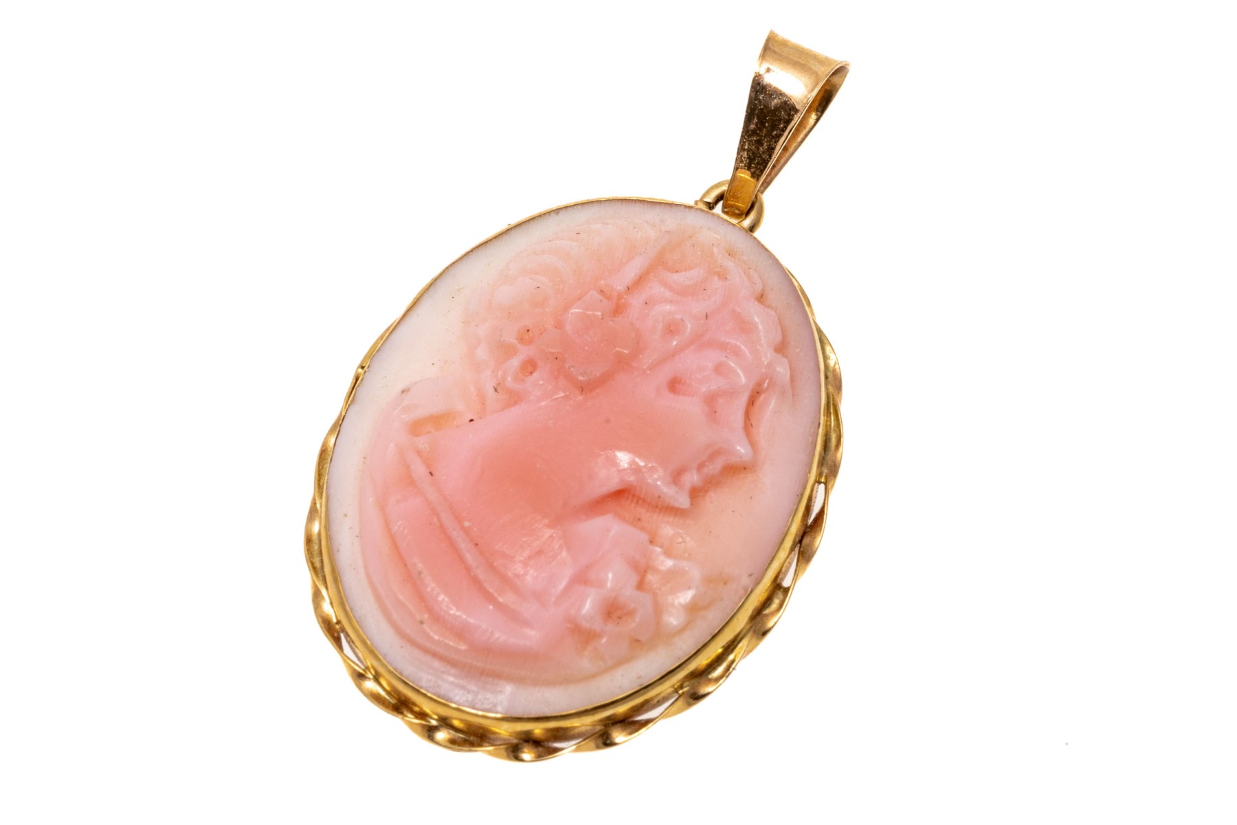14K yellow gold pendant. Set into the pendant is a pale pink toned cameo displaying a female profile.