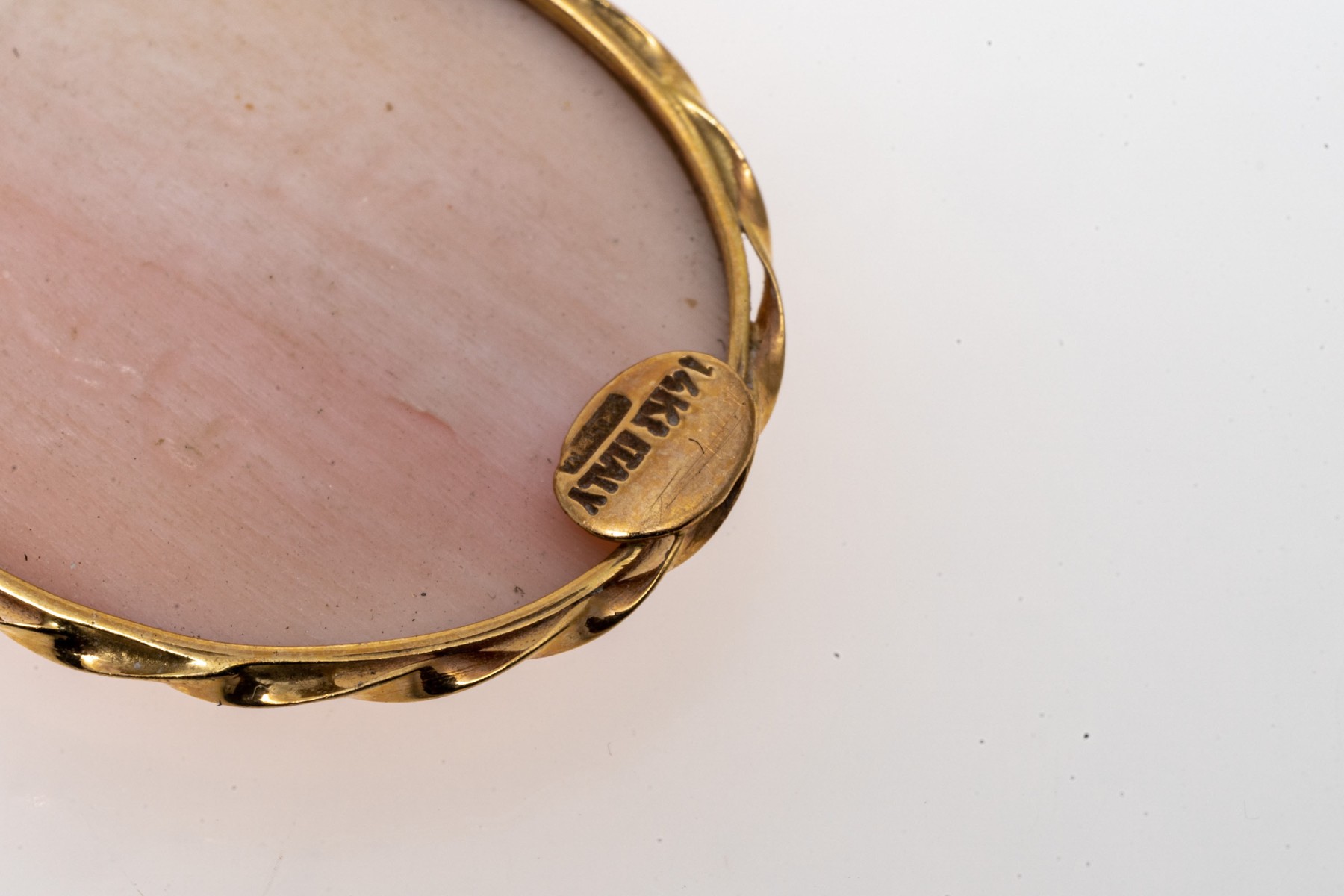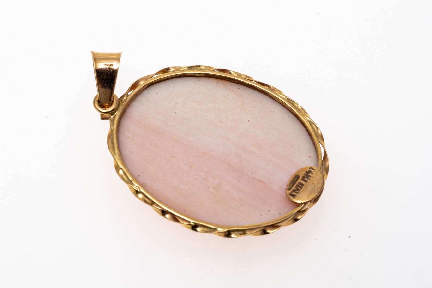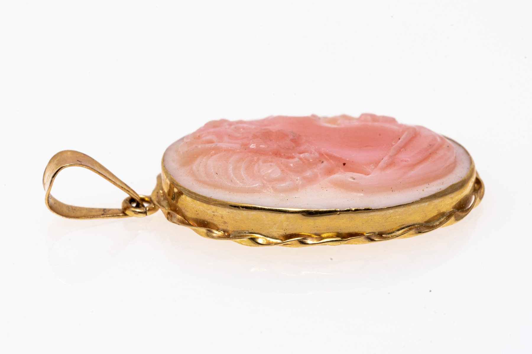 14K yellow gold pendant. Set into the pendant is a pale pink toned cameo displaying a female profile.
