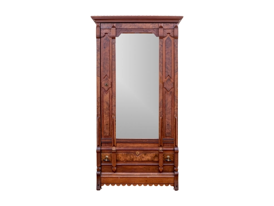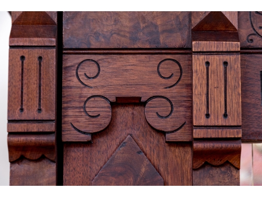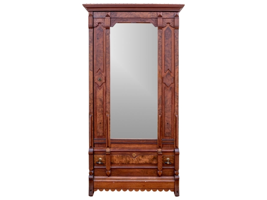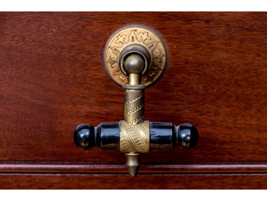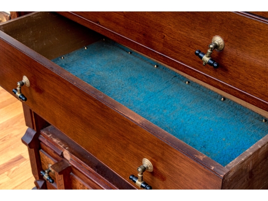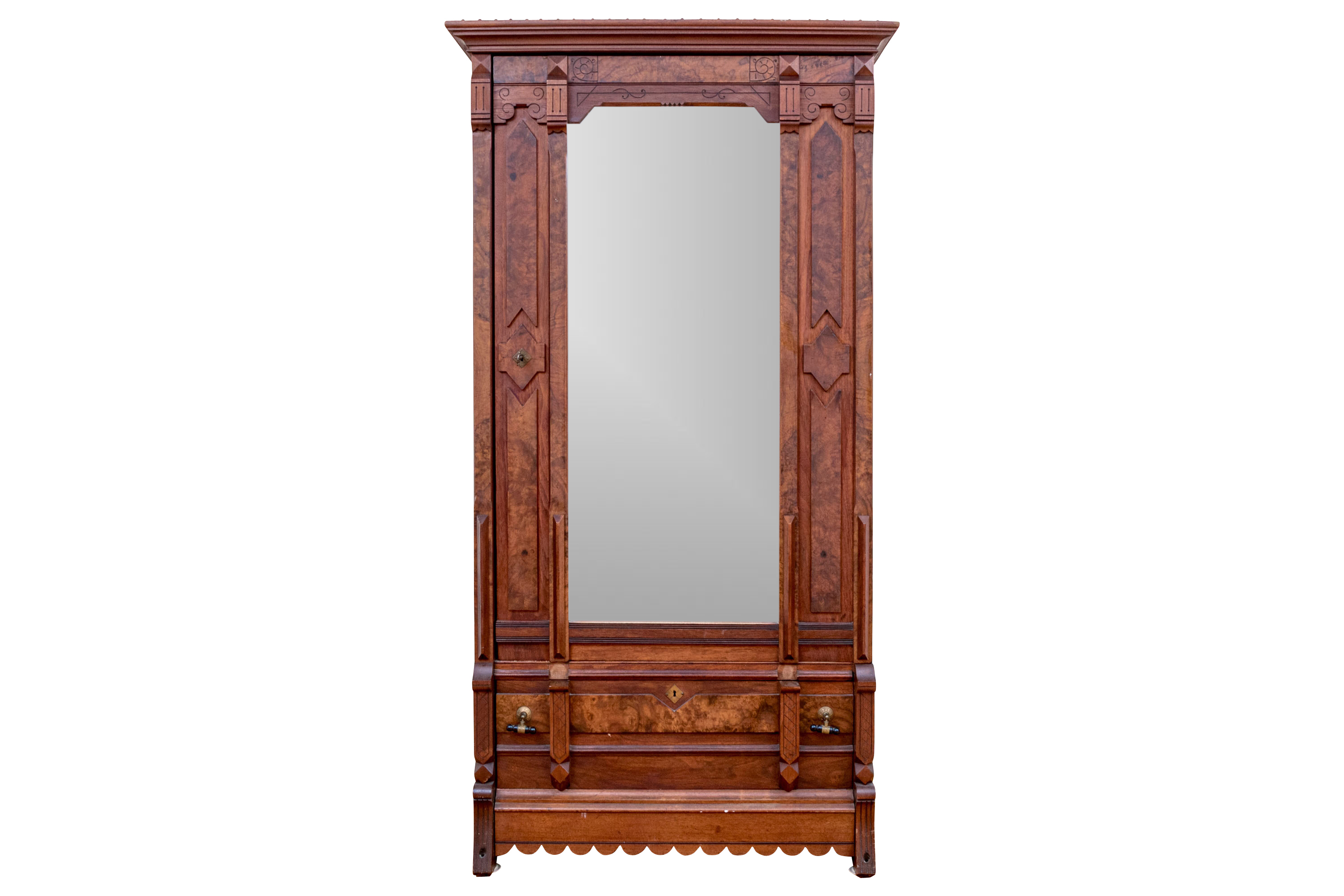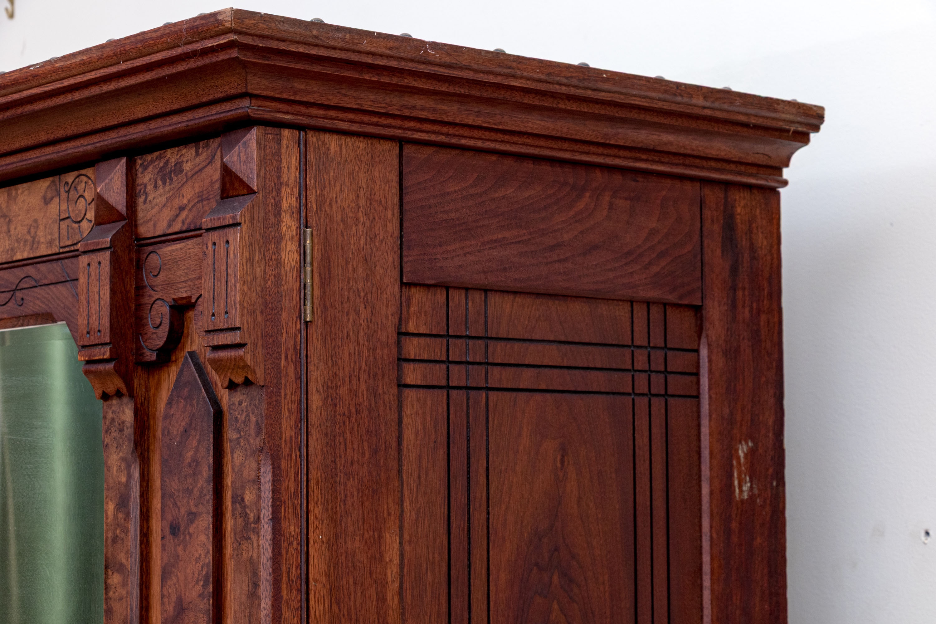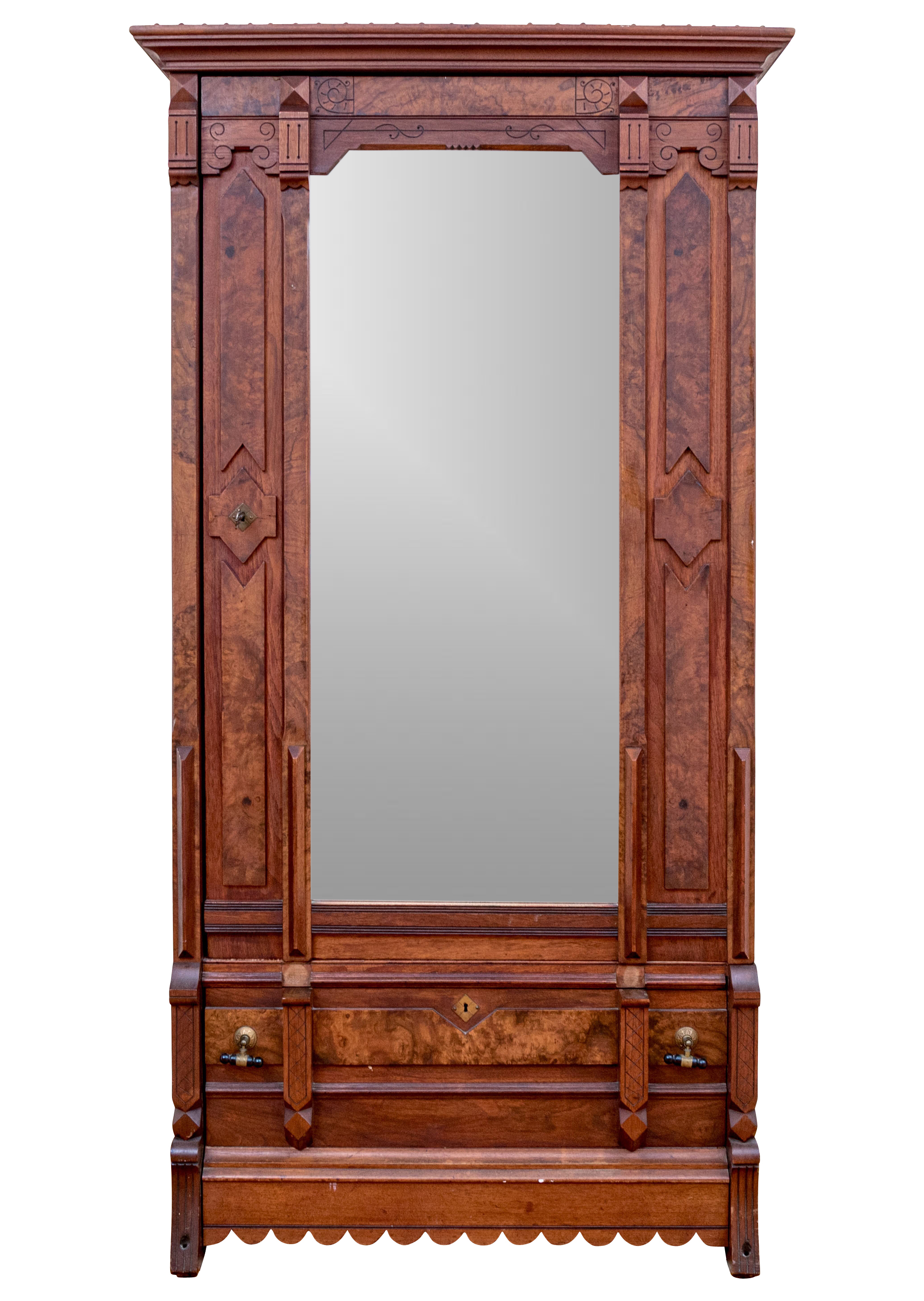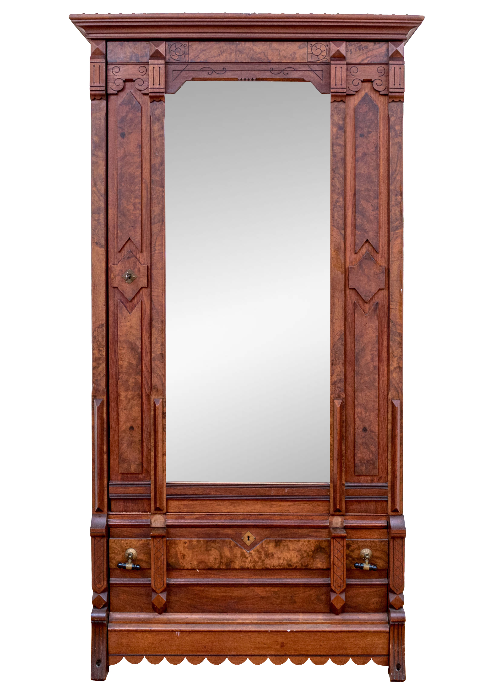 An Antique mixed wood and deep stained Period Eastlake Armoire with mirror panel front. The door opens to reveal graduated drawers having incredible and beautifully made pulls in Cross form made by Russell & Erwin and shown in their 1897 catalog. The pulls are fashioned from elaborately decorated bronze and shaped wood handles in an Ebonized finish. The hardware is repeated on the bottom exterior drawer and the whole piece has carvings, incised designs and panels. Includes a key.