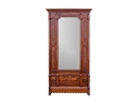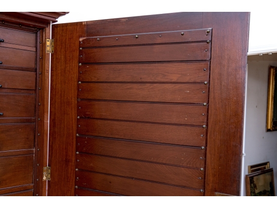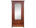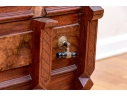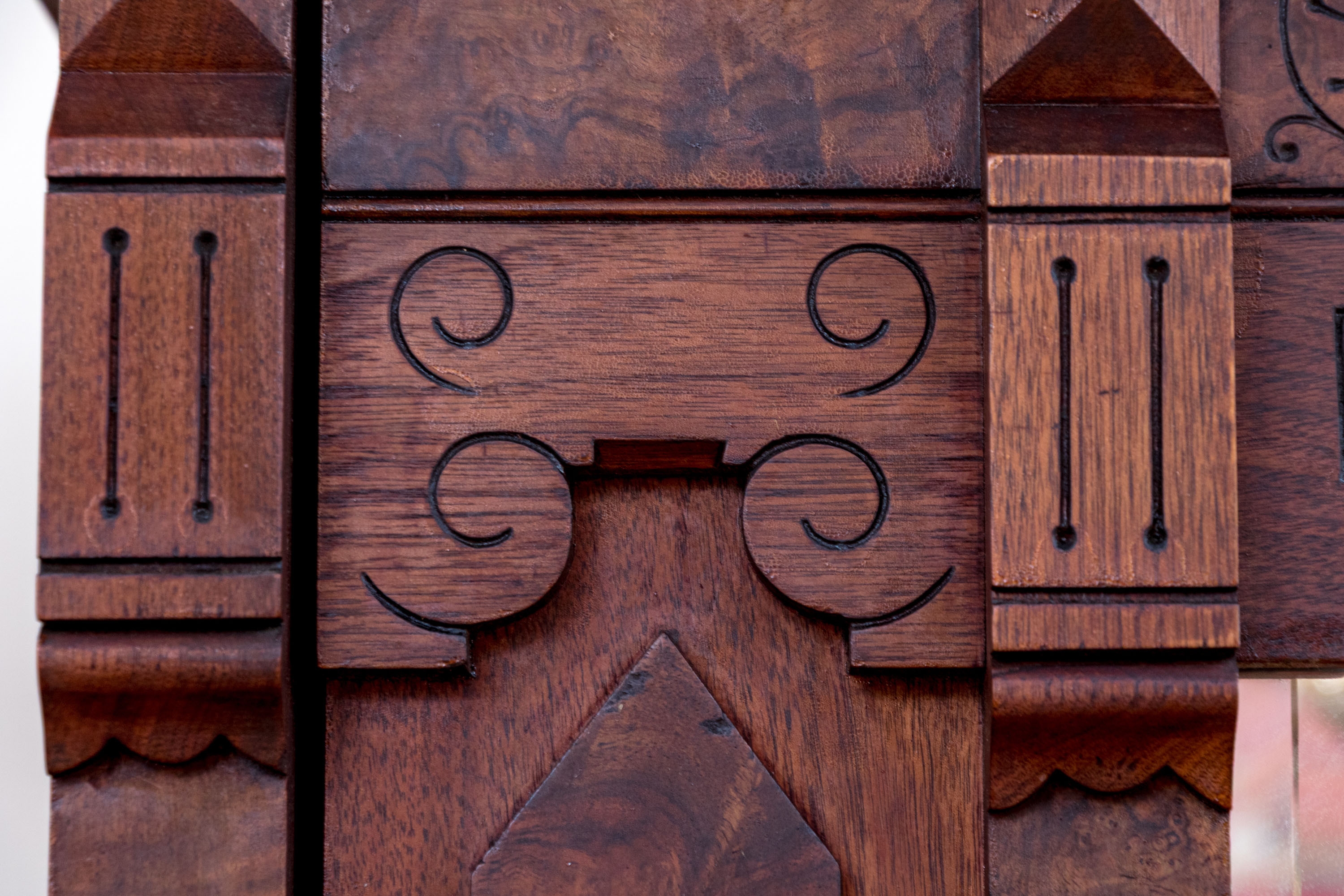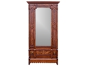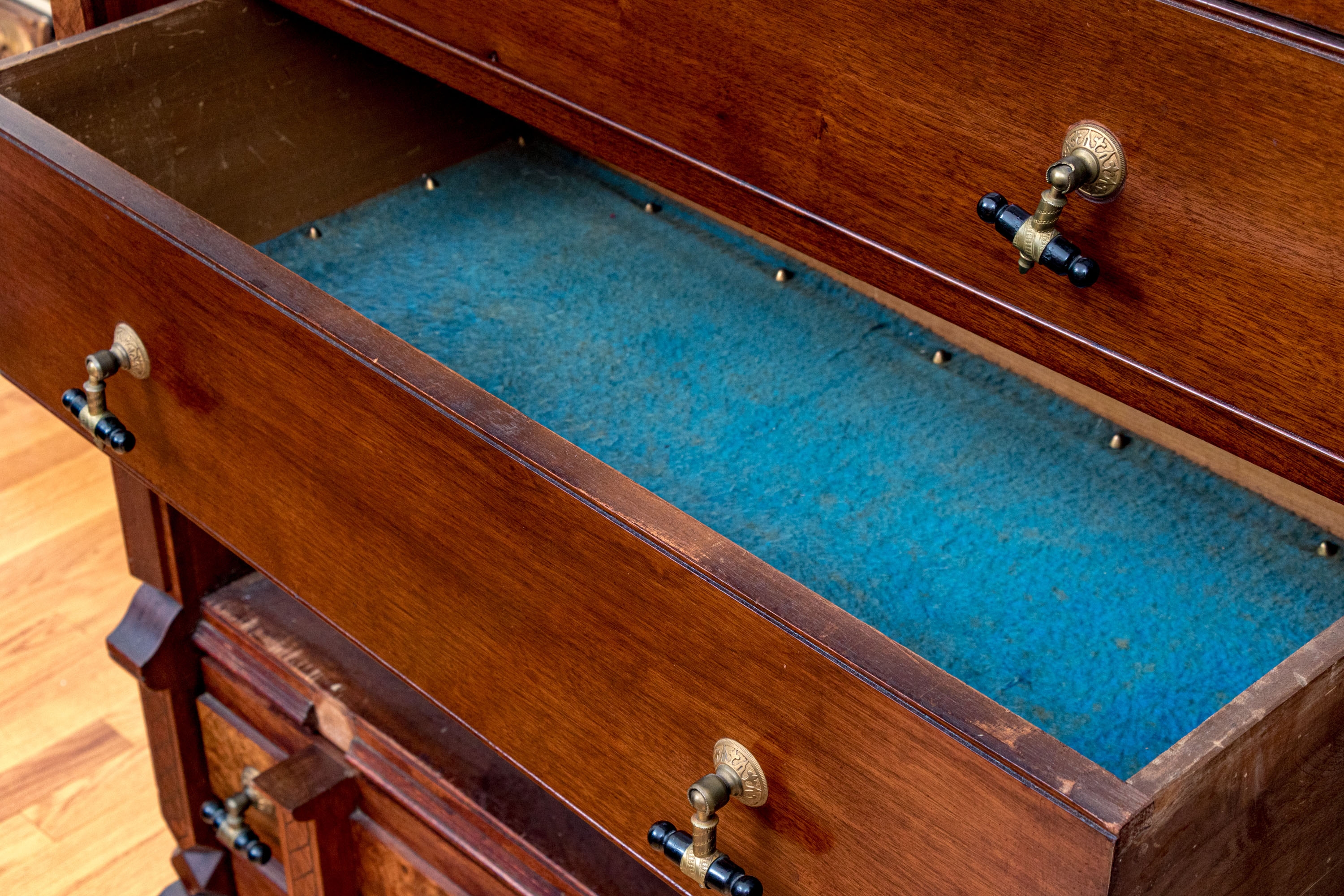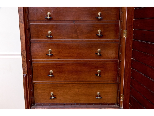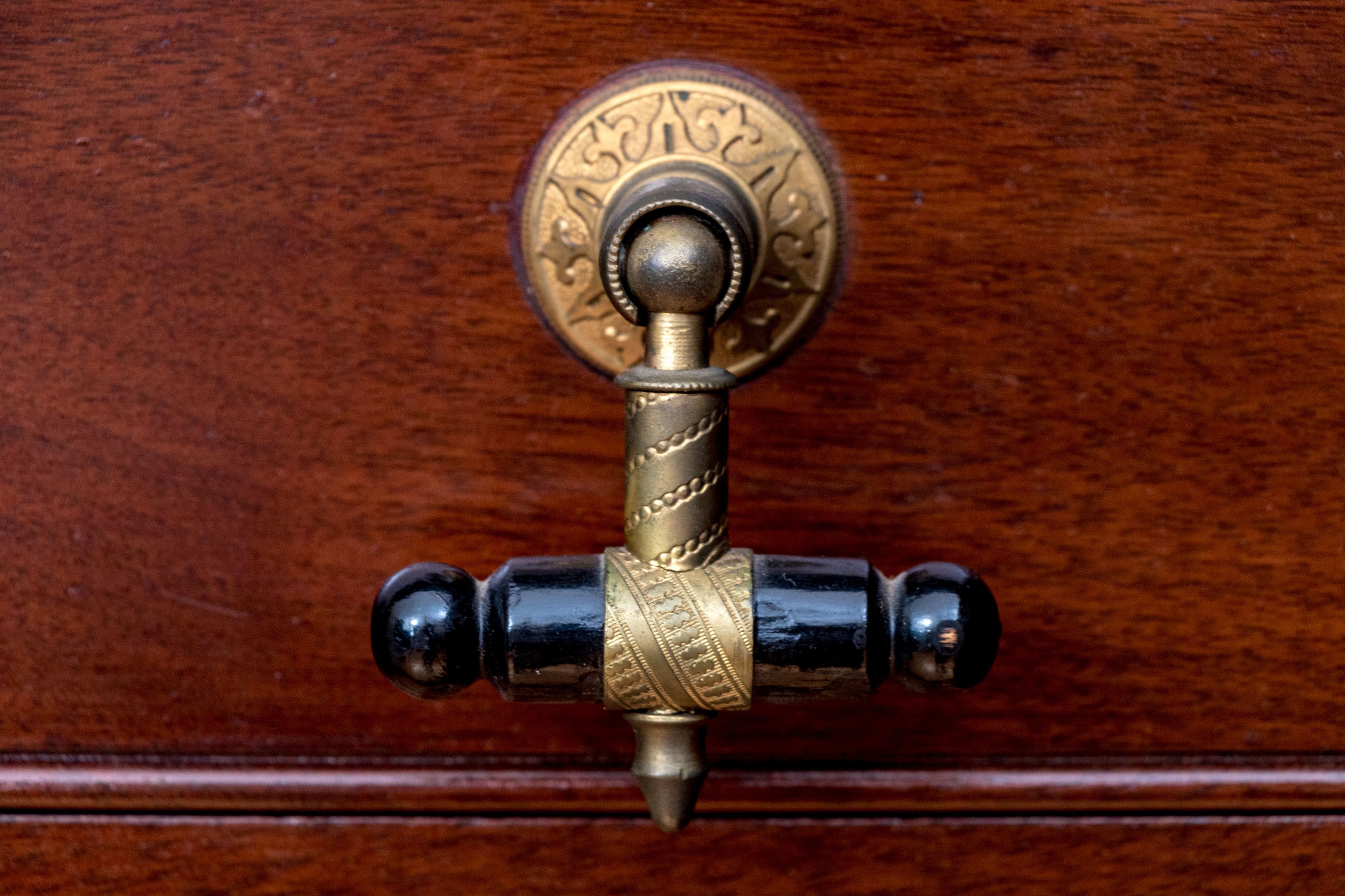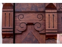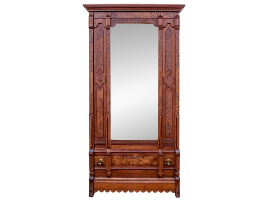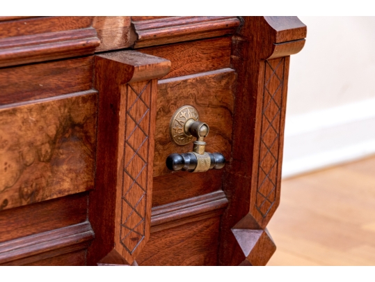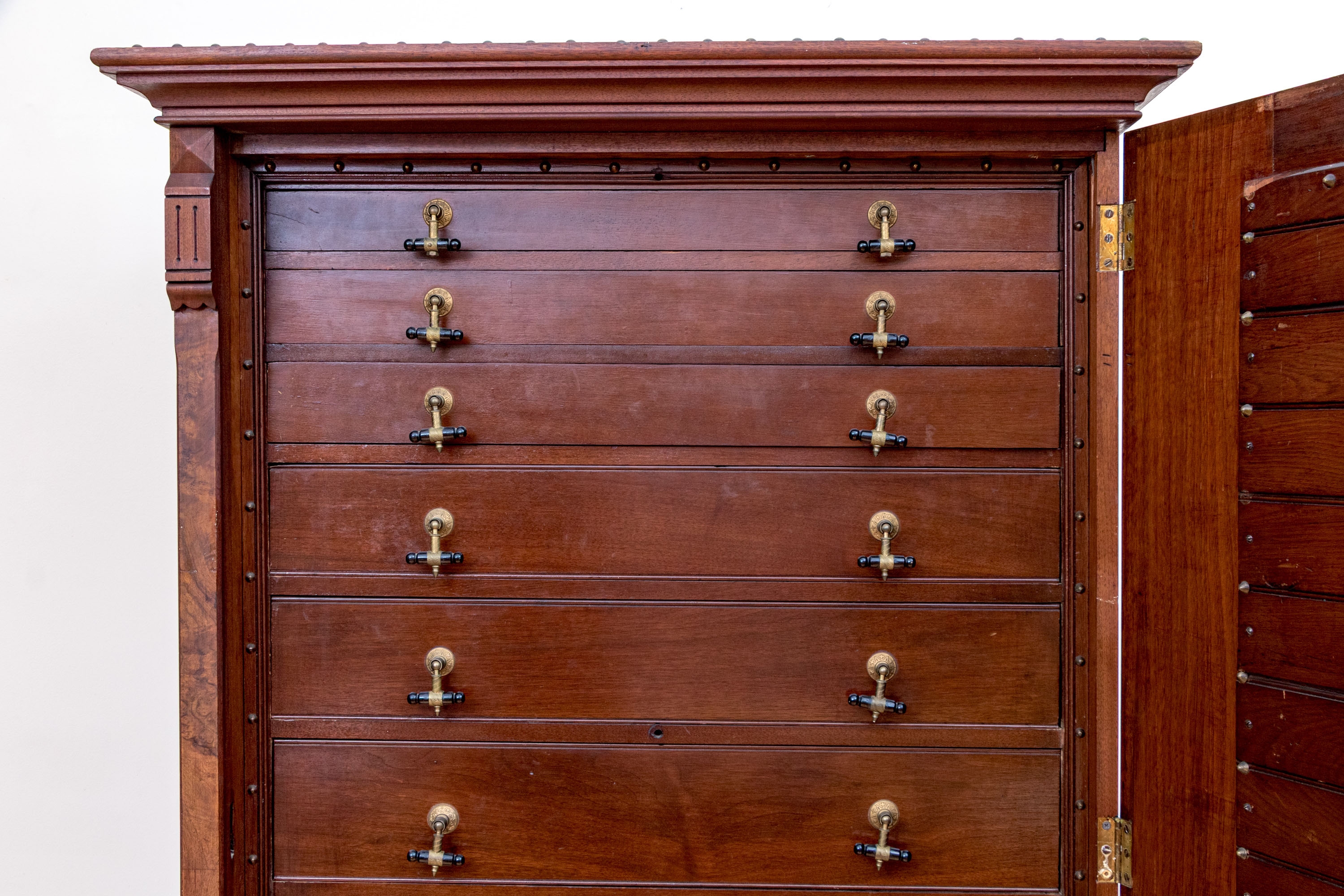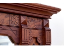 An Antique mixed wood and deep stained Period Eastlake Armoire with mirror panel front. The door opens to reveal graduated drawers having incredible and beautifully made pulls in Cross form made by Russell & Erwin and shown in their 1897 catalog. The pulls are fashioned from elaborately decorated bronze and shaped wood handles in an Ebonized finish. The hardware is repeated on the bottom exterior drawer and the whole piece has carvings, incised designs and panels. Includes a key.