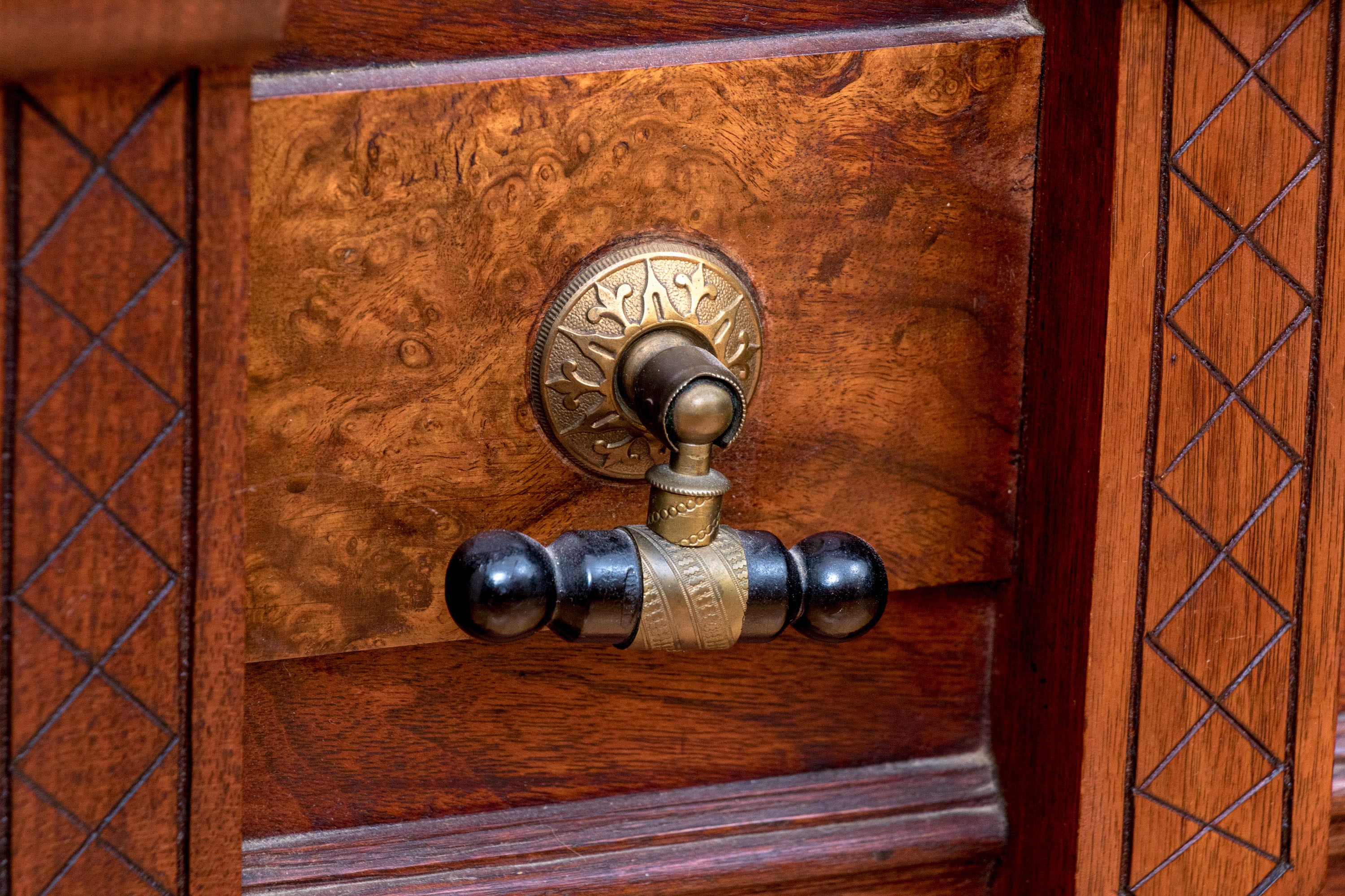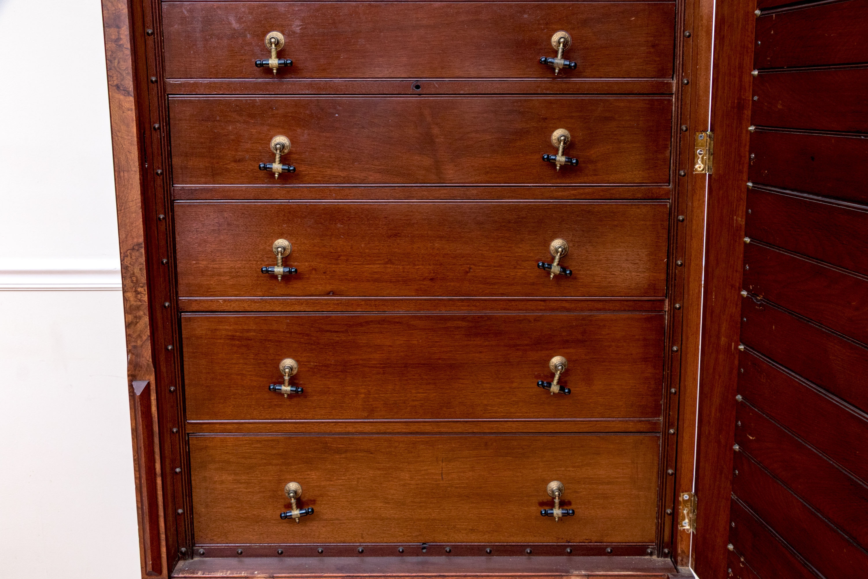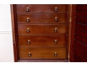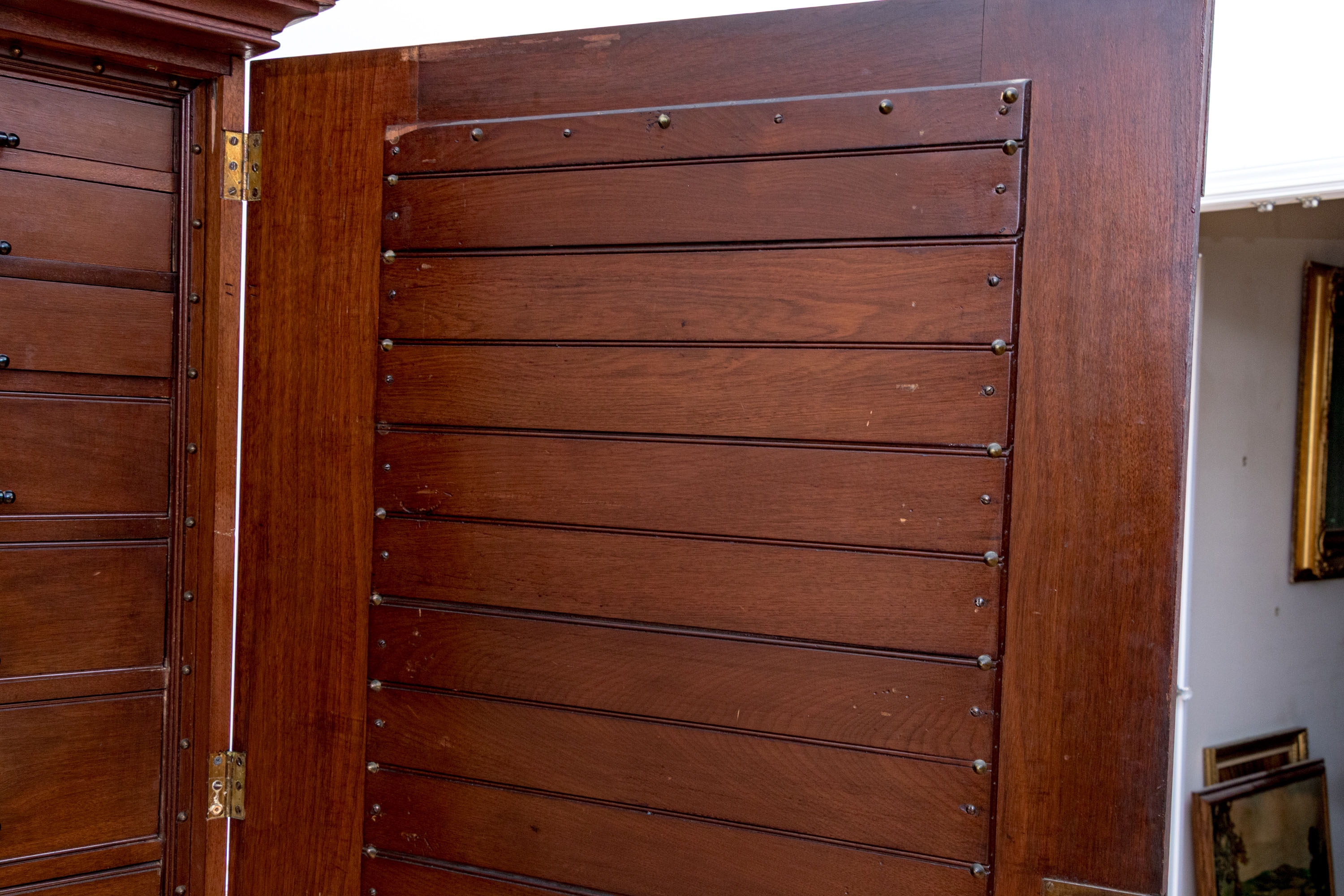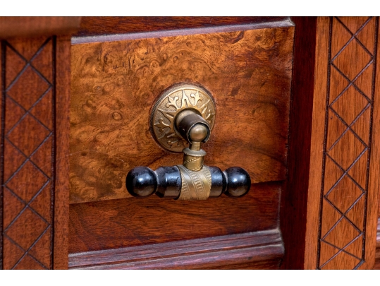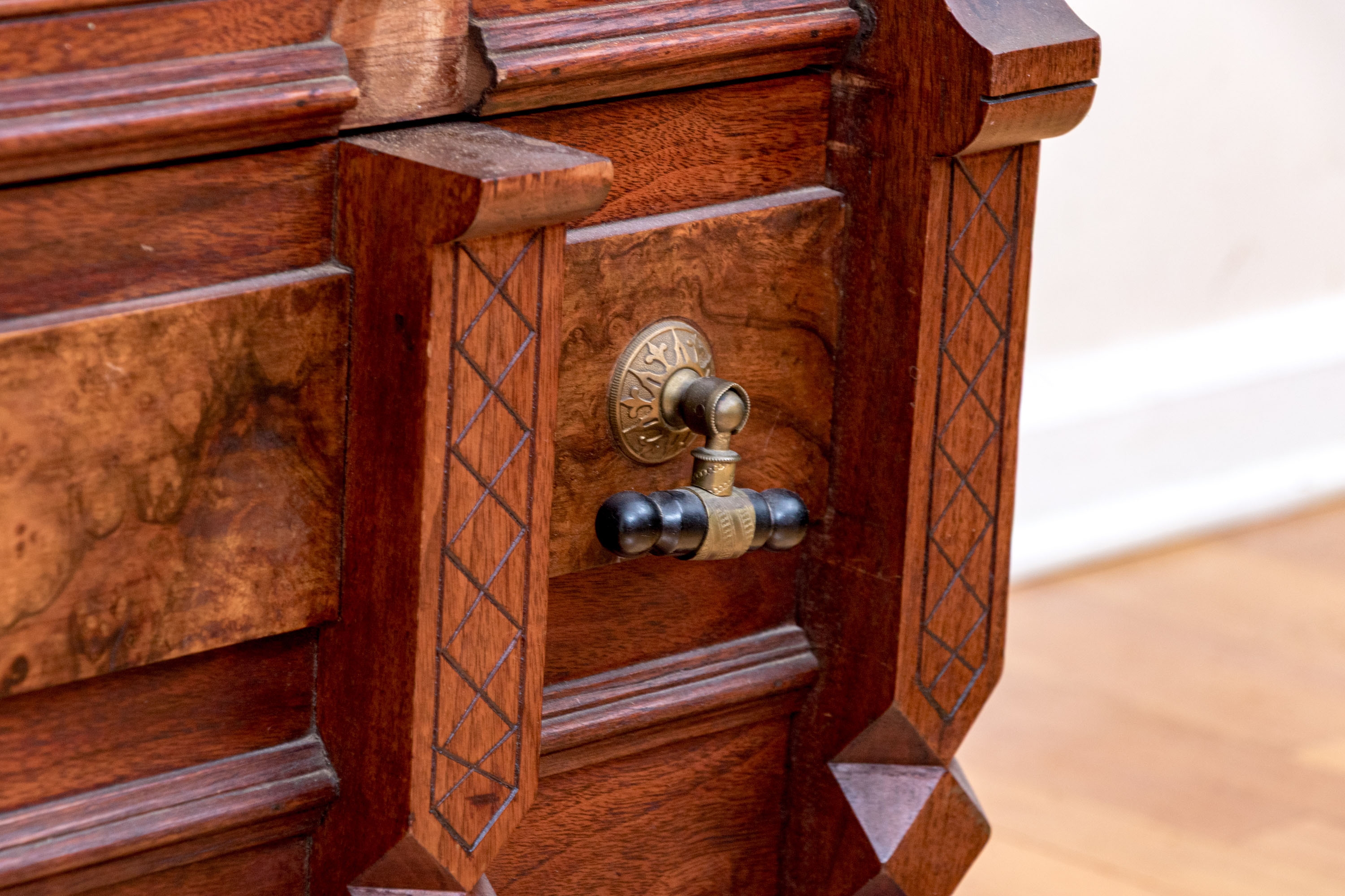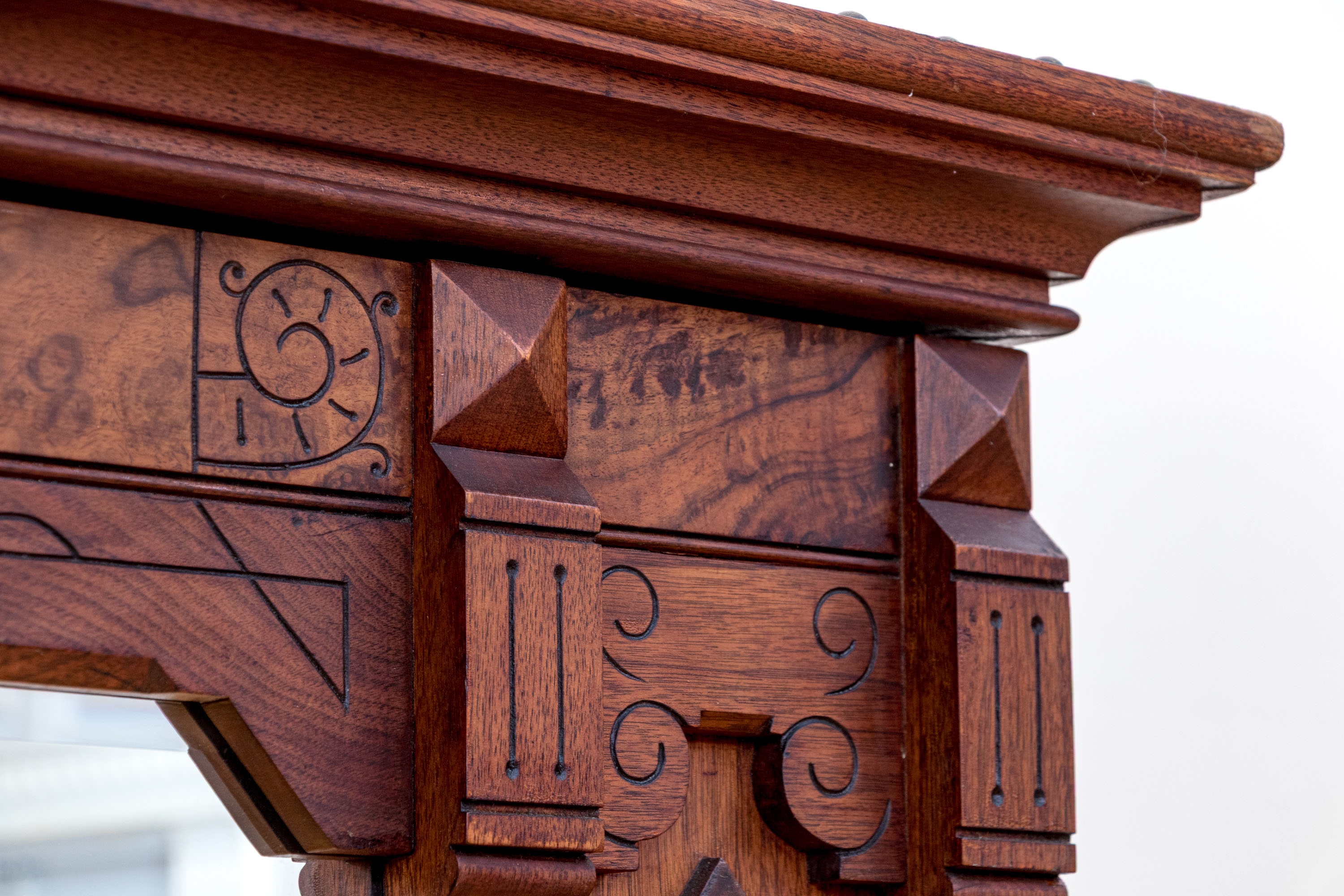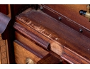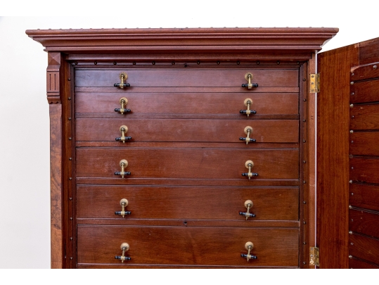 An Antique mixed wood and deep stained Period Eastlake Armoire with mirror panel front. The door opens to reveal graduated drawers having incredible and beautifully made pulls in Cross form made by Russell & Erwin and shown in their 1897 catalog. The pulls are fashioned from elaborately decorated bronze and shaped wood handles in an Ebonized finish. The hardware is repeated on the bottom exterior drawer and the whole piece has carvings, incised designs and panels. Includes a key.