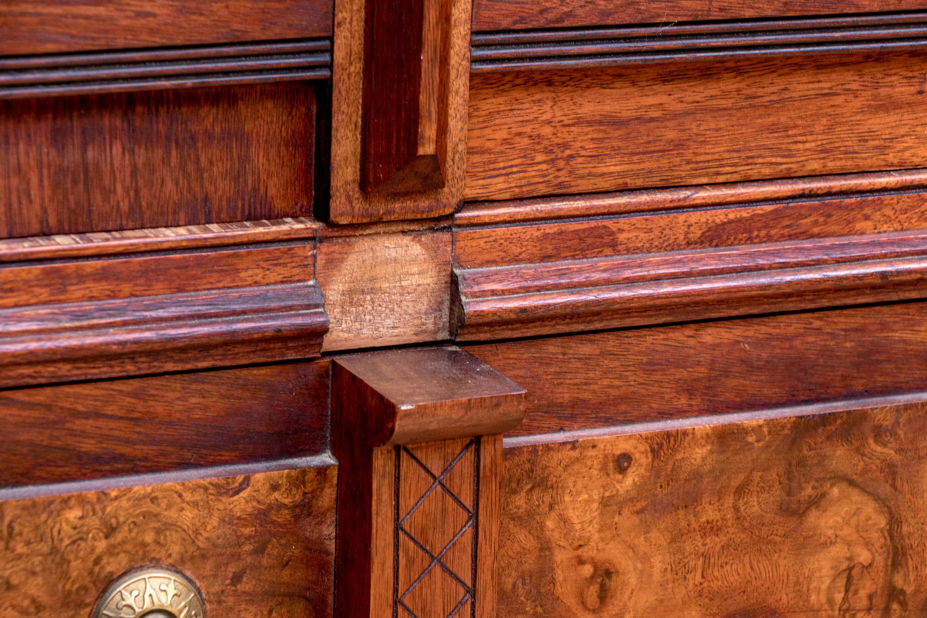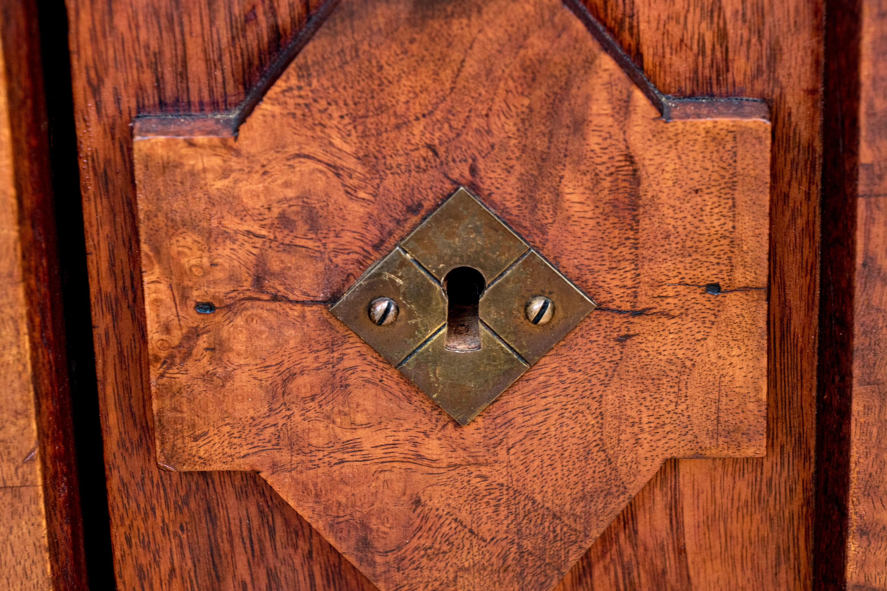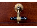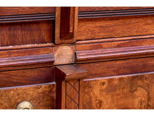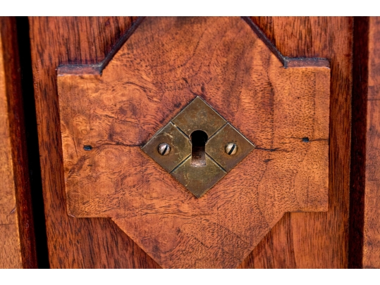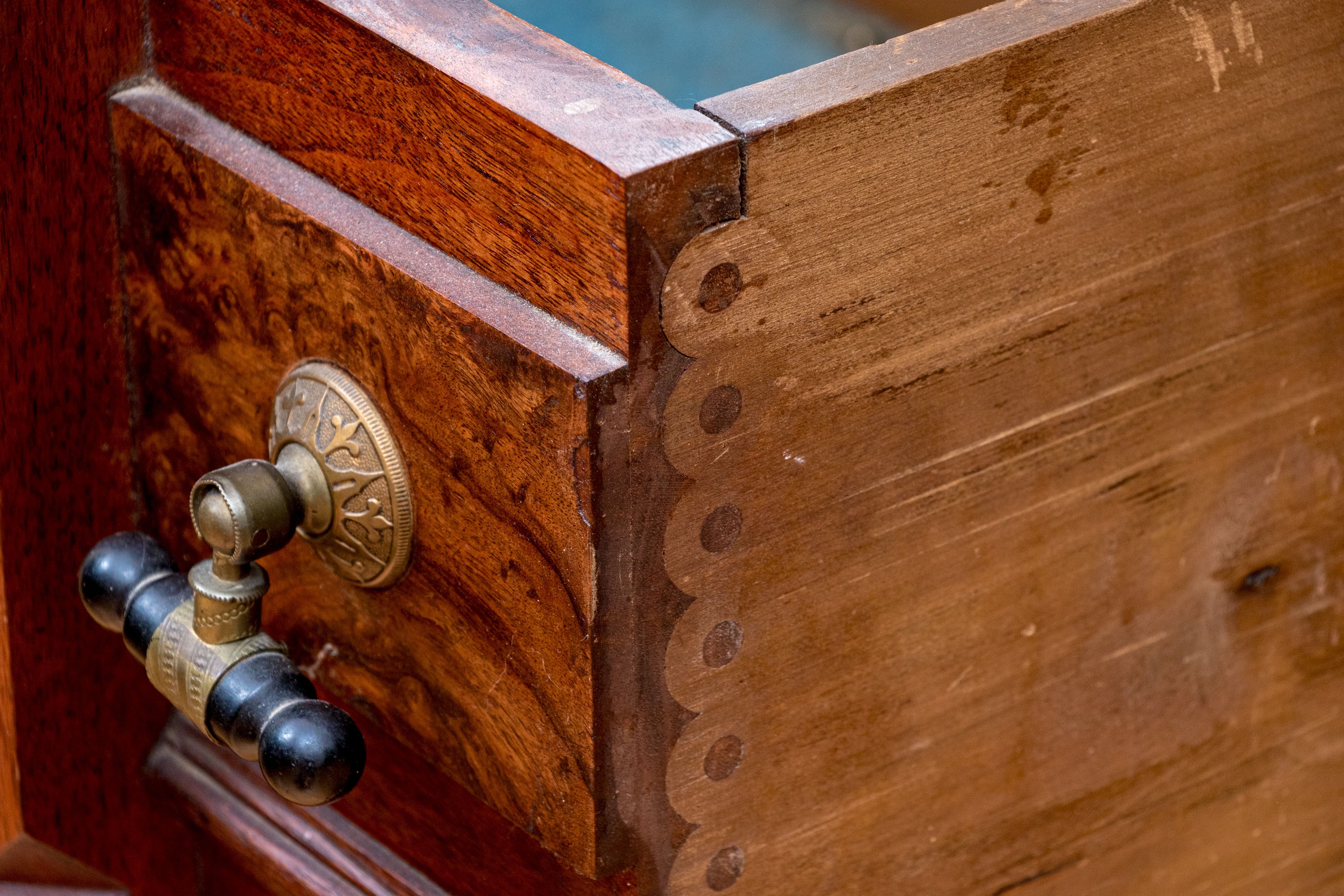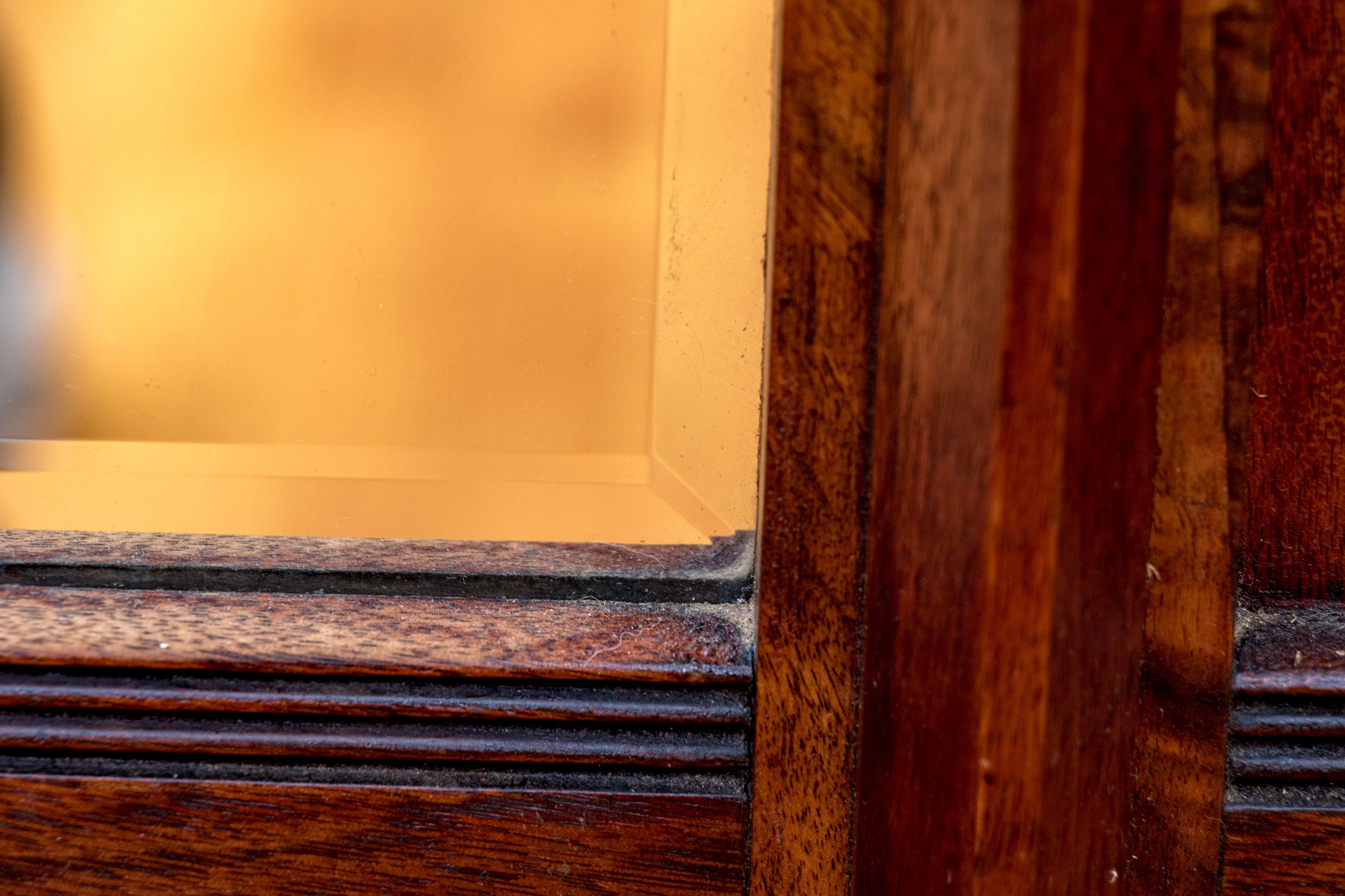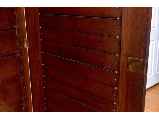 An Antique mixed wood and deep stained Period Eastlake Armoire with mirror panel front. The door opens to reveal graduated drawers having incredible and beautifully made pulls in Cross form made by Russell & Erwin and shown in their 1897 catalog. The pulls are fashioned from elaborately decorated bronze and shaped wood handles in an Ebonized finish. The hardware is repeated on the bottom exterior drawer and the whole piece has carvings, incised designs and panels. Includes a key.