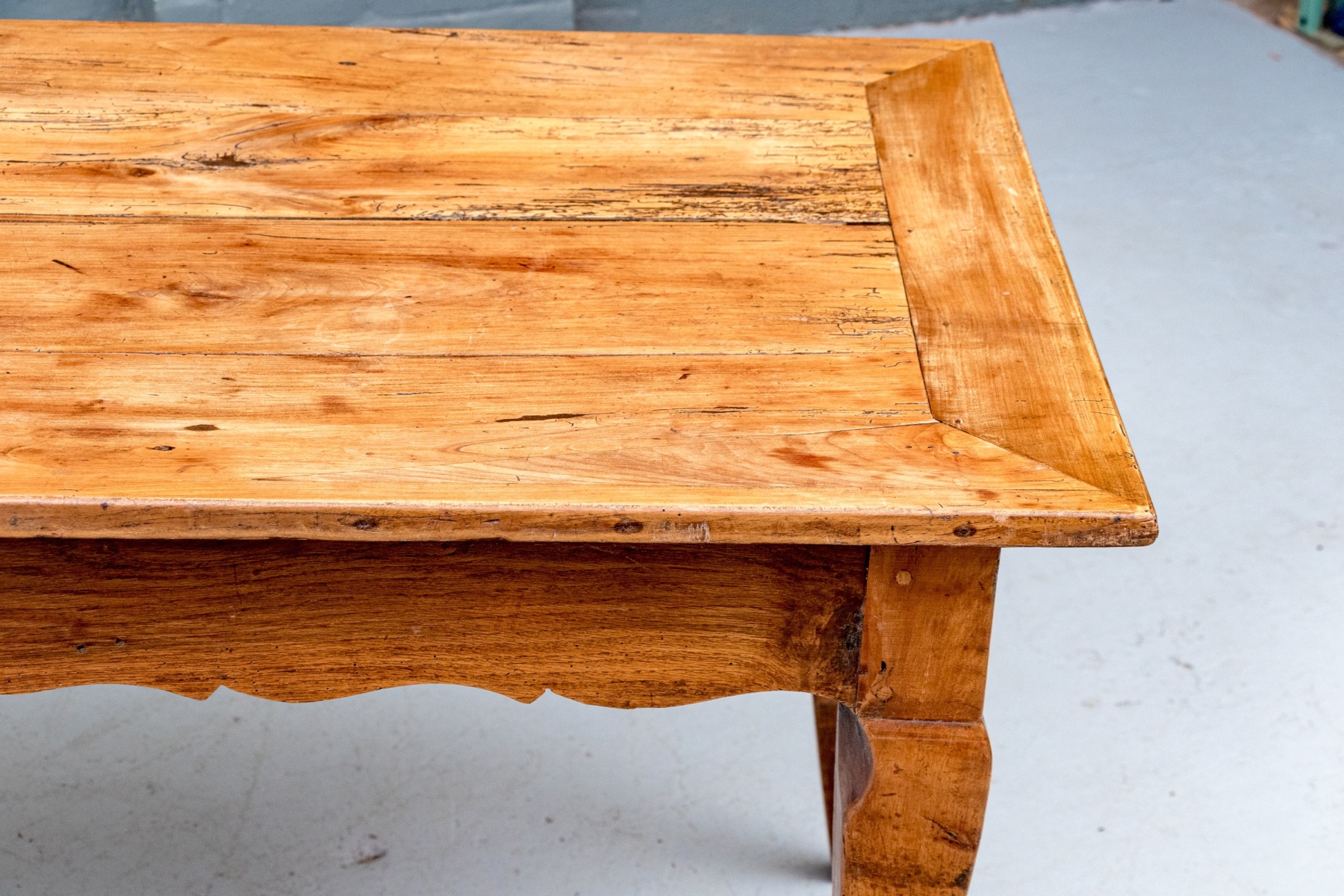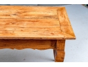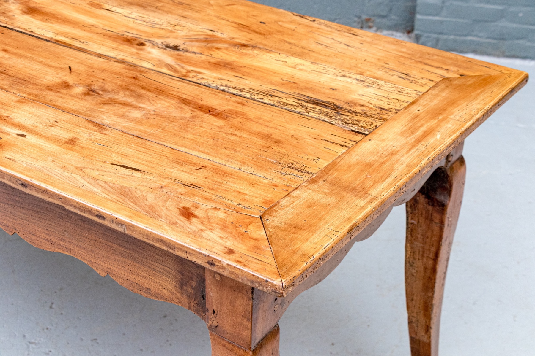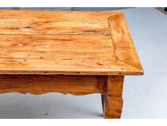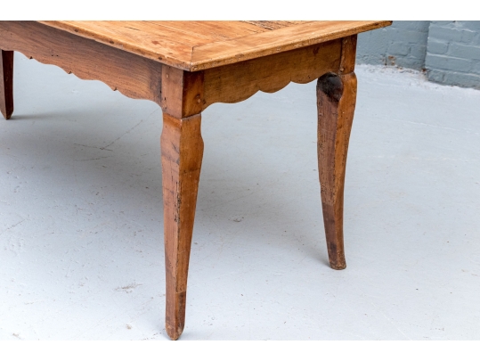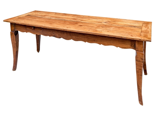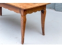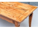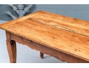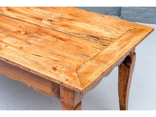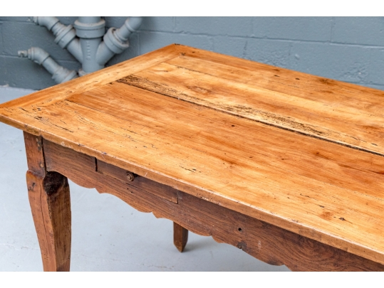An exceptional 19th Century French Cherry Farm Table with an incredible authentic presentation. The Table seats six easily and has a plank top, peg construction and sits very solidly. The table top has decorative end cut boards and a traditionally shaped apron with a utility drawer on each side (One drawer with a replaced wooden pull). The legs are solid, thick and have a slight Cabriolet curve.