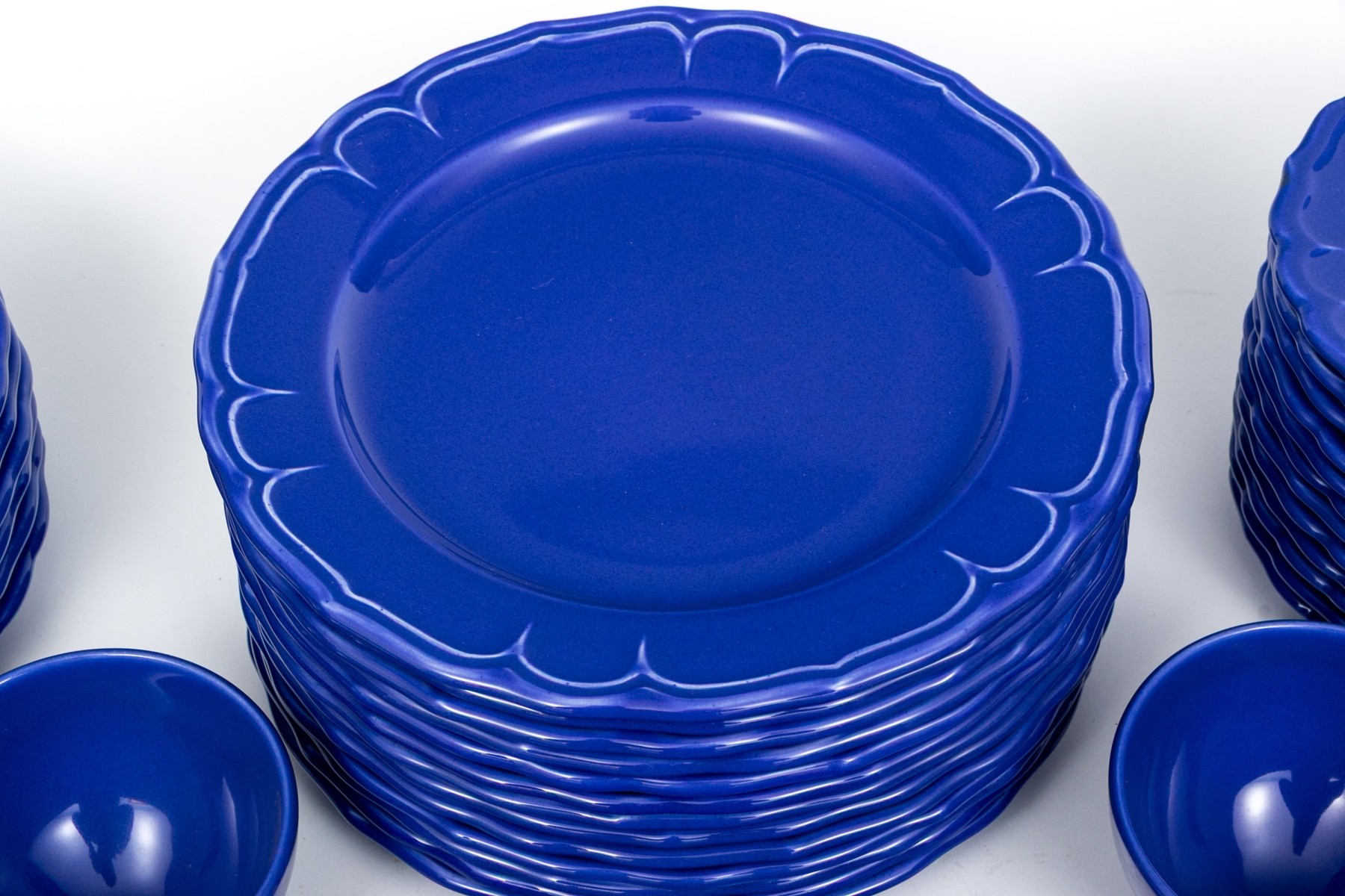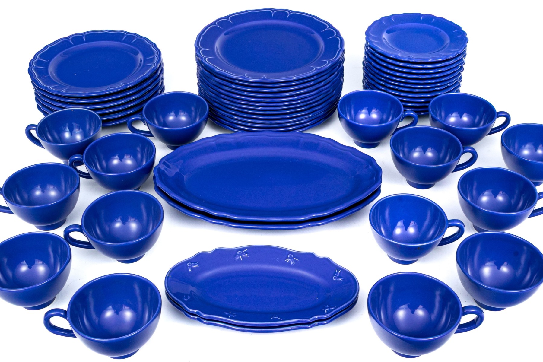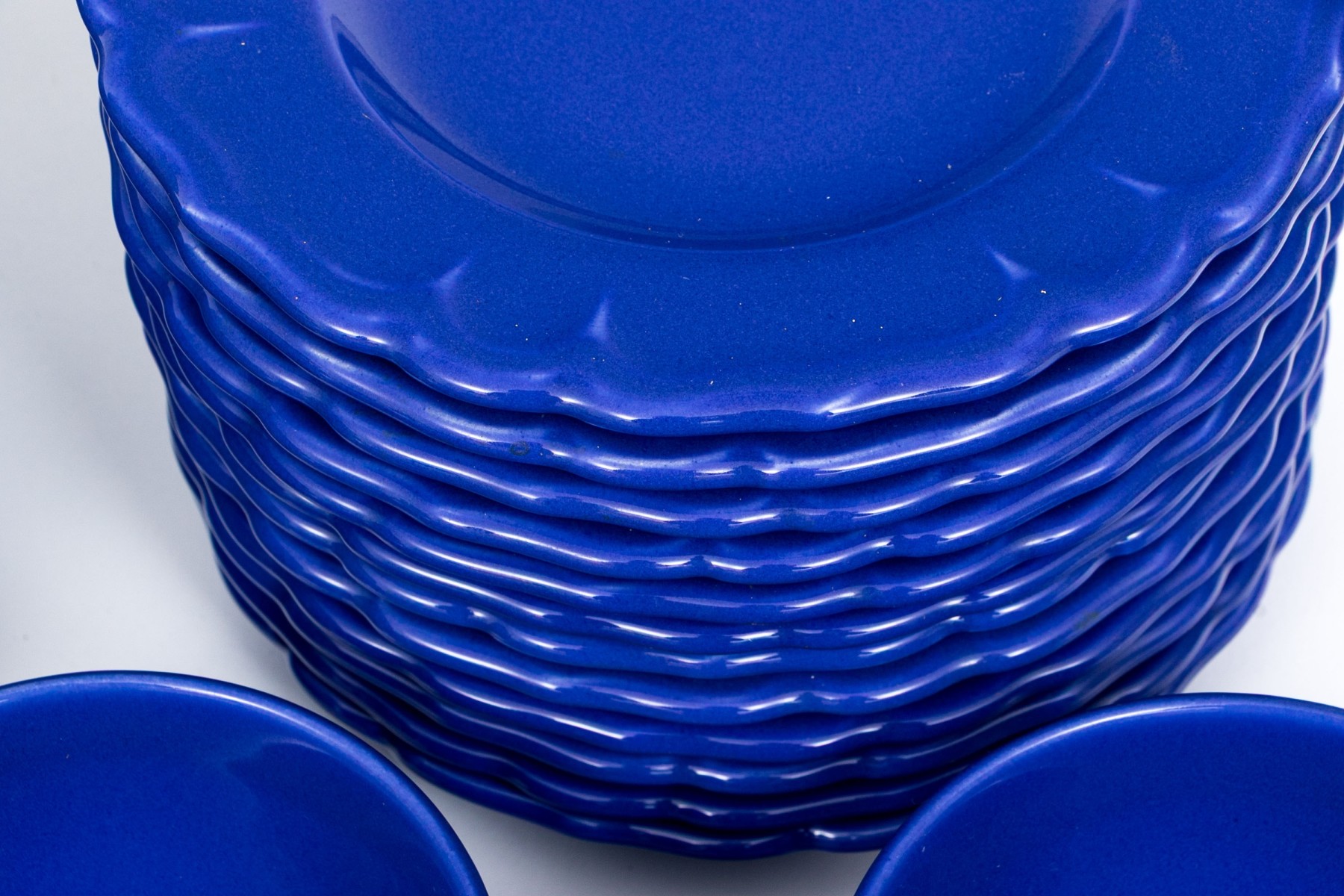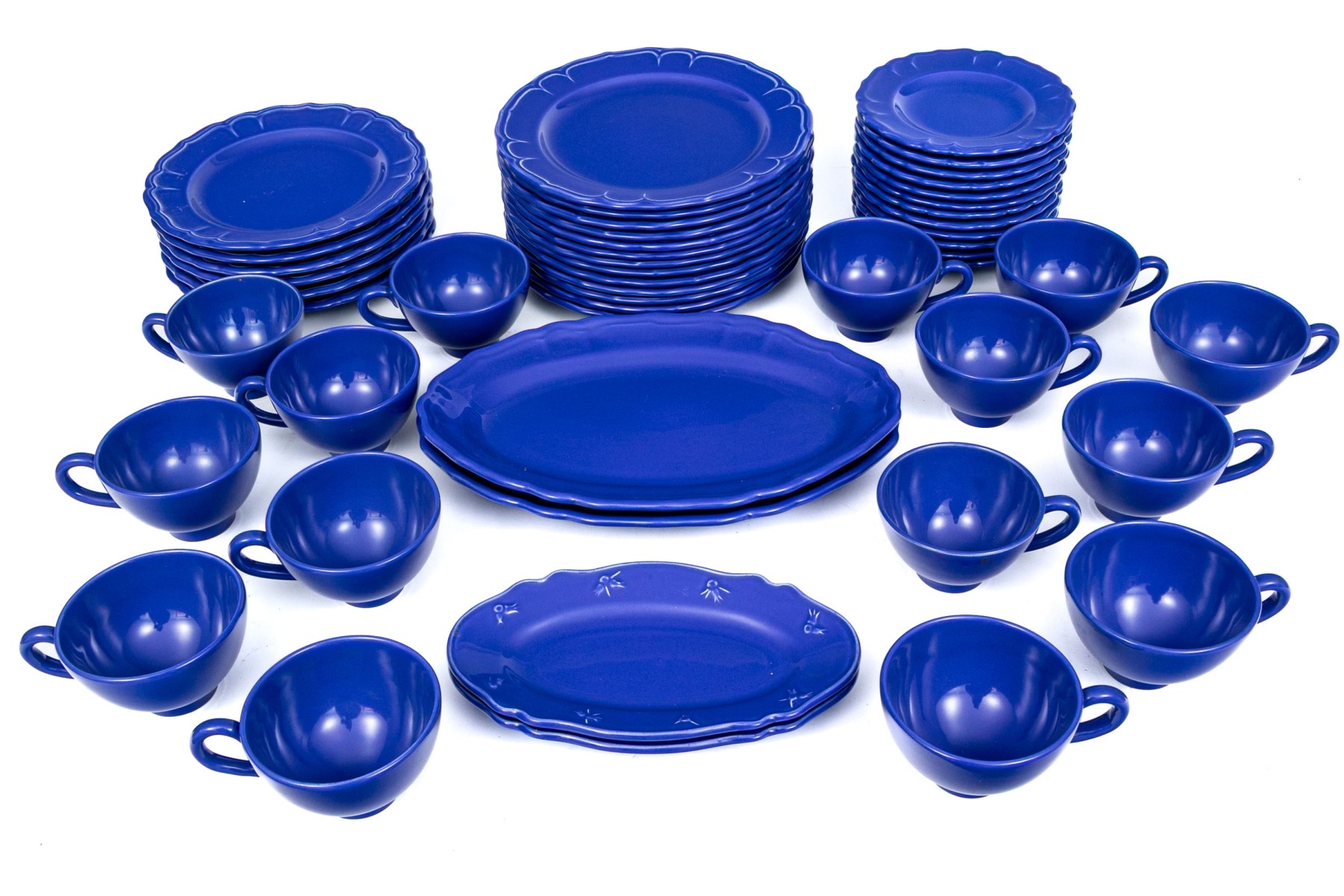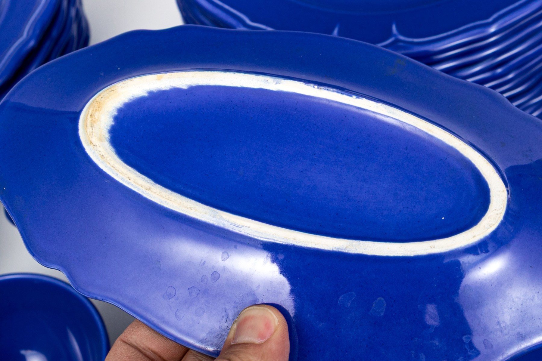 A sizable ceramic service in cobalt blue glaze, some faintly marked underfoot.