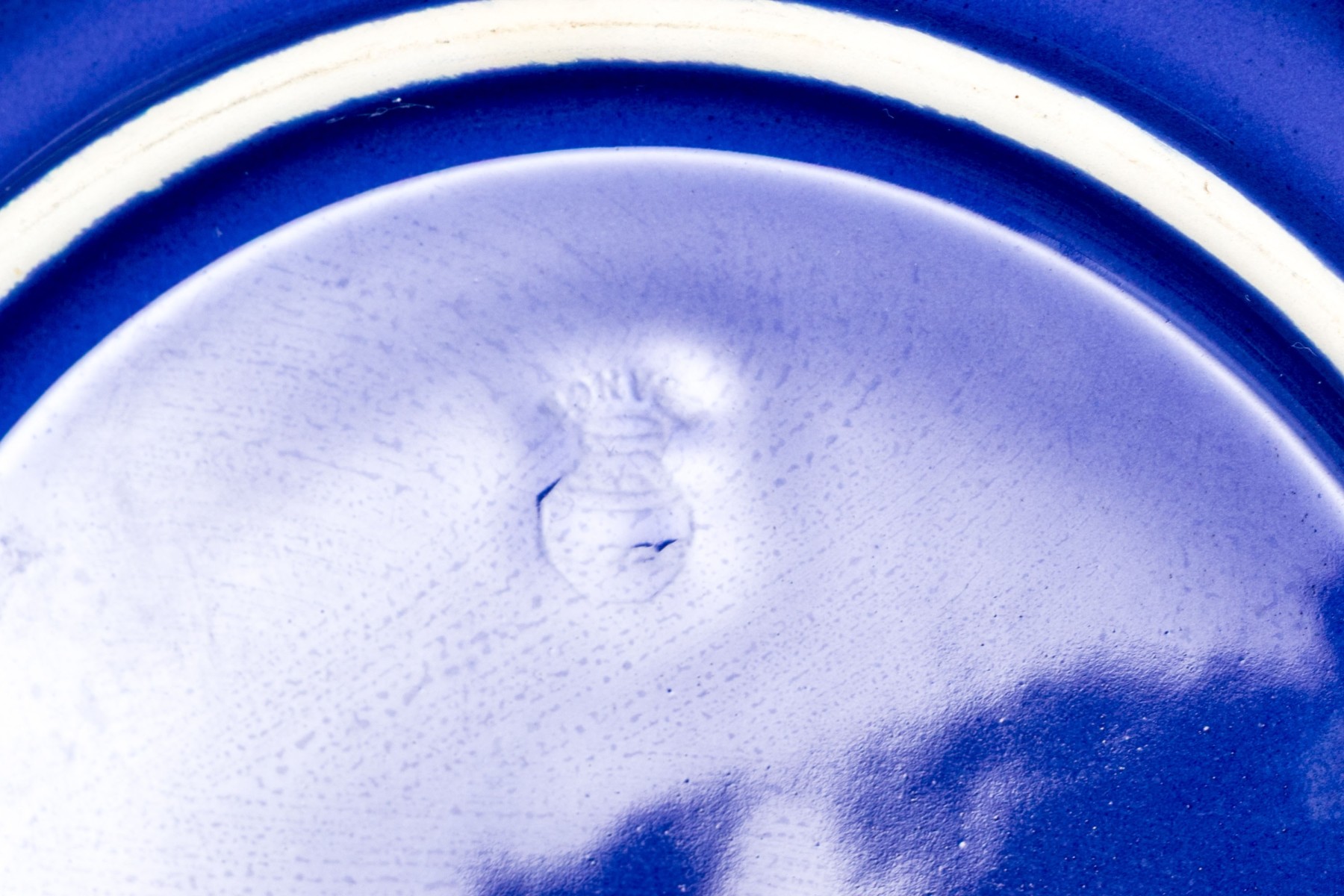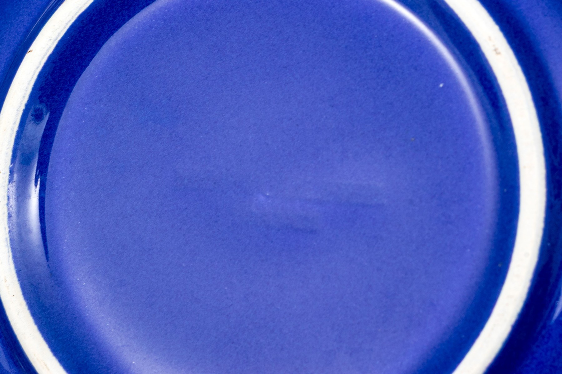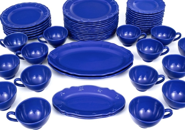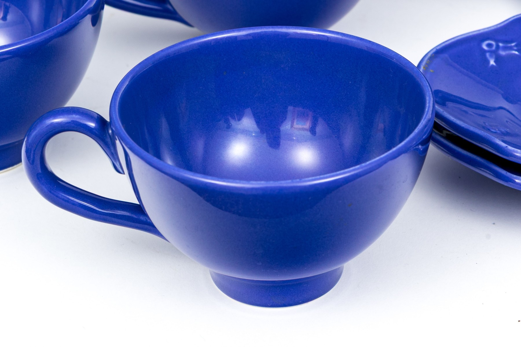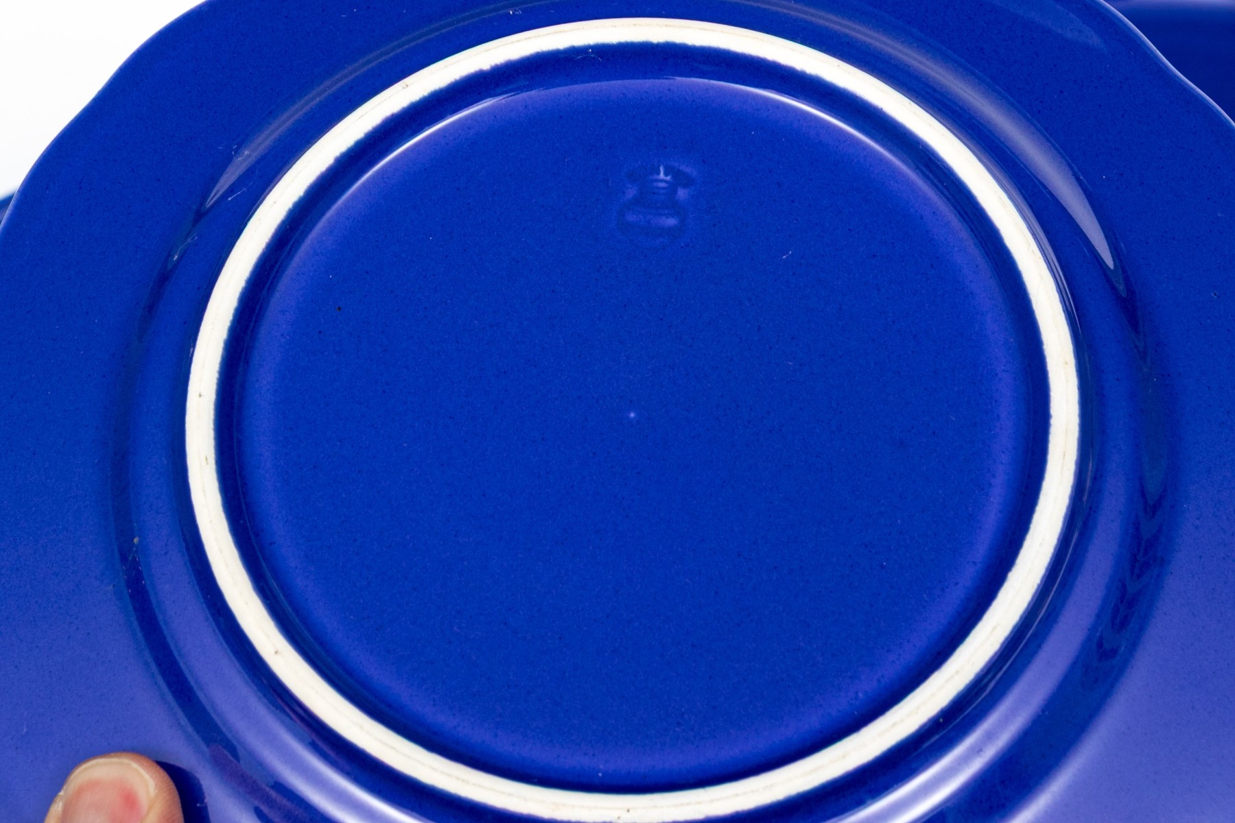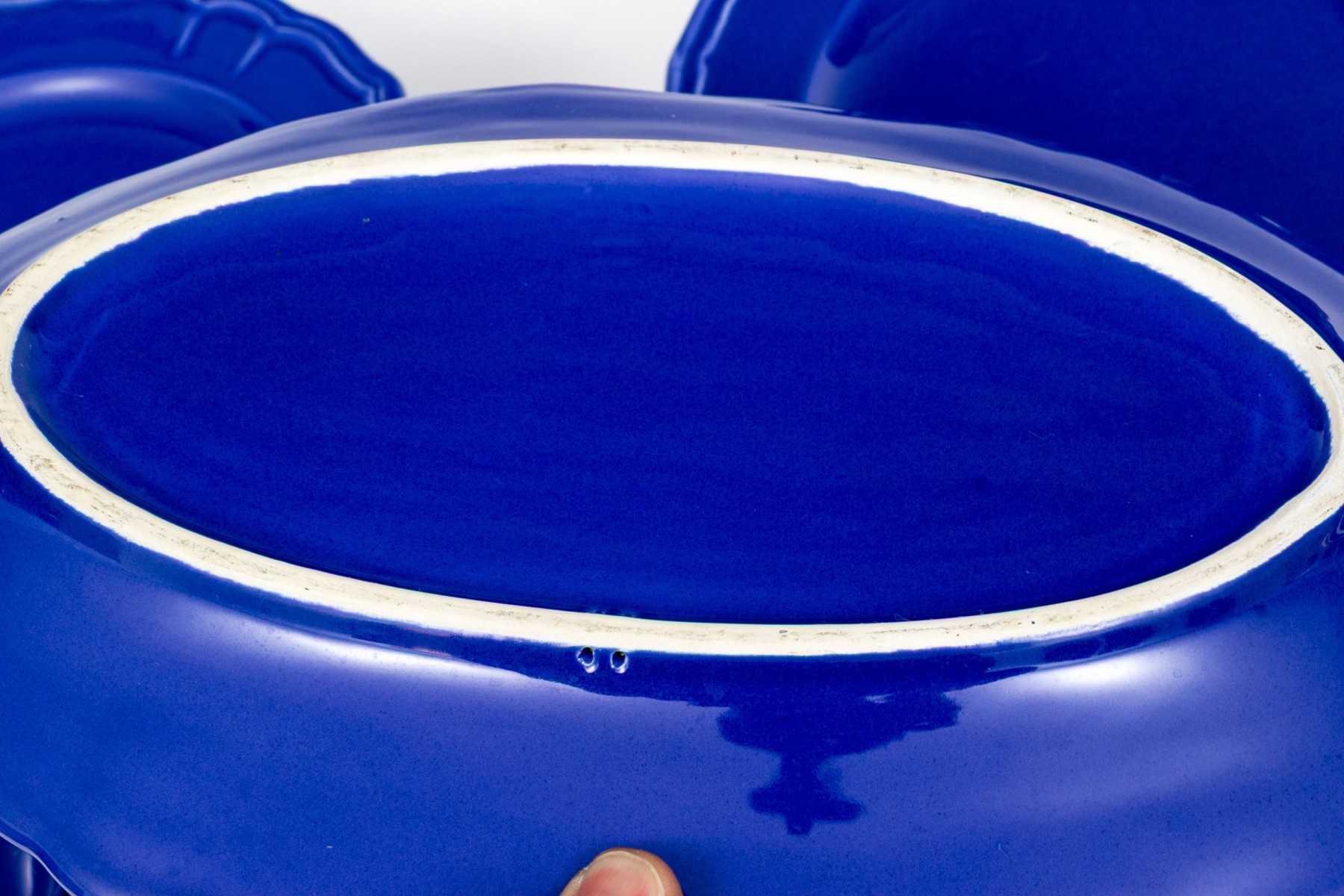A sizable ceramic service in cobalt blue glaze, some faintly marked underfoot.