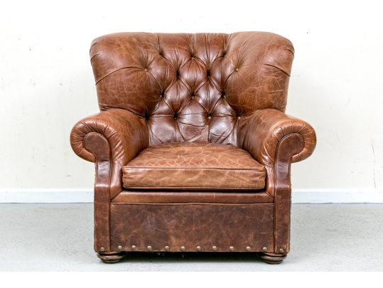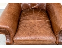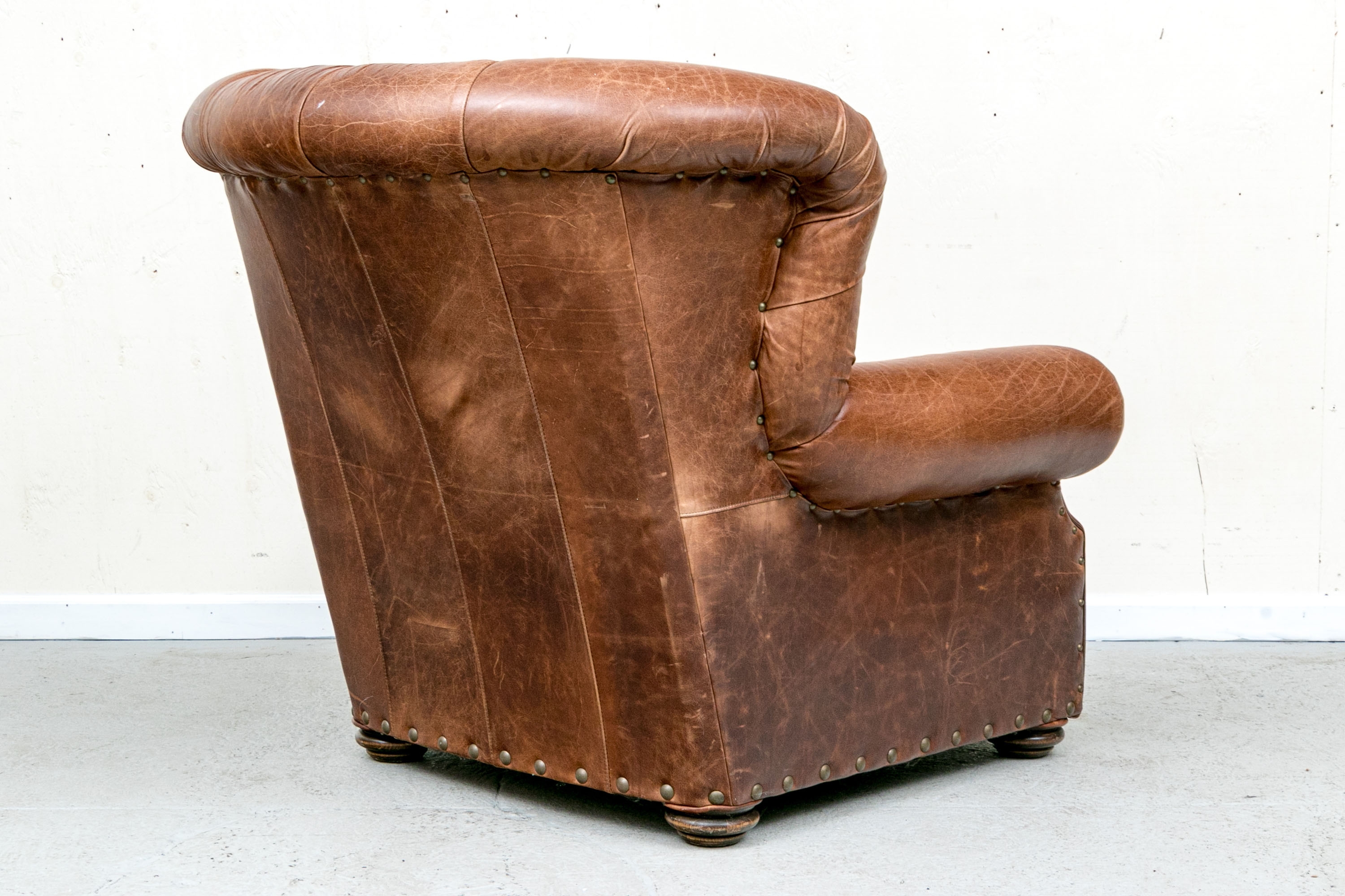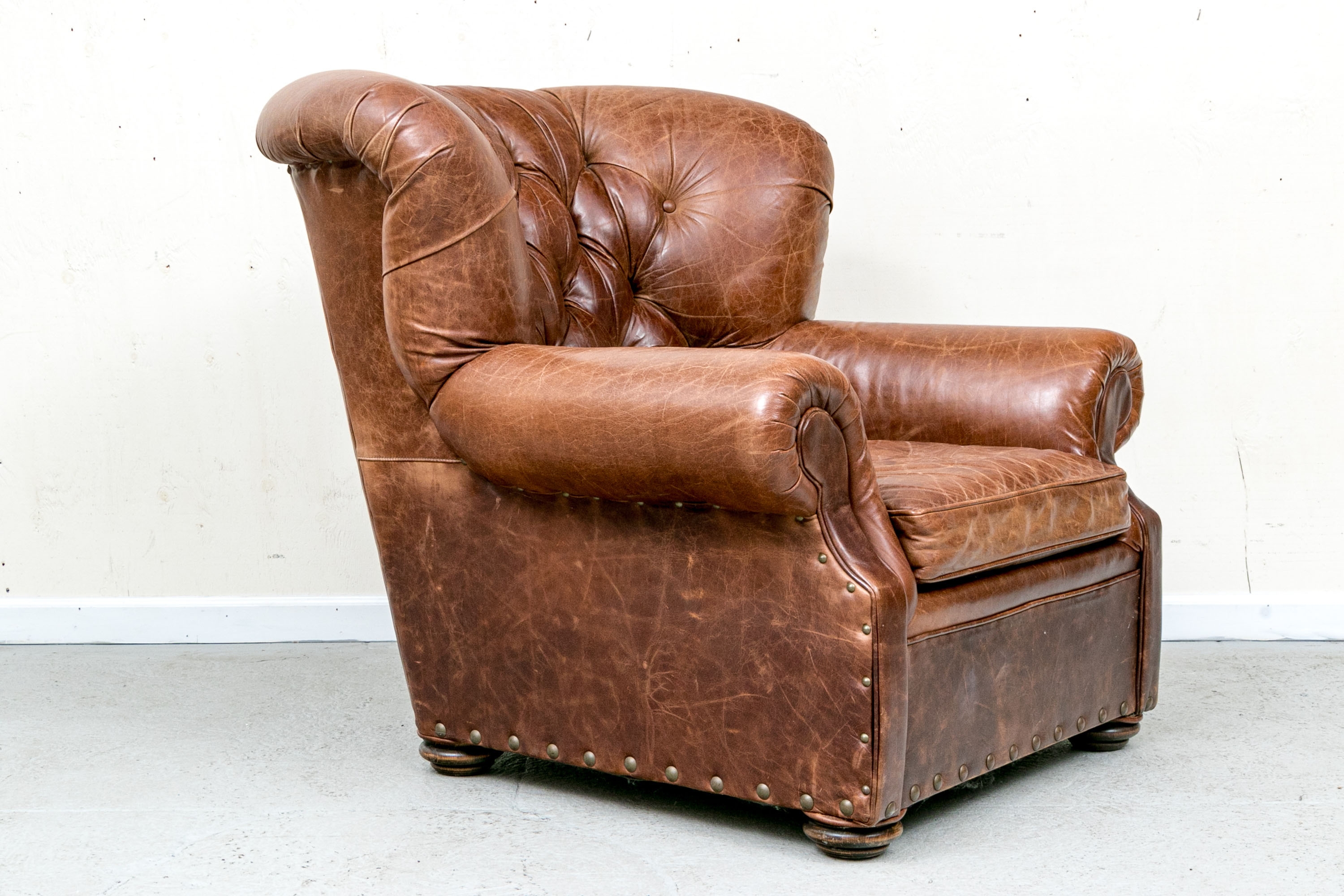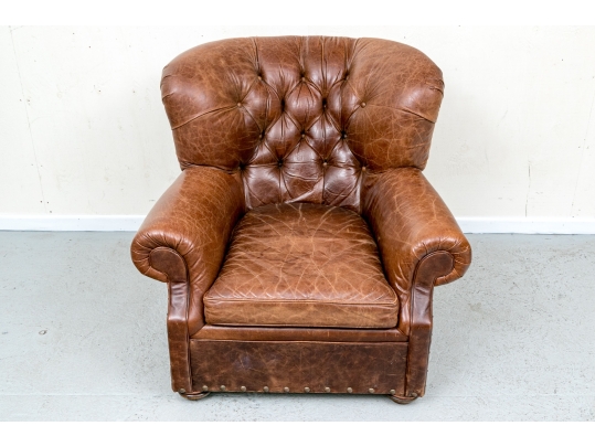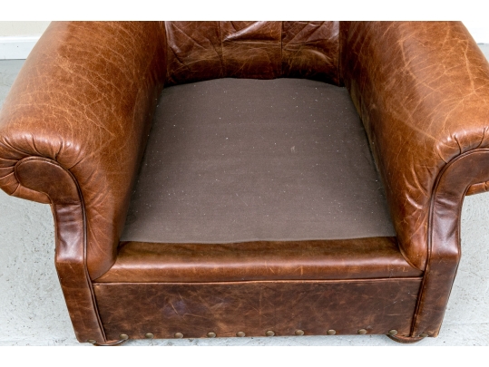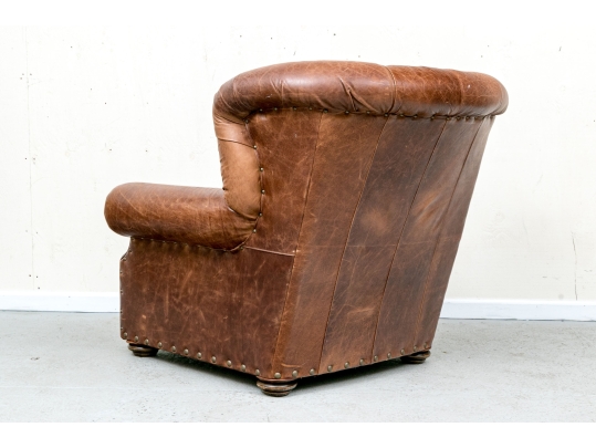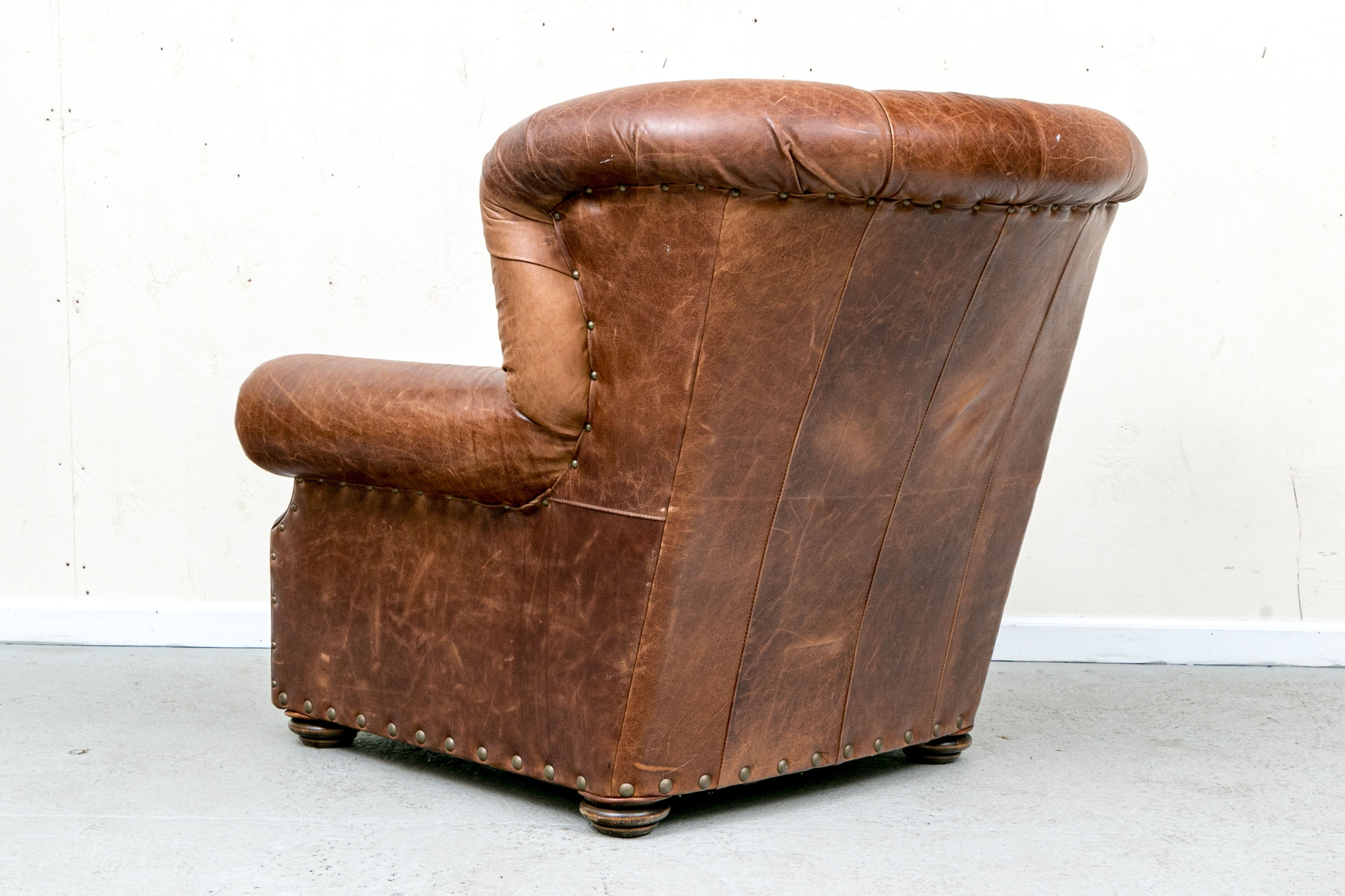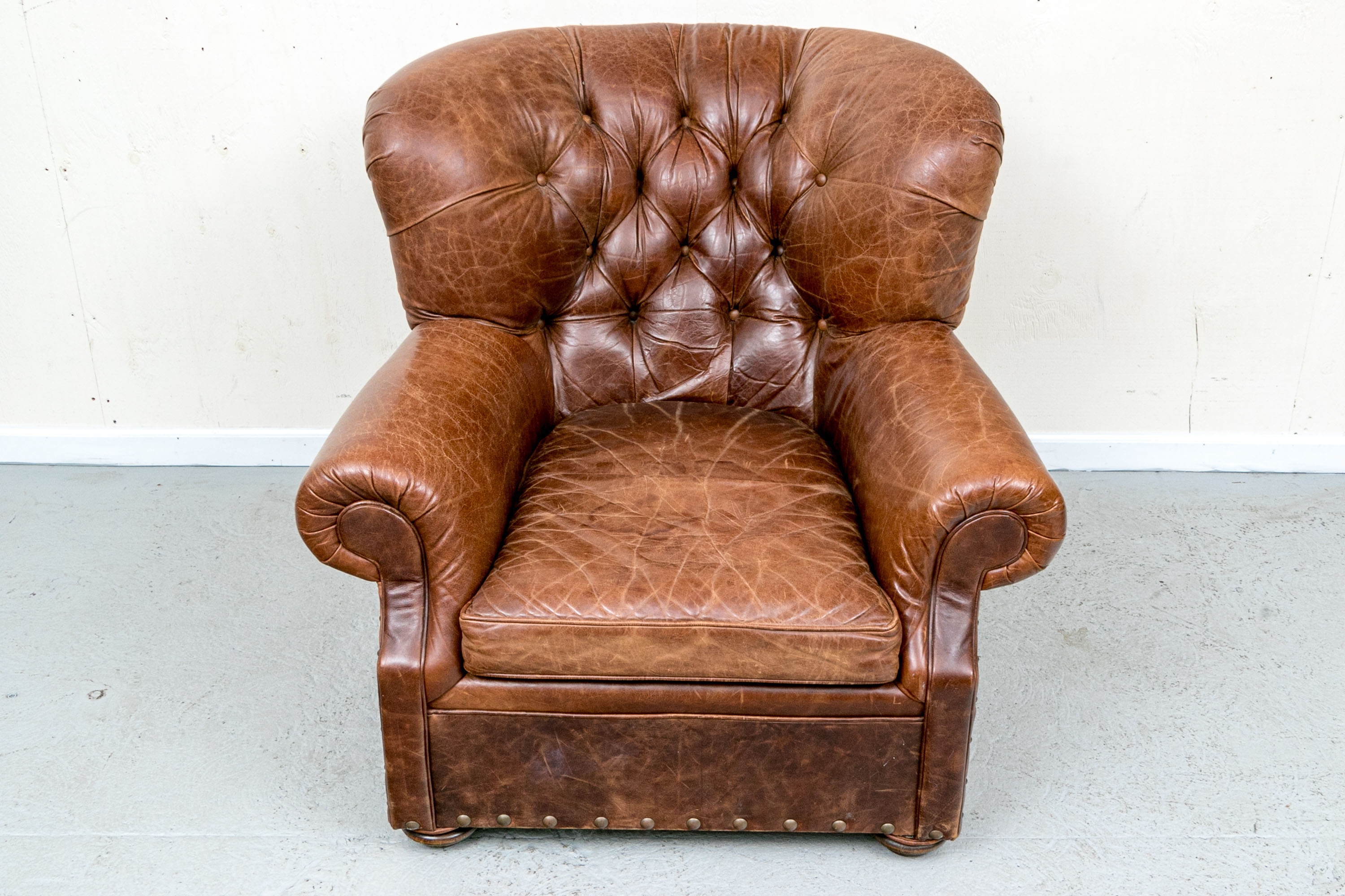 Large and incredibly comfortable Vintage Club chair with tufted button-back, rolled flat-panel arms, oversized nail-head base and frame trim and warm butter soft leather with a great age patina.