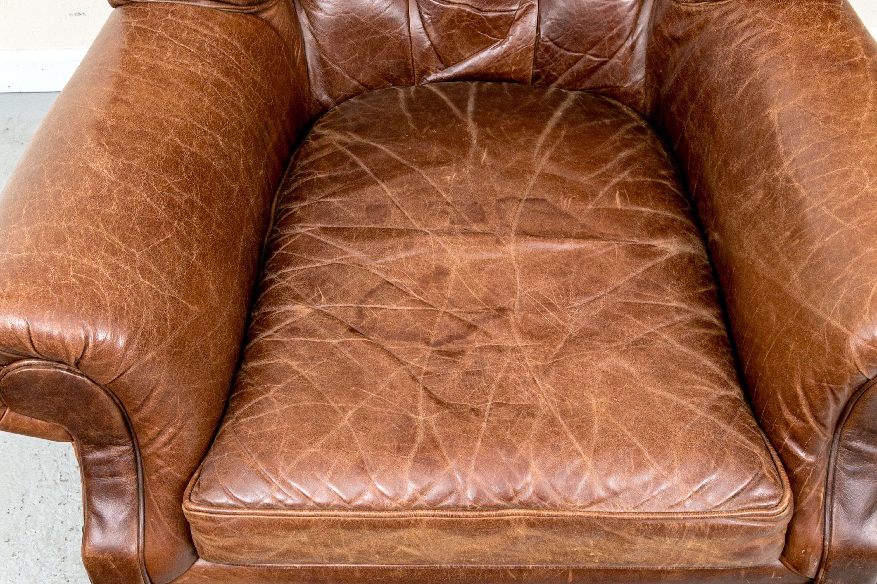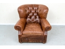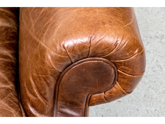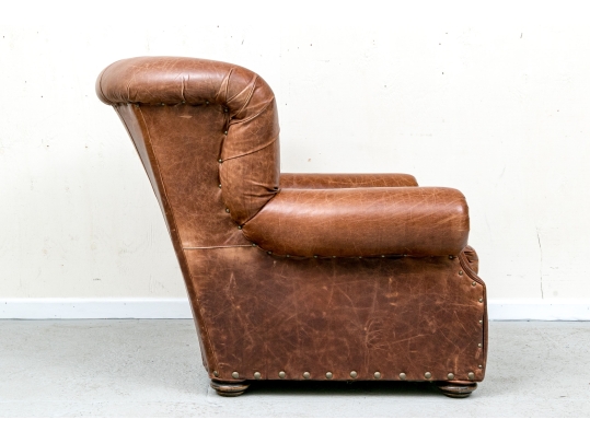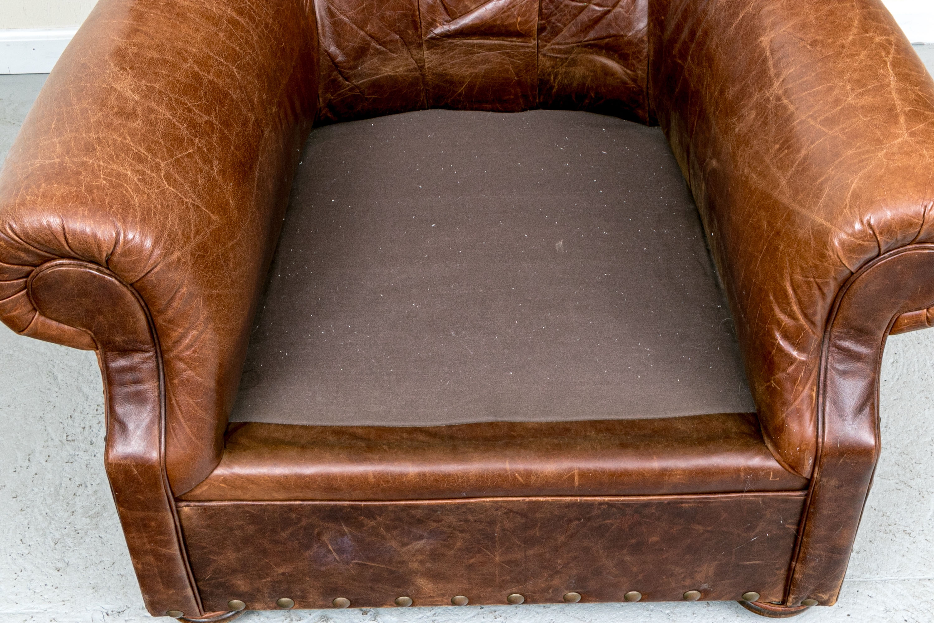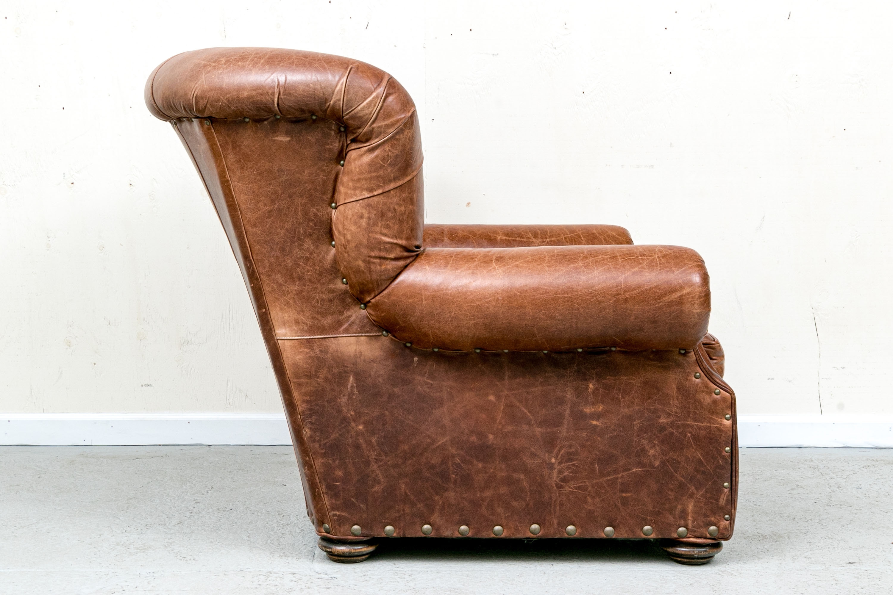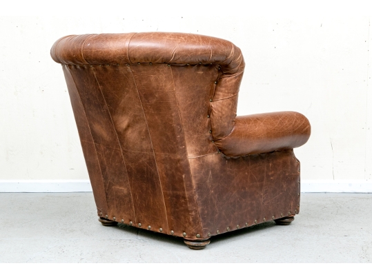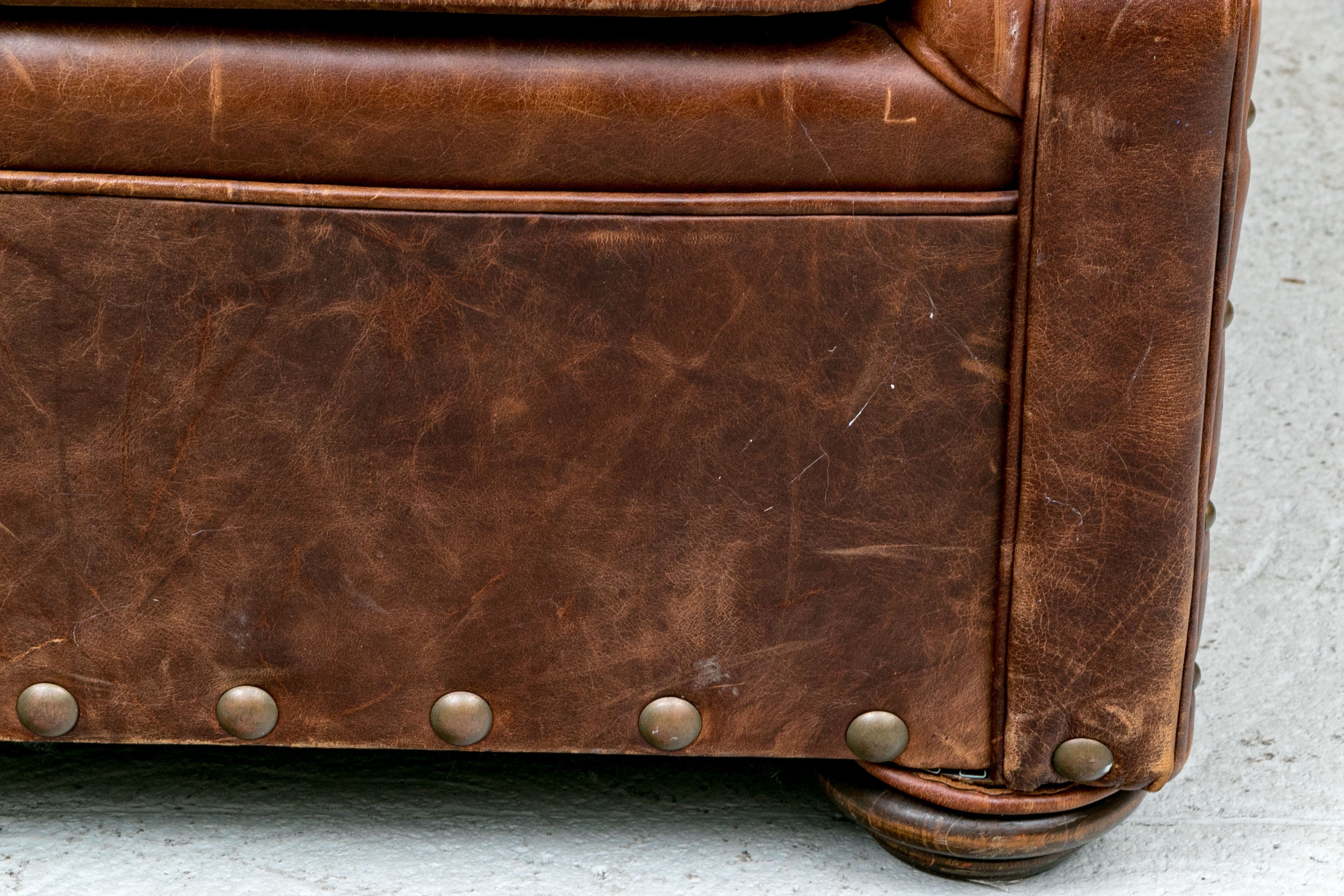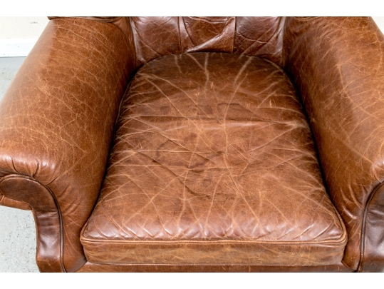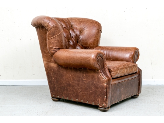 Large and incredibly comfortable Vintage Club chair with tufted button-back, rolled flat-panel arms, oversized nail-head base and frame trim and warm butter soft leather with a great age patina.