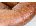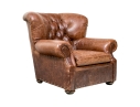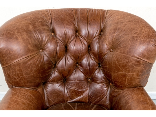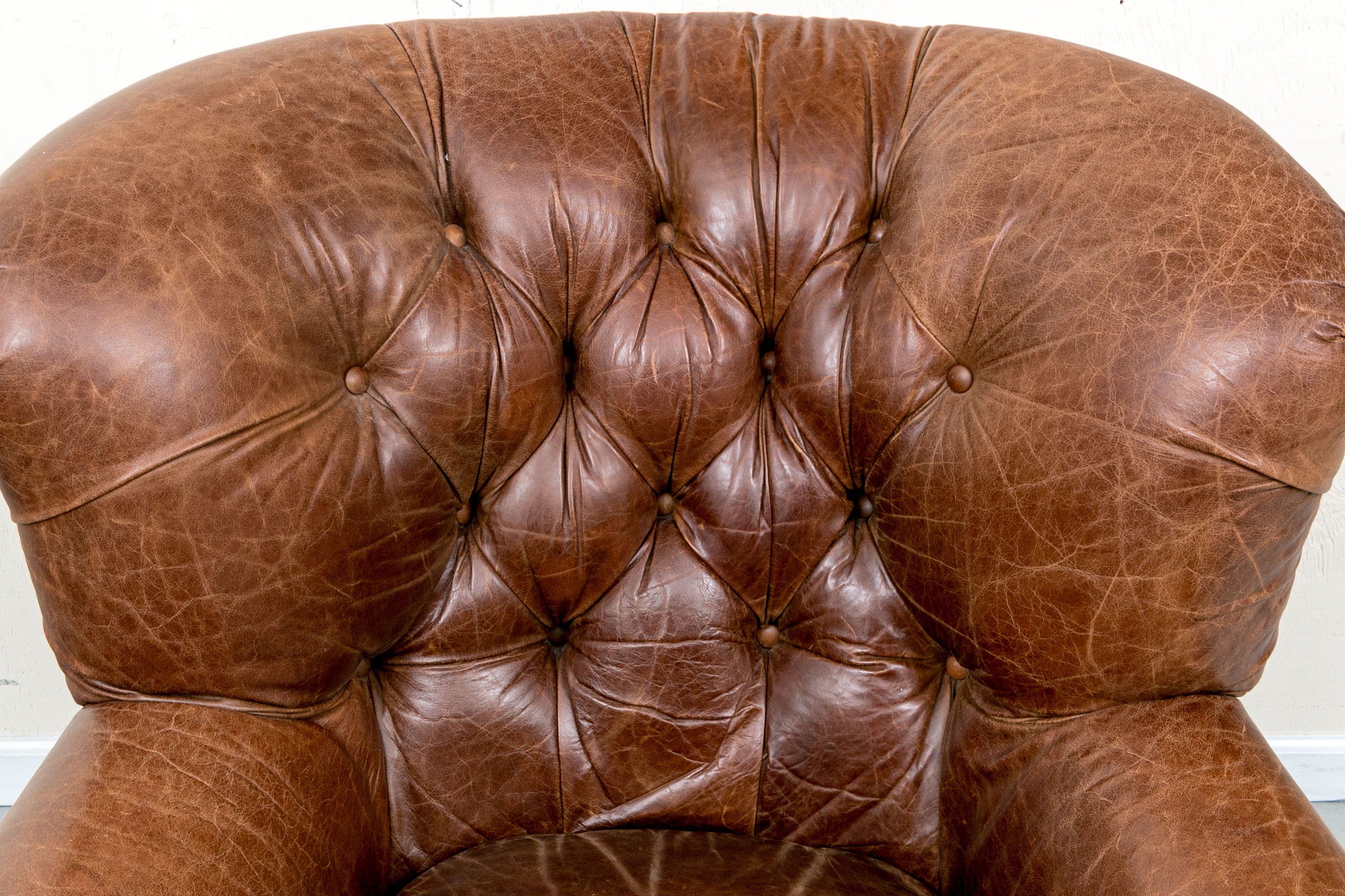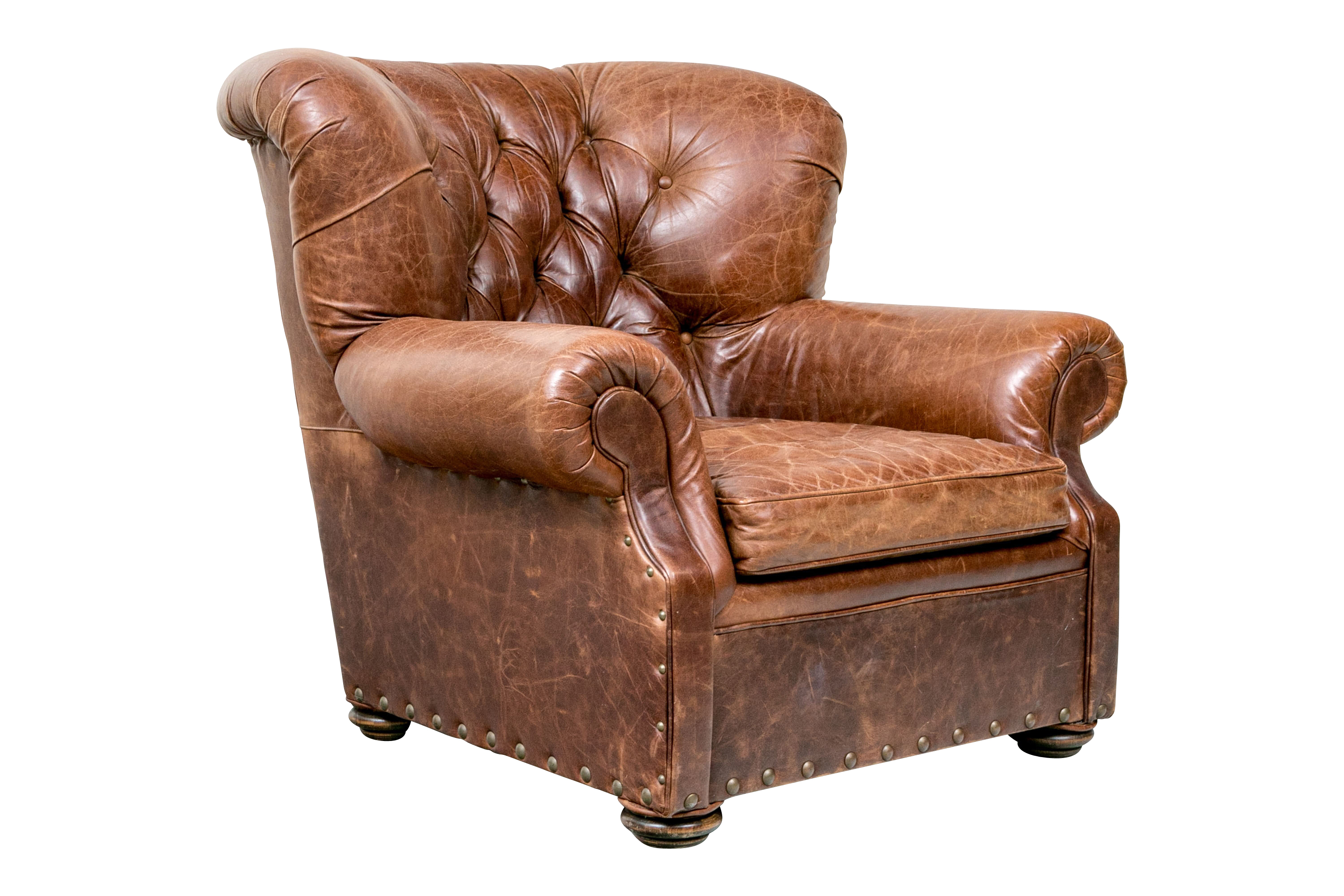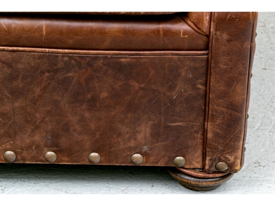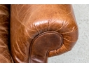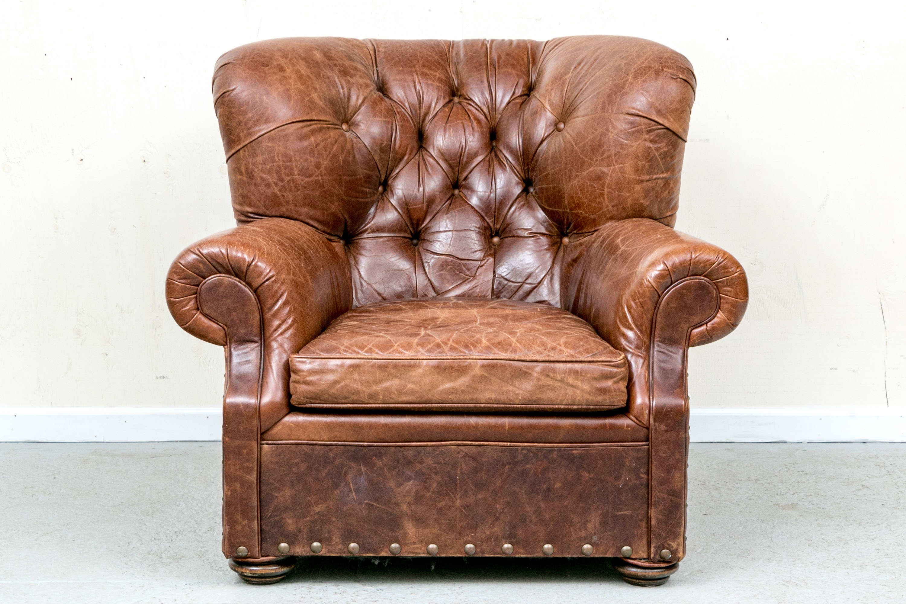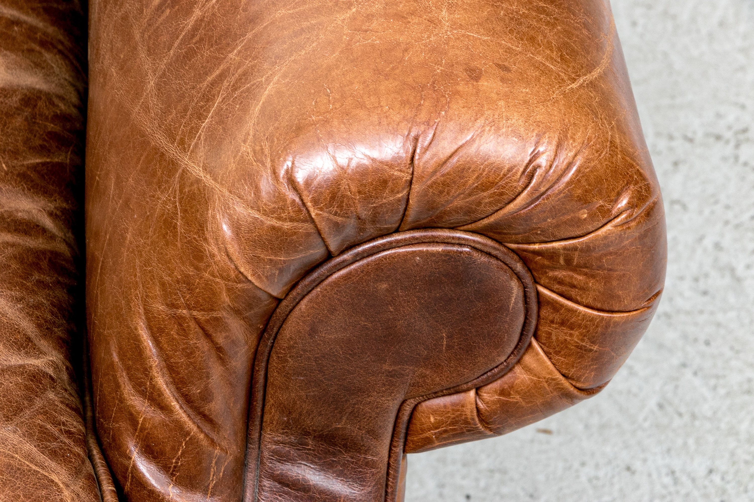 Large and incredibly comfortable Vintage Club chair with tufted button-back, rolled flat-panel arms, oversized nail-head base and frame trim and warm butter soft leather with a great age patina.