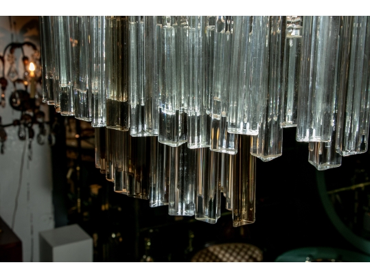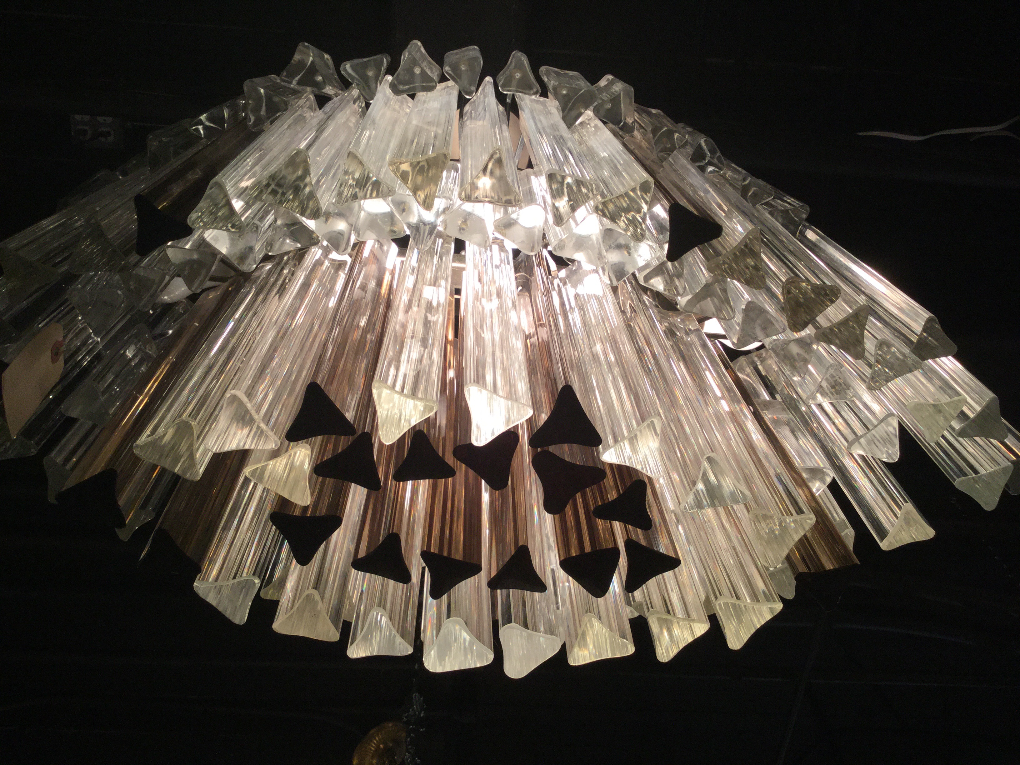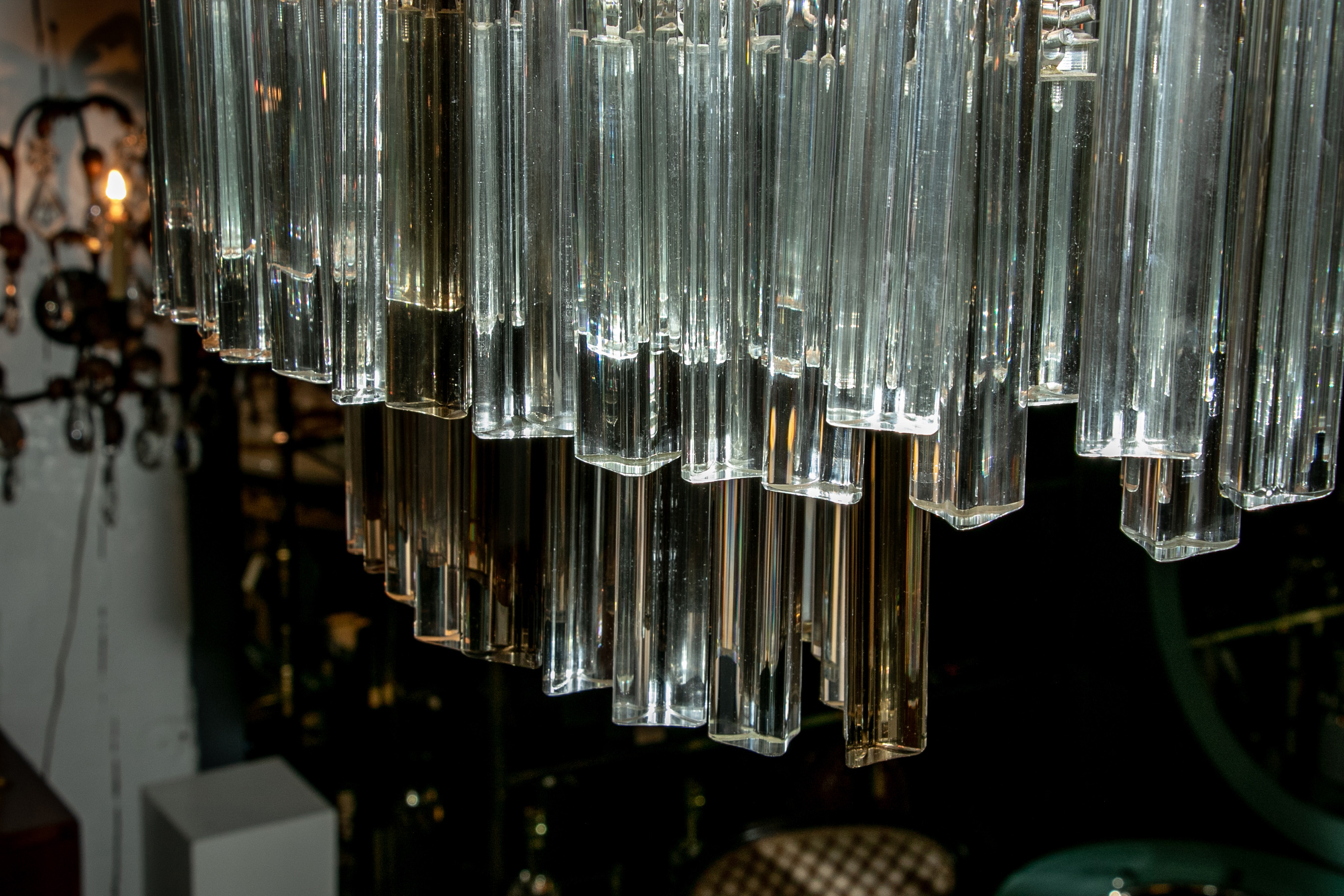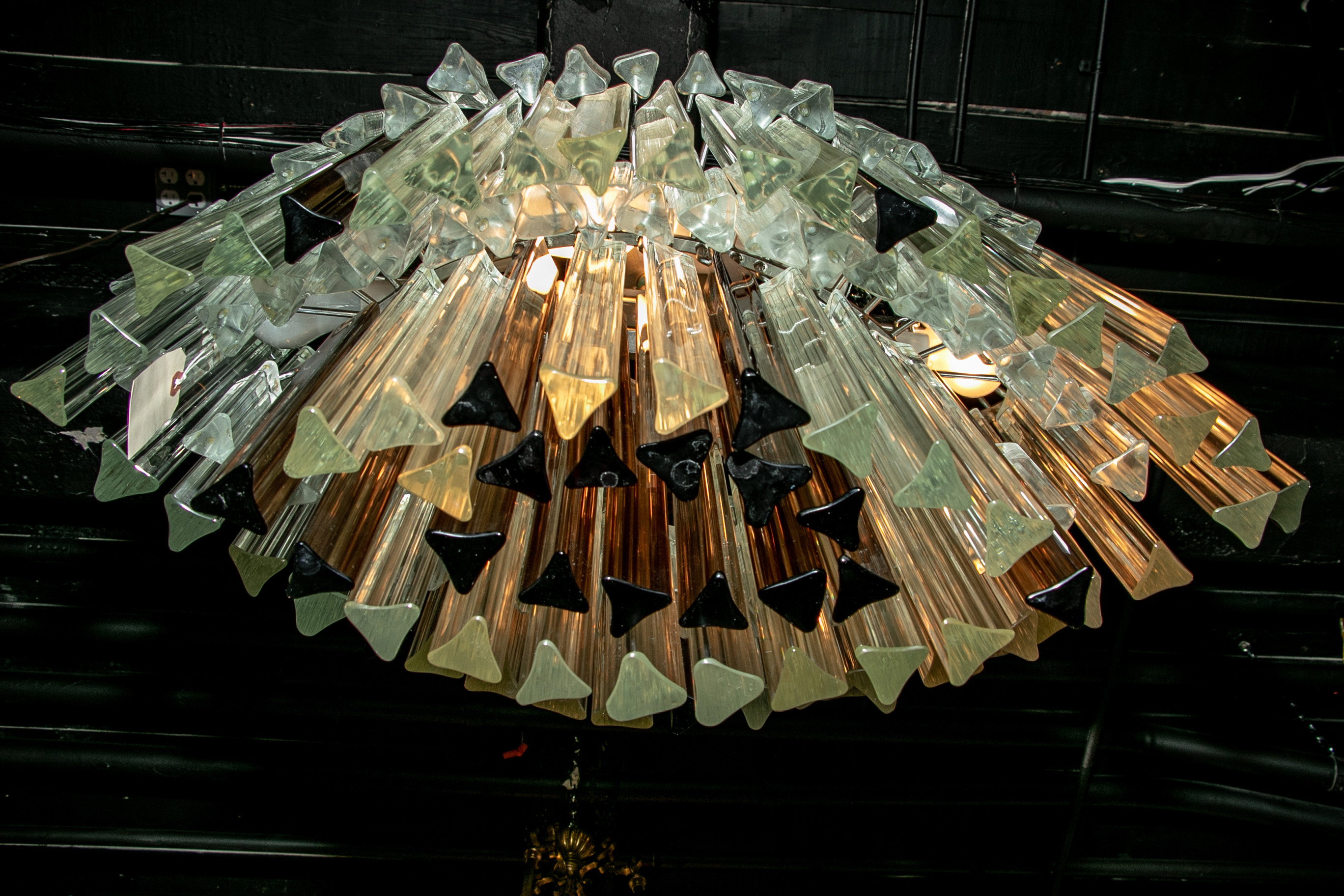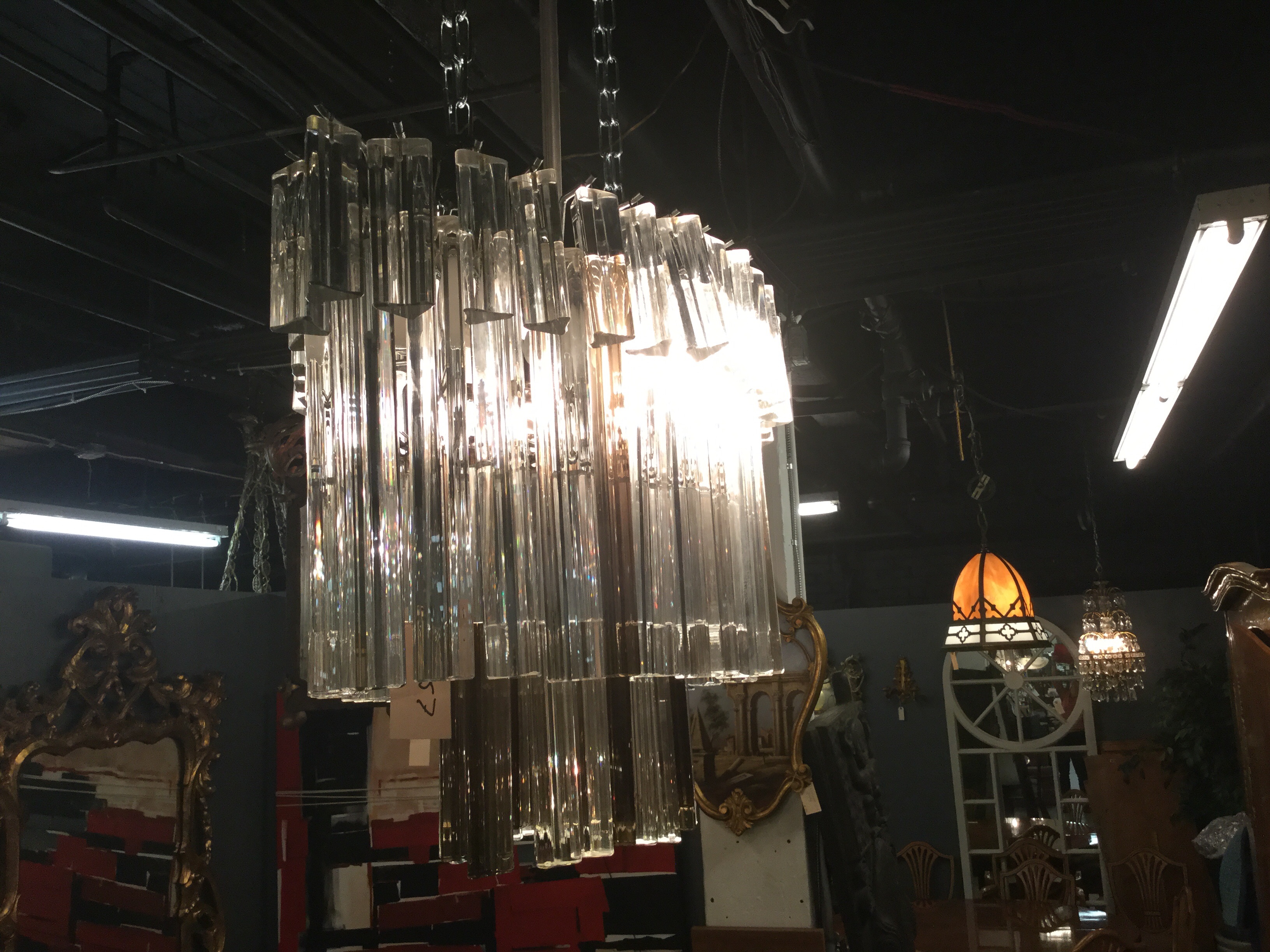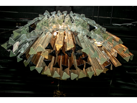 Clear and amber glass triangular prisms. Silver-tone metal construction with six bulb sockets. Good condition.
