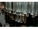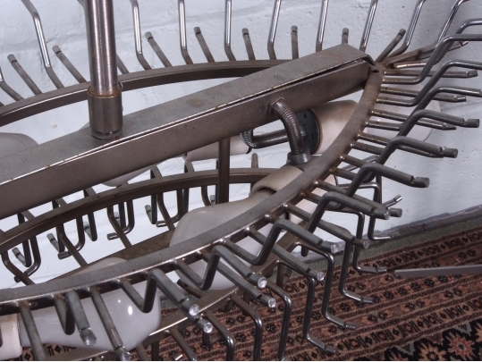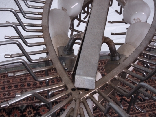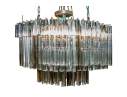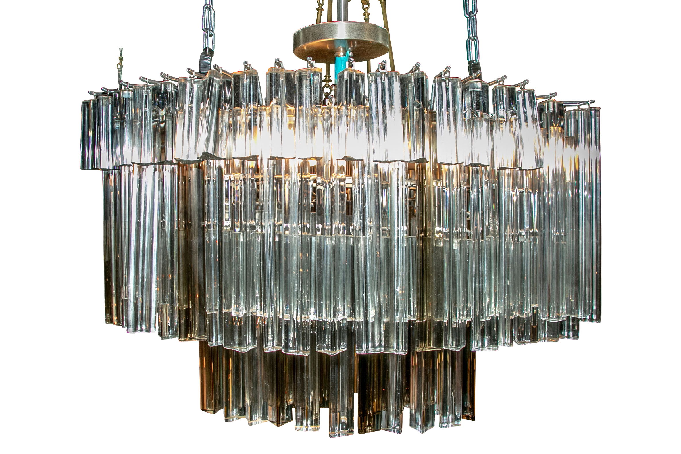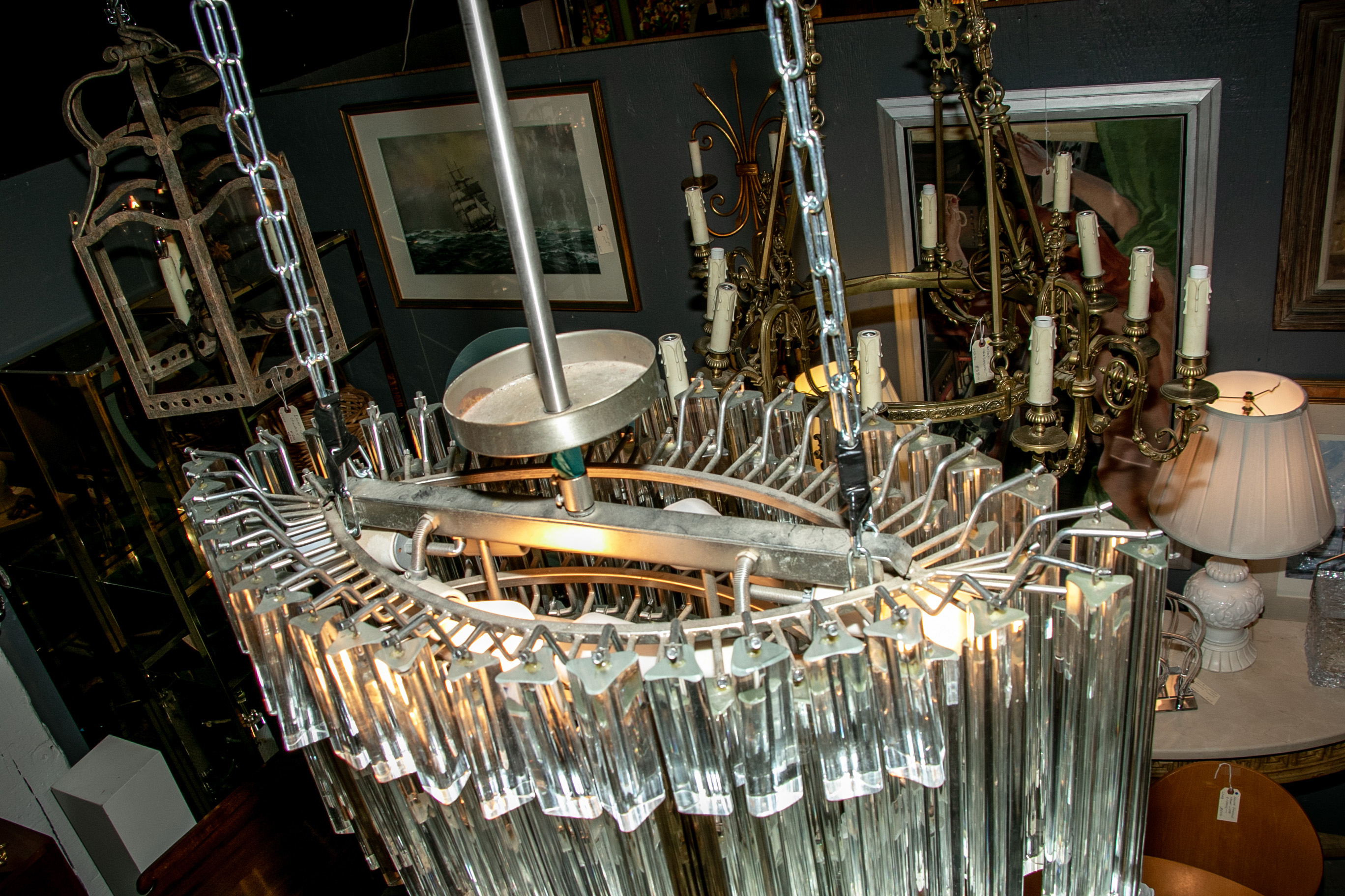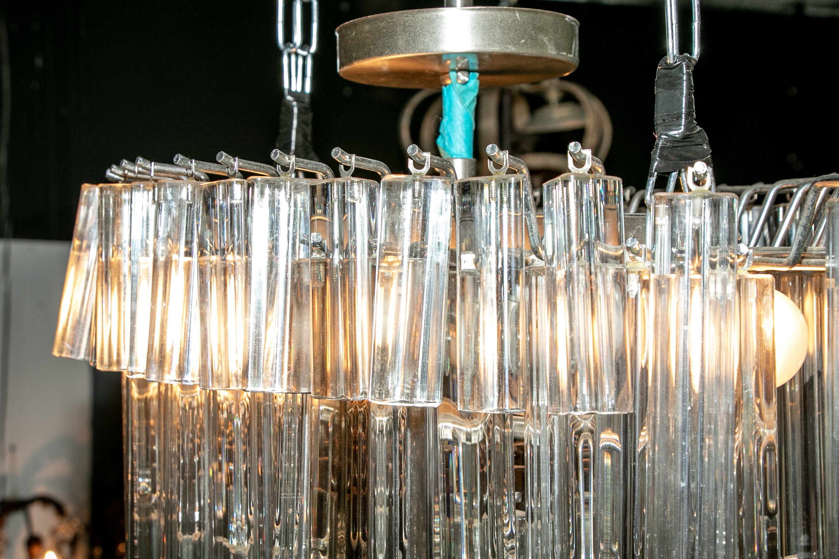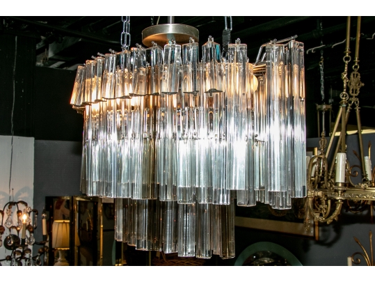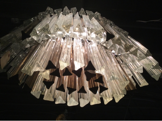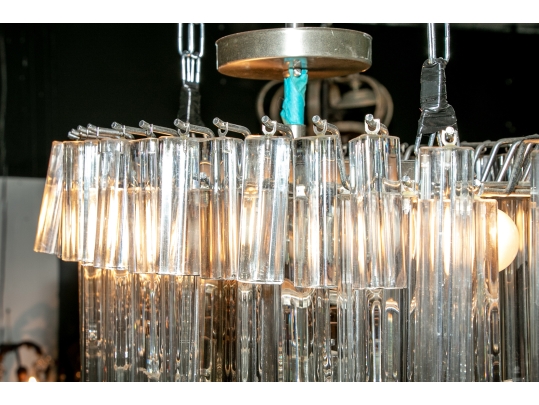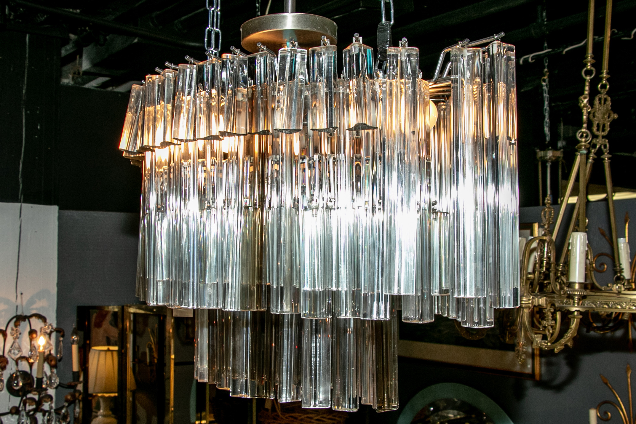 Clear and amber glass triangular prisms. Silver-tone metal construction with six bulb sockets. Good condition.