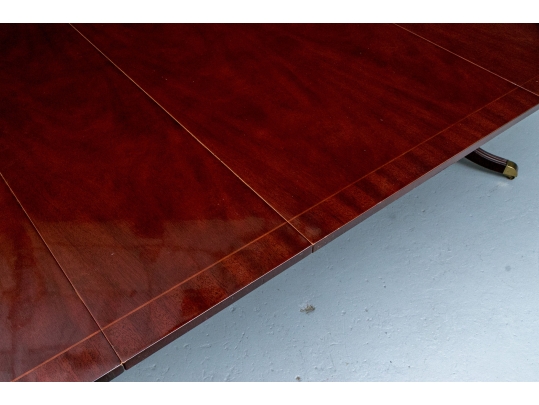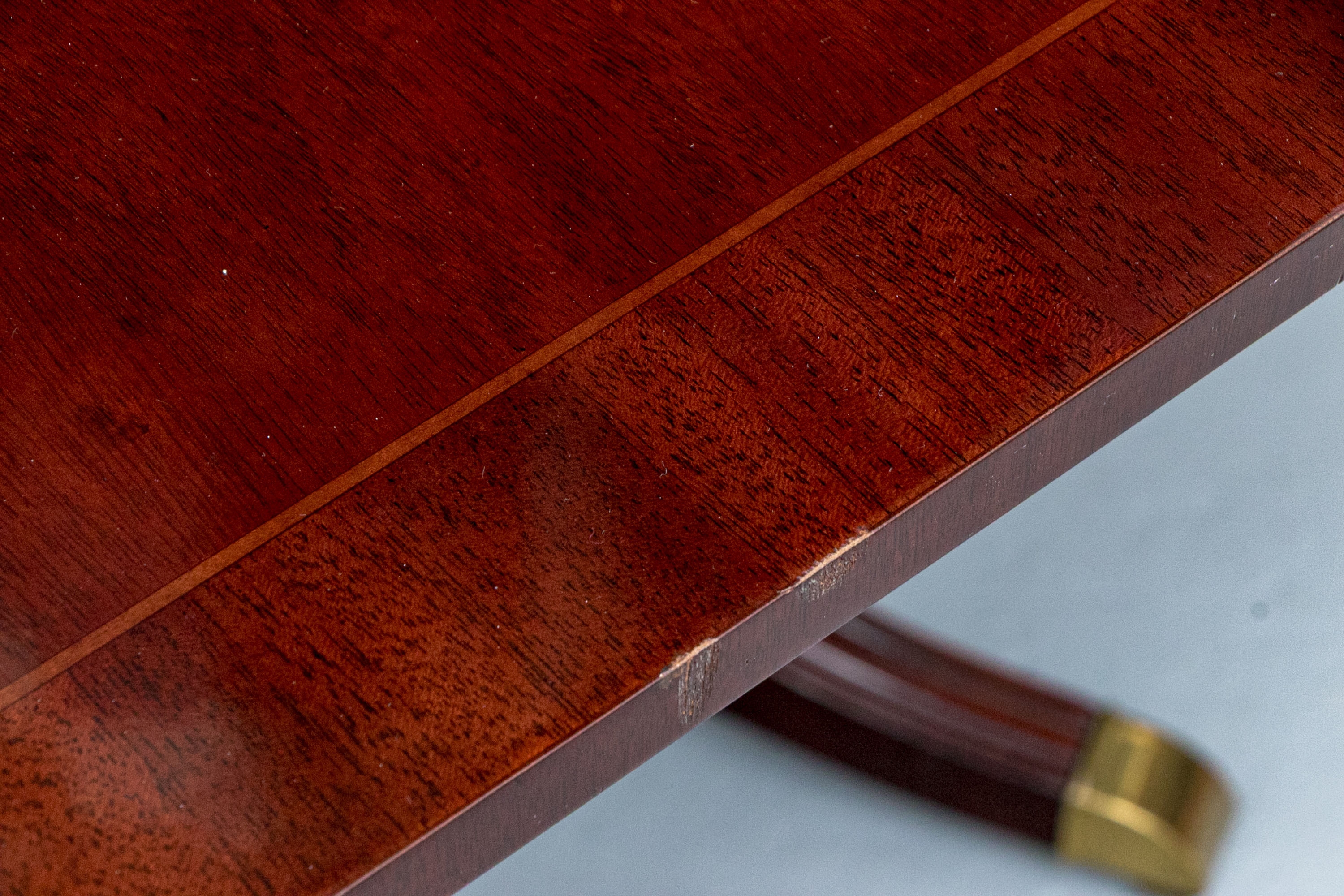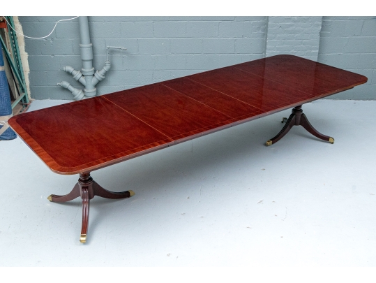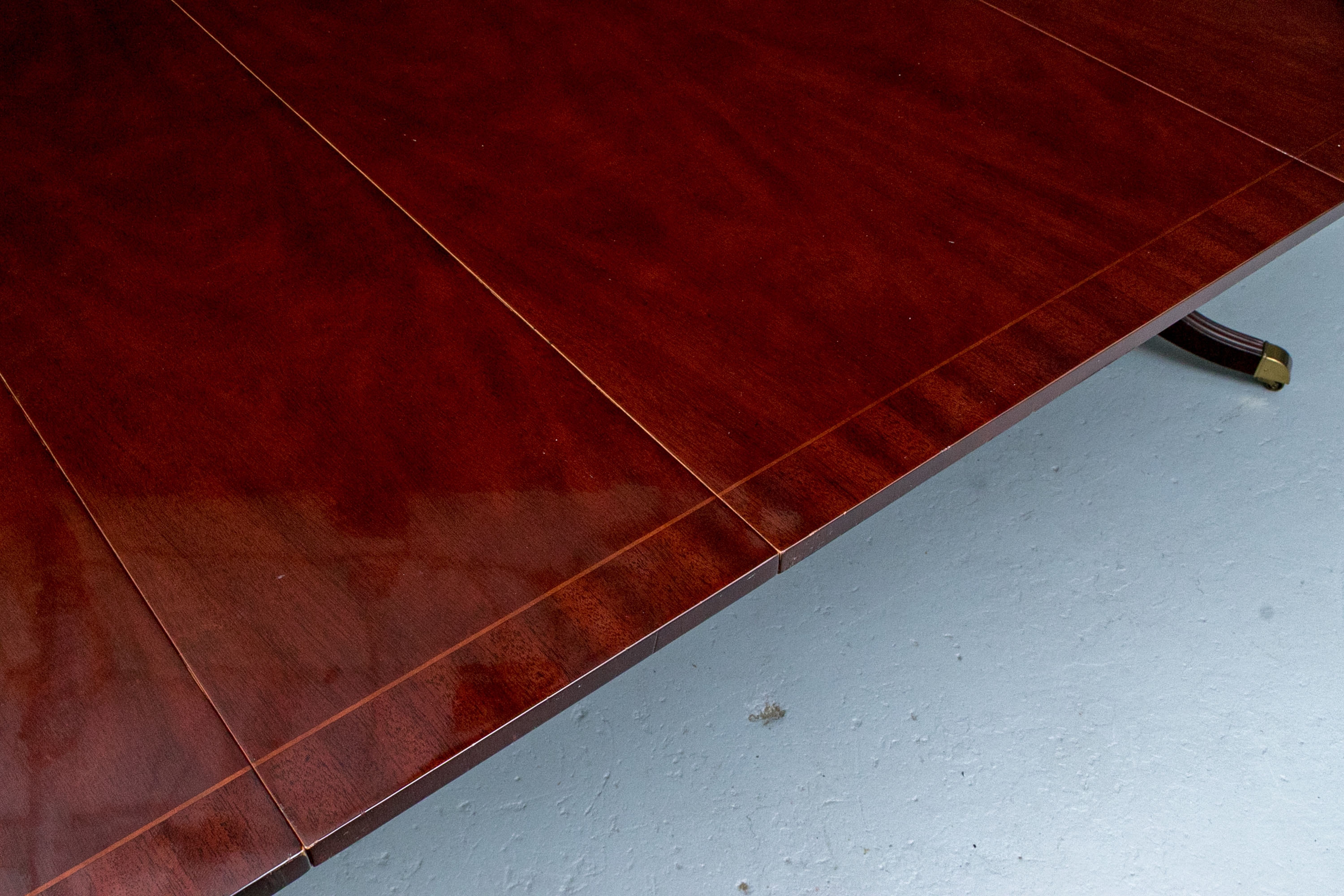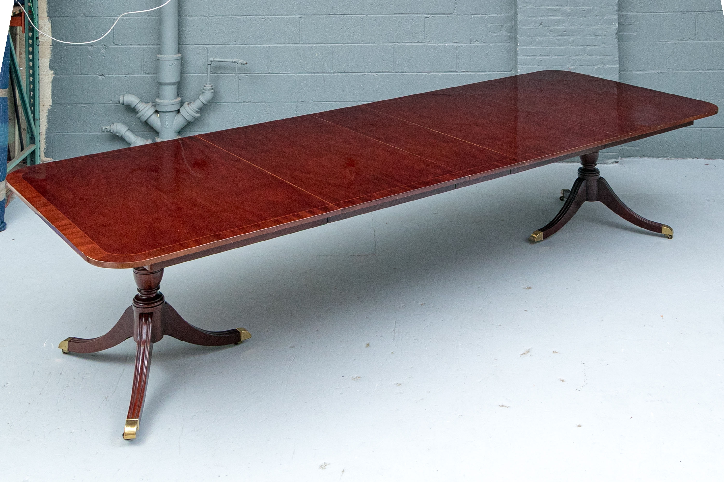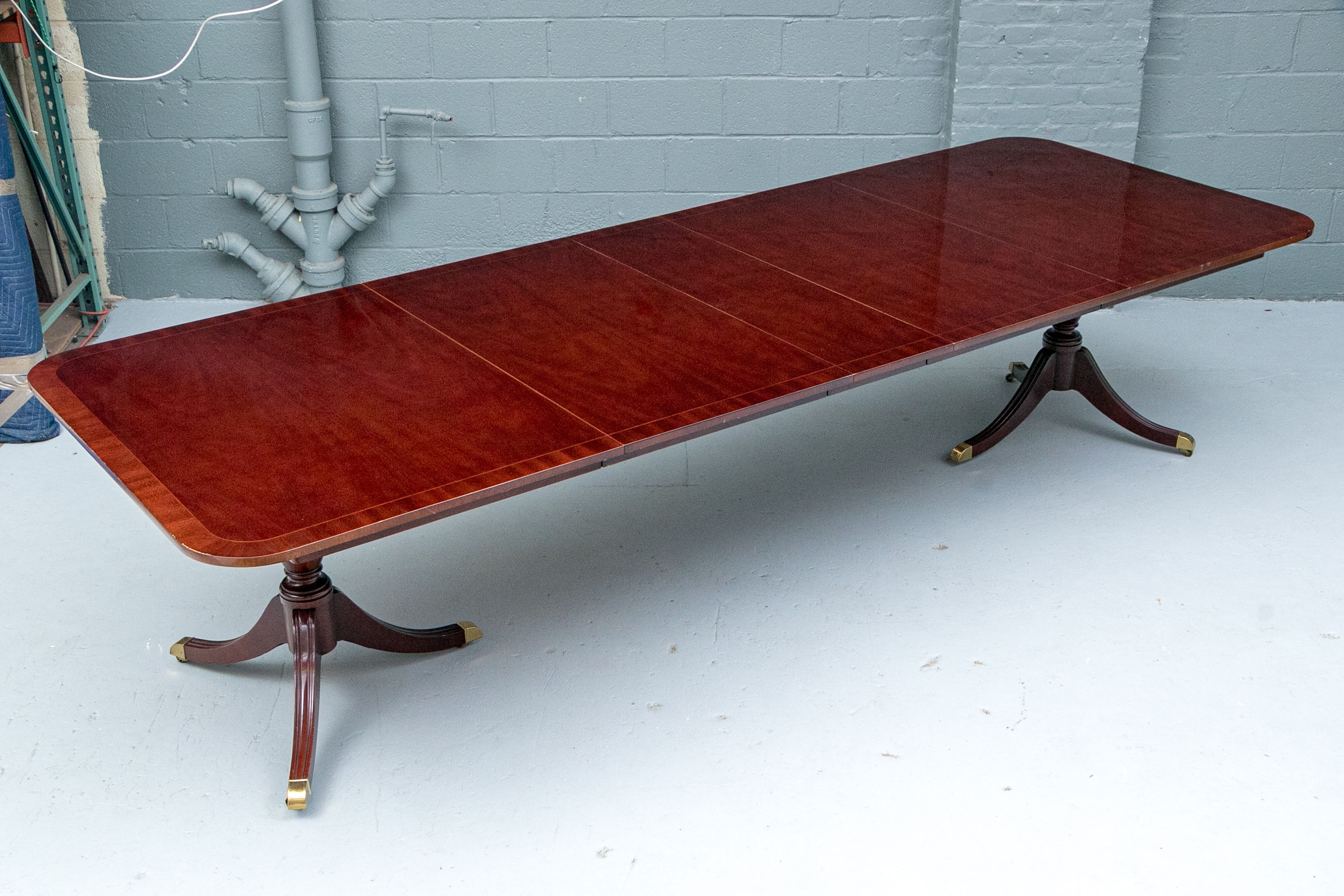 A well crafted Kindel banded mahogany twin pedestal dining table with refined Satinwood line inlay on the top. Large size capability with three extension leaves including two 24" leaves and one 12" leaf. The Urn Form base is well turned with deeply Reeded legs and polished brass caps with castors.
