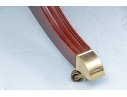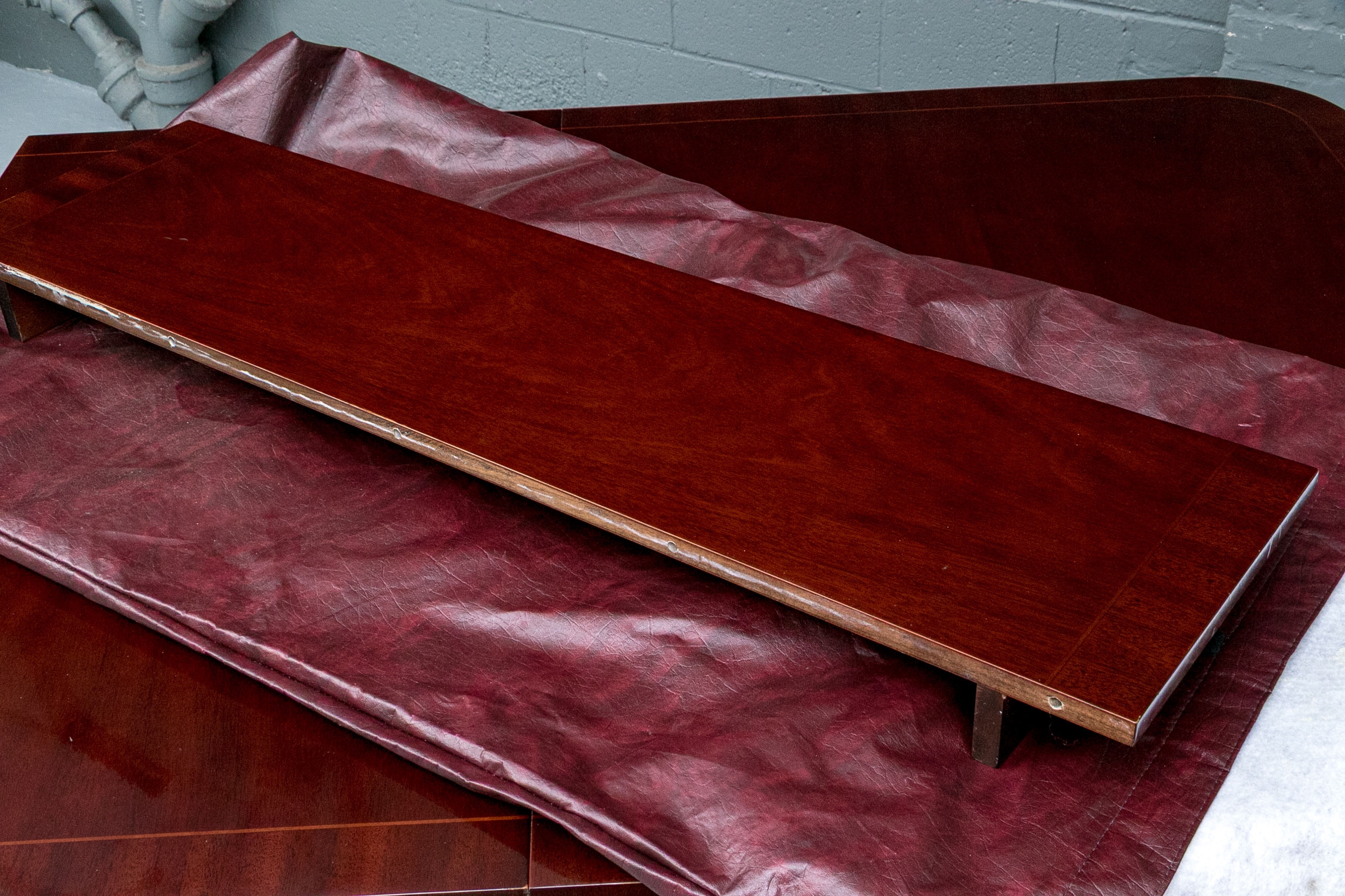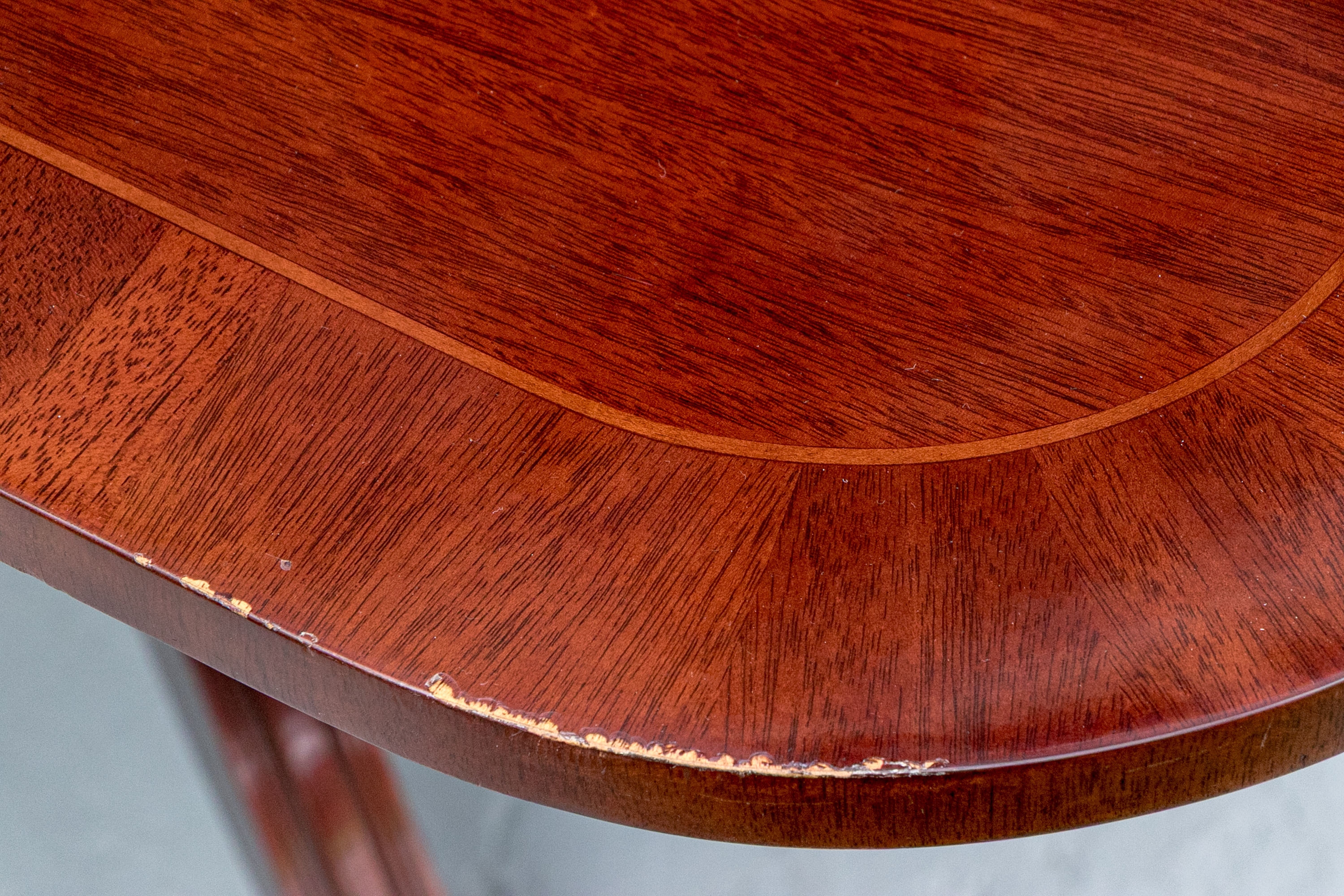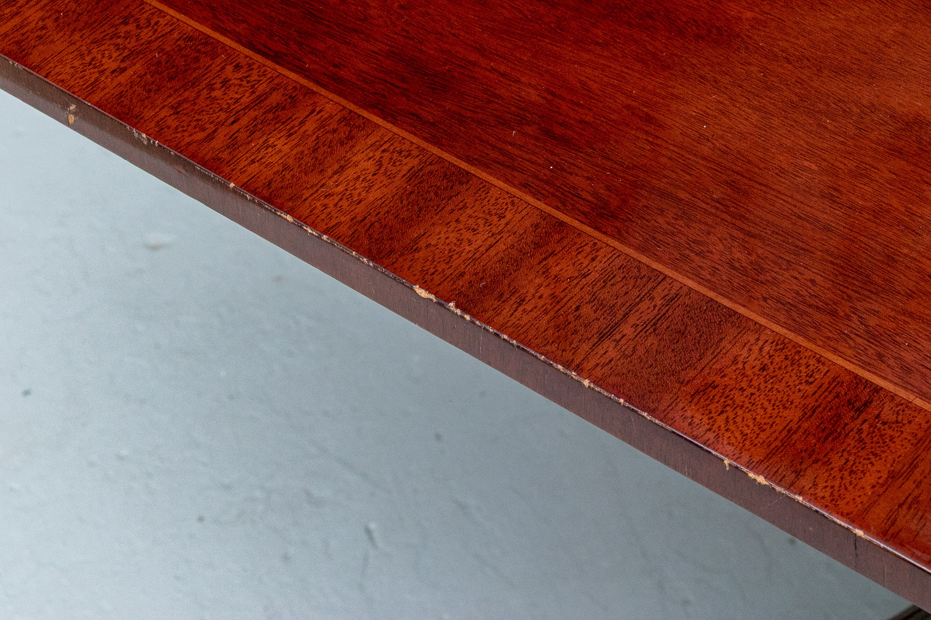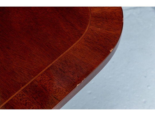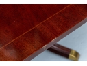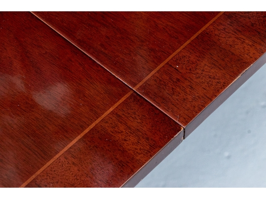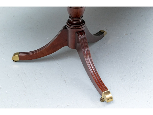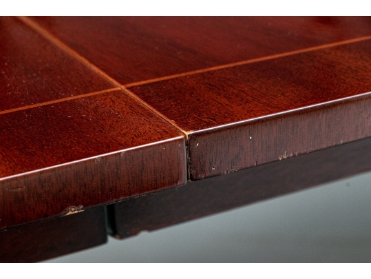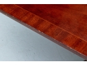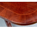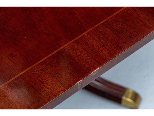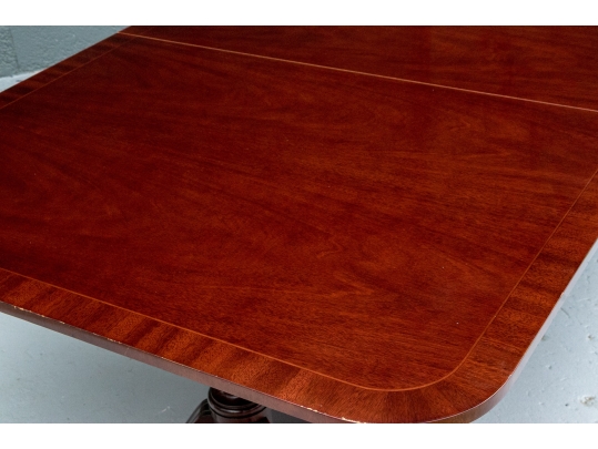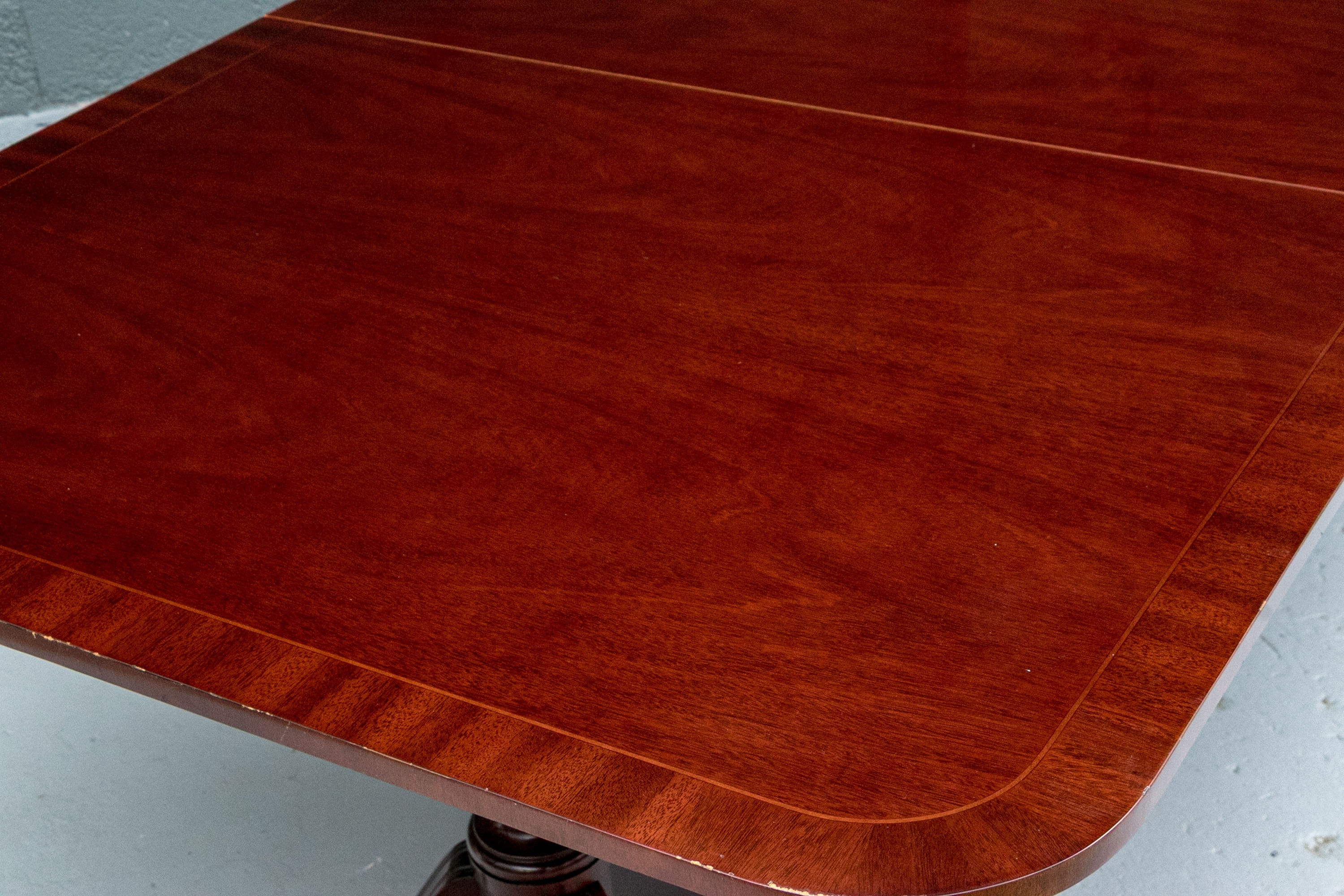 A well crafted Kindel banded mahogany twin pedestal dining table with refined Satinwood line inlay on the top. Large size capability with three extension leaves including two 24" leaves and one 12" leaf. The Urn Form base is well turned with deeply Reeded legs and polished brass caps with castors.