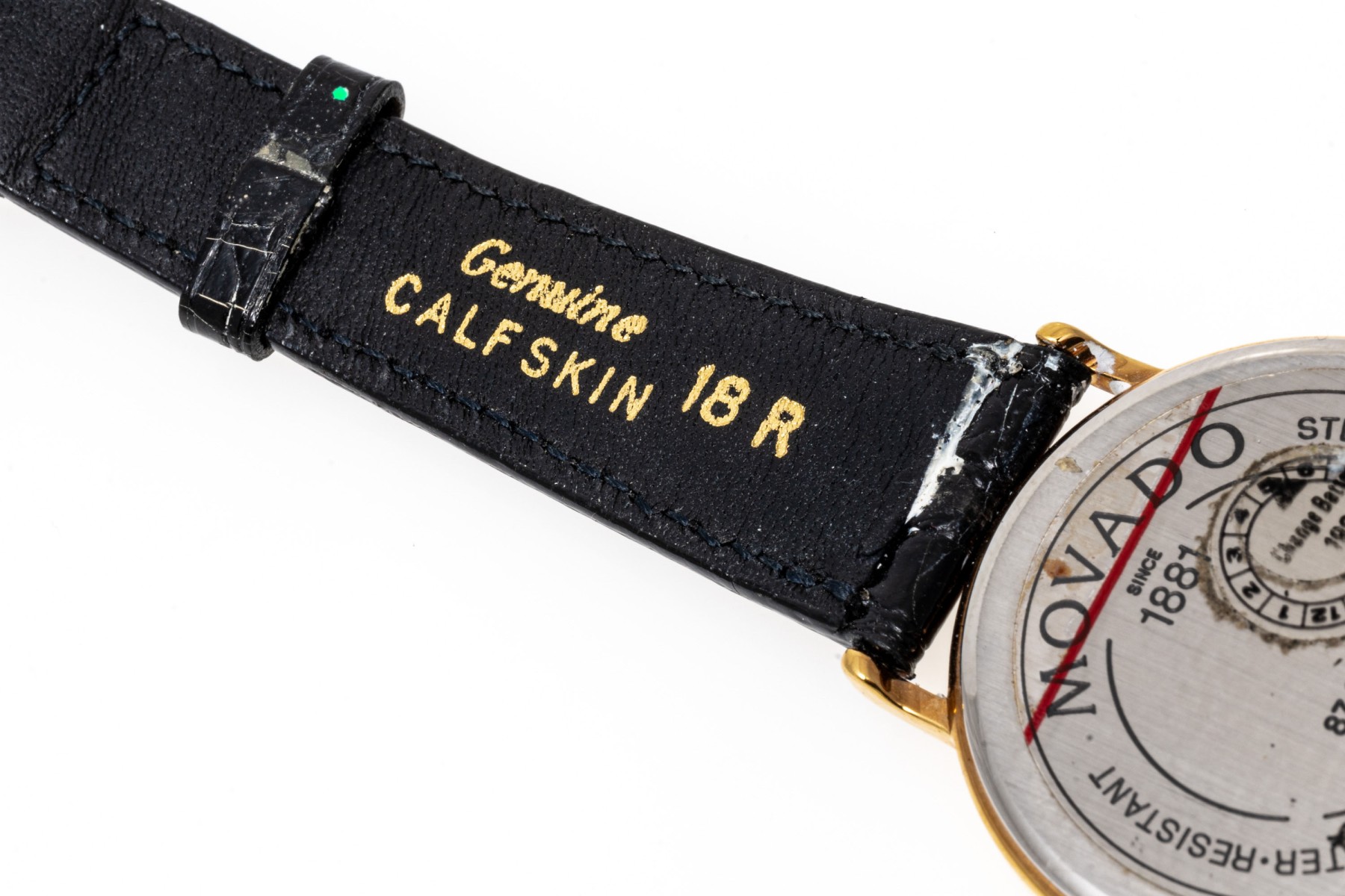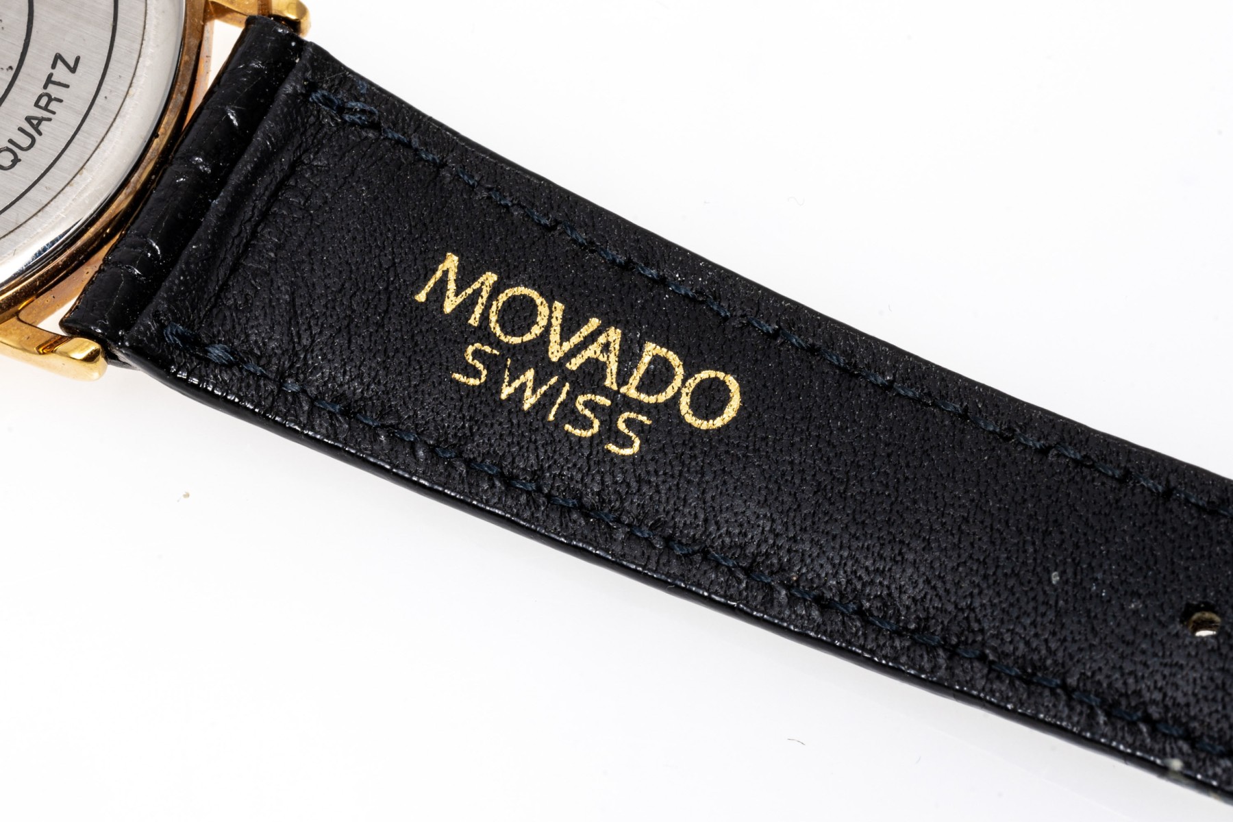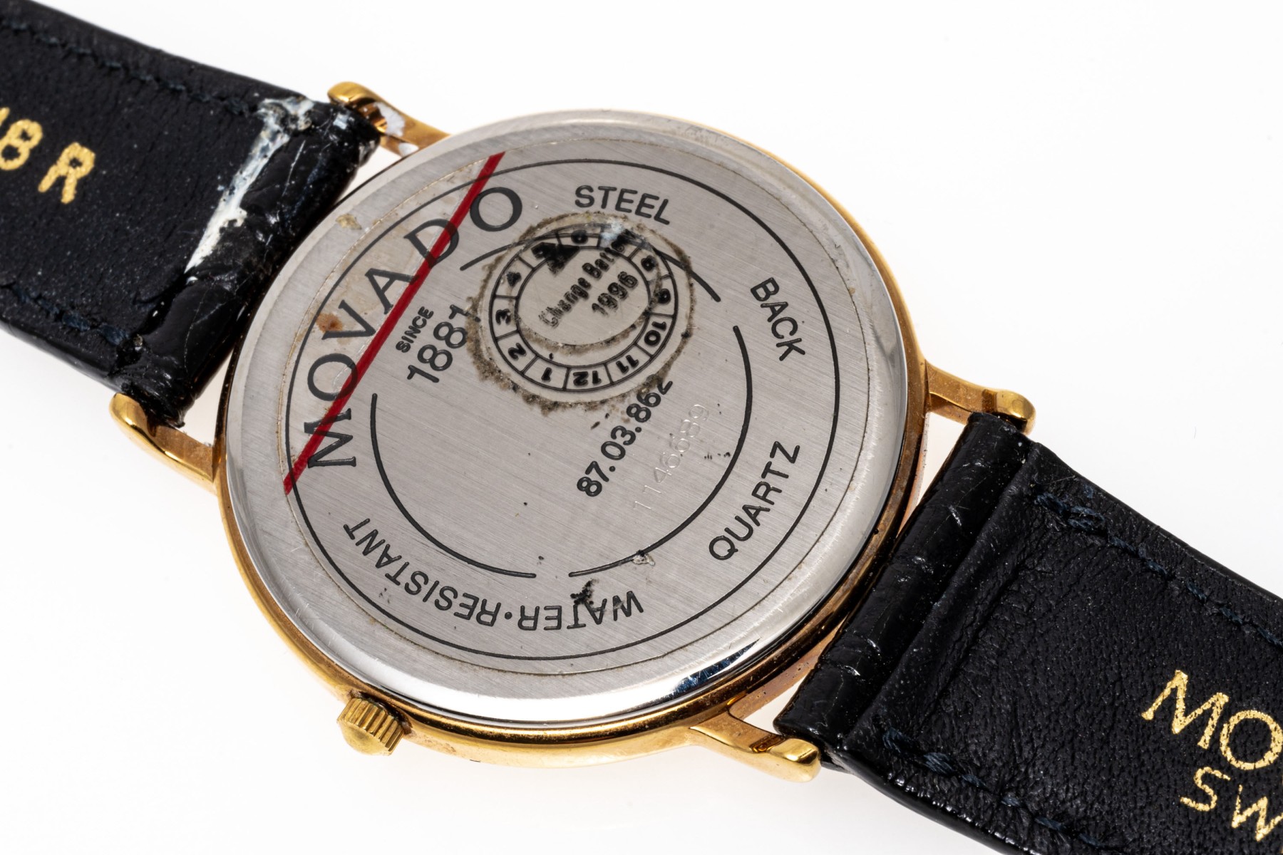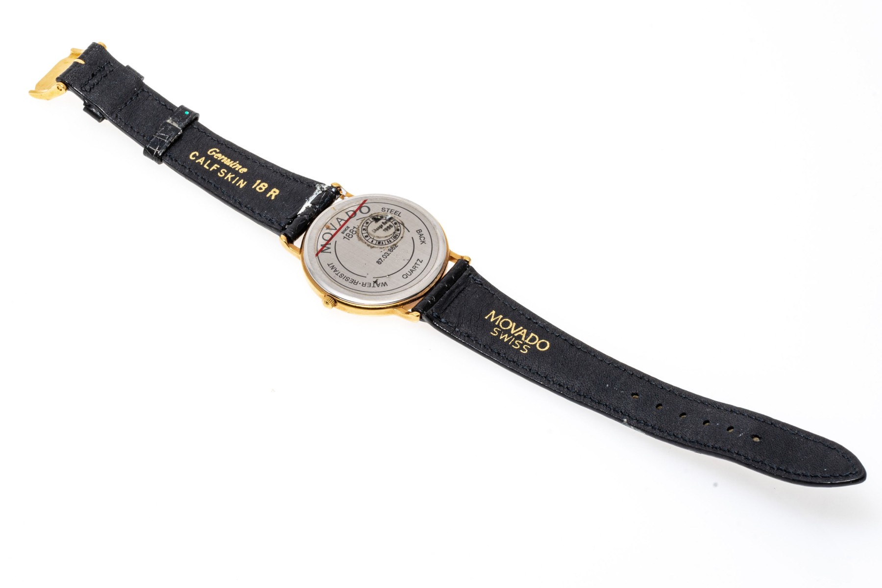 Marks: Movado, Quartz, Water Resistant, Genuine Calfskin.