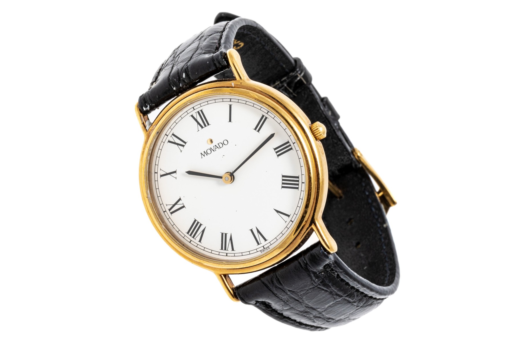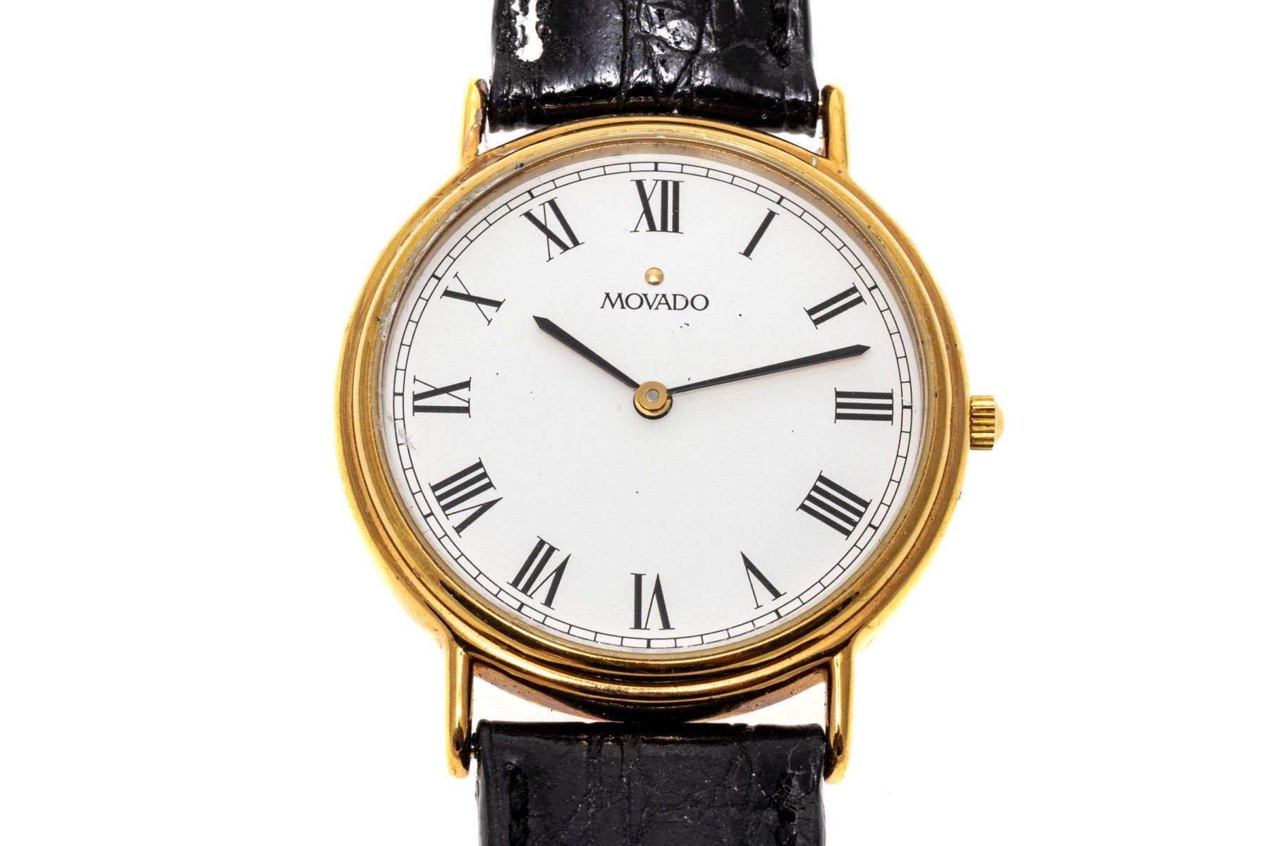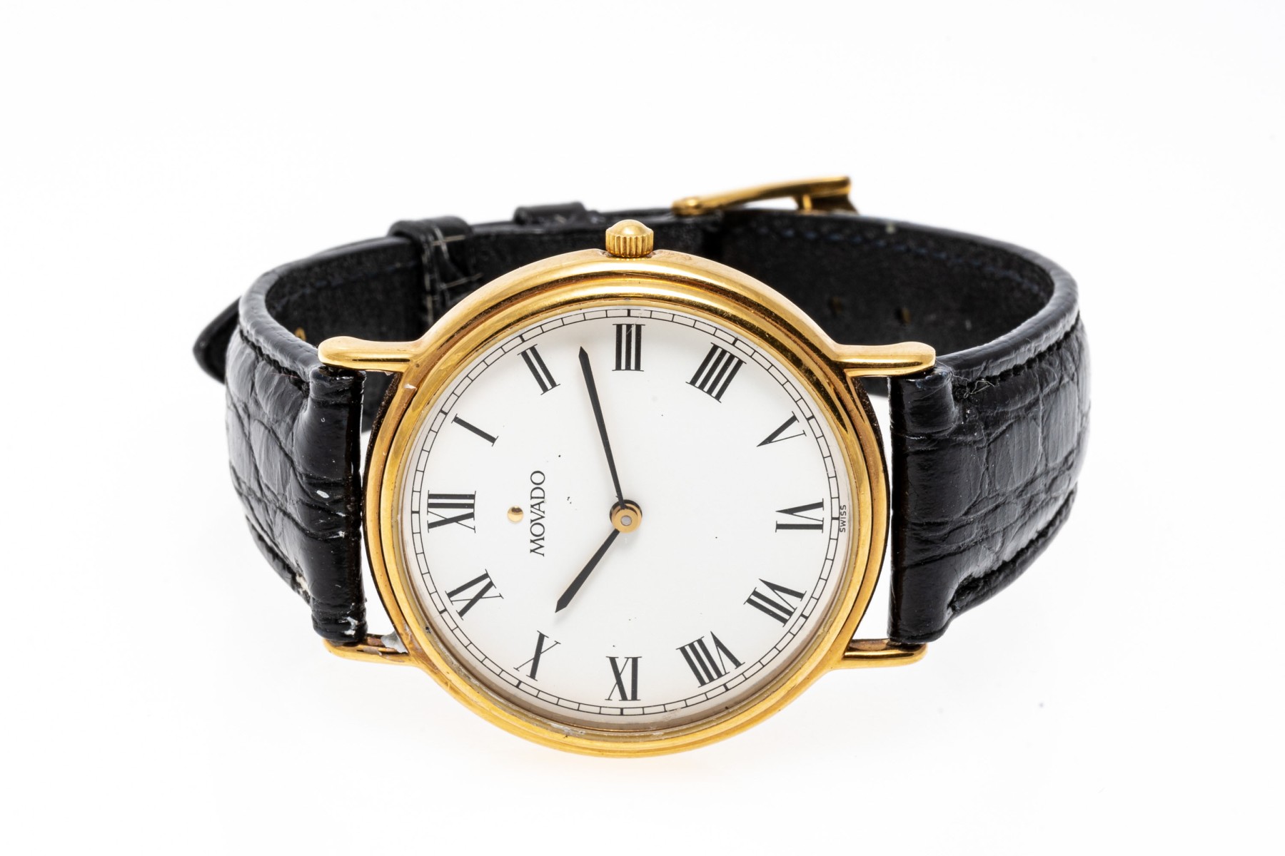 Movado quartz watch. White dial with Roman numeral indices, hour and minute hands. Black leather strap with buckle clasp.