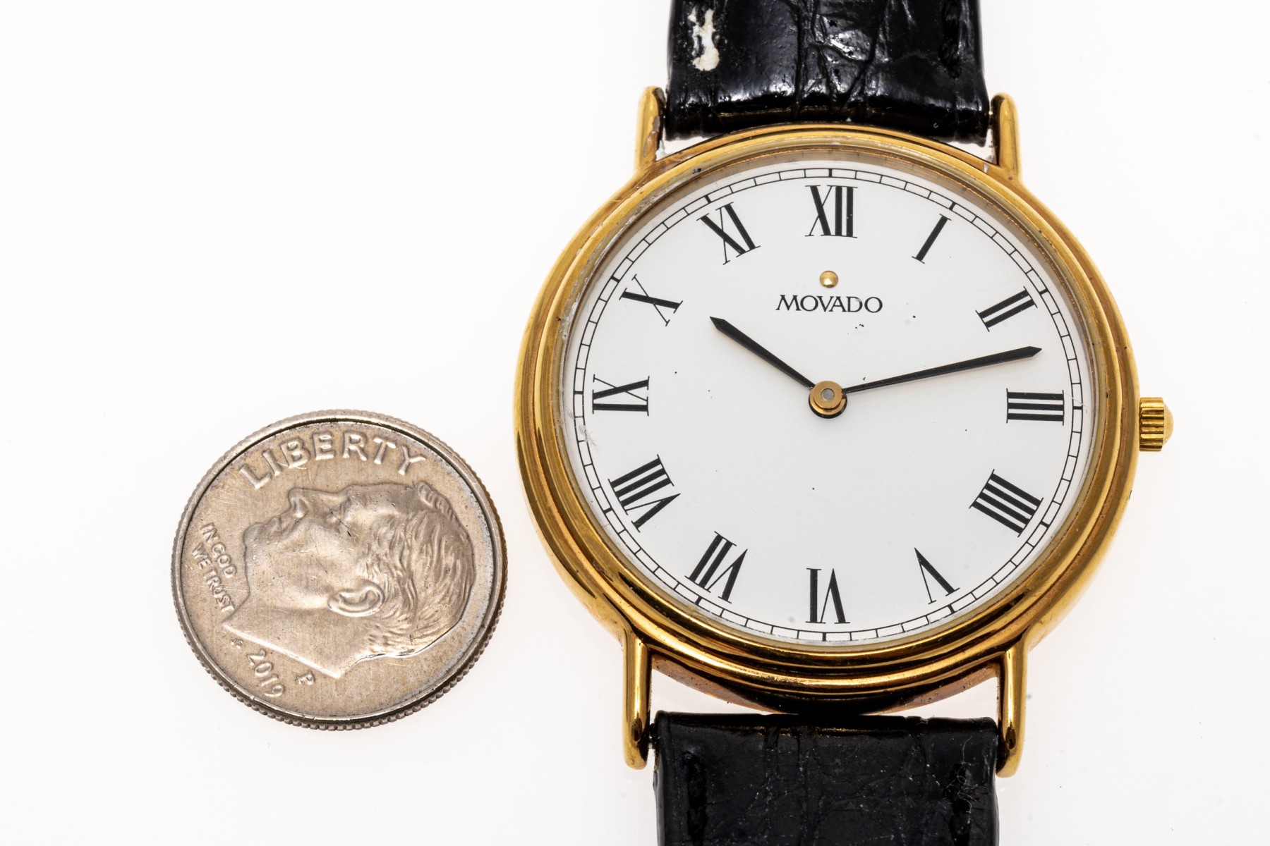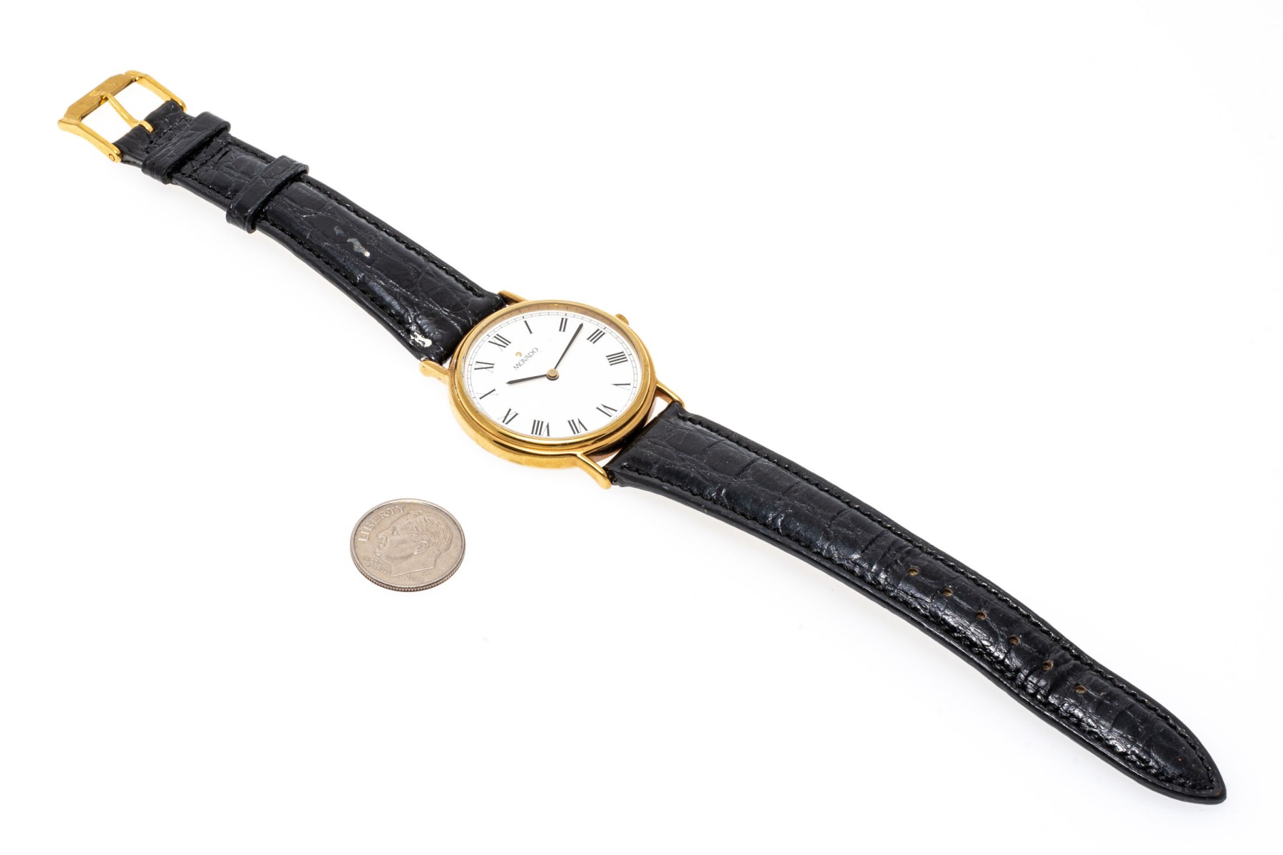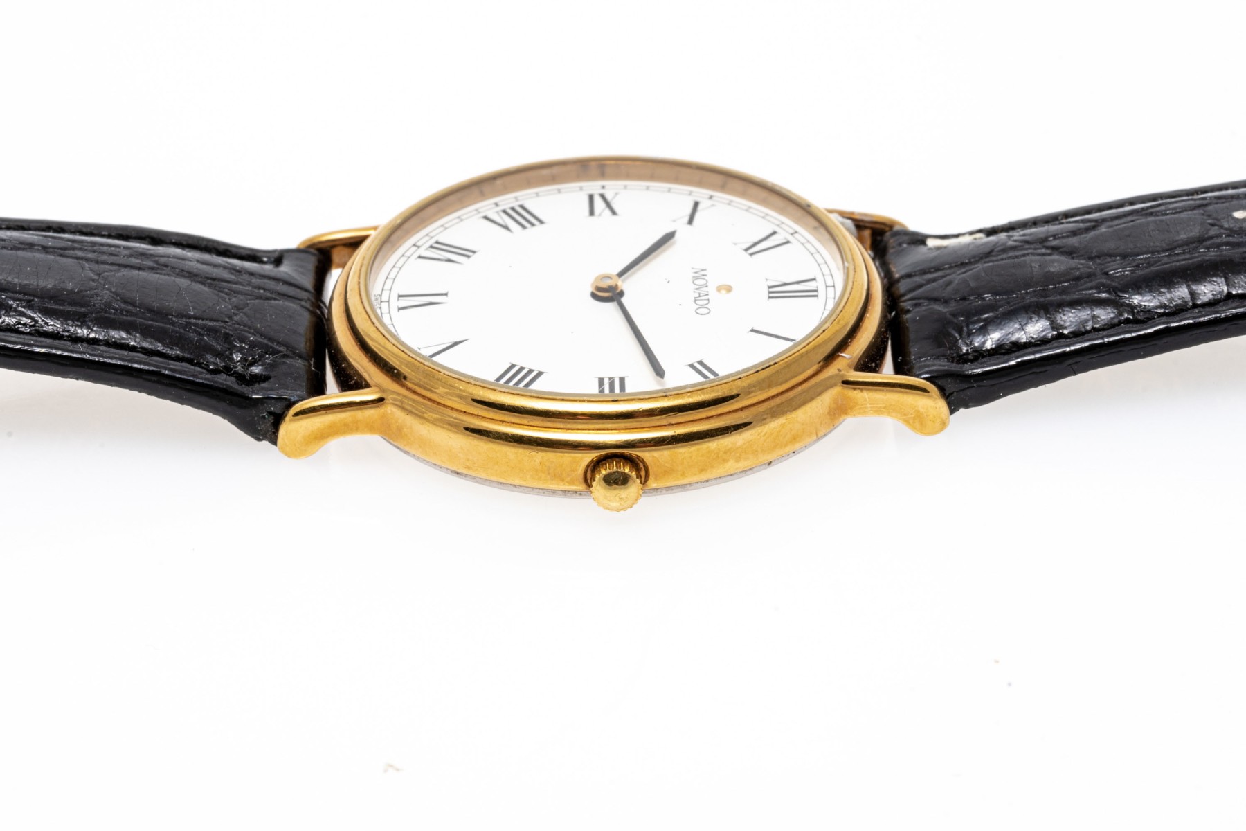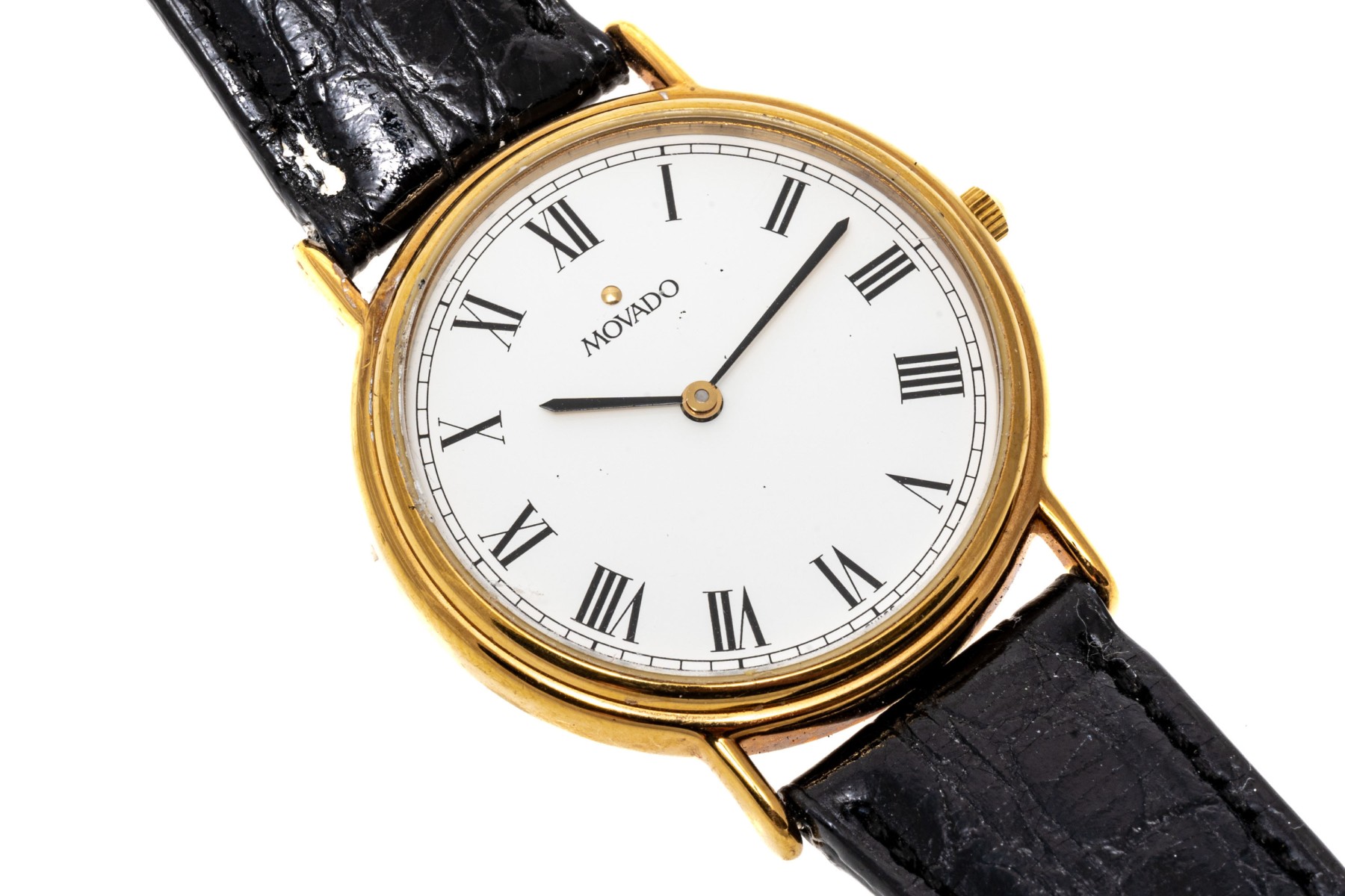 Movado quartz watch. White dial with Roman numeral indices, hour and minute hands. Black leather strap with buckle clasp.