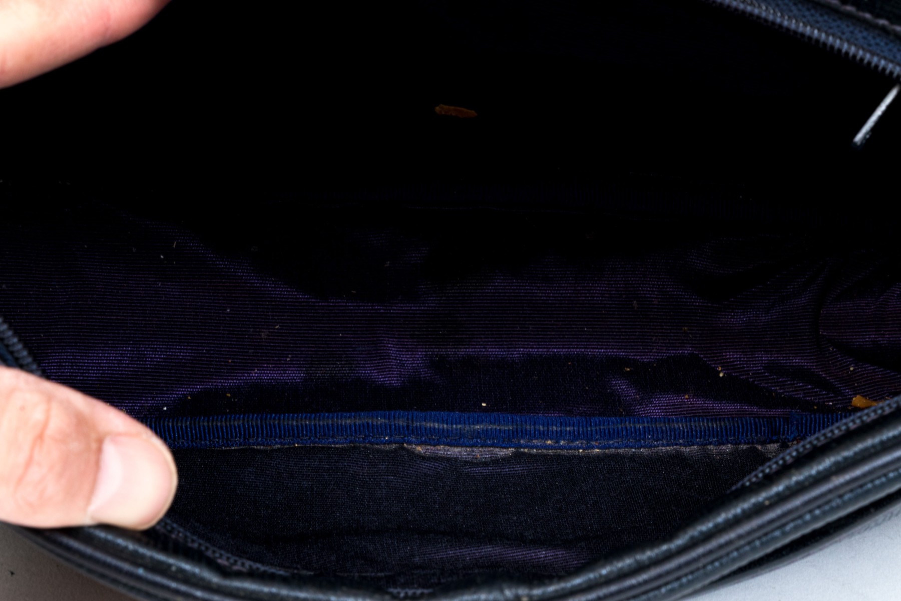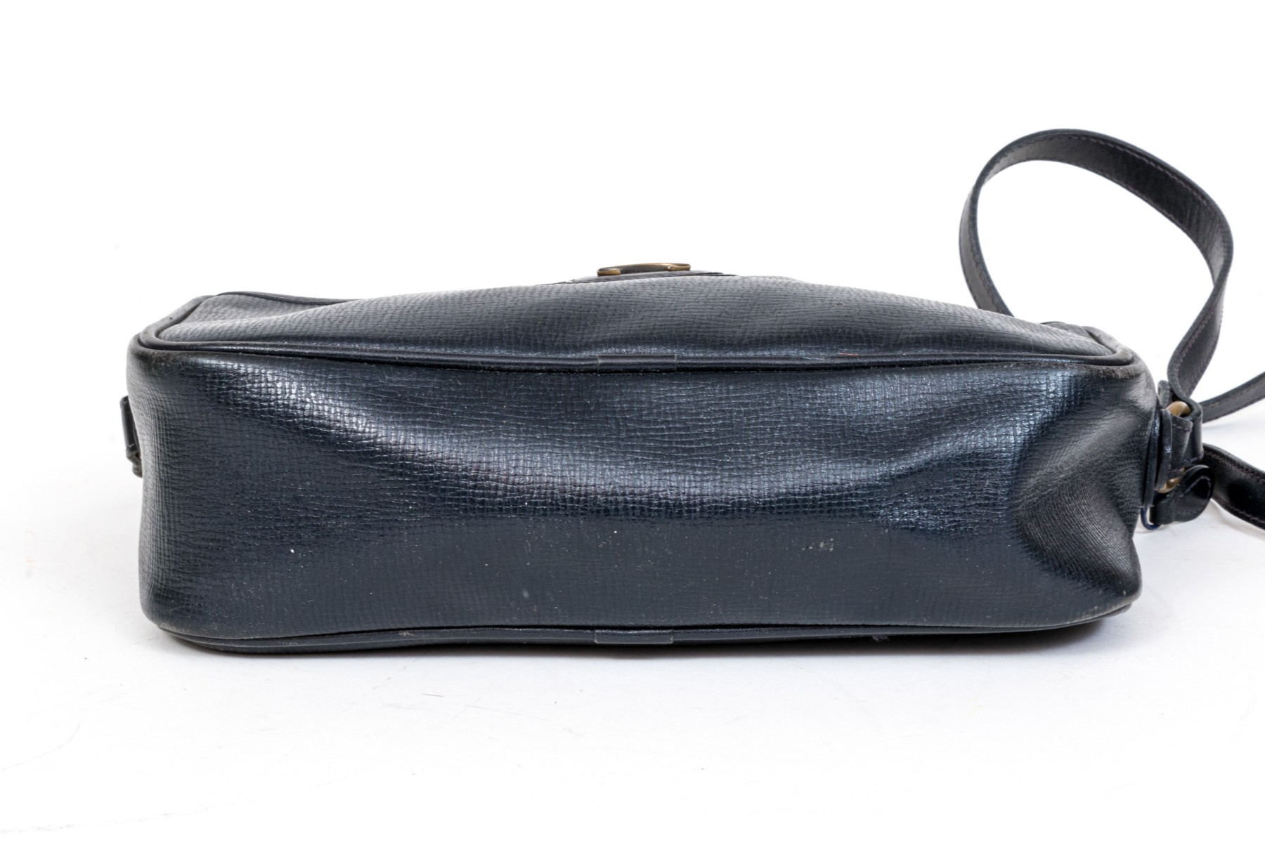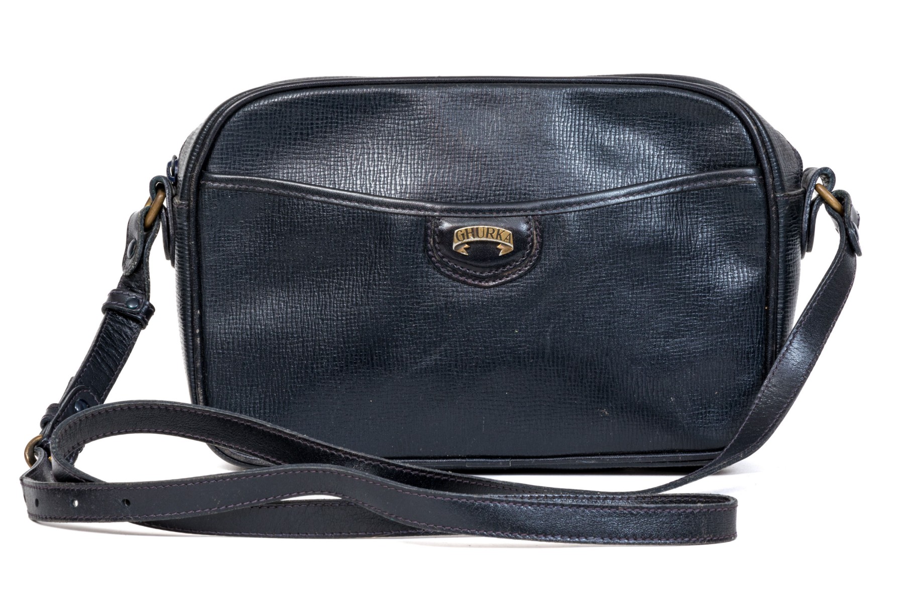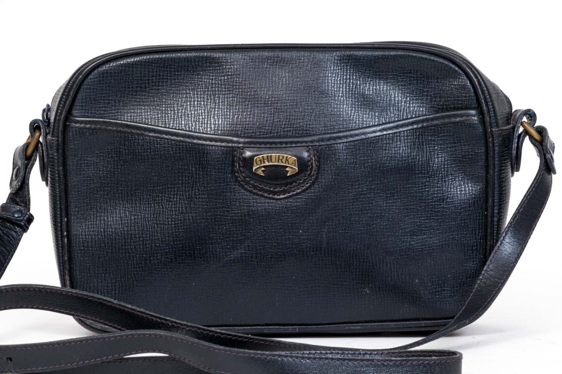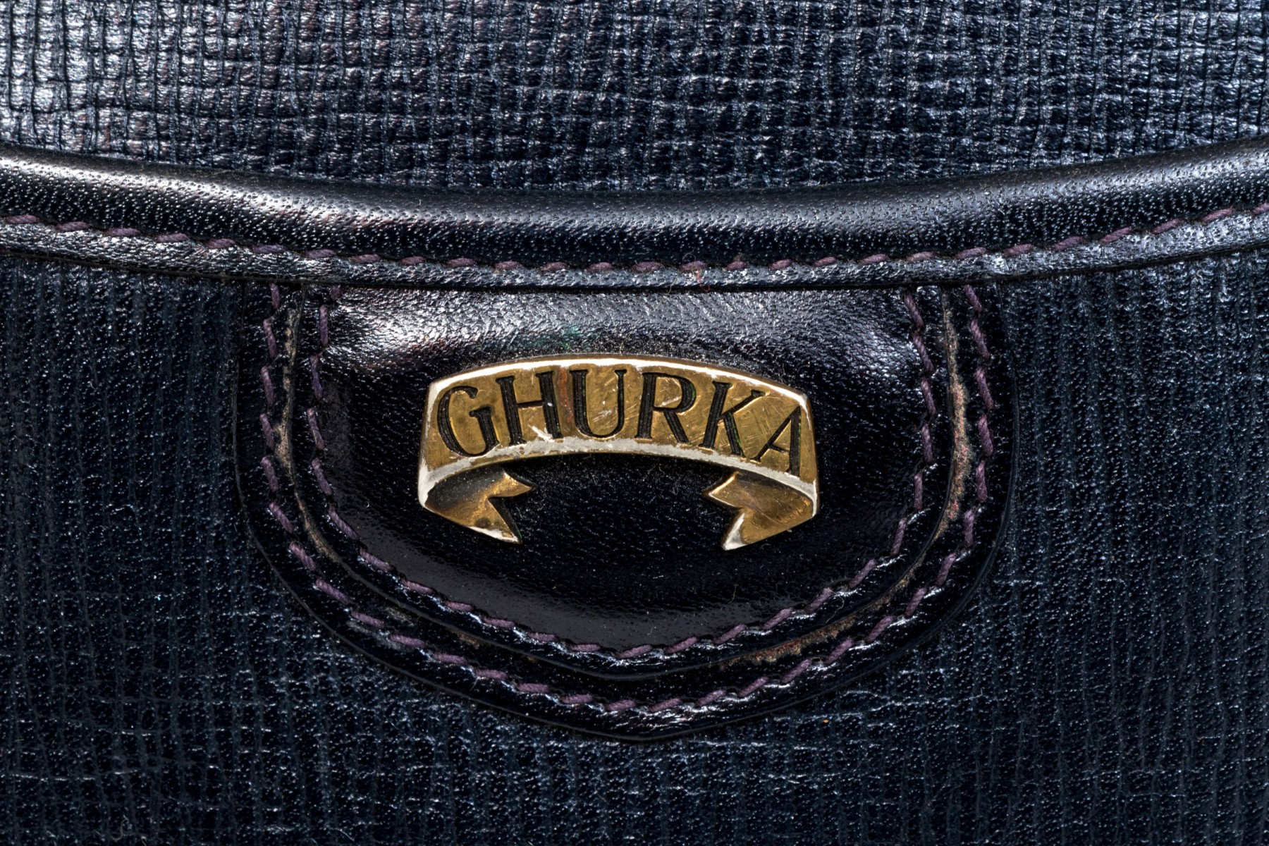 Navy blue Ghurka shoulder bag with zipper closure and exterior side pocket. Blue inner with interior pocket. With the bag is a small charm.