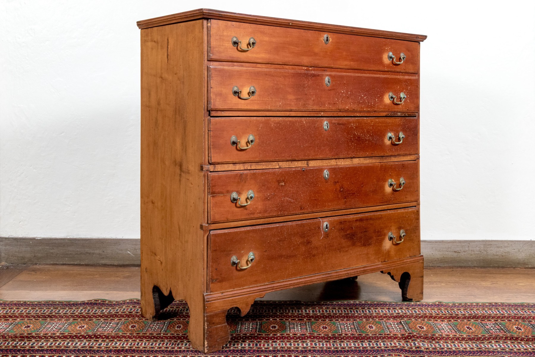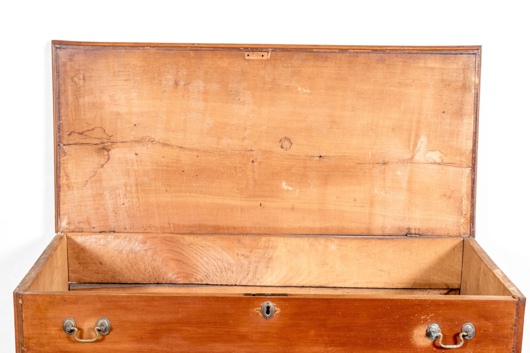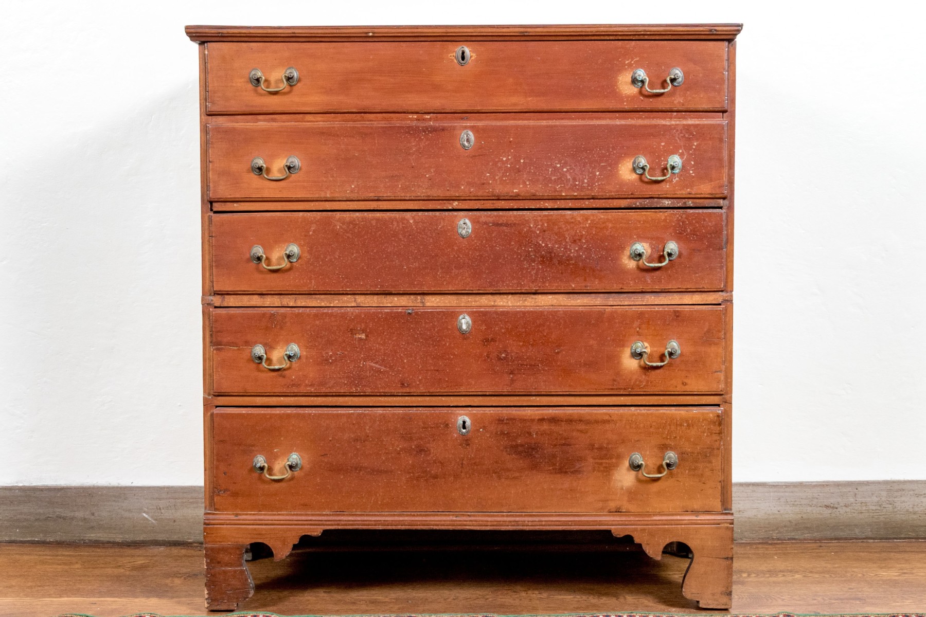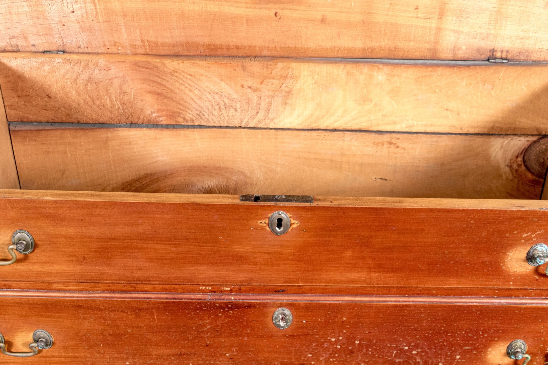 A handsome Federal blanket chest of drawers, raised on four nicely carved legs with three graduated drawers, the upper two are faux drawers for the blanket box storage. Each drawer is adorned with with brass swing handles and key escutcheons.