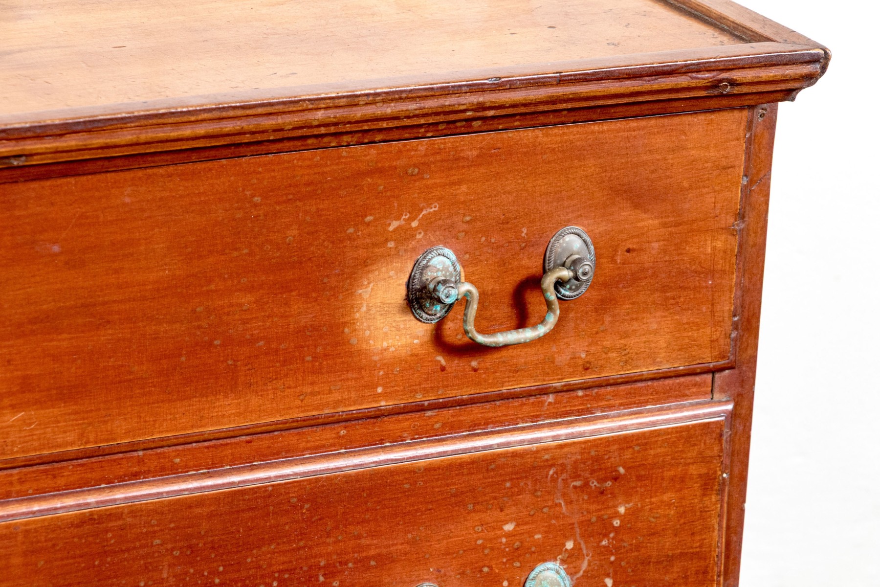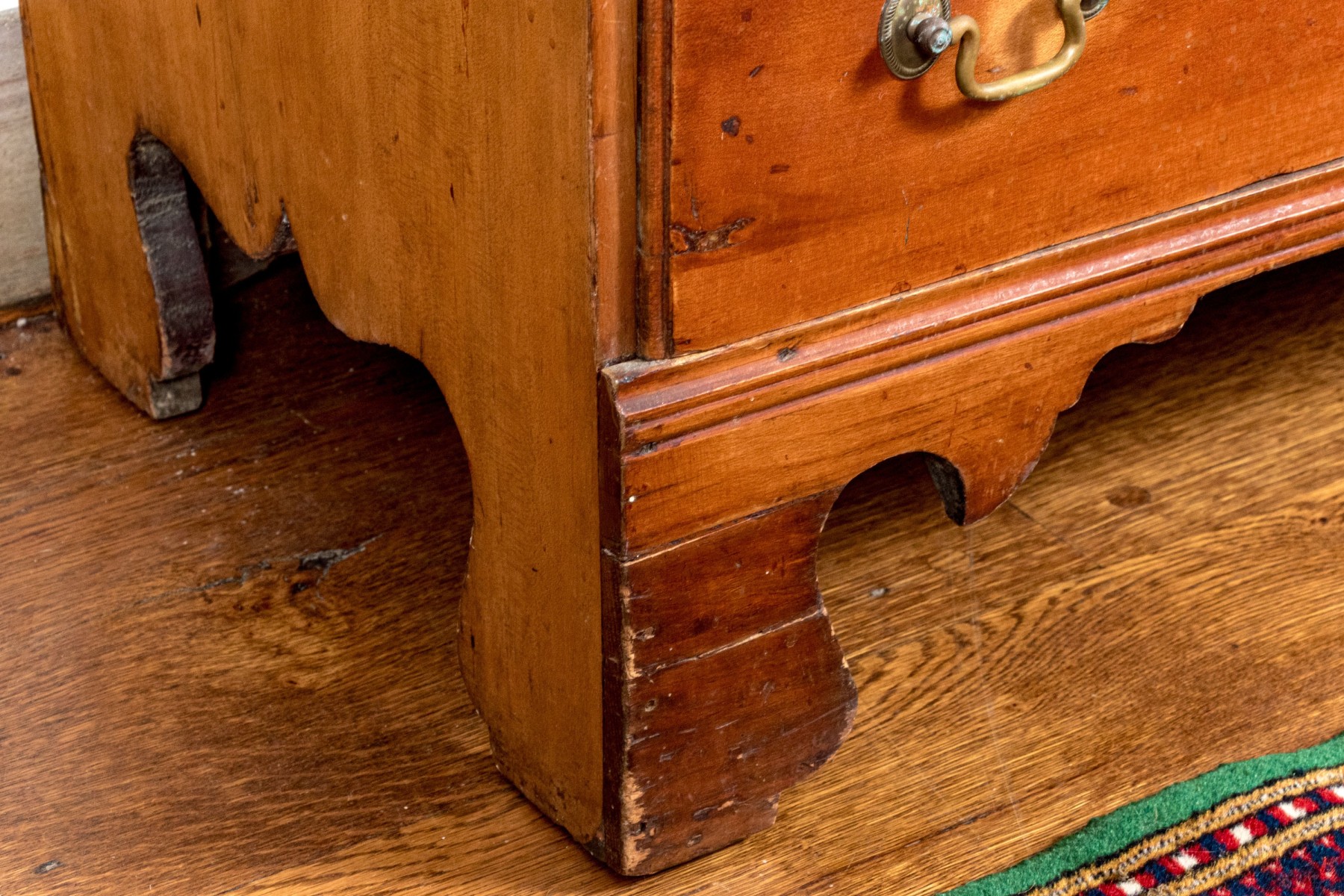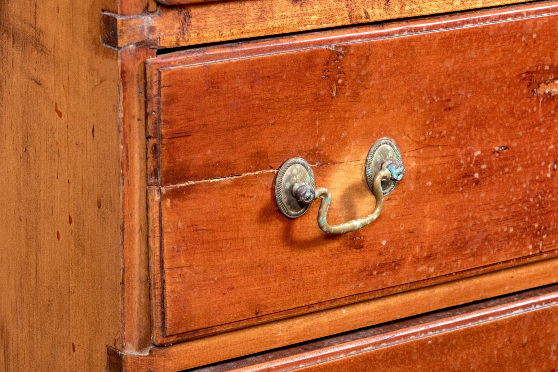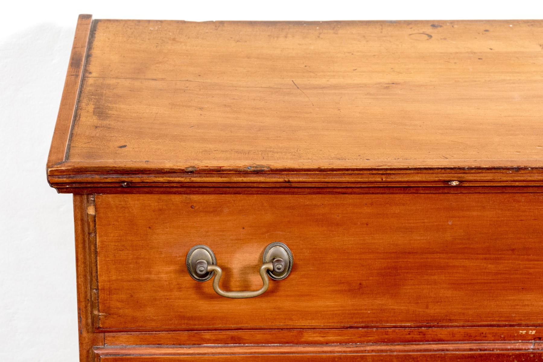 A handsome Federal blanket chest of drawers, raised on four nicely carved legs with three graduated drawers, the upper two are faux drawers for the blanket box storage. Each drawer is adorned with with brass swing handles and key escutcheons.