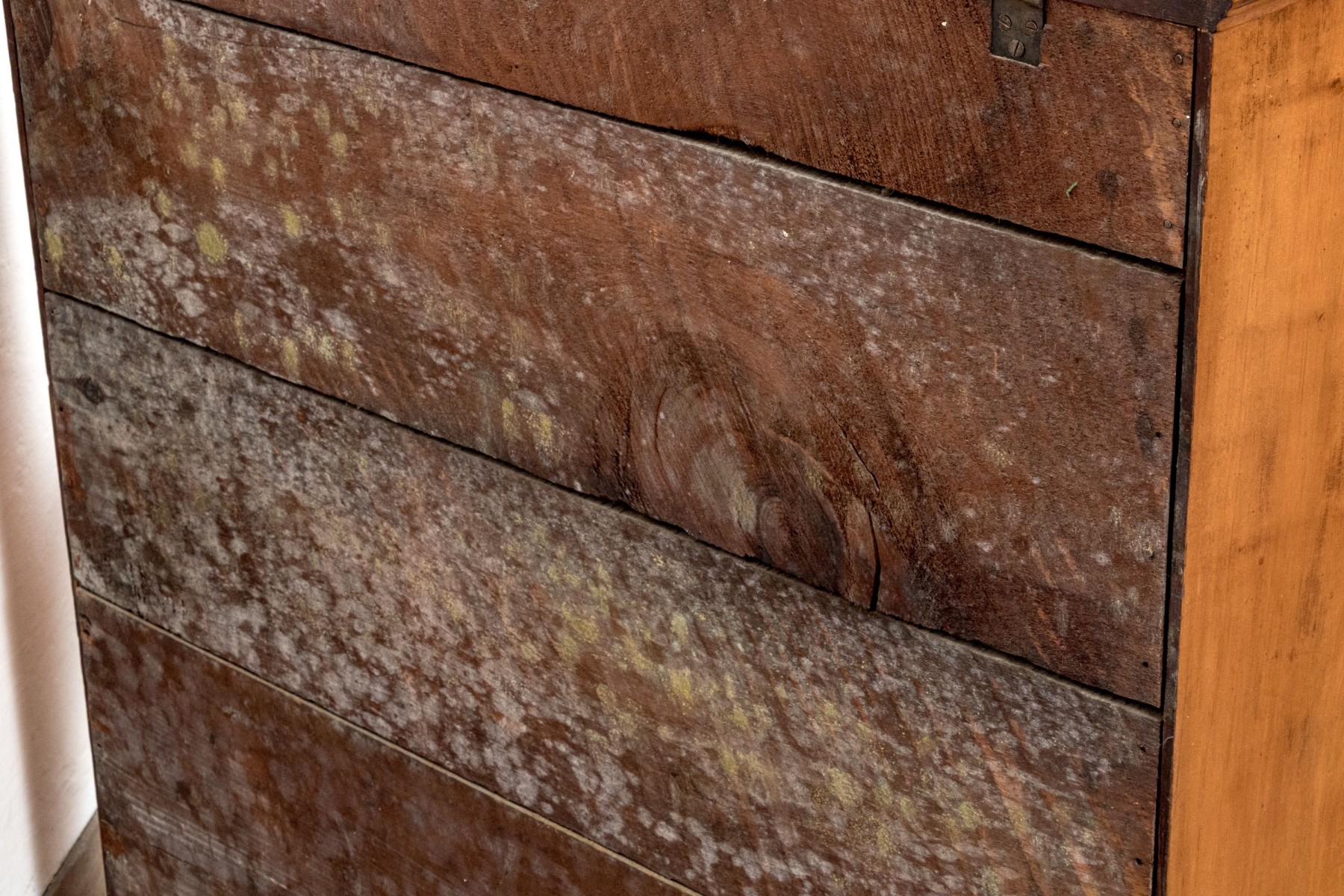 Needs to be cleaned, moldy residue to the back. Wear to the finish with some chipping to trim edges commensurate with age and use.