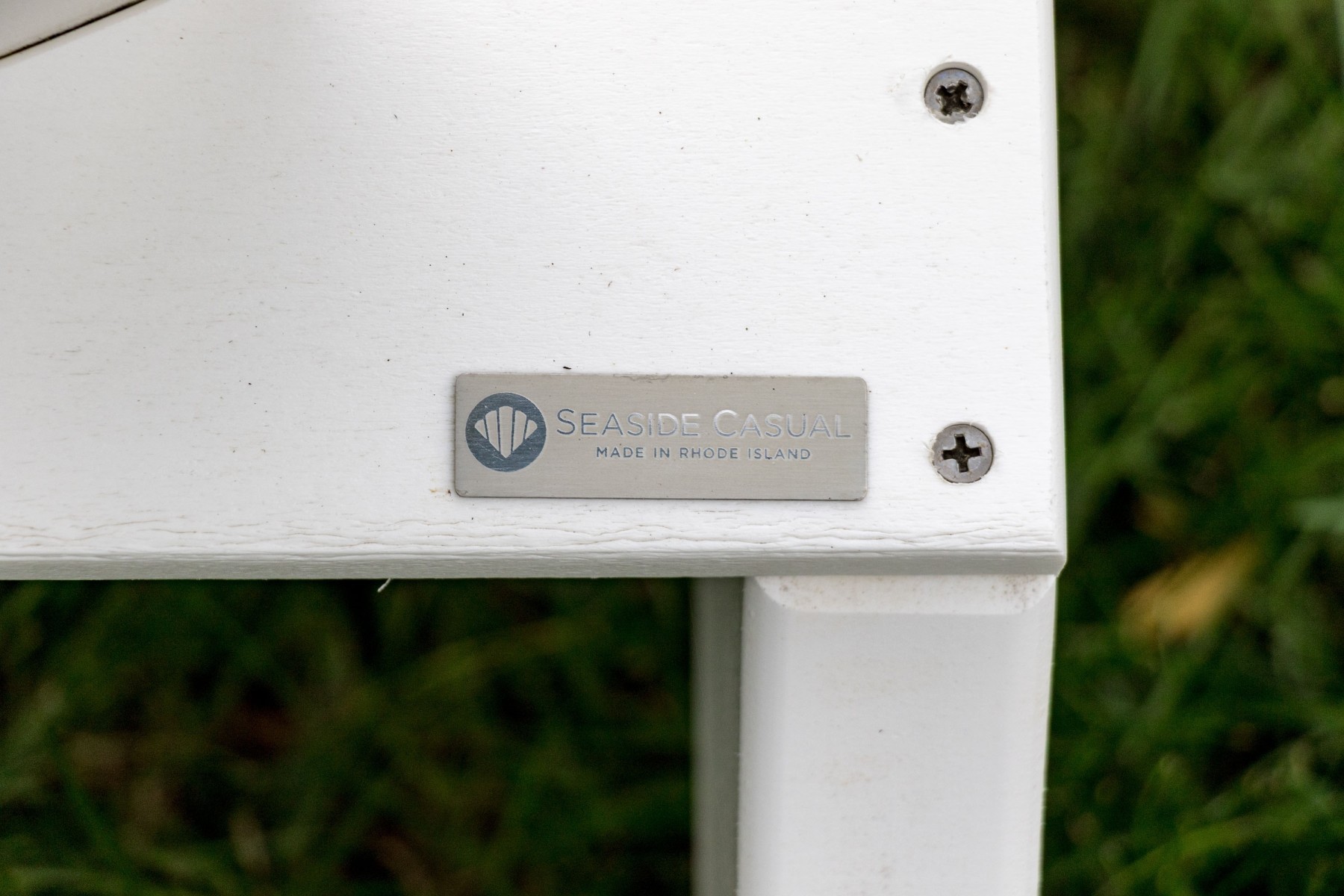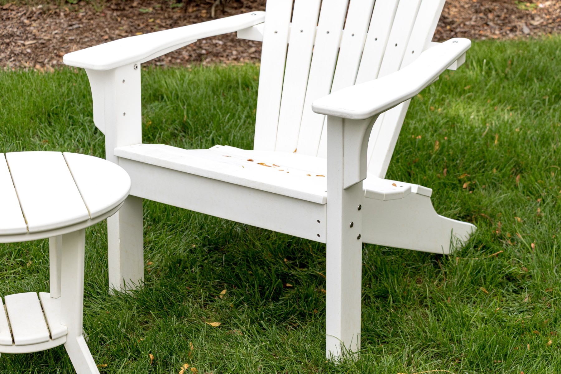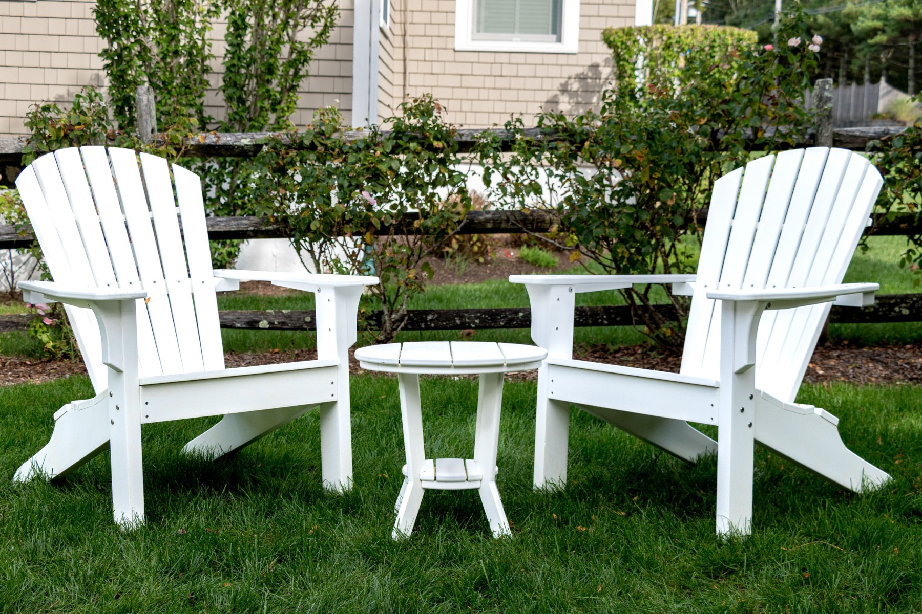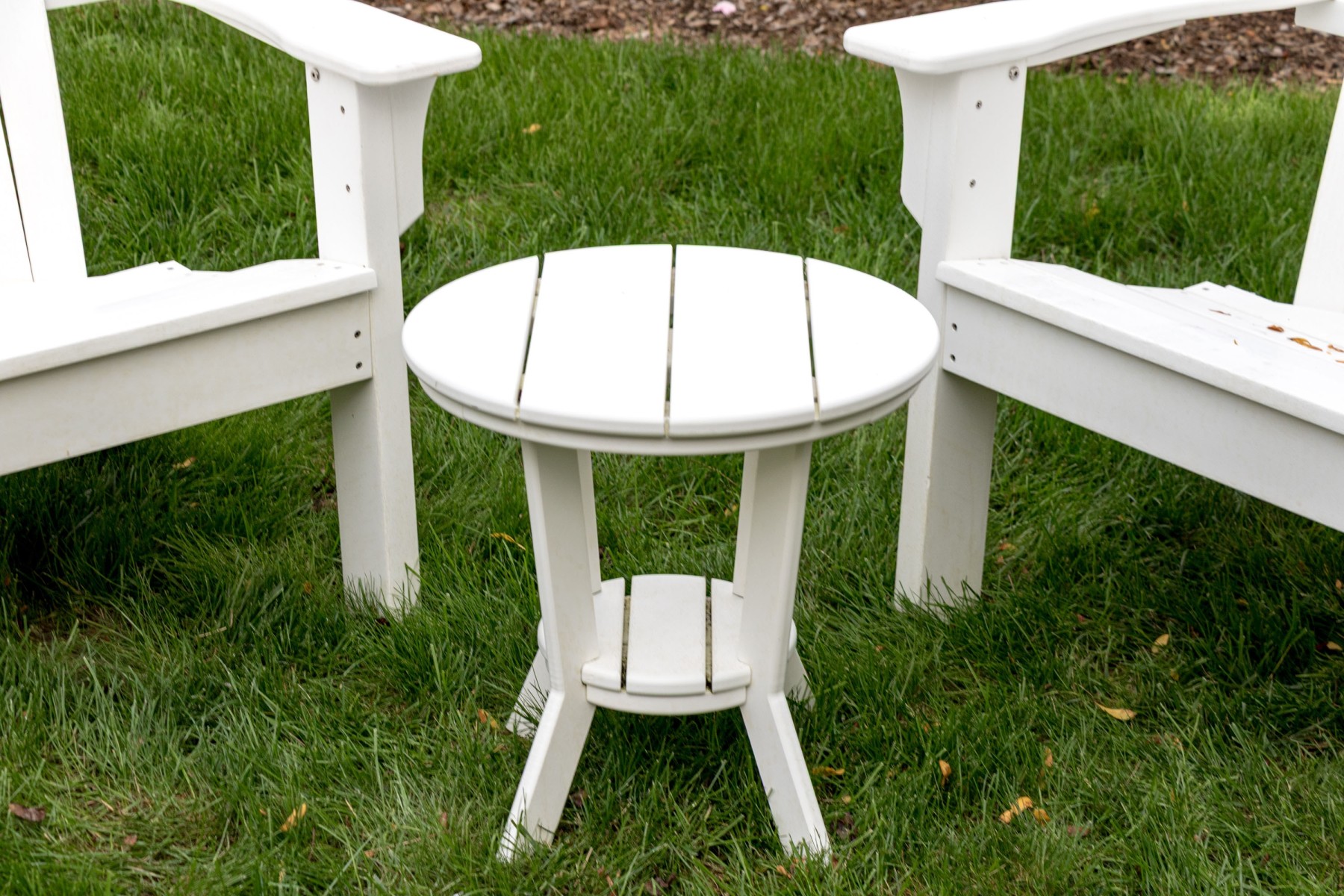 A fabulous suite of Seaside Casuals outdoor furniture made in Rhode Island The suite features a classic pair of white finished Adirondack chairs. Accompanied by a two tiered end table with a circular table top.
