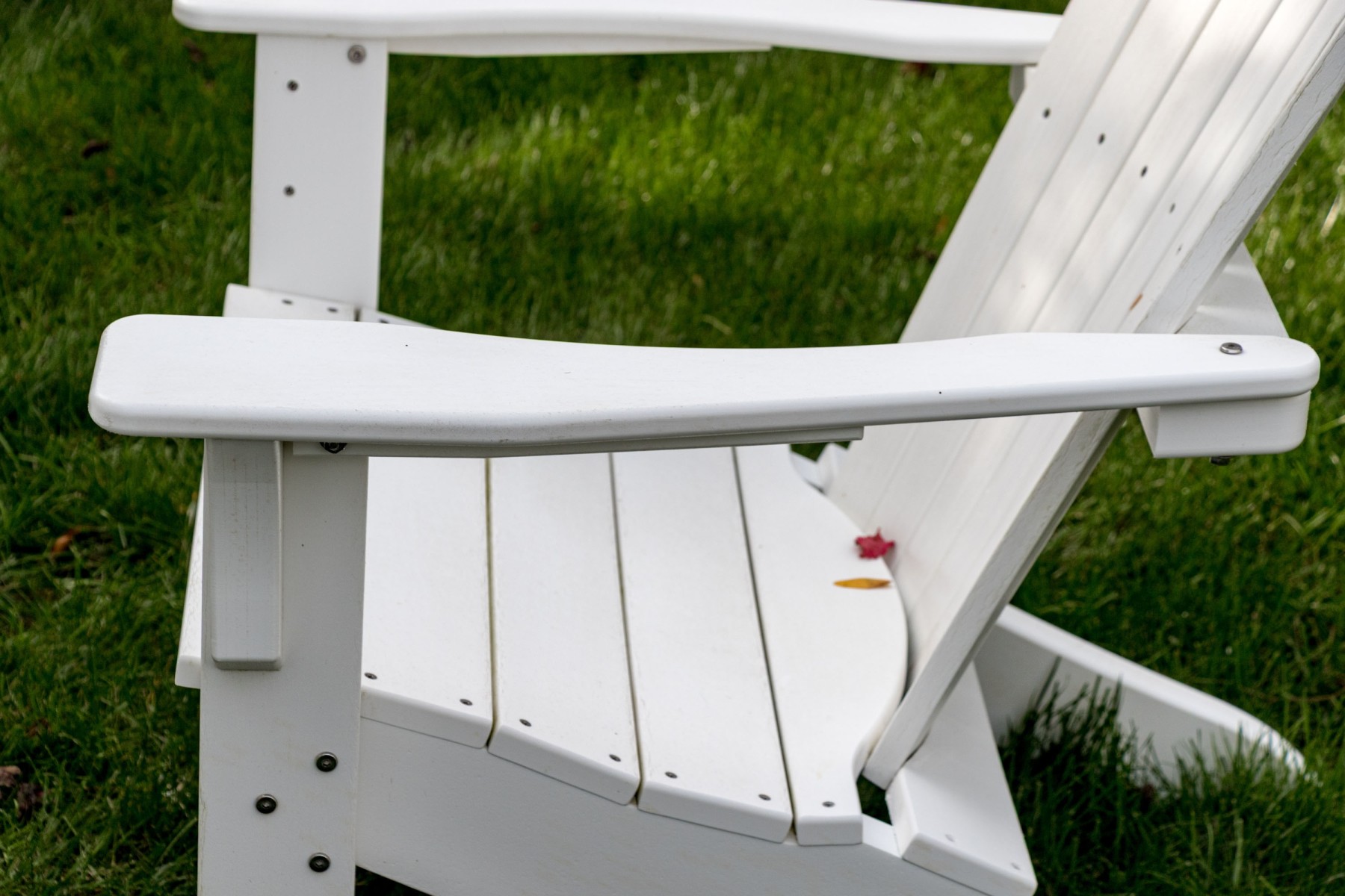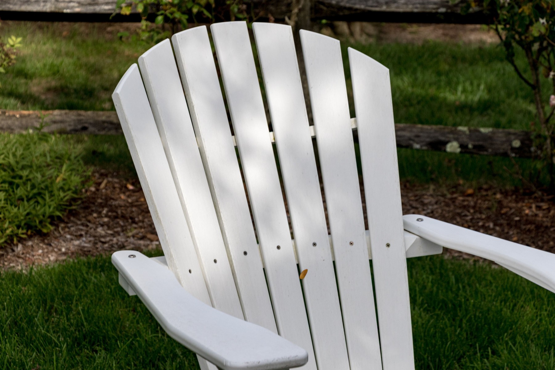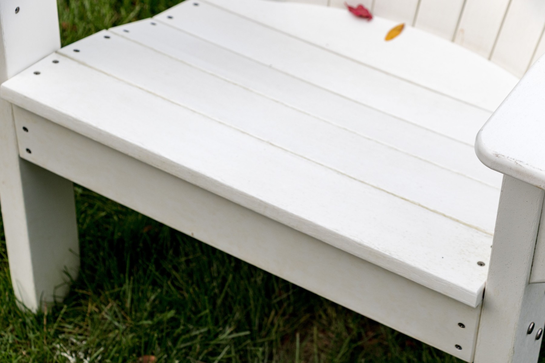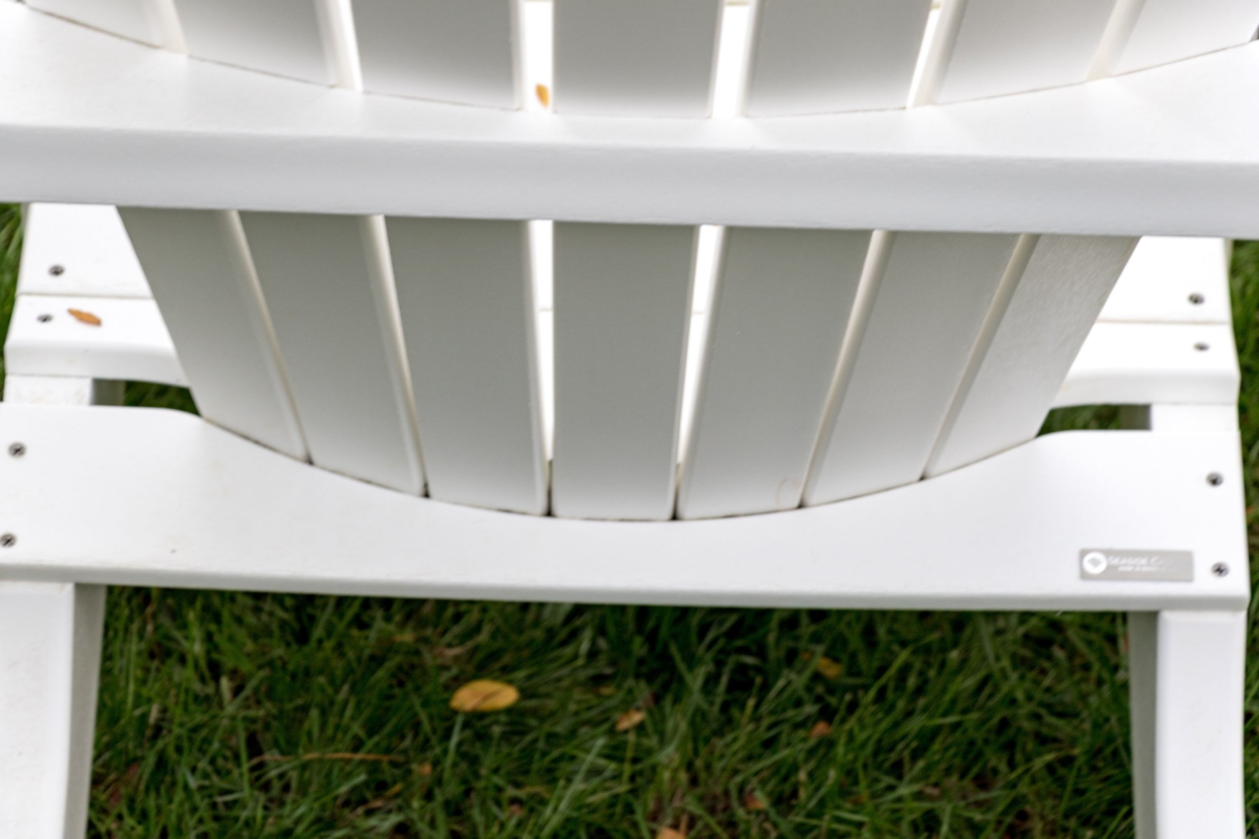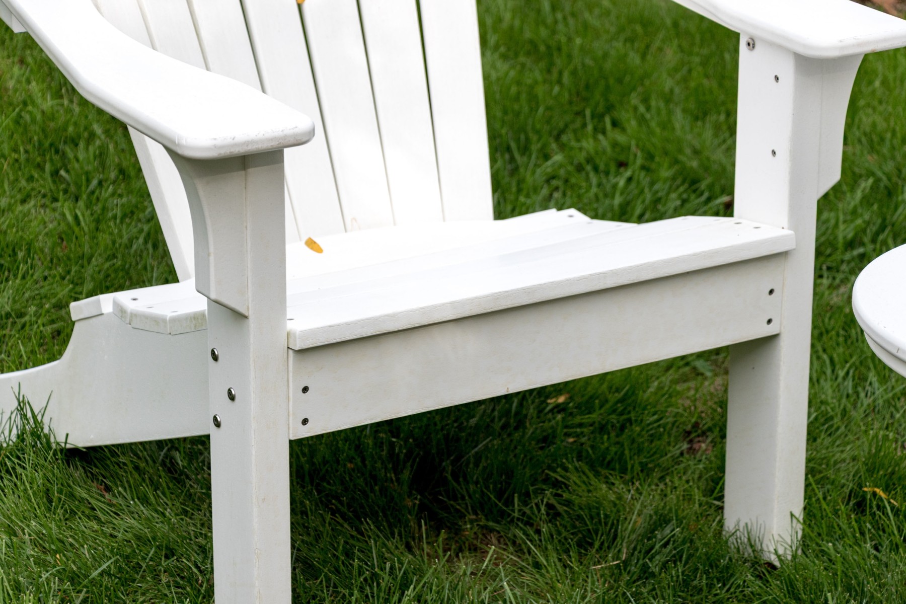 A fabulous suite of Seaside Casuals outdoor furniture made in Rhode Island The suite features a classic pair of white finished Adirondack chairs. Accompanied by a two tiered end table with a circular table top.